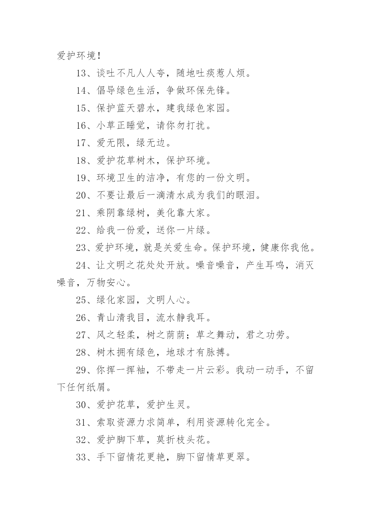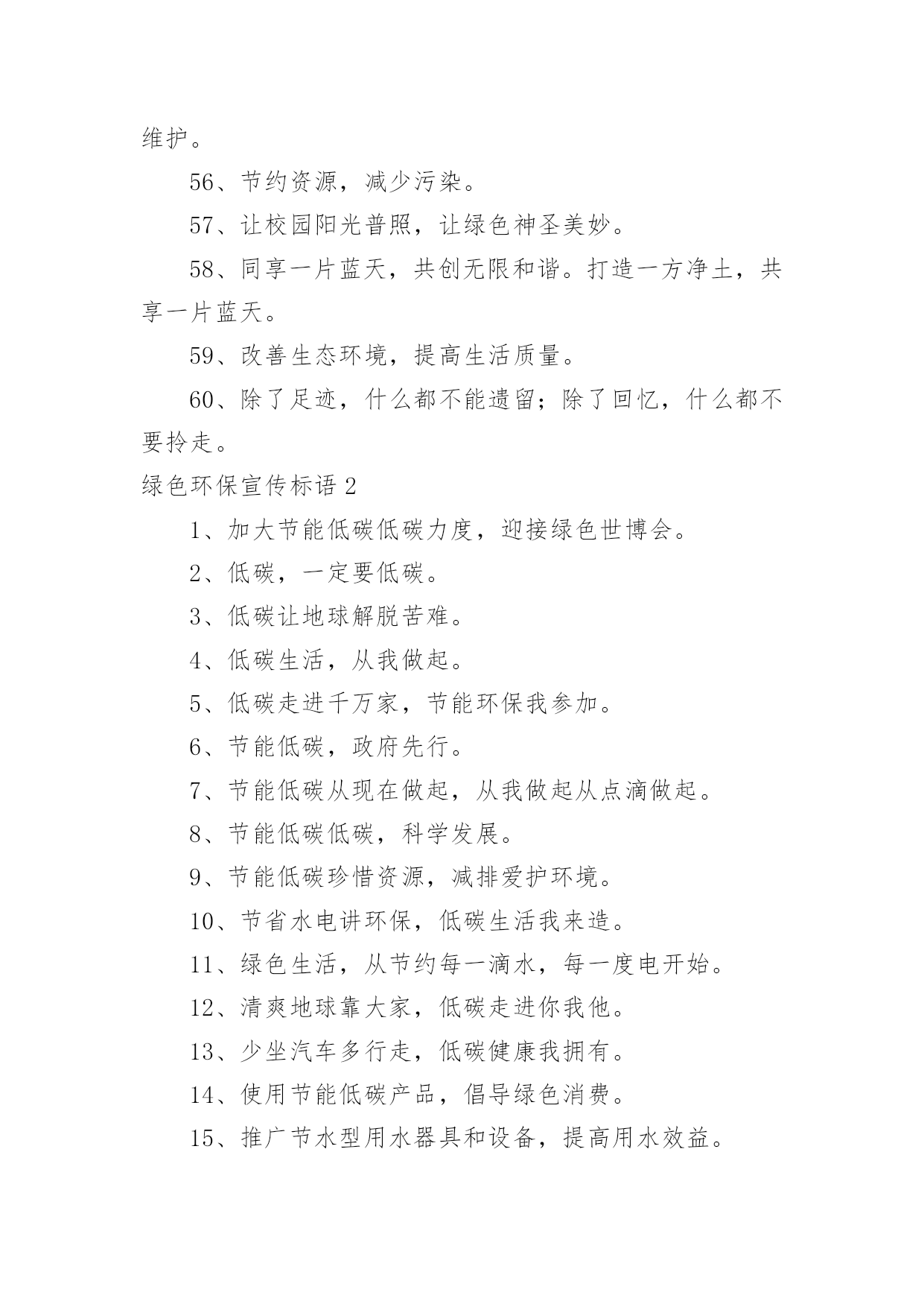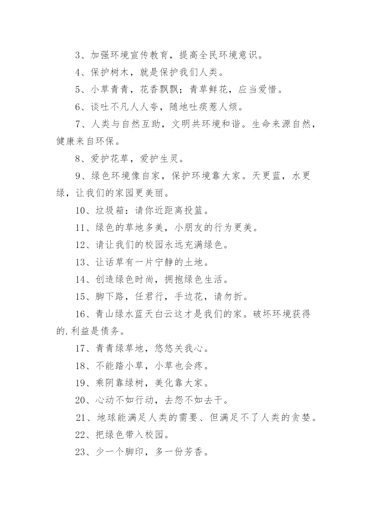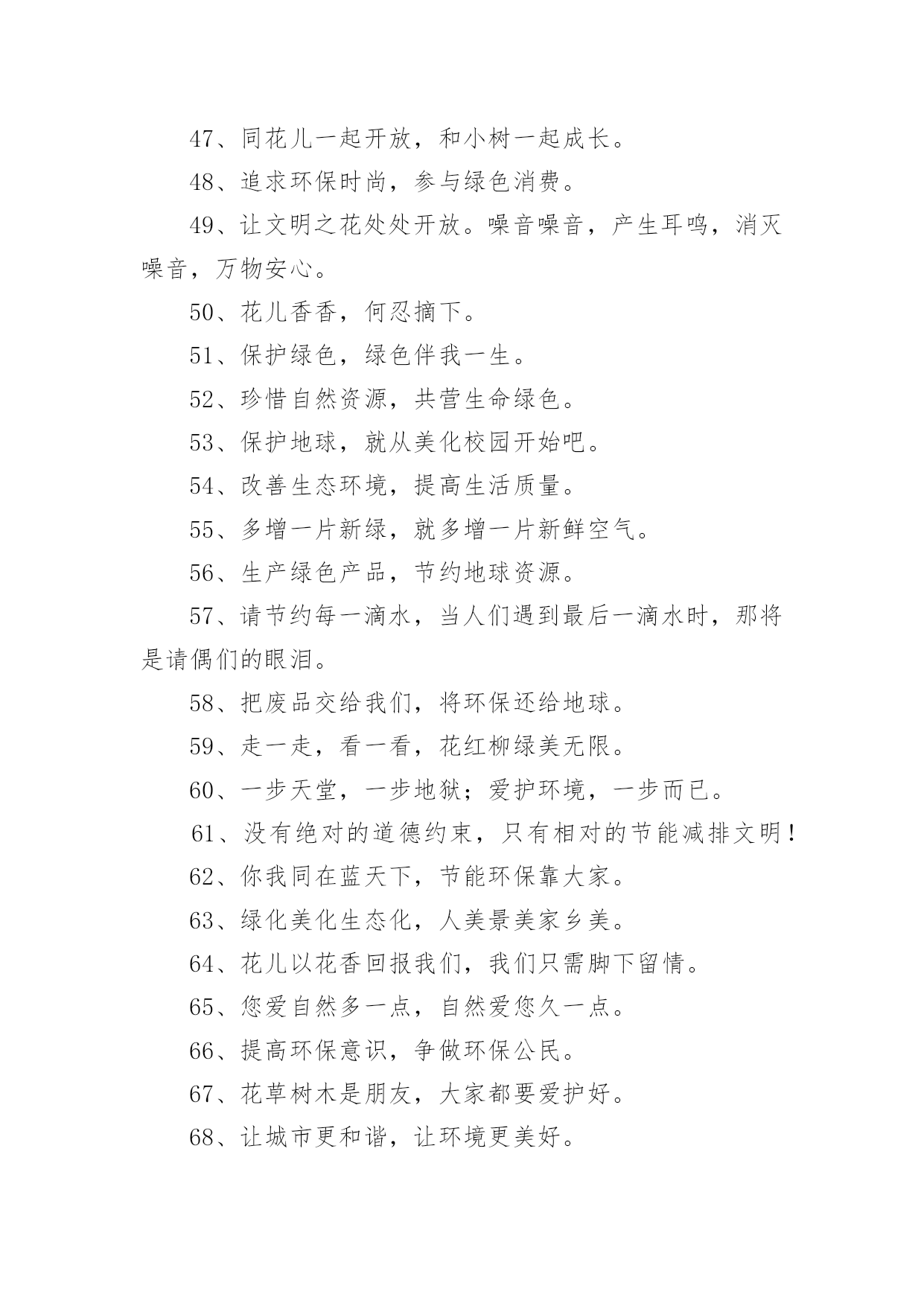 绿色环保宣传标语绿色环保宣传标语15篇无论在学习、工作或是生活中,许多人对一些广为流传的标语都不陌生吧,标语是用简短文字写出的有宣传鼓动作用的口号。还苦于找不到好的标语?以下是小编为大家收集的绿色环保宣传标语,供大家参考借鉴,希望可以帮助到有需要的朋友。绿色环保宣传标语11、多种一棵绿树,多添一份希望。2、环境与人类共存,开发与保护同步。3、爱青山绿水,爱蓝天白云。4、丢掉的是品质,捡起的是美德!5、创蓝天碧水新城福泽你我他,建文明和谐人居惠及千万家。6、请您绕一绕,小草笑一笑。7、少一串脚印,多一份绿意。8、以法保护自然环境,以德创建社会文明。文明贵在一言一行,环保重在一点一滴。9、保护水环境,节约水资源。10、让花儿含笑,让草儿传情,让心儿绽放。11、走一走,看一看,花红柳绿美无限。12、喝洁净的水,呼吸新鲜的空气,这需要您每时每刻爱护环境!13、谈吐不凡人人夸,随地吐痰惹人烦。14、倡导绿色生活,争做环保先锋。15、保护蓝天碧水,建我绿色家园。16、小草正睡觉,请你勿打扰。17、爱无限,绿无边。18、爱护花草树木,保护环境。19、环境卫生的洁净,有您的一份文明。20、不要让最后一滴清水成为我们的眼泪。21、乘阴靠绿树,美化靠大家。22、给我一份爱,送你一片绿。23、爱护环境,就是关爱生命。保护环境,健康你我他。24、让文明之花处处开放。噪音噪音,产生耳鸣,消灭噪音,万物安心。25、绿化家园,文明人心。26、青山清我目,流水静我耳。27、风之轻柔,树之荫荫;草之舞动,君之功劳。28、树木拥有绿色,地球才有脉搏。29、你挥一挥袖,不带走一片云彩。我动一动手,不留下任何纸屑。30、爱护花草,爱护生灵。31、索取资源力求简单,利用资源转化完全。32、爱护脚下草,莫折枝头花。33、手下留情花更艳,脚下留情草更翠。34、让环保扎根现在,用绿色昭示未来。把蓝天留给你我,让绿水环绕人间。35、草木亦通灵,踏之何忍?36、手边留情花似锦,脚下留情草成荫。37、绿草茵茵,她想安静!38、草儿可爱,大家爱。39、美化校园环境,就是美化我们的生活。40、同花儿一起开放,和小树一起成长。41、尽心才能干净,干净才能静心。42、花儿香香,何忍摘下。43、让绿色感染心灵,让绿色美化校园。44、今天节约一滴水,留给后人一滴血。45、当你昂首阔步时,我在你脚下。46、轻轻抬起你的小脚,我在你的脚下微笑。47、劝君多走几步路,莫把草坪当马路。48、关注环境,就是关注未来。环境保护你我他,蓝天碧水伴大家。49、它失去了保护,我们就失去了健康。50、天更蓝,树更绿,水更清,居更佳。51、提高环保意识,争做环保公民。52、我是环保一员,我为环保做贡献。53、美化生活,净化心灵。54、绿色的草地多美,小朋友的行为更美。55、保护环境,人人有责。美丽的环境,离不开大家的维护。56、节约资源,减少污染。57、让校园阳光普照,让绿色神圣美妙。58、同享一片蓝天,共创无限和谐。打造一方净土,共享一片蓝天。59、改善生态环境,提高生活质量。60、除了足迹,什么都不能遗留;除了回忆,什么都不要拎走。绿色环保宣传标语21、加大节能低碳低碳力度,迎接绿色世博会。2、低碳,一定要低碳。3、低碳让地球解脱苦难。4、低碳生活,从我做起。5、低碳走进千万家,节能环保我参加。6、节能低碳,政府先行。7、节能低碳从现在做起,从我做起从点滴做起。8、节能低碳低碳,科学发展。9、节能低碳珍惜资源,减排爱护环境。10、节省水电讲环保,低碳生活我来造。11、绿色生活,从节约每一滴水,每一度电开始。12、清爽地球靠大家,低碳走进你我他。13、少坐汽车多行走,低碳健康我拥有。14、使用节能低碳产品,倡导绿色消费。15、推广节水型用水器具和设备,提高用水效益。16、推进绿色办公,促进资源节约。17、温室效应我不要,低碳生活我拥抱。18、享受低碳生活,不再被out。19、做节约能源资源表率,建节约型机关。绿色环保宣传标语31、不要让绿色从身边消失。2、美我校园重在每一举动。3、萋萋芳草青,贱踏何忍心?4、让校园成为绿色殿堂!——5、让绿色的希望从校园萌芽!6、人人爱花草,空气环境好。7、地球是我家,环保靠大家。8、学校是我家,美化靠大家。9、小小一口痰,细菌千千万。10、校园美如画,受益你我他。11、水清自然甜,水浑人人厌。12、环保做不好,生命就难保。13、保护绿色摇篮,你行,我能!14、绿色奥运应从绿色校园开始!15、垃圾筒——我不想“失业”!16、幸福就是天蓝、山青、水绿。17、爱花、爱草、爱树、爱校园。18、让绿色的旋律环绕每一个生命!19、追求美好生活,应先拥抱绿色!20、保护生态环境,就是爱护自已。21、学会做人,学会学习,保护自然。22、生命如此短暂,请不要将我伤害。23、让优雅的环境与美