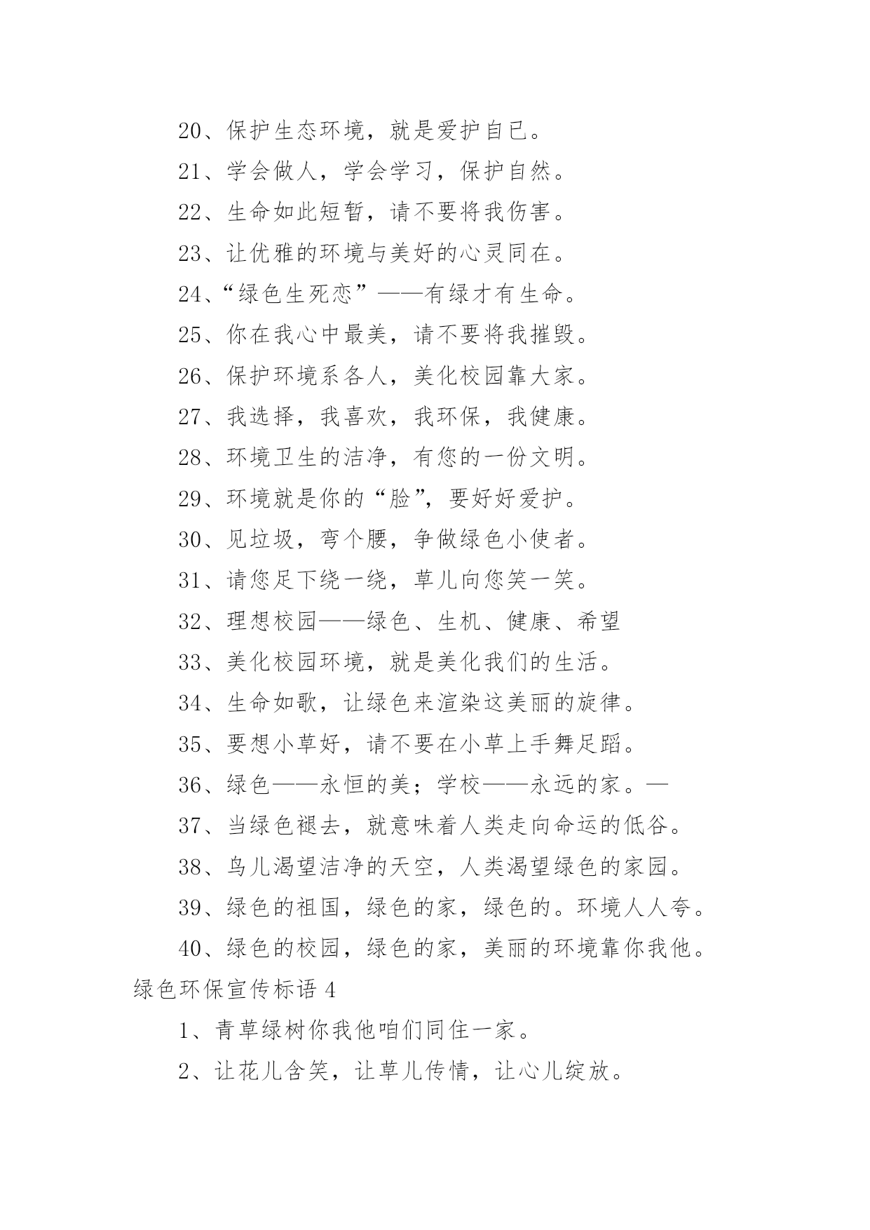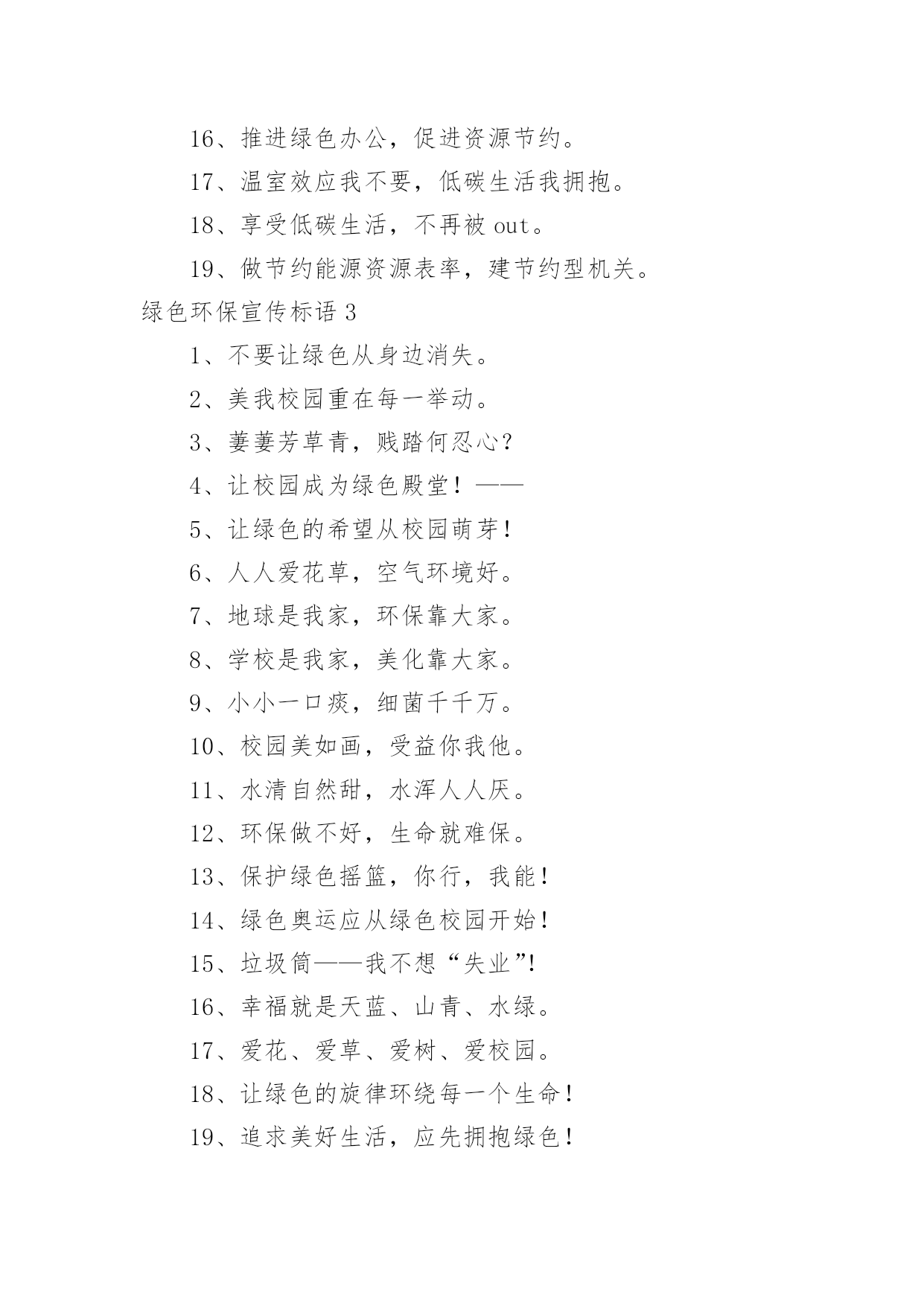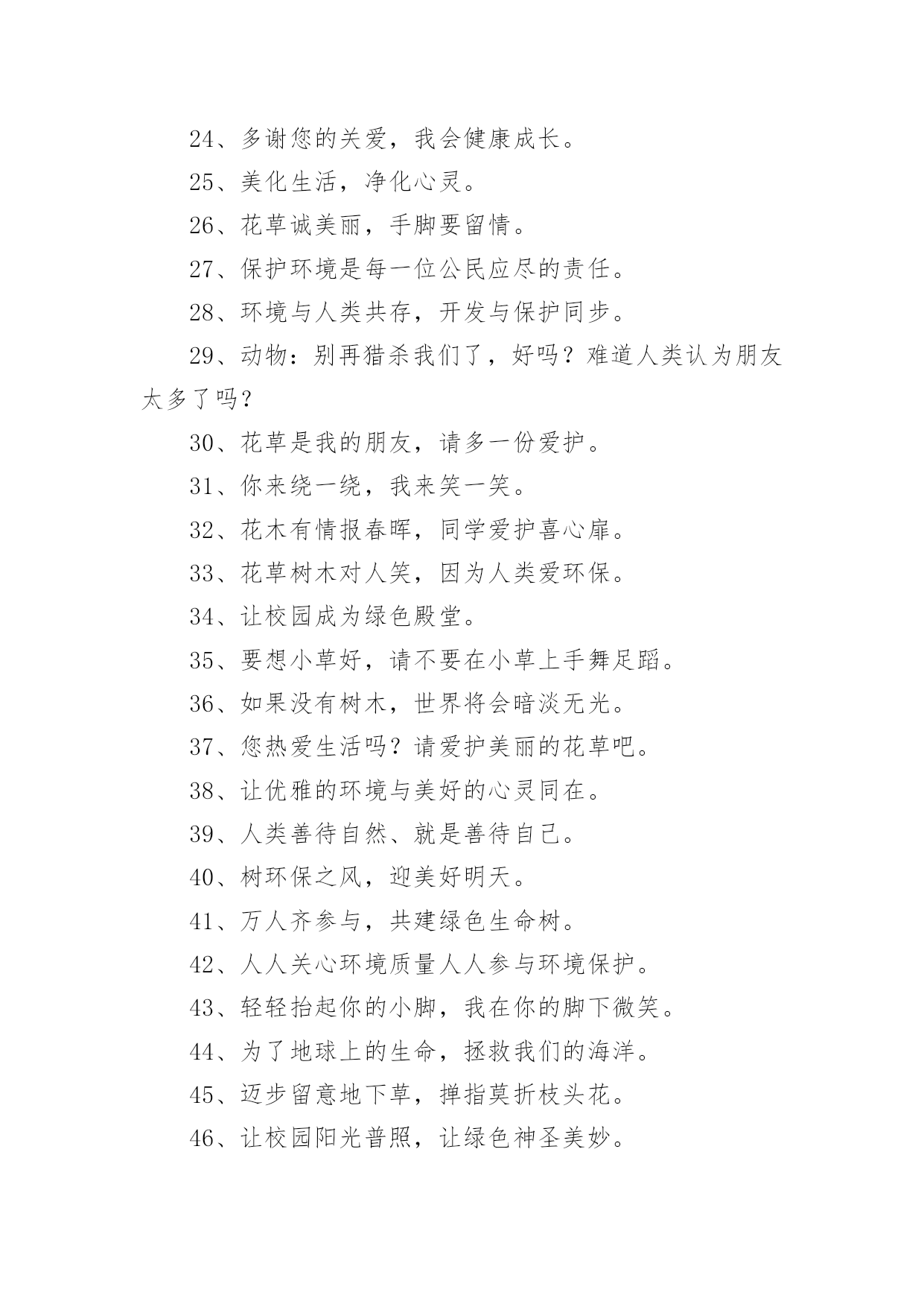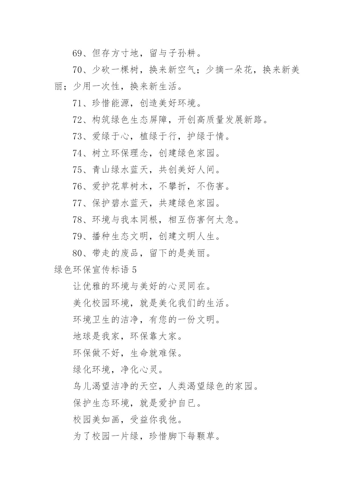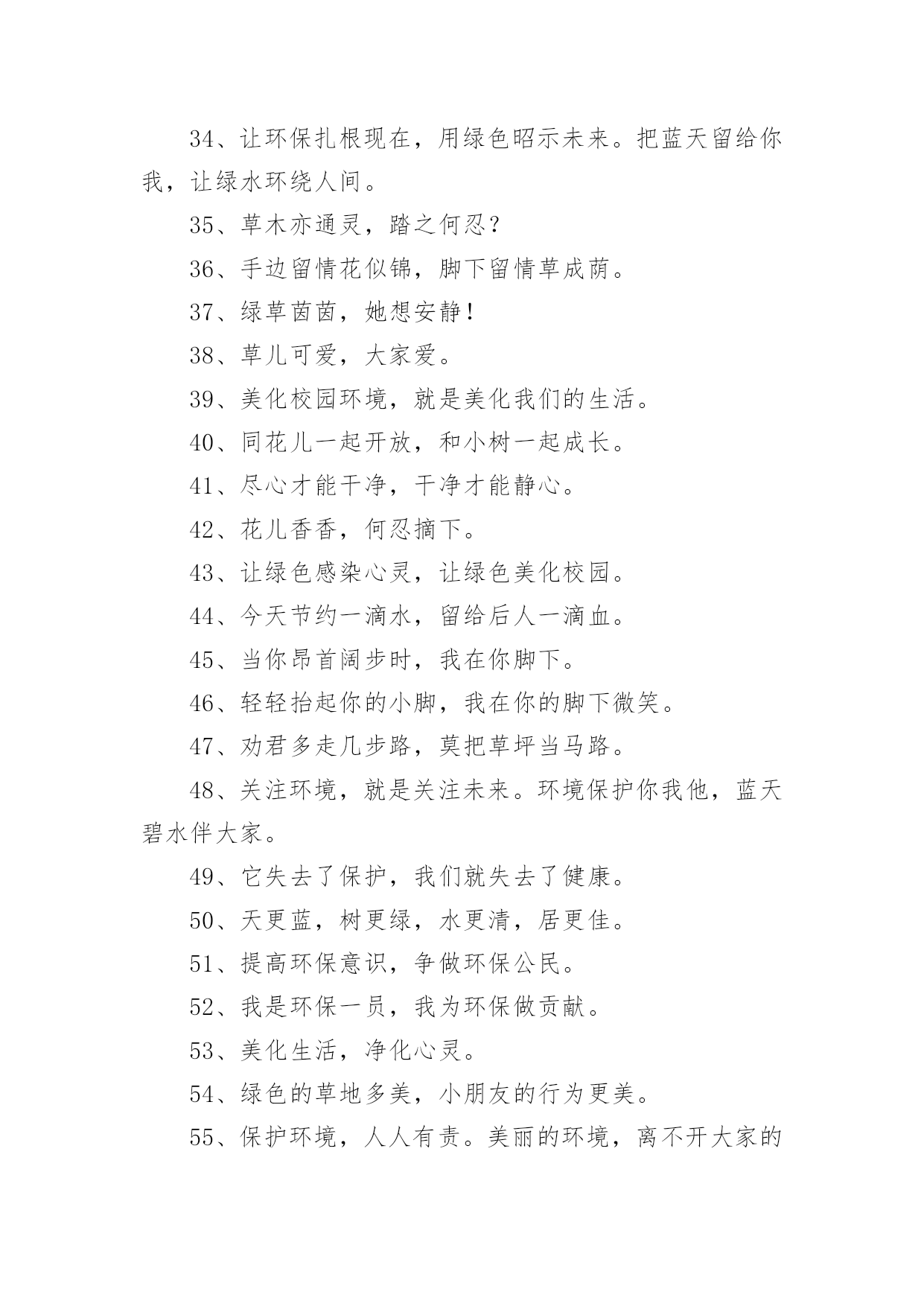 绿色环保宣传标语绿色环保宣传标语15篇无论在学习、工作或是生活中,许多人对一些广为流传的标语都不陌生吧,标语是用简短文字写出的有宣传鼓动作用的口号。还苦于找不到好的标语?以下是小编为大家收集的绿色环保宣传标语,供大家参考借鉴,希望可以帮助到有需要的朋友。绿色环保宣传标语11、多种一棵绿树,多添一份希望。2、环境与人类共存,开发与保护同步。3、爱青山绿水,爱蓝天白云。4、丢掉的是品质,捡起的是美德!5、创蓝天碧水新城福泽你我他,建文明和谐人居惠及千万家。6、请您绕一绕,小草笑一笑。7、少一串脚印,多一份绿意。8、以法保护自然环境,以德创建社会文明。文明贵在一言一行,环保重在一点一滴。9、保护水环境,节约水资源。10、让花儿含笑,让草儿传情,让心儿绽放。11、走一走,看一看,花红柳绿美无限。12、喝洁净的水,呼吸新鲜的空气,这需要您每时每刻爱护环境!13、谈吐不凡人人夸,随地吐痰惹人烦。14、倡导绿色生活,争做环保先锋。15、保护蓝天碧水,建我绿色家园。16、小草正睡觉,请你勿打扰。17、爱无限,绿无边。18、爱护花草树木,保护环境。19、环境卫生的洁净,有您的一份文明。20、不要让最后一滴清水成为我们的眼泪。21、乘阴靠绿树,美化靠大家。22、给我一份爱,送你一片绿。23、爱护环境,就是关爱生命。保护环境,健康你我他。24、让文明之花处处开放。噪音噪音,产生耳鸣,消灭噪音,万物安心。25、绿化家园,文明人心。26、青山清我目,流水静我耳。27、风之轻柔,树之荫荫;草之舞动,君之功劳。28、树木拥有绿色,地球才有脉搏。29、你挥一挥袖,不带走一片云彩。我动一动手,不留下任何纸屑。30、爱护花草,爱护生灵。31、索取资源力求简单,利用资源转化完全。32、爱护脚下草,莫折枝头花。33、手下留情花更艳,脚下留情草更翠。34、让环保扎根现在,用绿色昭示未来。把蓝天留给你我,让绿水环绕人间。35、草木亦通灵,踏之何忍?36、手边留情花似锦,脚下留情草成荫。37、绿草茵茵,她想安静!38、草儿可爱,大家爱。39、美化校园环境,就是美化我们的生活。40、同花儿一起开放,和小树一起成长。41、尽心才能干净,干净才能静心。42、花儿香香,何忍摘下。43、让绿色感染心灵,让绿色美化校园。44、今天节约一滴水,留给后人一滴血。45、当你昂首阔步时,我在你脚下。46、轻轻抬起你的小脚,我在你的脚下微笑。47、劝君多走几步路,莫把草坪当马路。48、关注环境,就是关注未来。环境保护你我他,蓝天碧水伴大家。49、它失去了保护,我们就失去了健康。50、天更蓝,树更绿,水更清,居更佳。51、提高环保意识,争做环保公民。52、我是环保一员,我为环保做贡献。53、美化生活,净化心灵。54、绿色的草地多美,小朋友的行为更美。55、保护环境,人人有责。美丽的环境,离不开大家的维护。56、节约资源,减少污染。57、让校园阳光普照,让绿色神圣美妙。58、同享一片蓝天,共创无限和谐。打造一方净土,共享一片蓝天。59、改善生态环境,提高生活质量。60、除了足迹,什么都不能遗留;除了回忆,什么都不要拎走。绿色环保宣传标语21、加大节能低碳低碳力度,迎接绿色世博会。2、低碳,一定要低碳。3、低碳让地球解脱苦难。4、低碳生活,从我做起。5、低碳走进千万家,节能环保我参加。6、节能低碳,政府先行。7、节能低碳从现在做起,从我做起从点滴做起。8、节能低碳低碳,科学发展。9、节能低碳珍惜资源,减排爱护环境。10、节省水电讲环保,低碳生活我来造。11、绿色生活,从节约每一滴水,每一度电开始。12、清爽地球靠大家,低碳走进你我他。13、少坐汽车多行走,低碳健康我拥有。14、使用节能低碳产品,倡导绿色消费。15、推广节水型用水器具和设备,提高用水效益。16、推进绿色办公,促进资源节约。17、温室效应我不要,低碳生活我拥抱。18、享受低碳生活,不再被out。19、做节约能源资源表率,建节约型机关。绿色环保宣传标语31、不要让绿色从身边消失。2、美我校园重在每一举动。3、萋萋芳草青,贱踏何忍心?4、让校园成为绿色殿堂!——5、让绿色的希望从校园萌芽!6、人人爱花草,空气环境好。7、地球是我家,环保靠大家。8、学校是我家,美化靠大家。9、小小一口痰,细菌千千万。10、校园美如画,受益你我他。11、水清自然甜,水浑人人厌。12、环保做不好,生命就难保。13、保护绿色摇篮,你行,我能!14、绿色奥运应从绿色校园开始!15、垃圾筒——我不想“失业”!16、幸福就是天蓝、山青、水绿。17、爱花、爱草、爱树、爱校园。18、让绿色的旋律环绕每一个生命!19、追求美好生活,应先拥抱绿色!20、保护生态环境,就是爱护自已。21、学会做人,学会学习,保护自然。22、生命如此短暂,请不要将我伤害。23、让优雅的环境与美