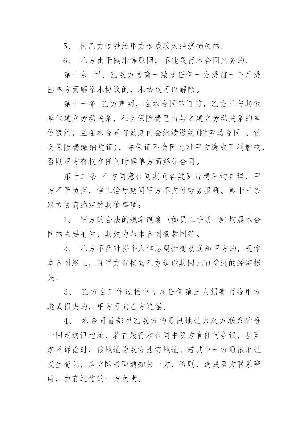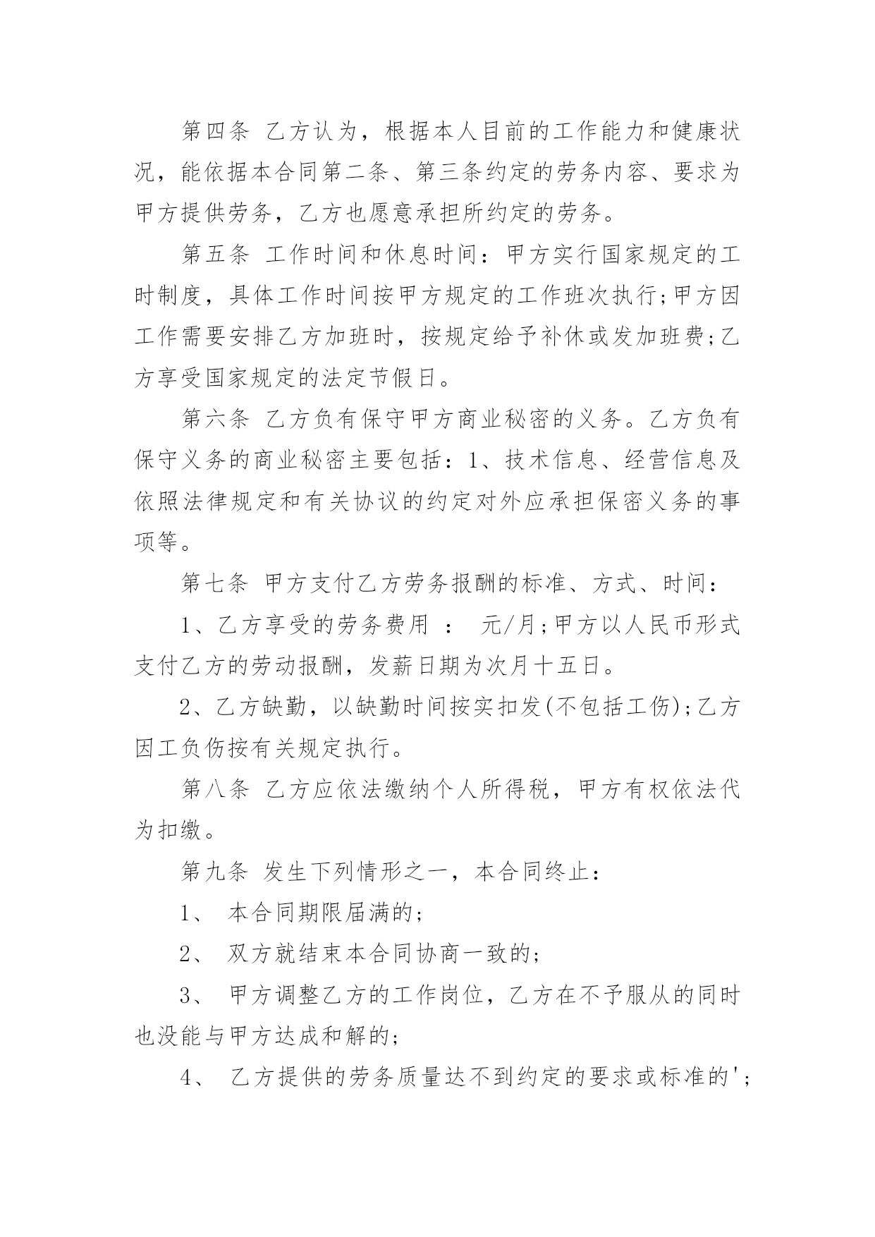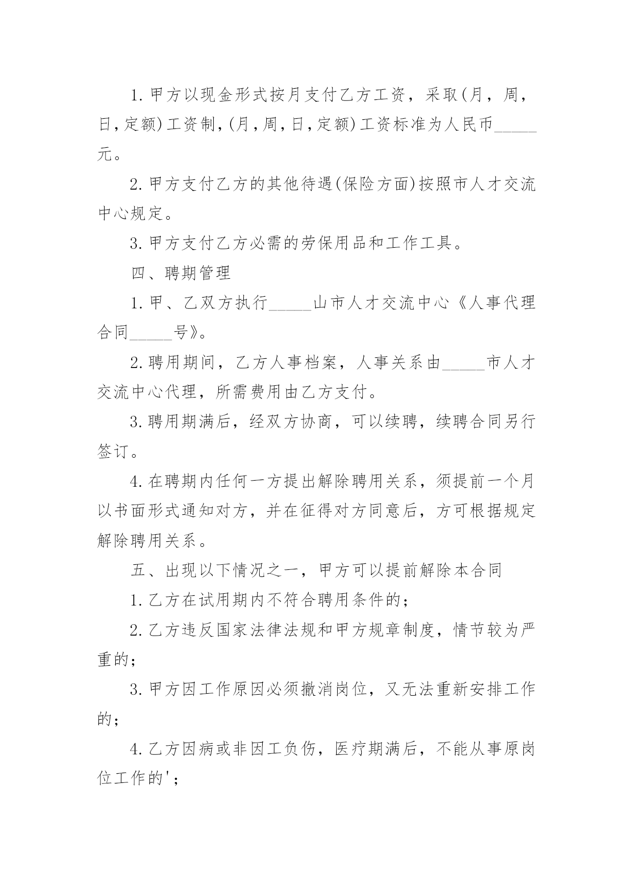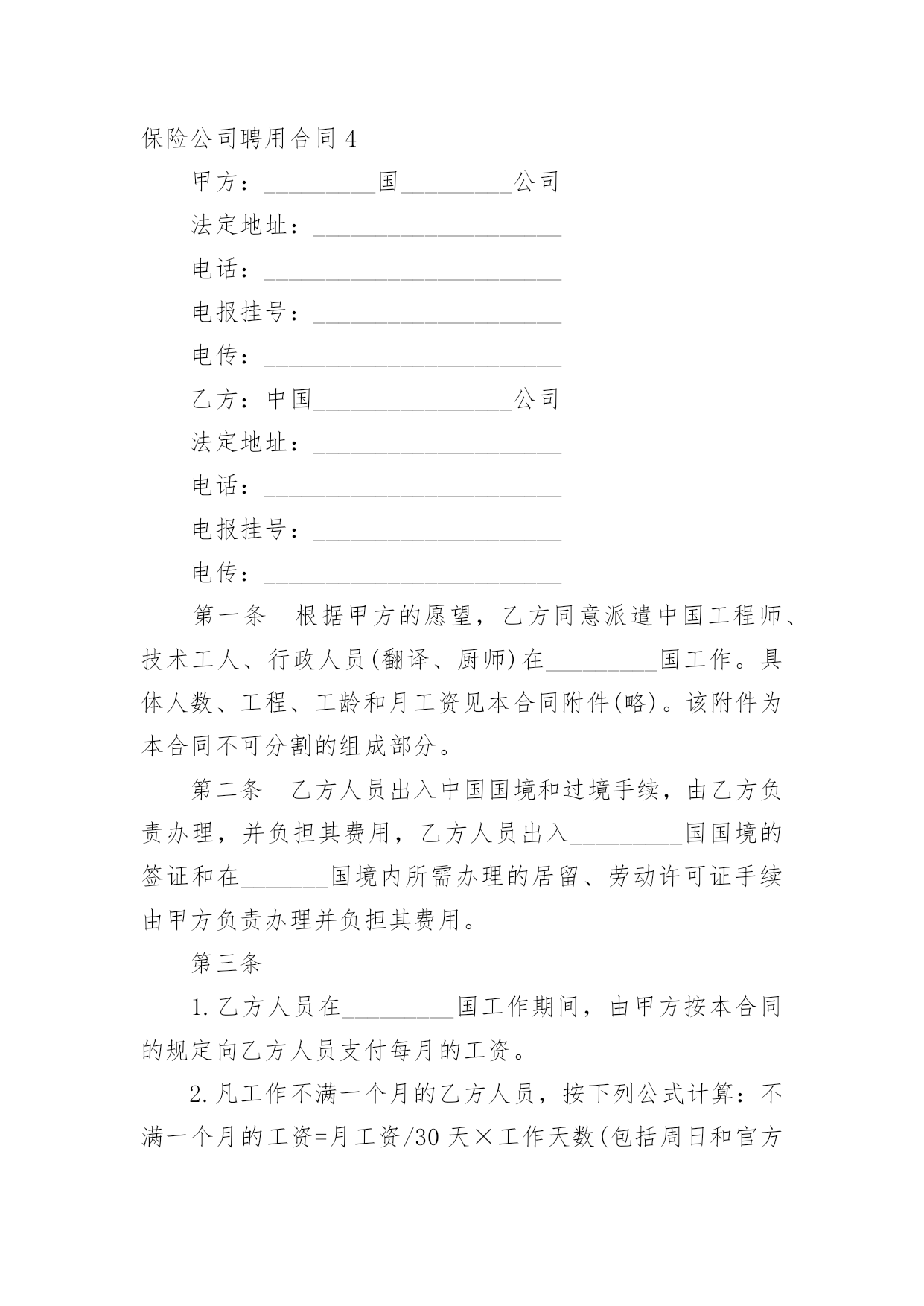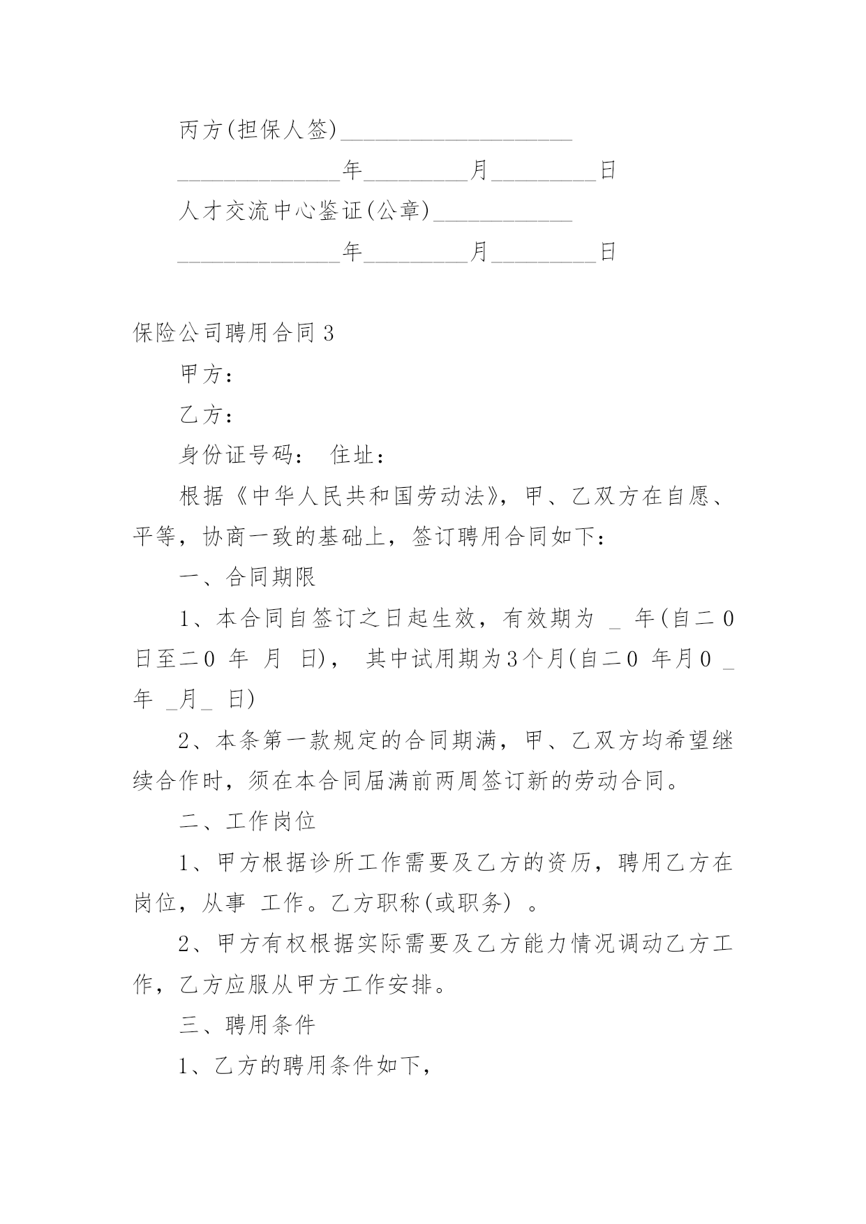 保险公司聘用合同随着法律观念的日渐普及,合同对我们的帮助越来越大,签订合同可以明确双方当事人的权利和义务。那么合同要怎么拟定?想必这让大家都很苦恼吧,下面是小编帮大家整理的保险公司聘用合同,仅供参考,大家一起来看看吧。保险公司聘用合同1甲方:乙方姓名:根据《中华人民共和国民法通则》、《中华人民共和国合同法》和国家、本市的有关规定,甲乙双方平等协商一致,自愿签订本聘用合同,共同遵守本合同所列条款。第一条聘用期限1、本合同期限为年,自年月日起至年月日止。其中试用期为月。2、在试用期内,甲方发现乙方不符合聘用条件的,可以即行解除本合同。第二条乙方承担的劳务内容、要求为:1、乙方的工作岗位将根据甲方的经营需要、乙方工作能力及其表现进行确认,如有调整或调动,乙方应予以积极配合。2、乙方应履行甲方规定的岗位职责、按时、按质、按量完成生产工作任务。第三条乙方提供劳务的方式为:乙方到担任工作。第四条乙方认为,根据本人目前的工作能力和健康状况,能依据本合同第二条、第三条约定的劳务内容、要求为甲方提供劳务,乙方也愿意承担所约定的劳务。第五条工作时间和休息时间:甲方实行国家规定的工时制度,具体工作时间按甲方规定的工作班次执行;甲方因工作需要安排乙方加班时,按规定给予补休或发加班费;乙方享受国家规定的法定节假日。第六条乙方负有保守甲方商业秘密的义务。乙方负有保守义务的商业秘密主要包括:1、技术信息、经营信息及依照法律规定和有关协议的约定对外应承担保密义务的事项等。第七条甲方支付乙方劳务报酬的标准、方式、时间:1、乙方享受的劳务费用:元/月;甲方以人民币形式支付乙方的劳动报酬,发薪日期为次月十五日。2、乙方缺勤,以缺勤时间按实扣发(不包括工伤);乙方因工负伤按有关规定执行。第八条乙方应依法缴纳个人所得税,甲方有权依法代为扣缴。第九条发生下列情形之一,本合同终止:1、本合同期限届满的;2、双方就结束本合同协商一致的;3、甲方调整乙方的工作岗位,乙方在不予服从的同时也没能与甲方达成和解的;4、乙方提供的劳务质量达不到约定的要求或标准的';5、因乙方过错给甲方造成较大经济损失的;6、乙方由于健康等原因,不能履行本合同义务的。第十条甲、乙双方协商一致或任何一方提前一个月提出单方面解除本协议的,本协议可以解除。第十一条乙方声明,在本合同签订前,乙方已与其他单位建立劳动关系,社会保险费已由与之建立劳动关系的单位缴纳,且在本合同有效期内会继续缴纳(附劳动合同、社会保险费缴纳凭证),并保证不会因此对甲方造成不利影响,否则甲方有权在任何时候单方面解除合同。第十二条乙方同意合同期间各类医疗费用均自理,甲方不予负担,停工治疗期间甲方不支付劳务报酬。第十三条双方协商约定的其他事项:1、甲方的合法的规章制度(如员工手册等)均属本合同的主要附件,其效力与本合同条款同等。2、乙方不及时将个人信息属性变动通知甲方的,视作本合同终止,且甲方有权向乙方追诉其因此而受到的经济损失。3、乙方在工作过程中造成任何第三人损害而给甲方造成损失的,甲方可向乙方追偿。4、本合同首部甲乙双方的通讯地址为双方联系的唯一固定通讯地址,若在履行本合同中双方有任何争议,甚至涉及诉讼时,该地址为双方法定地址。若其中一方通讯地址发生变化,应立即书面通知另一方,否则,造成双方联系障碍,由有过错的一方负责。第十四条本合同一式两份,甲乙双方各执一份。甲方(签章):乙方(签字):日期:年月日日期:年月日保险公司聘用合同2甲方(聘用单位)__________乙方(受聘人)____________身份证号码:________________丙方(担保人)____________身份证号码:________________兹因甲方工作需要,决定采用人事代理方式聘用乙方从事相关工作。经甲、乙双方协商一致,达成如下协议:一、聘用期限自_____年_____月_____日至_____年_____月_____日止,共_____年_____月,其中试用期自_____年_____月_____日至_____年_____月_____日止,共_____月。二、聘用岗位及职责乙方应服从甲方工作安排,在聘用期内履行以下义务:工作岗位:___________________________________职责及要求:遵守国家的法律法规,甲方的各种规章制度,接受甲方的劳动安全教育,遵守安全规章制度和操作规程,确保安全生产。三、乙方完成本合同规定的岗位工作职责后,甲方应向乙方支付以下待遇1.甲方以现金形式按月支付乙方工资,采取(月,周,日,定额)工资制,(月,周,日,定额)工资标准为人民币_____元。2.甲方支付乙方的其他待遇(保险方面)按照市人才交流中心规定。3.甲方支付乙方必需的劳保用品和工作工具。四、聘期管理1.甲、乙双方执行_____山市人才