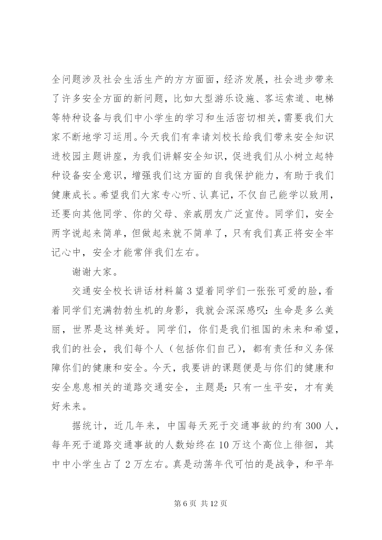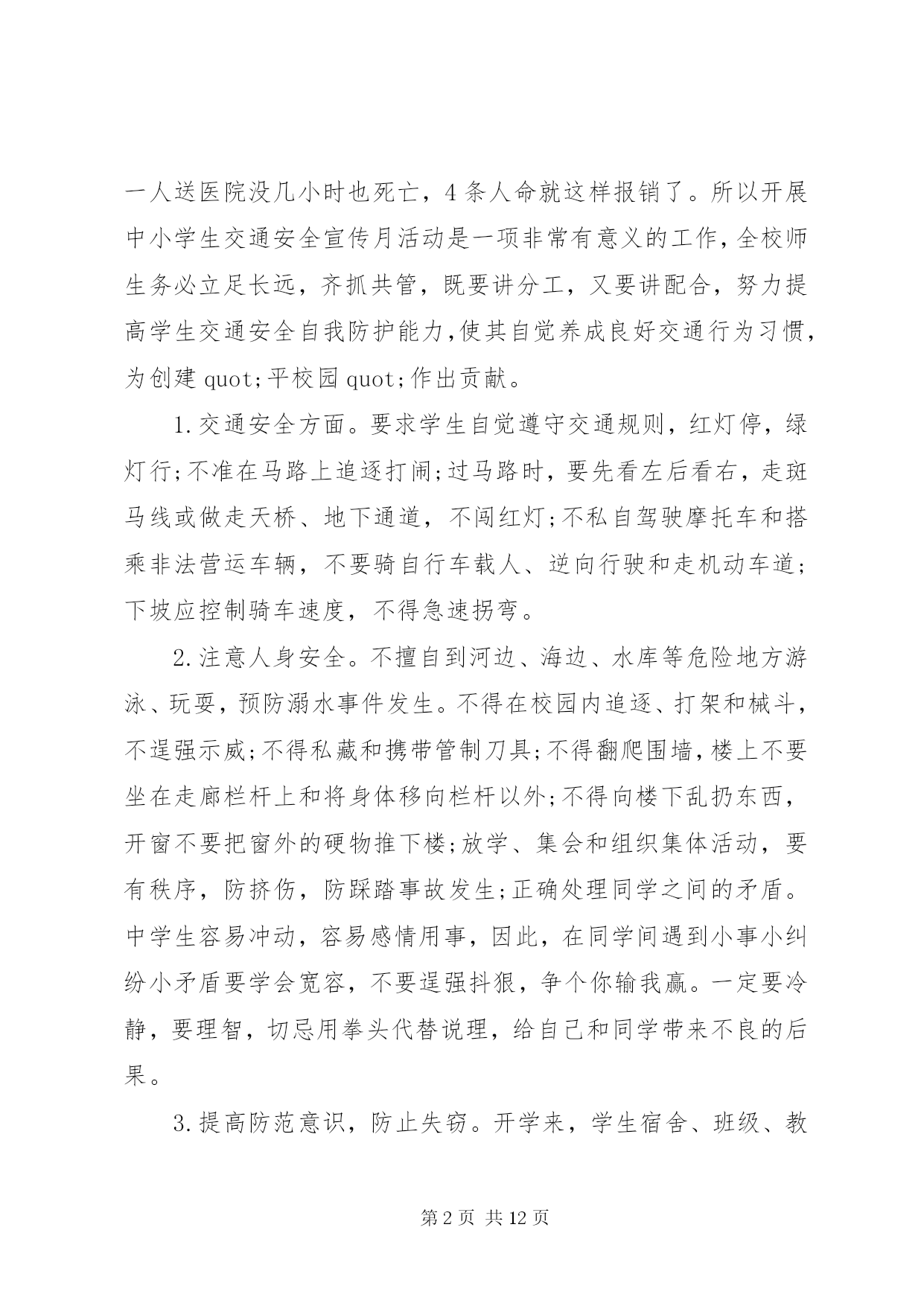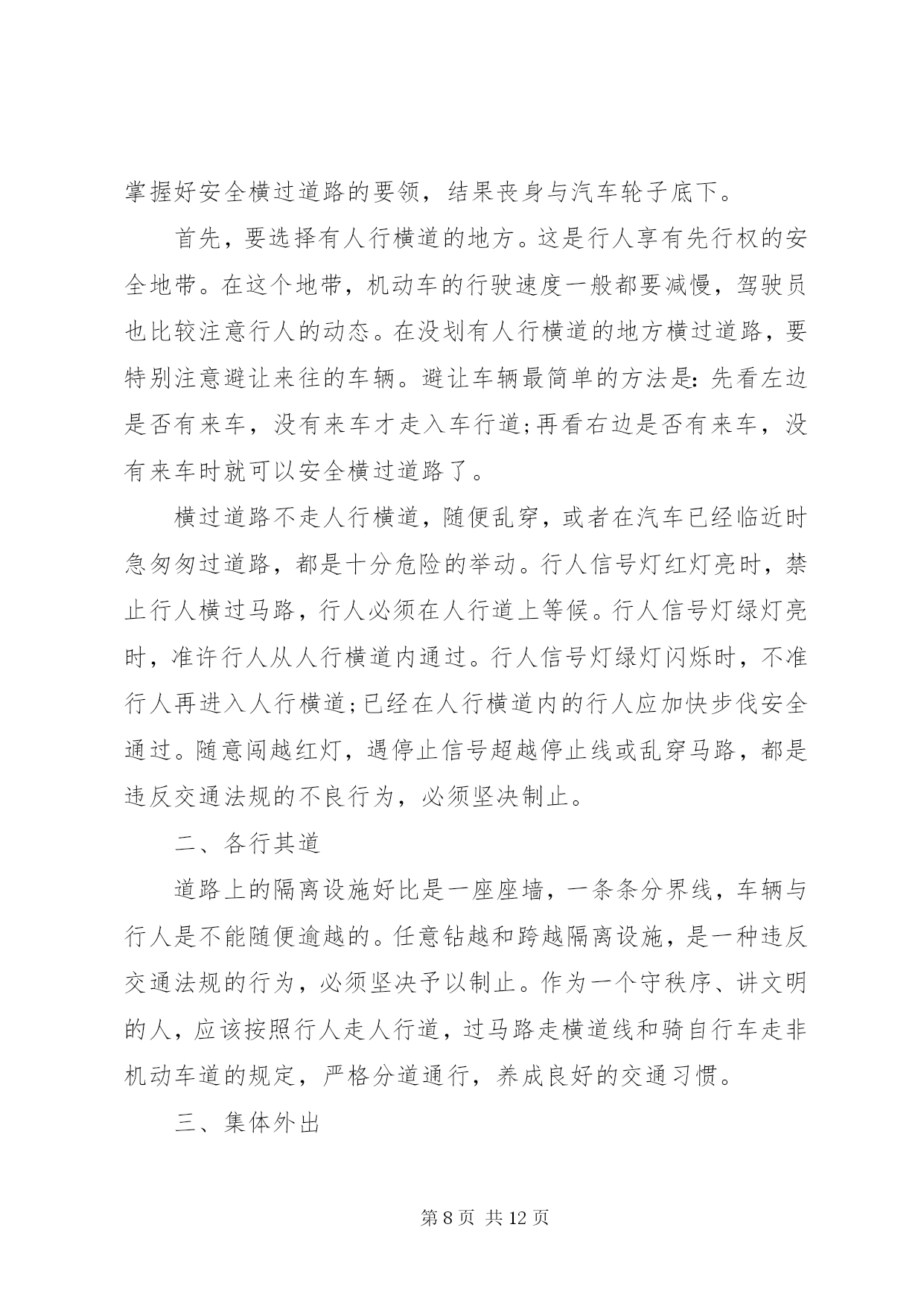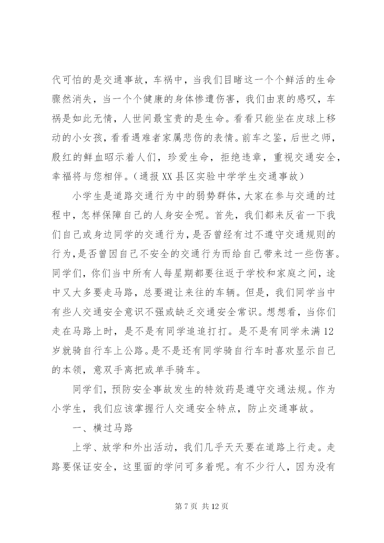 第PAGE\*Arabic\*MERGEFORMAT12页共NUMPAGES\*MERGEFORMAT12页交通安全校长讲话材料交通安全校长讲话材料篇1近年来,我市道路、车辆、驾驶员和交通流量增长迅速,道路交通安全形势不容乐观,交通安全问题,尤其是中小学生的交通安全问题越来越引起全社会的关注。新学年开学了,中小学生的交通安全宣传教育工作也凸显重要。9月3日市教育局、文明办和公安局联合发起quot;关爱生命、平安出行、中小学生交通安全宣传月活动quot;在9月份启动了,学校也根据会议精神制定学校开展quot;关爱生命、平安出行quot;交通安全宣传活动的通知,并发到各年段、班级,请认真贯彻执行。认真落实活动通知的各项要求,通过宣传月活动切实提高中小学生的交通法治意识、交通安全意识和交通文明意识,为预防和减少中小学生道路交通事故打下良好基础。安全是生命之源,安全是幸福之泉;安全是学校健康发展的前提;安全不仅关系师生本人、关系学校、关系家庭,安全同时也维系着我们整个社会、整个国家和整个民族。据有关资料显示,世界上每一分钟都有人死于交通事故,这是文明世界的第一大公害。现在全世界每年死于车祸的人数大约60万人,受伤人数大约一千多万人。我国一年发生的交通死亡达10万多人,每天死于车祸的人数相当于一天掉下一架大型波音747客机,多么触目惊心的数字啊。6月29日凌晨1:00XX县区某中学4名无驾驶证的初中生共骑一辆无排摩托车高速行驶,与一辆轿车相撞,当场死亡3人,另一人送医院没几小时也死亡,4条人命就这样报销了。所以开展中小学生交通安全宣传月活动是一项非常有意义的工作,全校师生务必立足长远,齐抓共管,既要讲分工,又要讲配合,努力提高学生交通安全自我防护能力,使其自觉养成良好交通行为习惯,为创建quot;平校园quot;作出贡献。1.交通安全方面。要求学生自觉遵守交通规则,红灯停,绿灯行;不准在马路上追逐打闹;过马路时,要先看左后看右,走斑马线或做走天桥、地下通道,不闯红灯;不私自驾驶摩托车和搭乘非法营运车辆,不要骑自行车载人、逆向行驶和走机动车道;下坡应控制骑车速度,不得急速拐弯。2.注意人身安全。不擅自到河边、海边、水库等危险地方游泳、玩耍,预防溺水事件发生。不得在校园内追逐、打架和械斗,不逞强示威;不得私藏和携带管制刀具;不得翻爬围墙,楼上不要坐在走廊栏杆上和将身体移向栏杆以外;不得向楼下乱扔东西,开窗不要把窗外的硬物推下楼;放学、集会和组织集体活动,要有秩序,防挤伤,防踩踏事故发生;正确处理同学之间的矛盾。中学生容易冲动,容易感情用事,因此,在同学间遇到小事小纠纷小矛盾要学会宽容,不要逞强抖狠,争个你输我赢。一定要冷静,要理智,切忌用拳头代替说理,给自己和同学带来不良的后果。3.提高防范意识,防止失窃。开学来,学生宿舍、班级、教师办公室等都有发生东西丢失,经现场查勘,均是防范意识松懈,东西乱放,门和抽屉没上锁,给盗贼有机可乘,真是人心隔肚皮,害人之心不可有,防人之心不可无。贵重物品一定要妥善保管好,不带今天不用的钱和物,要提高防范意识,离开班级、办公室、宿舍要锁门。4.注意饮食安全,不得食用变质食品;不购买不法摊贩的食品,不到校外不法小贩铺就餐。(不法商贩、饭铺指无三证即无卫生许可证、无健康证、无工商许可证);不饮用凉水和不清洁水。防食物中毒,有不良反映要立即报告学校。5.防火安全。不玩火、不玩弄电器设备;不准乱接电线,在电线上晾衣物;不准吸烟,不准在宿舍内点蜡烛学习;不准焚烧垃圾;、不要在走廊、楼梯口堆放杂物,保证通道畅通。不准私拉电线用以照明、烧水、做饭、充电、收听录音机、收看电视等。在多媒体教室上课不准乱动电器、开关,下课后由电教管理员关闭电源开关。6.不到三厅二吧(录像厅、游戏厅、营业性歌舞厅、网吧、迪吧),远离毒品、赌博与quot;六合彩quot;等活动。我们应该可以看到那里的环境多么复杂,那里经常发生打架、抢劫、甚至杀人的事件。为了自身的安全,应该远离这些地方。7.注意心理安全。如遇到心理挫折或障碍,应及时调整。最好与信任的人作交流,使心理紧张得到缓解,使心理问题得到及时解决,以保障心理卫生。要有正确的人生观、价值观、世界观。不为社会上不良观念所迷惑,学会心理上的自我保护。总之我们要求同学们要珍惜生命,远离伤害,远离事故。教育学生从小养成遵守交通法律、法规、文明交通的良好习惯,提高中小学生的交通文明意识、交通法治意识、交通安全意识和自我防范能力。学校安全工作无小事,必须加强管理,从严治教。坚决把学生的安全放在更加重要的位置,继续开展和谐校园创建活动,始终保持高度的警觉,不能有丝毫的懈怠和片刻的放松,要做到警钟长鸣,常抓不懈,努力把学校建设成为让学生放心、让家长放心、让社会放心和谐校园。交通安全校长讲