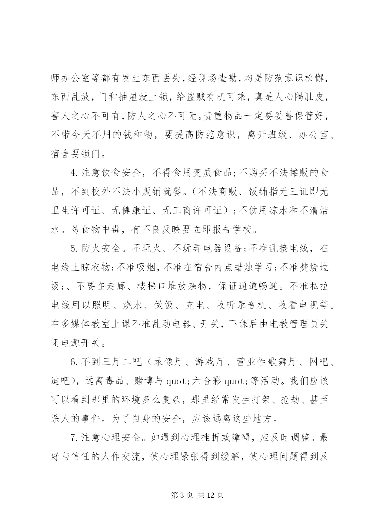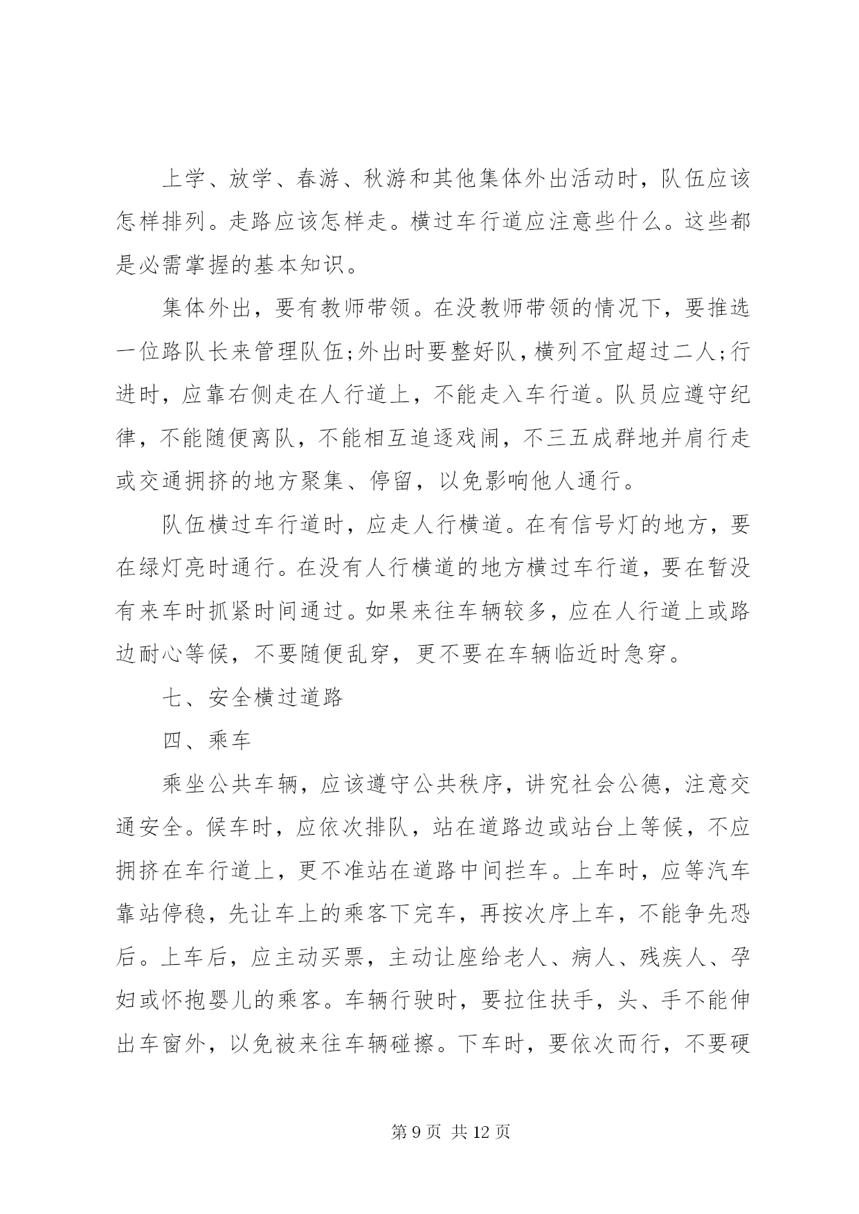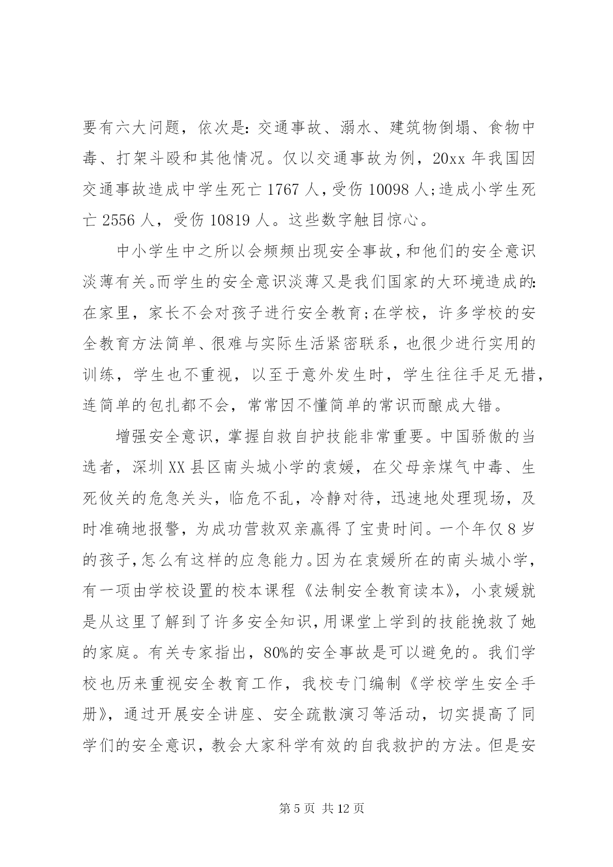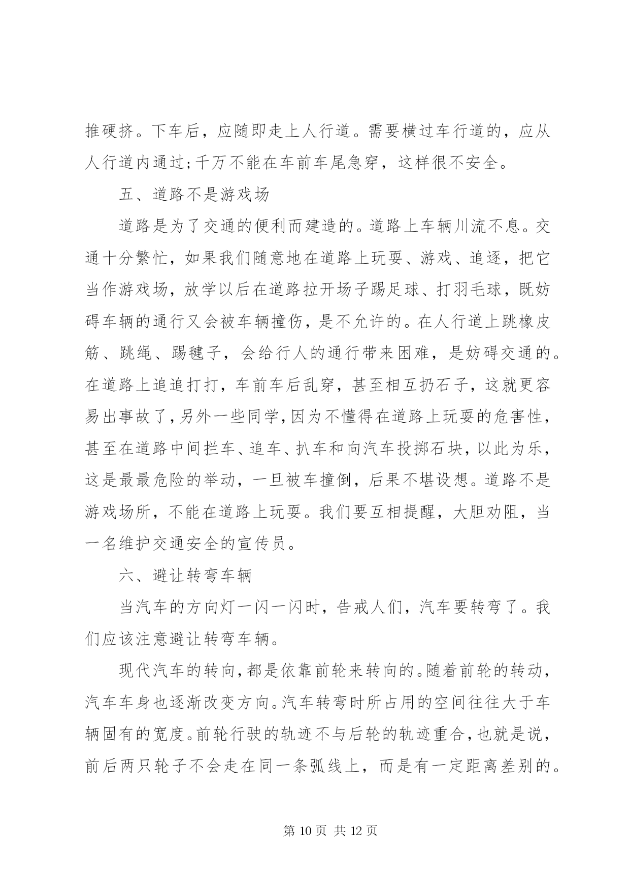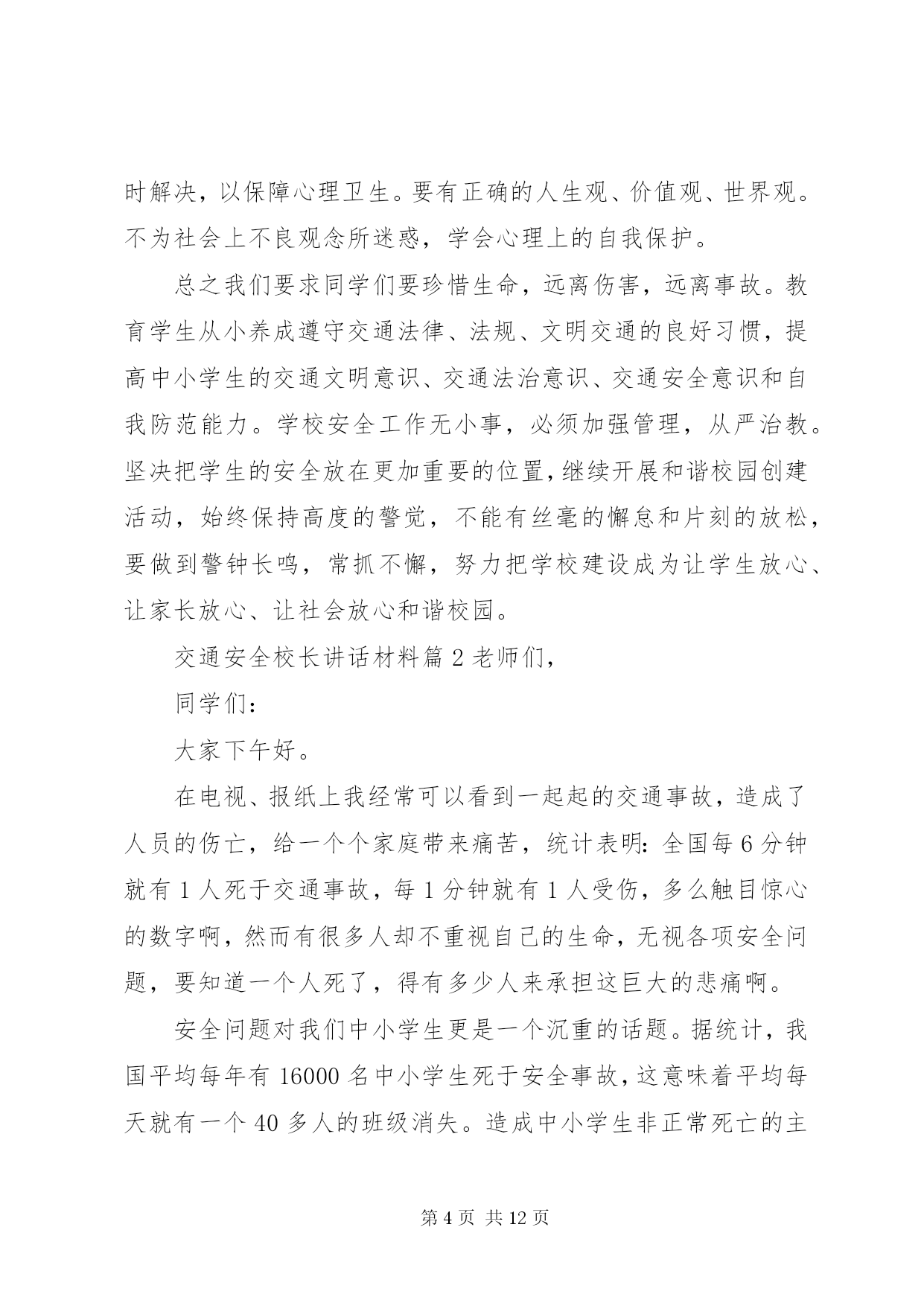 第PAGE\*Arabic\*MERGEFORMAT12页共NUMPAGES\*MERGEFORMAT12页交通安全校长讲话材料交通安全校长讲话材料篇1近年来,我市道路、车辆、驾驶员和交通流量增长迅速,道路交通安全形势不容乐观,交通安全问题,尤其是中小学生的交通安全问题越来越引起全社会的关注。新学年开学了,中小学生的交通安全宣传教育工作也凸显重要。9月3日市教育局、文明办和公安局联合发起quot;关爱生命、平安出行、中小学生交通安全宣传月活动quot;在9月份启动了,学校也根据会议精神制定学校开展quot;关爱生命、平安出行quot;交通安全宣传活动的通知,并发到各年段、班级,请认真贯彻执行。认真落实活动通知的各项要求,通过宣传月活动切实提高中小学生的交通法治意识、交通安全意识和交通文明意识,为预防和减少中小学生道路交通事故打下良好基础。安全是生命之源,安全是幸福之泉;安全是学校健康发展的前提;安全不仅关系师生本人、关系学校、关系家庭,安全同时也维系着我们整个社会、整个国家和整个民族。据有关资料显示,世界上每一分钟都有人死于交通事故,这是文明世界的第一大公害。现在全世界每年死于车祸的人数大约60万人,受伤人数大约一千多万人。我国一年发生的交通死亡达10万多人,每天死于车祸的人数相当于一天掉下一架大型波音747客机,多么触目惊心的数字啊。6月29日凌晨1:00XX县区某中学4名无驾驶证的初中生共骑一辆无排摩托车高速行驶,与一辆轿车相撞,当场死亡3人,另一人送医院没几小时也死亡,4条人命就这样报销了。所以开展中小学生交通安全宣传月活动是一项非常有意义的工作,全校师生务必立足长远,齐抓共管,既要讲分工,又要讲配合,努力提高学生交通安全自我防护能力,使其自觉养成良好交通行为习惯,为创建quot;平校园quot;作出贡献。1.交通安全方面。要求学生自觉遵守交通规则,红灯停,绿灯行;不准在马路上追逐打闹;过马路时,要先看左后看右,走斑马线或做走天桥、地下通道,不闯红灯;不私自驾驶摩托车和搭乘非法营运车辆,不要骑自行车载人、逆向行驶和走机动车道;下坡应控制骑车速度,不得急速拐弯。2.注意人身安全。不擅自到河边、海边、水库等危险地方游泳、玩耍,预防溺水事件发生。不得在校园内追逐、打架和械斗,不逞强示威;不得私藏和携带管制刀具;不得翻爬围墙,楼上不要坐在走廊栏杆上和将身体移向栏杆以外;不得向楼下乱扔东西,开窗不要把窗外的硬物推下楼;放学、集会和组织集体活动,要有秩序,防挤伤,防踩踏事故发生;正确处理同学之间的矛盾。中学生容易冲动,容易感情用事,因此,在同学间遇到小事小纠纷小矛盾要学会宽容,不要逞强抖狠,争个你输我赢。一定要冷静,要理智,切忌用拳头代替说理,给自己和同学带来不良的后果。3.提高防范意识,防止失窃。开学来,学生宿舍、班级、教师办公室等都有发生东西丢失,经现场查勘,均是防范意识松懈,东西乱放,门和抽屉没上锁,给盗贼有机可乘,真是人心隔肚皮,害人之心不可有,防人之心不可无。贵重物品一定要妥善保管好,不带今天不用的钱和物,要提高防范意识,离开班级、办公室、宿舍要锁门。4.注意饮食安全,不得食用变质食品;不购买不法摊贩的食品,不到校外不法小贩铺就餐。(不法商贩、饭铺指无三证即无卫生许可证、无健康证、无工商许可证);不饮用凉水和不清洁水。防食物中毒,有不良反映要立即报告学校。5.防火安全。不玩火、不玩弄电器设备;不准乱接电线,在电线上晾衣物;不准吸烟,不准在宿舍内点蜡烛学习;不准焚烧垃圾;、不要在走廊、楼梯口堆放杂物,保证通道畅通。不准私拉电线用以照明、烧水、做饭、充电、收听录音机、收看电视等。在多媒体教室上课不准乱动电器、开关,下课后由电教管理员关闭电源开关。6.不到三厅二吧(录像厅、游戏厅、营业性歌舞厅、网吧、迪吧),远离毒品、赌博与quot;六合彩quot;等活动。我们应该可以看到那里的环境多么复杂,那里经常发生打架、抢劫、甚至杀人的事件。为了自身的安全,应该远离这些地方。7.注意心理安全。如遇到心理挫折或障碍,应及时调整。最好与信任的人作交流,使心理紧张得到缓解,使心理问题得到及时解决,以保障心理卫生。要有正确的人生观、价值观、世界观。不为社会上不良观念所迷惑,学会心理上的自我保护。总之我们要求同学们要珍惜生命,远离伤害,远离事故。教育学生从小养成遵守交通法律、法规、文明交通的良好习惯,提高中小学生的交通文明意识、交通法治意识、交通安全意识和自我防范能力。学校安全工作无小事,必须加强管理,从严治教。坚决把学生的安全放在更加重要的位置,继续开展和谐校园创建活动,始终保持高度的警觉,不能有丝毫的懈怠和片刻的放松,要做到警钟长鸣,常抓不懈,努力把学校建设成为让学生放心、让家长放心、让社会放心和谐校园。交通安全校长讲