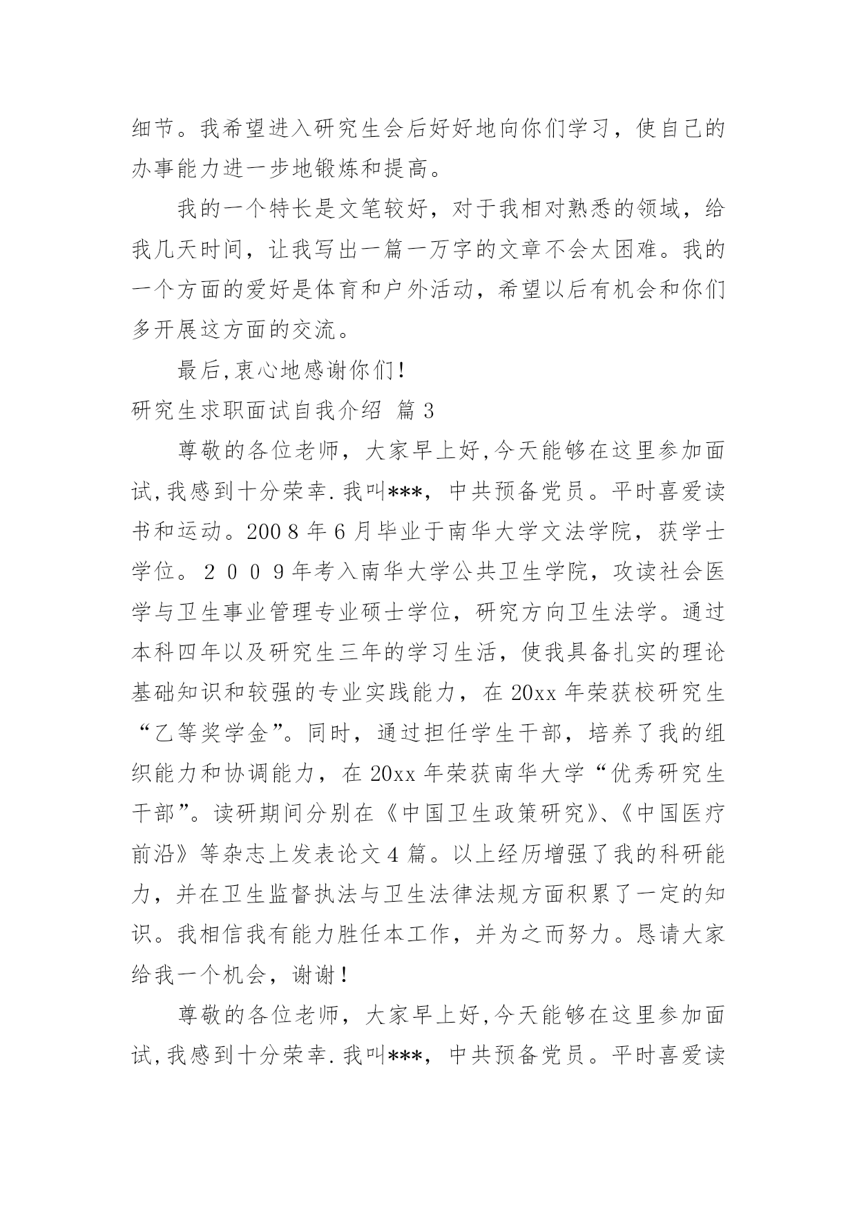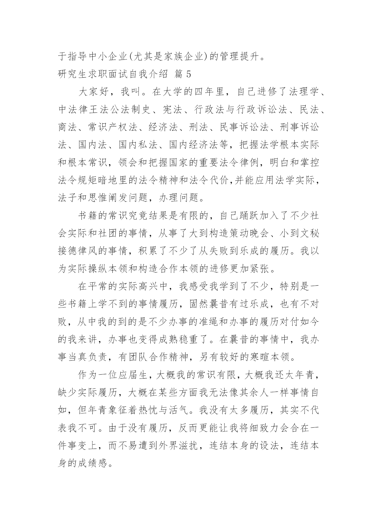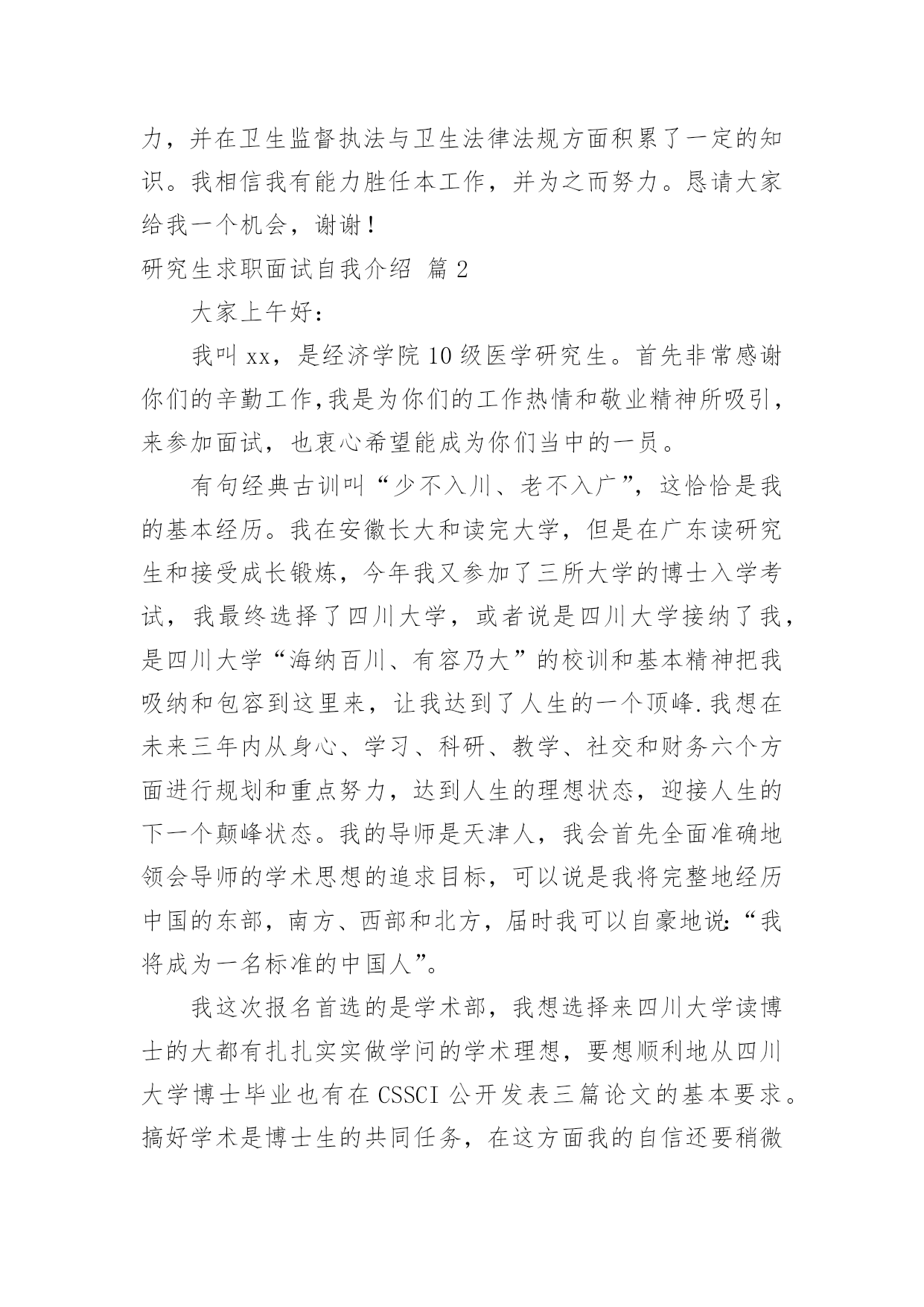 研究生求职面试自我介绍研究生求职面试自我介绍合集五篇来到一个陌生的地方时,我们有必要进行适当的自我介绍,自我介绍可以满足我们渴望得到尊重的心理。那么我们该怎么去写自我介绍呢?以下是小编收集整理的研究生求职面试自我介绍6篇,希望能够帮助到大家。研究生求职面试自我介绍篇1尊敬的各位老师,大家早上好,今天能够在这里参加面试,我感到十分荣幸.我叫***,中共预备党员。平时喜爱读书和运动。2008年6月毕业于南华大学文法学院,获学士学位。2009年考入南华大学公共卫生学院,攻读社会医学与卫生事业管理专业硕士学位,研究方向卫生法学。通过本科四年以及研究生三年的学习生活,使我具备扎实的理论基础知识和较强的专业实践能力,在20xx年荣获校研究生“乙等奖学金”。同时,通过担任学生干部,培养了我的组织能力和协调能力,在20xx年荣获南华大学“优秀研究生干部”。读研期间分别在《中国卫生政策研究》、《中国医疗前沿》等杂志上发表论文4篇。以上经历增强了我的科研能力,并在卫生监督执法与卫生法律法规方面积累了一定的知识。我相信我有能力胜任本工作,并为之而努力。恳请大家给我一个机会,谢谢!尊敬的各位老师,大家早上好,今天能够在这里参加面试,我感到十分荣幸.我叫***,中共预备党员。平时喜爱读书和运动。2008年6月毕业于南华大学文法学院,获学士学位。2009年考入南华大学公共卫生学院,攻读社会医学与卫生事业管理专业硕士学位,研究方向卫生法学。通过本科四年以及研究生三年的学习生活,使我具备扎实的理论基础知识和较强的专业实践能力,在20xx年荣获校研究生“乙等奖学金”。同时,通过担任学生干部,培养了我的组织能力和协调能力,在20xx年荣获南华大学“优秀研究生干部”。读研期间分别在《中国卫生政策研究》、《中国医疗前沿》等杂志上发表论文4篇。以上经历增强了我的科研能力,并在卫生监督执法与卫生法律法规方面积累了一定的知识。我相信我有能力胜任本工作,并为之而努力。恳请大家给我一个机会,谢谢!尊敬的各位老师,大家早上好,今天能够在这里参加面试,我感到十分荣幸.我叫***,中共预备党员。平时喜爱读书和运动。2008年6月毕业于南华大学文法学院,获学士学位。2009年考入南华大学公共卫生学院,攻读社会医学与卫生事业管理专业硕士学位,研究方向卫生法学。通过本科四年以及研究生三年的学习生活,使我具备扎实的理论基础知识和较强的专业实践能力,在20xx年荣获校研究生“乙等奖学金”。同时,通过担任学生干部,培养了我的组织能力和协调能力,在20xx年荣获南华大学“优秀研究生干部”。读研期间分别在《中国卫生政策研究》、《中国医疗前沿》等杂志上发表论文4篇。以上经历增强了我的科研能力,并在卫生监督执法与卫生法律法规方面积累了一定的知识。我相信我有能力胜任本工作,并为之而努力。恳请大家给我一个机会,谢谢!研究生求职面试自我介绍篇2大家上午好:我叫xx,是经济学院10级医学研究生。首先非常感谢你们的辛勤工作,我是为你们的工作热情和敬业精神所吸引,来参加面试,也衷心希望能成为你们当中的一员。有句经典古训叫“少不入川、老不入广”,这恰恰是我的基本经历。我在安徽长大和读完大学,但是在广东读研究生和接受成长锻炼,今年我又参加了三所大学的博士入学考试,我最终选择了四川大学,或者说是四川大学接纳了我,是四川大学“海纳百川、有容乃大”的校训和基本精神把我吸纳和包容到这里来,让我达到了人生的一个顶峰.我想在未来三年内从身心、学习、科研、教学、社交和财务六个方面进行规划和重点努力,达到人生的理想状态,迎接人生的下一个颠峰状态。我的导师是天津人,我会首先全面准确地领会导师的学术思想的追求目标,可以说是我将完整地经历中国的东部,南方、西部和北方,届时我可以自豪地说:“我将成为一名标准的中国人”。我这次报名首选的是学术部,我想选择来四川大学读博士的大都有扎扎实实做学问的学术理想,要想顺利地从四川大学博士毕业也有在CSSCI公开发表三篇论文的基本要求。搞好学术是博士生的共同任务,在这方面我的自信还要稍微多一点,其中的一个重要原因在于我亲眼目睹了我的两位研究生同学公开发表文章超过50篇,我同样不敢置信的是我的一位大学同学已经在《经济研究》、《管理世界》等经管类顶尖刊物上发表文章。我在来四川大学之前还专门对他们进行了一次告别旅行和访问,向他们承诺此次我来四川大学读博士的一个重要使命就是要重现他们的学术辉煌。当然我非常清楚以我现在的基础,这个过程将会是相当的艰辛和曲折,现在只是万里长征才迈出了第一步。要实现目标,除了勤奋,恐怕需要更多地讲究方法、技巧和充分发挥自身的潜能。这个过程越是艰辛我越是感觉到有必要参加到研究生会学术部中来,以自己宏大的学术目标、明确的前进方向再加上脚踏实地的努力在研究生群体中形成一种发奋投身于学术的