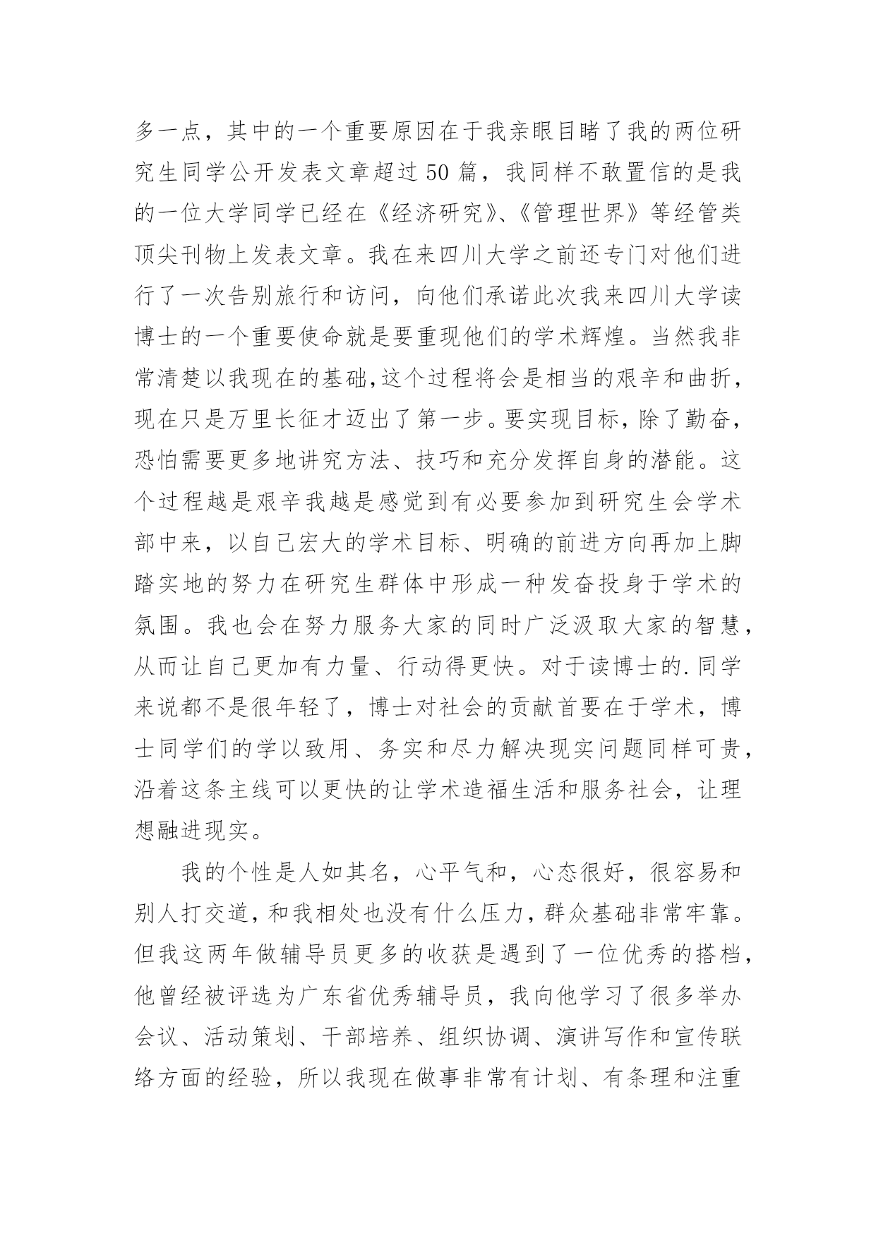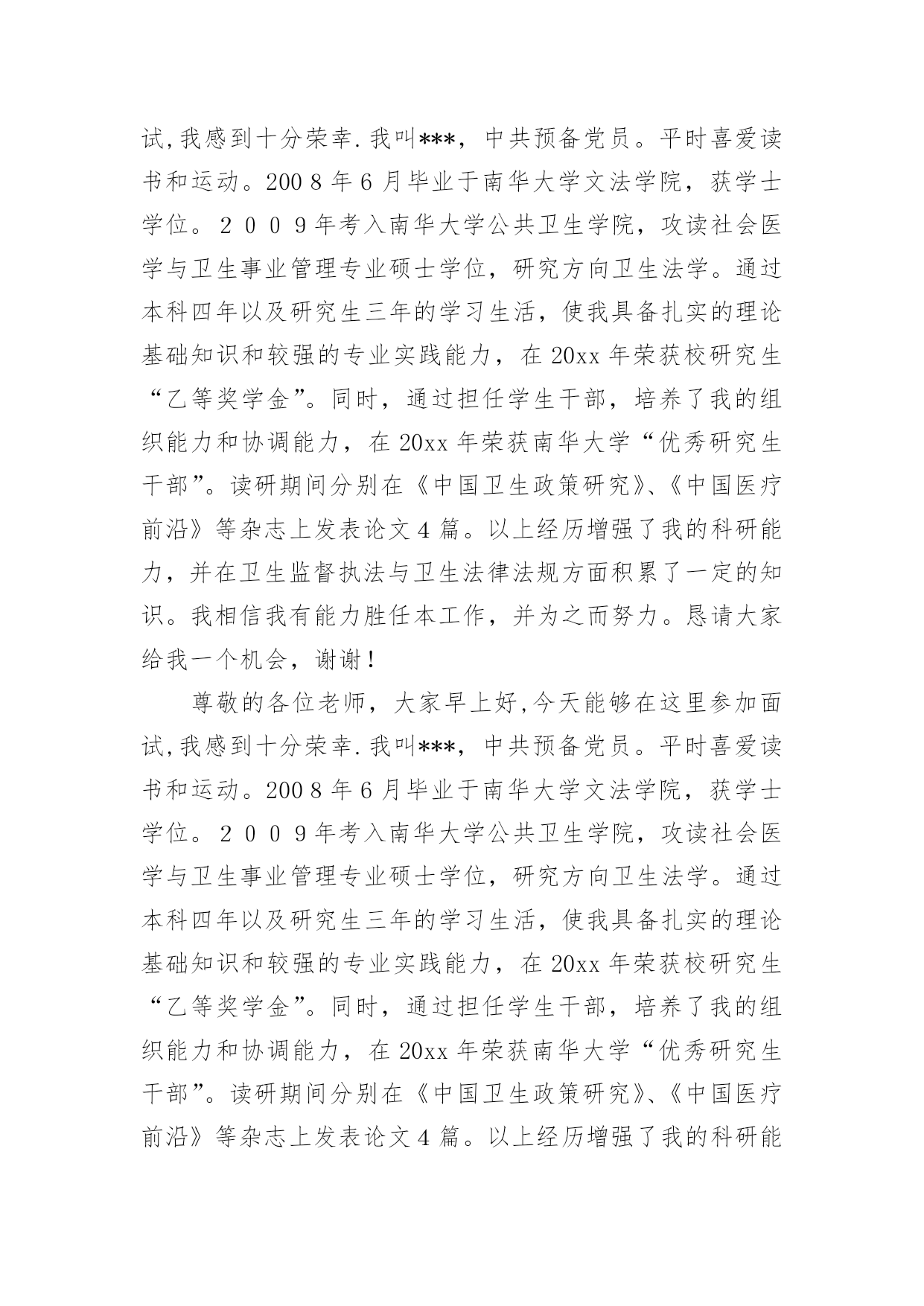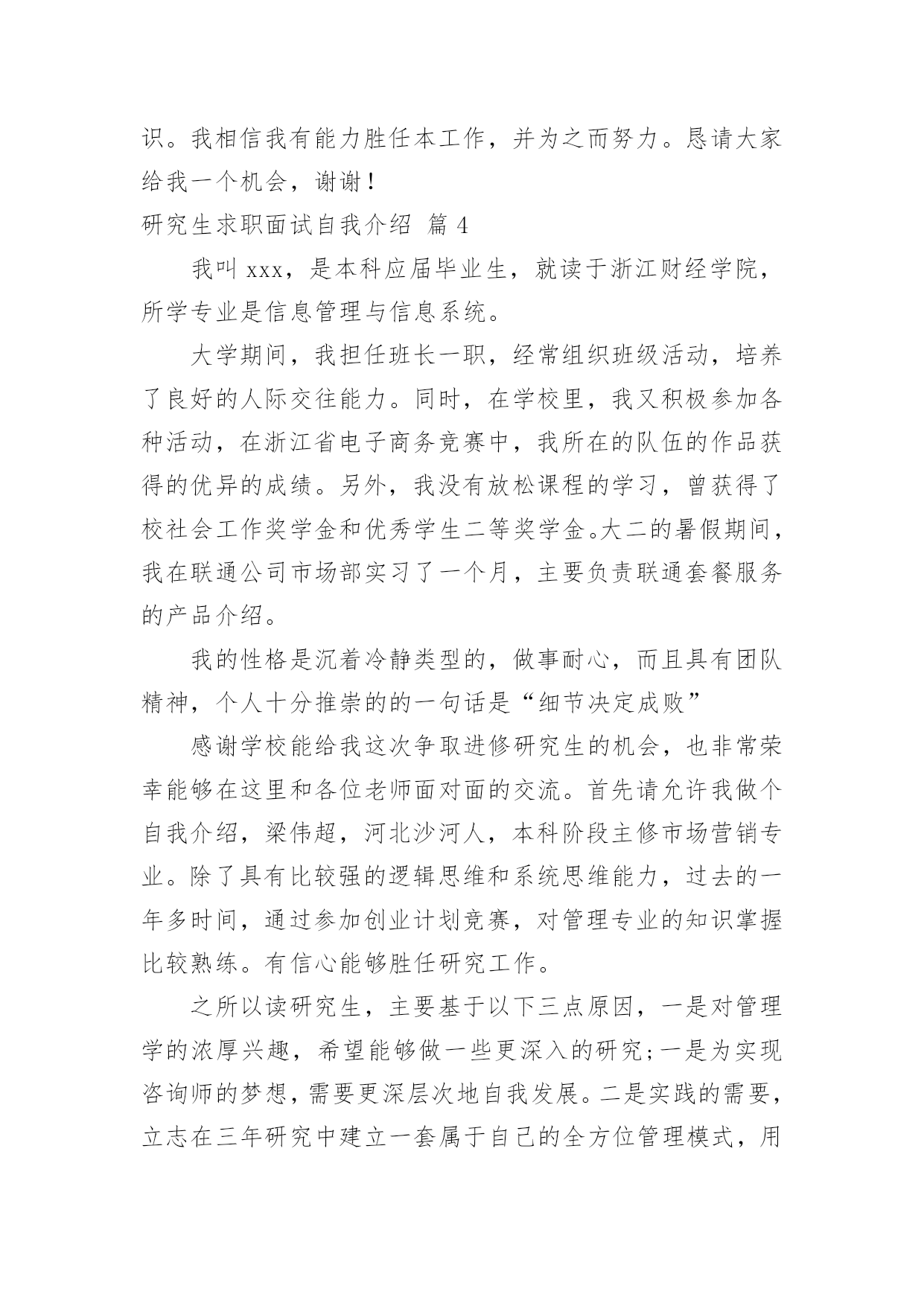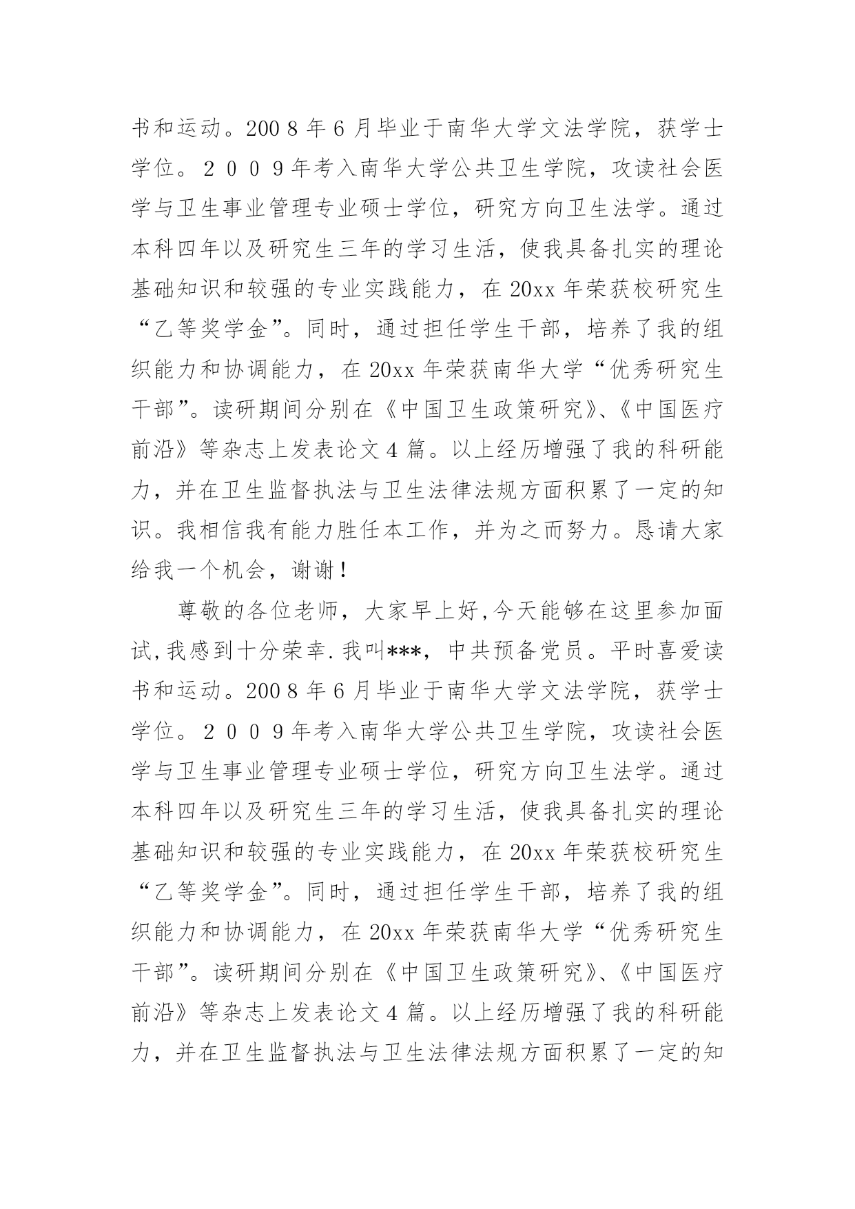 研究生求职面试自我介绍研究生求职面试自我介绍合集五篇来到一个陌生的地方时,我们有必要进行适当的自我介绍,自我介绍可以满足我们渴望得到尊重的心理。那么我们该怎么去写自我介绍呢?以下是小编收集整理的研究生求职面试自我介绍6篇,希望能够帮助到大家。研究生求职面试自我介绍篇1尊敬的各位老师,大家早上好,今天能够在这里参加面试,我感到十分荣幸.我叫***,中共预备党员。平时喜爱读书和运动。2008年6月毕业于南华大学文法学院,获学士学位。2009年考入南华大学公共卫生学院,攻读社会医学与卫生事业管理专业硕士学位,研究方向卫生法学。通过本科四年以及研究生三年的学习生活,使我具备扎实的理论基础知识和较强的专业实践能力,在20xx年荣获校研究生“乙等奖学金”。同时,通过担任学生干部,培养了我的组织能力和协调能力,在20xx年荣获南华大学“优秀研究生干部”。读研期间分别在《中国卫生政策研究》、《中国医疗前沿》等杂志上发表论文4篇。以上经历增强了我的科研能力,并在卫生监督执法与卫生法律法规方面积累了一定的知识。我相信我有能力胜任本工作,并为之而努力。恳请大家给我一个机会,谢谢!尊敬的各位老师,大家早上好,今天能够在这里参加面试,我感到十分荣幸.我叫***,中共预备党员。平时喜爱读书和运动。2008年6月毕业于南华大学文法学院,获学士学位。2009年考入南华大学公共卫生学院,攻读社会医学与卫生事业管理专业硕士学位,研究方向卫生法学。通过本科四年以及研究生三年的学习生活,使我具备扎实的理论基础知识和较强的专业实践能力,在20xx年荣获校研究生“乙等奖学金”。同时,通过担任学生干部,培养了我的组织能力和协调能力,在20xx年荣获南华大学“优秀研究生干部”。读研期间分别在《中国卫生政策研究》、《中国医疗前沿》等杂志上发表论文4篇。以上经历增强了我的科研能力,并在卫生监督执法与卫生法律法规方面积累了一定的知识。我相信我有能力胜任本工作,并为之而努力。恳请大家给我一个机会,谢谢!尊敬的各位老师,大家早上好,今天能够在这里参加面试,我感到十分荣幸.我叫***,中共预备党员。平时喜爱读书和运动。2008年6月毕业于南华大学文法学院,获学士学位。2009年考入南华大学公共卫生学院,攻读社会医学与卫生事业管理专业硕士学位,研究方向卫生法学。通过本科四年以及研究生三年的学习生活,使我具备扎实的理论基础知识和较强的专业实践能力,在20xx年荣获校研究生“乙等奖学金”。同时,通过担任学生干部,培养了我的组织能力和协调能力,在20xx年荣获南华大学“优秀研究生干部”。读研期间分别在《中国卫生政策研究》、《中国医疗前沿》等杂志上发表论文4篇。以上经历增强了我的科研能力,并在卫生监督执法与卫生法律法规方面积累了一定的知识。我相信我有能力胜任本工作,并为之而努力。恳请大家给我一个机会,谢谢!研究生求职面试自我介绍篇2大家上午好:我叫xx,是经济学院10级医学研究生。首先非常感谢你们的辛勤工作,我是为你们的工作热情和敬业精神所吸引,来参加面试,也衷心希望能成为你们当中的一员。有句经典古训叫“少不入川、老不入广”,这恰恰是我的基本经历。我在安徽长大和读完大学,但是在广东读研究生和接受成长锻炼,今年我又参加了三所大学的博士入学考试,我最终选择了四川大学,或者说是四川大学接纳了我,是四川大学“海纳百川、有容乃大”的校训和基本精神把我吸纳和包容到这里来,让我达到了人生的一个顶峰.我想在未来三年内从身心、学习、科研、教学、社交和财务六个方面进行规划和重点努力,达到人生的理想状态,迎接人生的下一个颠峰状态。我的导师是天津人,我会首先全面准确地领会导师的学术思想的追求目标,可以说是我将完整地经历中国的东部,南方、西部和北方,届时我可以自豪地说:“我将成为一名标准的中国人”。我这次报名首选的是学术部,我想选择来四川大学读博士的大都有扎扎实实做学问的学术理想,要想顺利地从四川大学博士毕业也有在CSSCI公开发表三篇论文的基本要求。搞好学术是博士生的共同任务,在这方面我的自信还要稍微多一点,其中的一个重要原因在于我亲眼目睹了我的两位研究生同学公开发表文章超过50篇,我同样不敢置信的是我的一位大学同学已经在《经济研究》、《管理世界》等经管类顶尖刊物上发表文章。我在来四川大学之前还专门对他们进行了一次告别旅行和访问,向他们承诺此次我来四川大学读博士的一个重要使命就是要重现他们的学术辉煌。当然我非常清楚以我现在的基础,这个过程将会是相当的艰辛和曲折,现在只是万里长征才迈出了第一步。要实现目标,除了勤奋,恐怕需要更多地讲究方法、技巧和充分发挥自身的潜能。这个过程越是艰辛我越是感觉到有必要参加到研究生会学术部中来,以自己宏大的学术目标、明确的前进方向再加上脚踏实地的努力在研究生群体中形成一种发奋投身于学术的