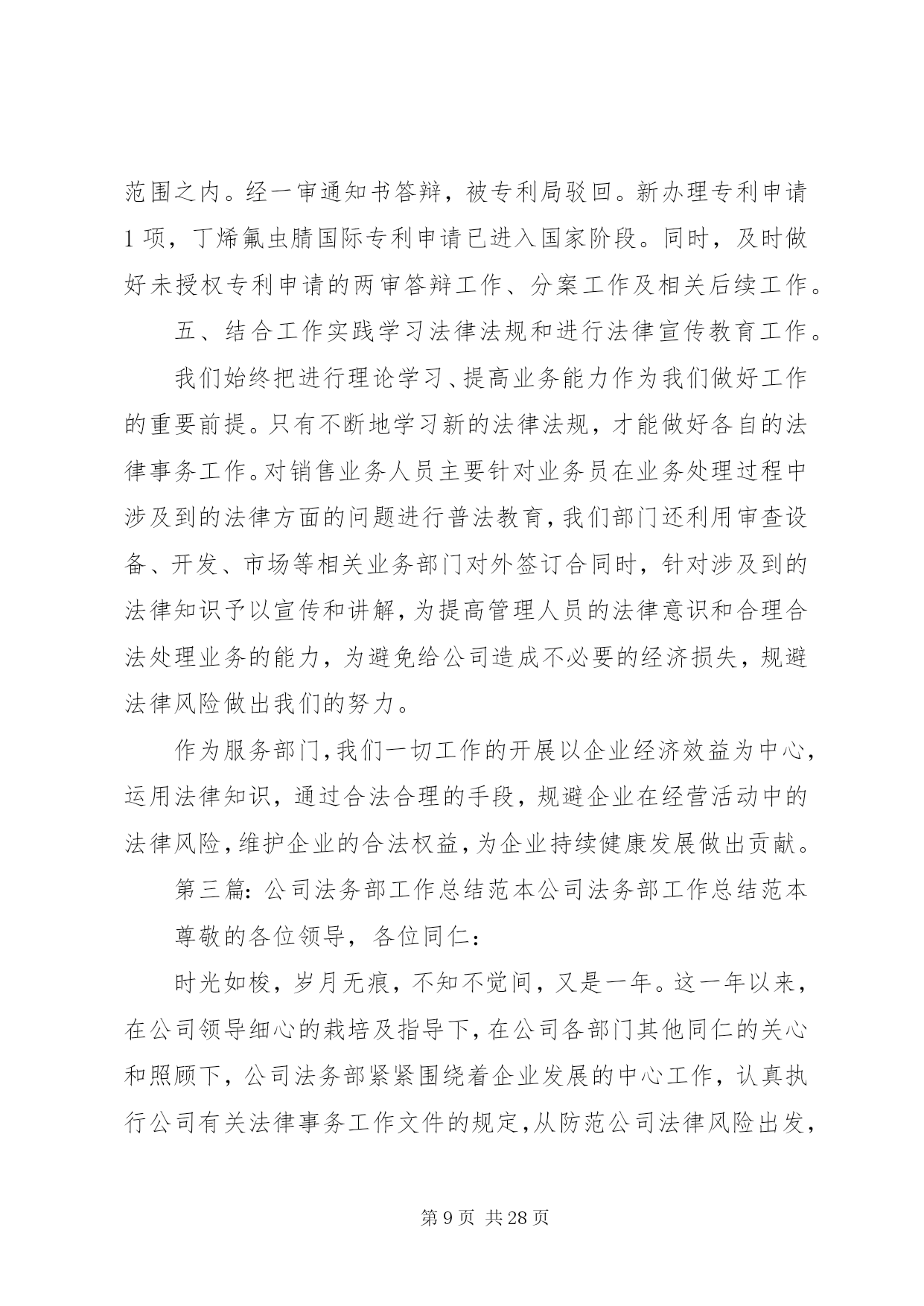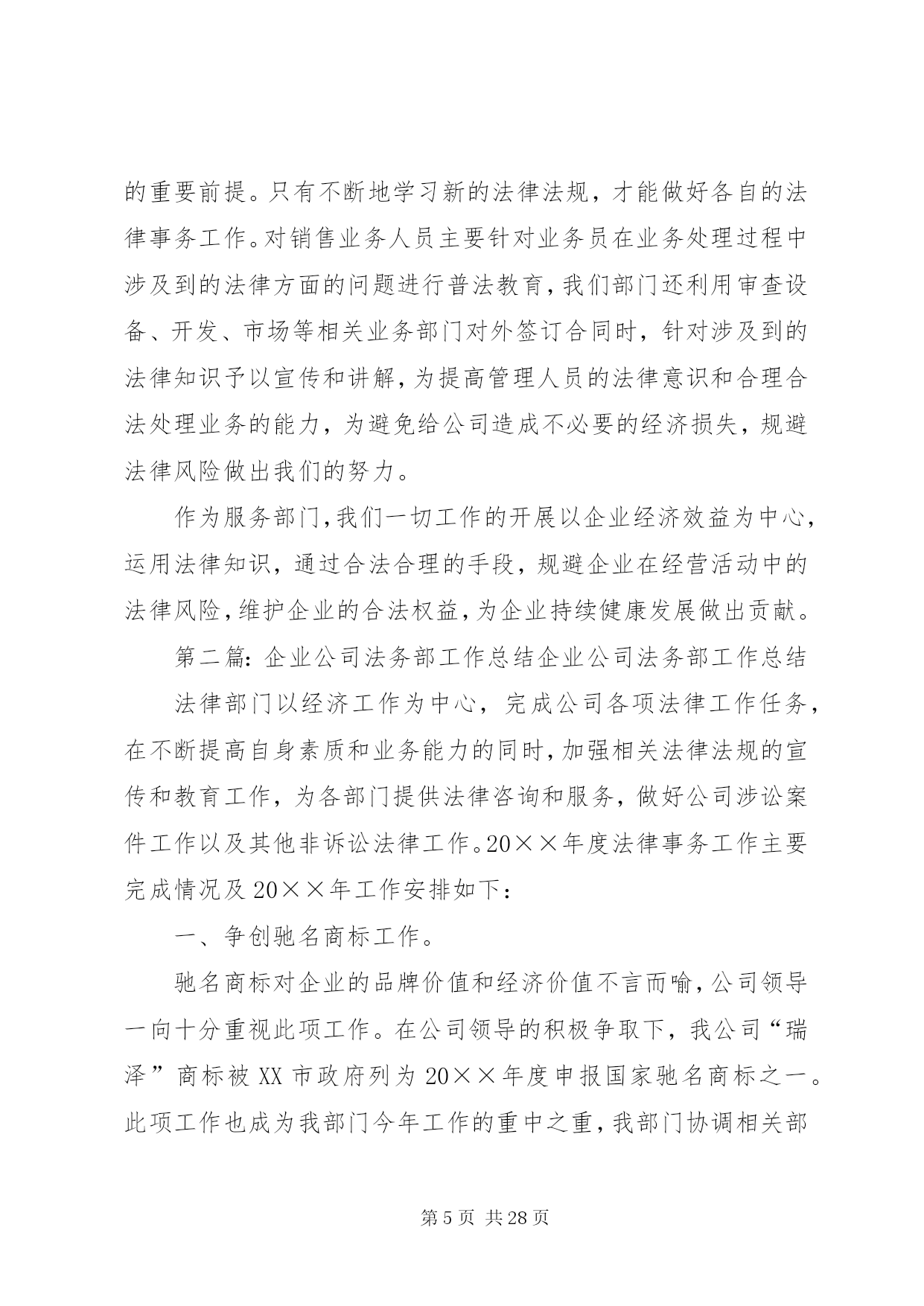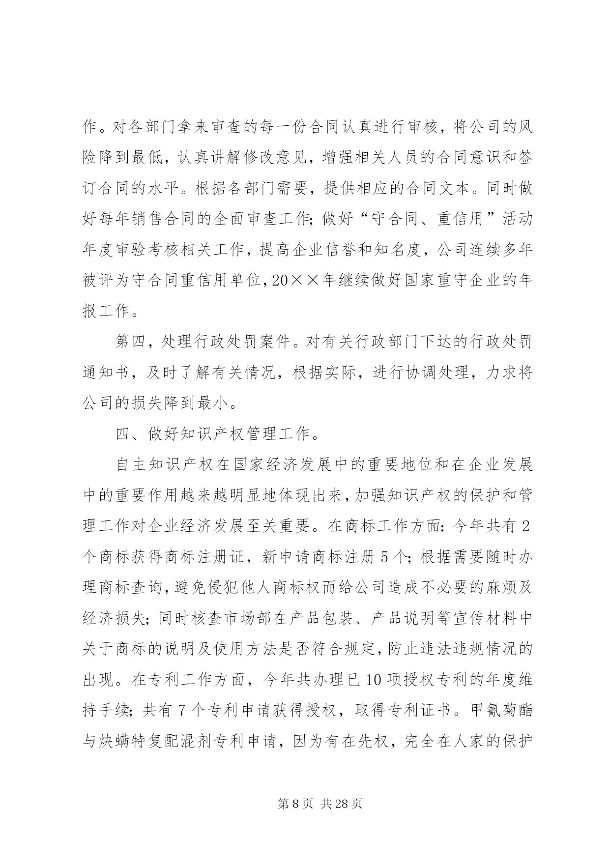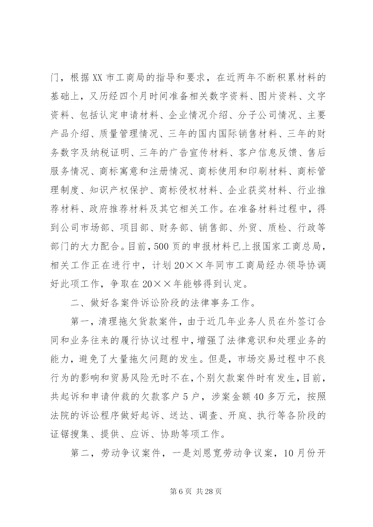 第PAGE\*Arabic\*MERGEFORMAT28页共NUMPAGES\*MERGEFORMAT28页企业公司法务部工作总结法律部门以经济工作为中心,完成公司各项法律工作任务,在不断提高自身素质和业务能力的同时,加强相关法律法规的宣传和教育工作,为各部门提供法律咨询和服务,做好公司涉讼案件工作以及其他非诉讼法律工作。20××年度法律事务工作主要完成情况及20××年工作安排如下:一、争创驰名商标工作。驰名商标对企业的品牌价值和经济价值不言而喻,公司领导一向十分重视此项工作。在公司领导的积极争取下,我公司“瑞泽”商标被XX市政府列为20××年度申报国家驰名商标之一。此项工作也成为我部门今年工作的重中之重,我部门协调相关部门,根据XX市工商局的指导和要求,在近两年不断积累材料的基础上,又历经四个月时间准备相关数字资料、图片资料、文字资料、包括认定申请材料、企业情况介绍、分子公司情况、主要产品介绍、质量管理情况、三年的国内国际销售材料、三年的财务数字及纳税证明、三年的广告宣传材料、客户信息反馈、售后服务情况、商标寓意和注册情况、商标使用和印刷材料、商标管理制度、知识产权保护、商标侵权材料、企业获奖材料、行业推荐材料、政府推荐材料及其它相关工作。在准备材料过程中,得到公司市场部、项目部、财务部、销售部、外贸、质检、行政等部门的大力配合。目前,500页的申报材料已上报国家工商总局,相关工作正在进行中,计划20××年同市工商局经办领导协调好此项工作,争取在20××年能够得到认定。二、做好各案件诉讼阶段的法律事务工作。第一,清理拖欠货款案件,由于近几年业务人员在外签订合同和业务往来的履行协议过程中,增强了法律意识和处理业务的能力,避免了大量拖欠问题的发生。但是,市场交易过程中不良行为的影响和贸易风险无时不在,个别欠款案件时有发生,目前,共起诉和申请仲裁的欠款客户5户,涉案金额40多万元,按照法院的诉讼程序做好起诉、送达、调查、开庭、执行等各阶段的证锯搜集、提供、应诉、协助等项工作。第二,劳动争议案件,一是刘恩宽劳动争议案,10月份开庭,20××年1月14日在市中院开庭,现尚未判决;二是十名职工的劳动争议案,双方在政府部门的干预下达成调解协议。另外,又有23名职工到法院起诉,诉讼理由是要求给付终止劳动合同补偿金,我们积极准备相关证据、进行答辩,已于1月16日和17日开庭。第三,农民药害索赔案件,建三江农垦法庭审理的田归农药害案件,诉讼标的为12万余元,经我们的大量工作,经法院两审已做出终审判决,驳回农民的诉讼请求,我公司取得了胜诉,避免了经济损失。20××年,继续做好对诉讼和执行案件的证据收集和及时提供,更好地维护企业的合法权益。三、做好公司非诉讼法律工作,为公司经济发展服务。第一,做好打假维权工作。配合相关部门针对部分农药厂家不正当竞争、侵犯名称权、商标权等违法违规行为进行协调、举报,尤其是做好打击冒牌产品的违法行为。第二,做好领导决策和相关部门的法律顾问工作。在公司对外签订重大投资合同和技术合作协议过程中,做好合同的审查工作,及时提供相关法律意见,供领导决策时参考。为销售员在业务过程中需要办理的抵押、质押、保证等担保行为提供法律指导,包括各个必须程序及在各个程序中应注意的问题,提供各种所需法律材料等,避免经营风险。为业务员所需签订的分装协议及其他各种合作协议提供法律指导及样本。第三,加强合同管理工作。做好公司外签合同的审查管理工作。对各部门拿来审查的每一份合同认真进行审核,将公司的风险降到最低,认真讲解修改意见,增强相关人员的合同意识和签订合同的水平。根据各部门需要,提供相应的合同文本。同时做好每年销售合同的全面审查工作;做好“守合同、重信用”活动年度审验考核相关工作,提高企业信誉和知名度,公司连续多年被评为守合同重信用单位,20××年继续做好国家重守企业的年报工作。第四,处理行政处罚案件。对有关行政部门下达的行政处罚通知书,及时了解有关情况,根据实际,进行协调处理,力求将公司的损失降到最小。四、做好知识产权管理工作。自主知识产权在国家经济发展中的重要地位和在企业发展中的重要作用越来越明显地体现出来,加强知识产权的保护和管理工作对企业经济发展至关重要。在商标工作方面:今年共有2个商标获得商标注册证,新申请商标注册5个;根据需要随时办理商标查询,避免侵犯他人商标权而给公司造成不必要的麻烦及经济损失;同时核查市场部在产品包装、产品说明等宣传材料中关于商标的说明及使用方法是否符合规定,防止违法违规情况的出现。在专利工作方面,今年共办理已10项授权专利的年度维持手续;共有7个专利申请获得授权,取得专利证书。甲氰菊酯与炔螨特复配混剂专利申请,因为有在先权,完全在人家的保护范围之内。经一审通知书答辩,被专利局驳回。新办理