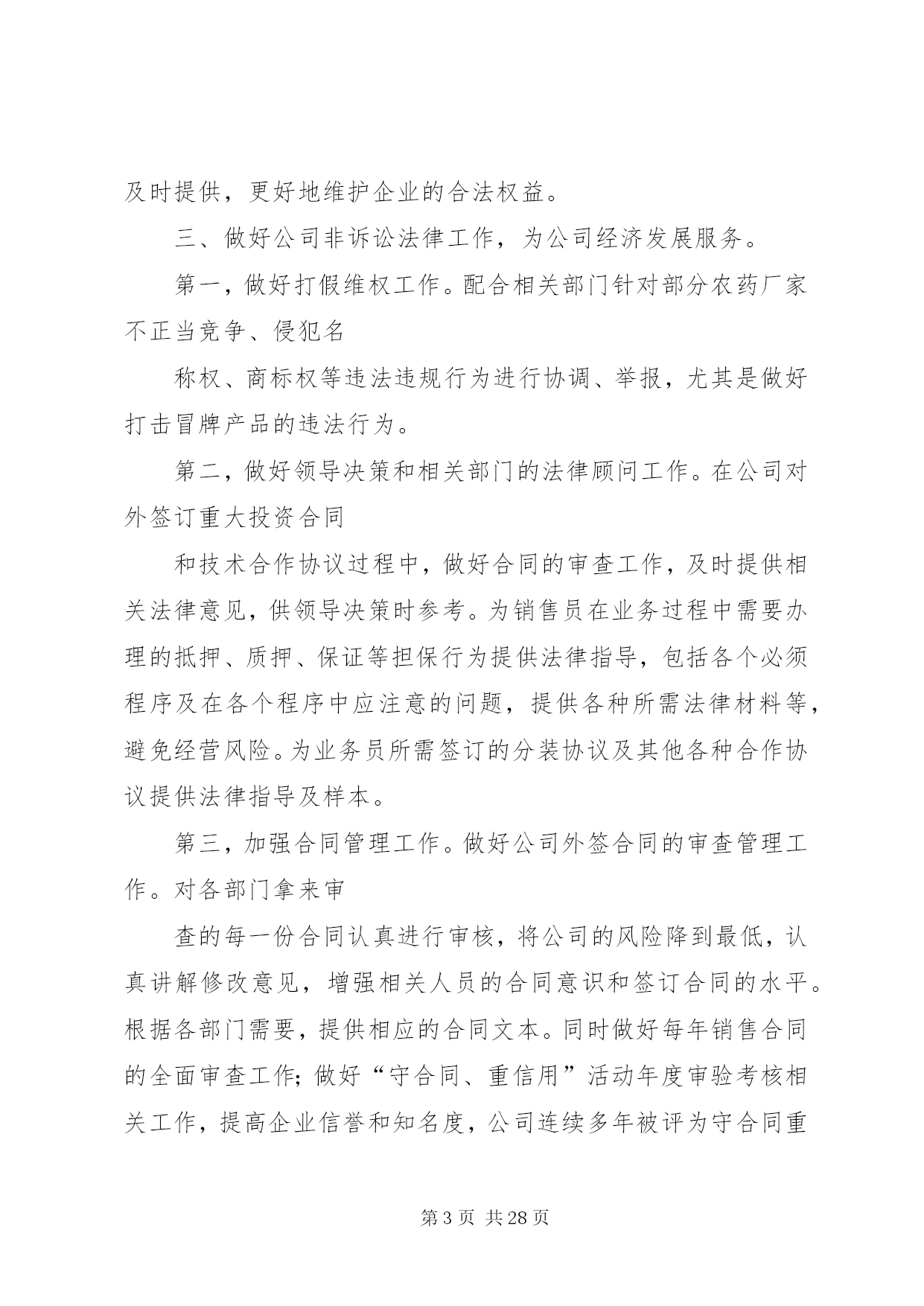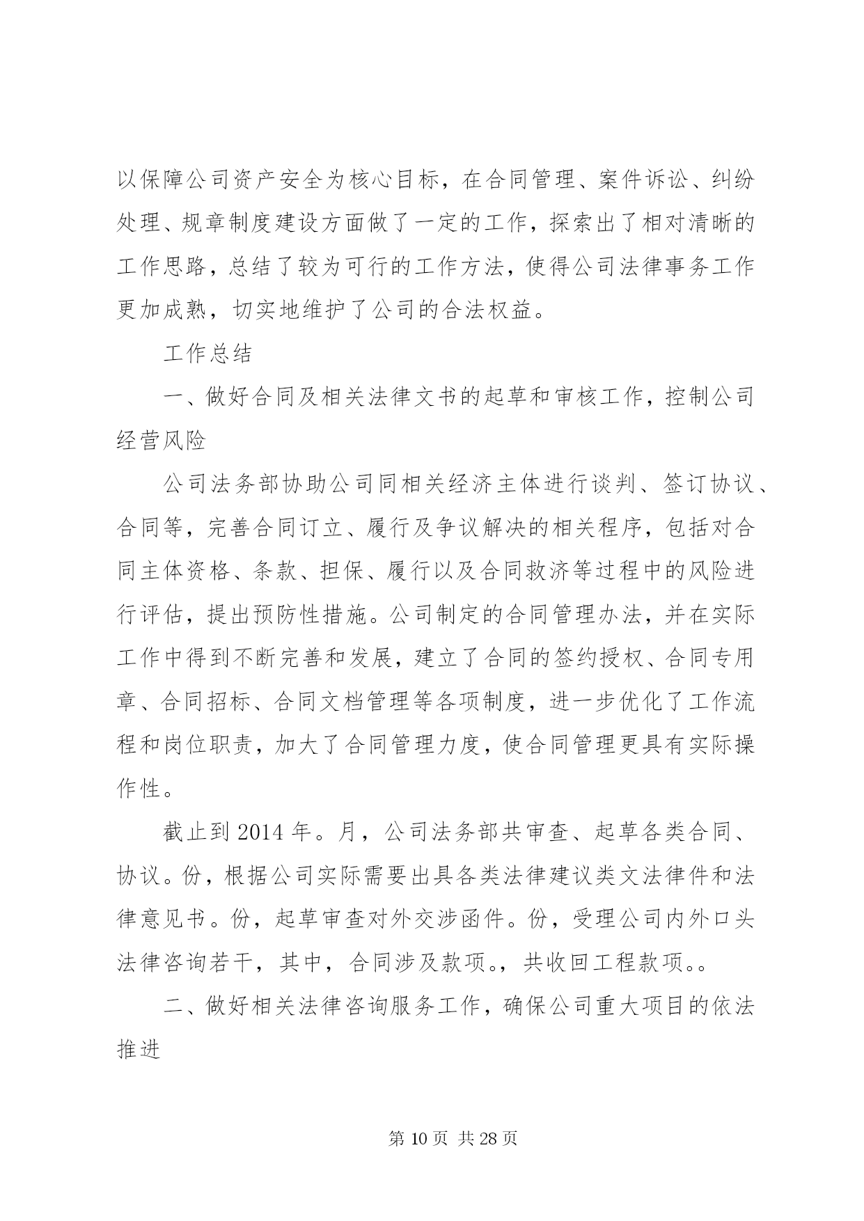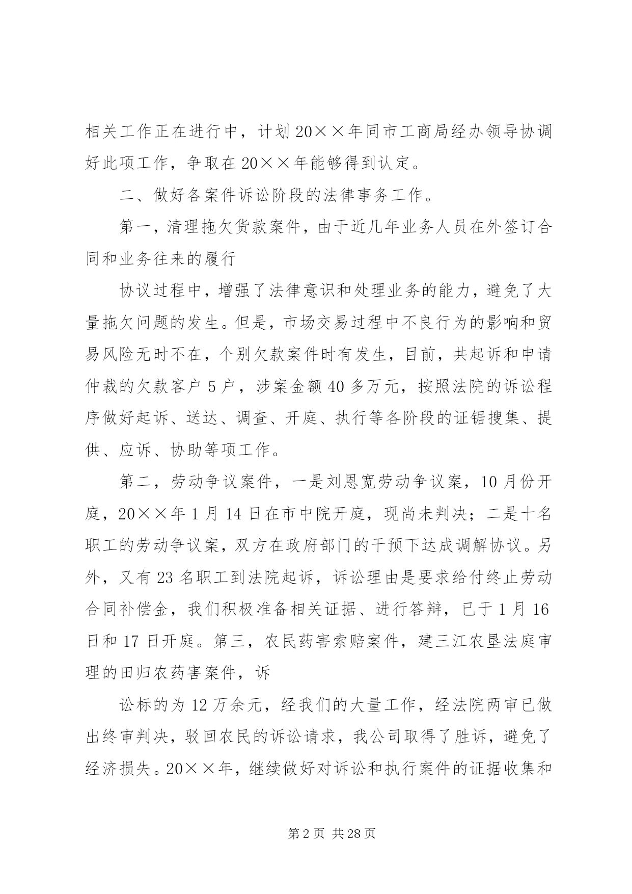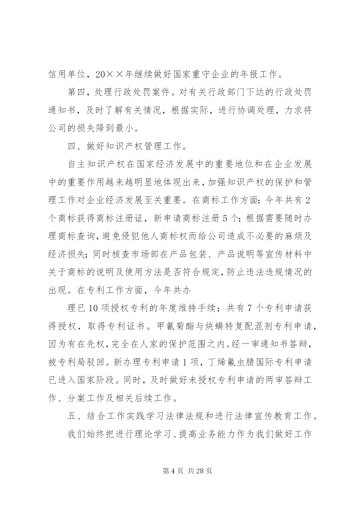 第PAGE\*Arabic\*MERGEFORMAT28页共NUMPAGES\*MERGEFORMAT28页企业公司法务部工作总结法律部门以经济工作为中心,完成公司各项法律工作任务,在不断提高自身素质和业务能力的同时,加强相关法律法规的宣传和教育工作,为各部门提供法律咨询和服务,做好公司涉讼案件工作以及其他非诉讼法律工作。20××年度法律事务工作主要完成情况及20××年工作安排如下:一、争创驰名商标工作。驰名商标对企业的品牌价值和经济价值不言而喻,公司领导一向十分重视此项工作。在公司领导的积极争取下,我公司“瑞泽”商标被XX市政府列为20××年度申报国家驰名商标之一。此项工作也成为我部门今年工作的重中之重,我部门协调相关部门,根据XX市工商局的指导和要求,在近两年不断积累材料的基础上,又历经四个月时间准备相关数字资料、图片资料、文字资料、包括认定申请材料、企业情况介绍、分子公司情况、主要产品介绍、质量管理情况、三年的国内国际销售材料、三年的财务数字及纳税证明、三年的广告宣传材料、客户信息反馈、售后服务情况、商标寓意和注册情况、商标使用和印刷材料、商标管理制度、知识产权保护、商标侵权材料、企业获奖材料、行业推荐材料、政府推荐材料及其它相关工作。在准备材料过程中,得到公司市场部、项目部、财务部、销售部、外贸、质检、行政等部门的大力配合。目前,500页的申报材料已上报国家工商总局,相关工作正在进行中,计划20××年同市工商局经办领导协调好此项工作,争取在20××年能够得到认定。二、做好各案件诉讼阶段的法律事务工作。第一,清理拖欠货款案件,由于近几年业务人员在外签订合同和业务往来的履行协议过程中,增强了法律意识和处理业务的能力,避免了大量拖欠问题的发生。但是,市场交易过程中不良行为的影响和贸易风险无时不在,个别欠款案件时有发生,目前,共起诉和申请仲裁的欠款客户5户,涉案金额40多万元,按照法院的诉讼程序做好起诉、送达、调查、开庭、执行等各阶段的证锯搜集、提供、应诉、协助等项工作。第二,劳动争议案件,一是刘恩宽劳动争议案,10月份开庭,20××年1月14日在市中院开庭,现尚未判决;二是十名职工的劳动争议案,双方在政府部门的干预下达成调解协议。另外,又有23名职工到法院起诉,诉讼理由是要求给付终止劳动合同补偿金,我们积极准备相关证据、进行答辩,已于1月16日和17日开庭。第三,农民药害索赔案件,建三江农垦法庭审理的田归农药害案件,诉讼标的为12万余元,经我们的大量工作,经法院两审已做出终审判决,驳回农民的诉讼请求,我公司取得了胜诉,避免了经济损失。20××年,继续做好对诉讼和执行案件的证据收集和及时提供,更好地维护企业的合法权益。三、做好公司非诉讼法律工作,为公司经济发展服务。第一,做好打假维权工作。配合相关部门针对部分农药厂家不正当竞争、侵犯名称权、商标权等违法违规行为进行协调、举报,尤其是做好打击冒牌产品的违法行为。第二,做好领导决策和相关部门的法律顾问工作。在公司对外签订重大投资合同和技术合作协议过程中,做好合同的审查工作,及时提供相关法律意见,供领导决策时参考。为销售员在业务过程中需要办理的抵押、质押、保证等担保行为提供法律指导,包括各个必须程序及在各个程序中应注意的问题,提供各种所需法律材料等,避免经营风险。为业务员所需签订的分装协议及其他各种合作协议提供法律指导及样本。第三,加强合同管理工作。做好公司外签合同的审查管理工作。对各部门拿来审查的每一份合同认真进行审核,将公司的风险降到最低,认真讲解修改意见,增强相关人员的合同意识和签订合同的水平。根据各部门需要,提供相应的合同文本。同时做好每年销售合同的全面审查工作;做好“守合同、重信用”活动年度审验考核相关工作,提高企业信誉和知名度,公司连续多年被评为守合同重信用单位,20××年继续做好国家重守企业的年报工作。第四,处理行政处罚案件。对有关行政部门下达的行政处罚通知书,及时了解有关情况,根据实际,进行协调处理,力求将公司的损失降到最小。四、做好知识产权管理工作。自主知识产权在国家经济发展中的重要地位和在企业发展中的重要作用越来越明显地体现出来,加强知识产权的保护和管理工作对企业经济发展至关重要。在商标工作方面:今年共有2个商标获得商标注册证,新申请商标注册5个;根据需要随时办理商标查询,避免侵犯他人商标权而给公司造成不必要的麻烦及经济损失;同时核查市场部在产品包装、产品说明等宣传材料中关于商标的说明及使用方法是否符合规定,防止违法违规情况的出现。在专利工作方面,今年共办理已10项授权专利的年度维持手续;共有7个专利申请获得授权,取得专利证书。甲氰菊酯与炔螨特复配混剂专利申请,因为有在先权,完全在人家的保护范围之内。经一审通知书答辩,被专利局驳回。新办理