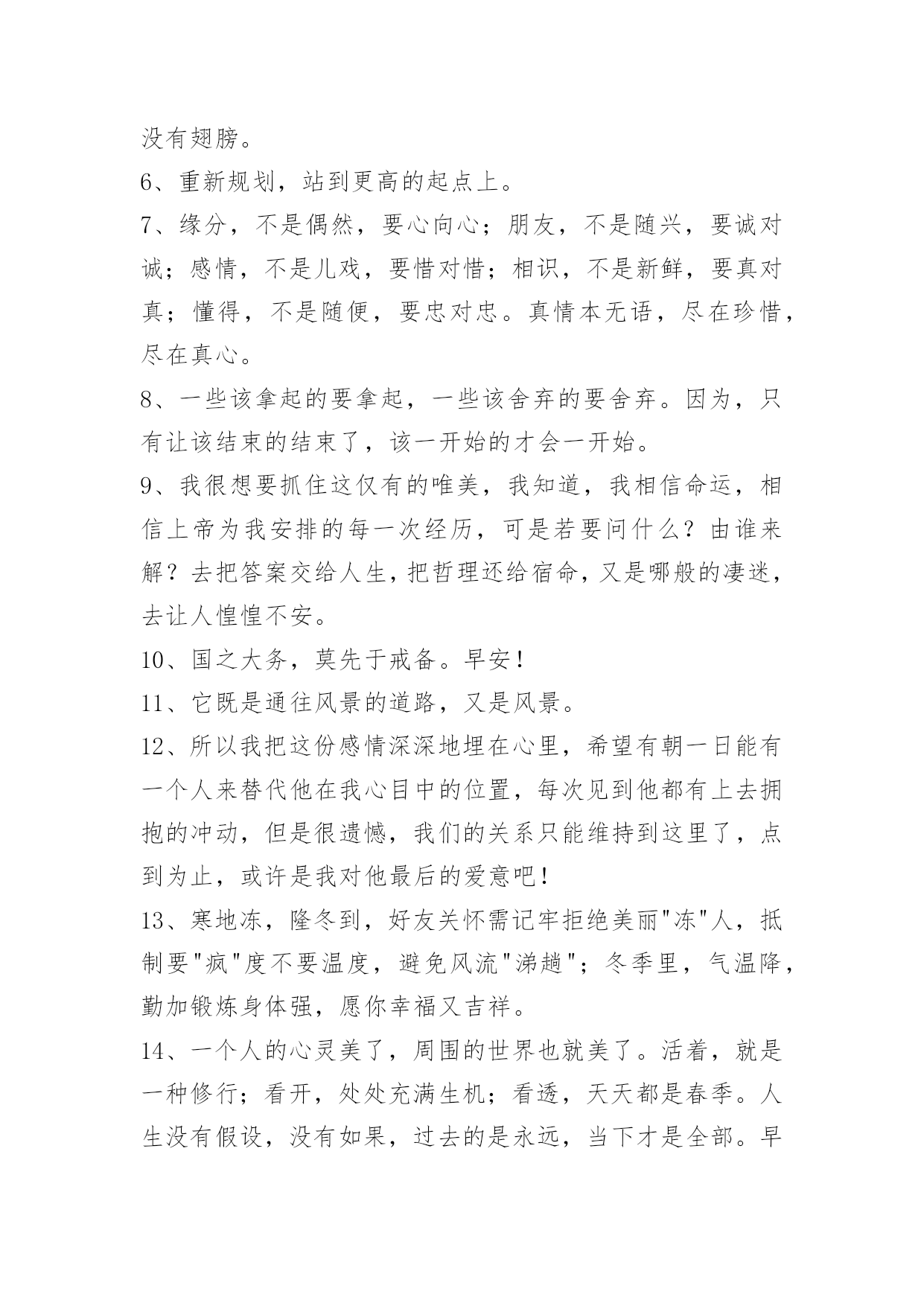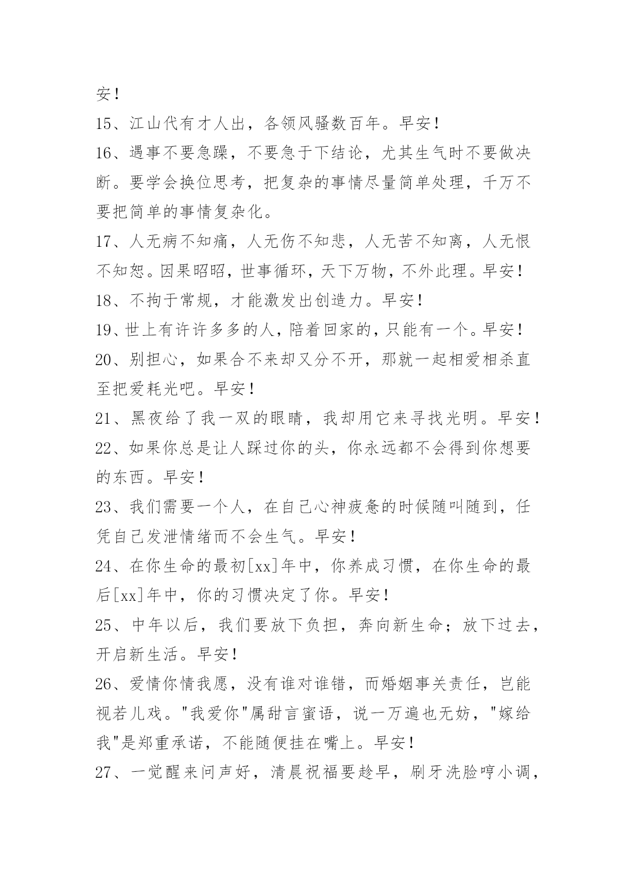 实用的早安语录30条实用的早安语录30条时间能改变心情,同样能耗尽热情。我自持孤傲,命该孤独终老。多年以后,请你别来无恙。早安!下面是小编整理的早安语录30条,感兴趣的一起来看看吧。1、人生,不过一杯茶,满也好,少也好,争个什么;浓也好,淡也好,自有味道;急也好,缓也好,那又如何;暖也好,冷也好,相视一笑。人生,因为在乎,所以痛苦;因为怀疑,所以伤害;因为看轻,所以快乐;因为看淡,所以幸福。我们都是天地的过客,很多人事,我们都做不了主,一切随缘吧。2、生活就是学会接受某些难以接受的磨难,使它最终变成对我们有意义的事。如果我们一味逃避,它只会毁了我们。一旦我们能正视它,改变的机会就会降临到我们身上。磨难是很多人必然要经历的一场大火,你要么冶炼成金,要么化为灰烬。当你退无可退的时候,你已经没得选择。3、境界是人生高度,胸怀是人生宽度。4、谈判,需要为彼此的幸福着想。当觉得对方对自己不够坦诚的时候,你们双方都会摆出互不相让的姿态。5、人生活在希望之中,旧的希望实现了,或者泯灭了,新的希望的烈焰随之烧起来。书籍是全世界的营养品。生活里没有书籍,就好像没有阳光;智慧中没有书籍,就好像鸟儿没有翅膀。6、重新规划,站到更高的起点上。7、缘分,不是偶然,要心向心;朋友,不是随兴,要诚对诚;感情,不是儿戏,要惜对惜;相识,不是新鲜,要真对真;懂得,不是随便,要忠对忠。真情本无语,尽在珍惜,尽在真心。8、一些该拿起的要拿起,一些该舍弃的要舍弃。因为,只有让该结束的结束了,该一开始的才会一开始。9、我很想要抓住这仅有的唯美,我知道,我相信命运,相信上帝为我安排的每一次经历,可是若要问什么?由谁来解?去把答案交给人生,把哲理还给宿命,又是哪般的凄迷,去让人惶惶不安。10、国之大务,莫先于戒备。早安!11、它既是通往风景的道路,又是风景。12、所以我把这份感情深深地埋在心里,希望有朝一日能有一个人来替代他在我心目中的位置,每次见到他都有上去拥抱的冲动,但是很遗憾,我们的关系只能维持到这里了,点到为止,或许是我对他最后的爱意吧!13、寒地冻,隆冬到,好友关怀需记牢拒绝美丽"冻"人,抵制要"疯"度不要温度,避免风流"涕趟";冬季里,气温降,勤加锻炼身体强,愿你幸福又吉祥。14、一个人的心灵美了,周围的世界也就美了。活着,就是一种修行;看开,处处充满生机;看透,天天都是春季。人生没有假设,没有如果,过去的是永远,当下才是全部。早安!15、江山代有才人出,各领风骚数百年。早安!16、遇事不要急躁,不要急于下结论,尤其生气时不要做决断。要学会换位思考,把复杂的事情尽量简单处理,千万不要把简单的事情复杂化。17、人无病不知痛,人无伤不知悲,人无苦不知离,人无恨不知恕。因果昭昭,世事循环,天下万物,不外此理。早安!18、不拘于常规,才能激发出创造力。早安!19、世上有许许多多的人,陪着回家的,只能有一个。早安!20、别担心,如果合不来却又分不开,那就一起相爱相杀直至把爱耗光吧。早安!21、黑夜给了我一双的眼睛,我却用它来寻找光明。早安!22、如果你总是让人踩过你的头,你永远都不会得到你想要的东西。早安!23、我们需要一个人,在自己心神疲惫的时候随叫随到,任凭自己发泄情绪而不会生气。早安!24、在你生命的最初[xx]年中,你养成习惯,在你生命的最后[xx]年中,你的习惯决定了你。早安!25、中年以后,我们要放下负担,奔向新生命;放下过去,开启新生活。早安!26、爱情你情我愿,没有谁对谁错,而婚姻事关责任,岂能视若儿戏。"我爱你"属甜言蜜语,说一万遍也无妨,"嫁给我"是郑重承诺,不能随便挂在嘴上。早安!27、一觉醒来问声好,清晨祝福要趁早,刷牙洗脸哼小调,早餐一定要吃饱,穿好衣服戴好帽,胸怀朝阳开心笑,上班踏过幸福桥,清风拂过忘忧草,发财小鸟为你叫,一路都是平安道,祝你。早安心情妙,鸿运当头步步高。早安!28、心之所向,素履以往,生如逆旅,一苇以航。早安!29、以前我最怕朋友说你变了感觉好像自己不如以前了,现在也会听到,也只是笑一笑,想想其实人不都在变吗,性格习惯甚至样貌身形,只要你想坚持去做,没有什么是不能改变的,也没有谁是永远一成不变的,碰多了钉子自然就会磨去锐气,胖过的瘦子没人有理由嘲笑他的过去,成长就是一直不断改变的过程。30、不知道曾经的我们舍生忘死交好,原来不过是最后最后的行同陌生人。早安!