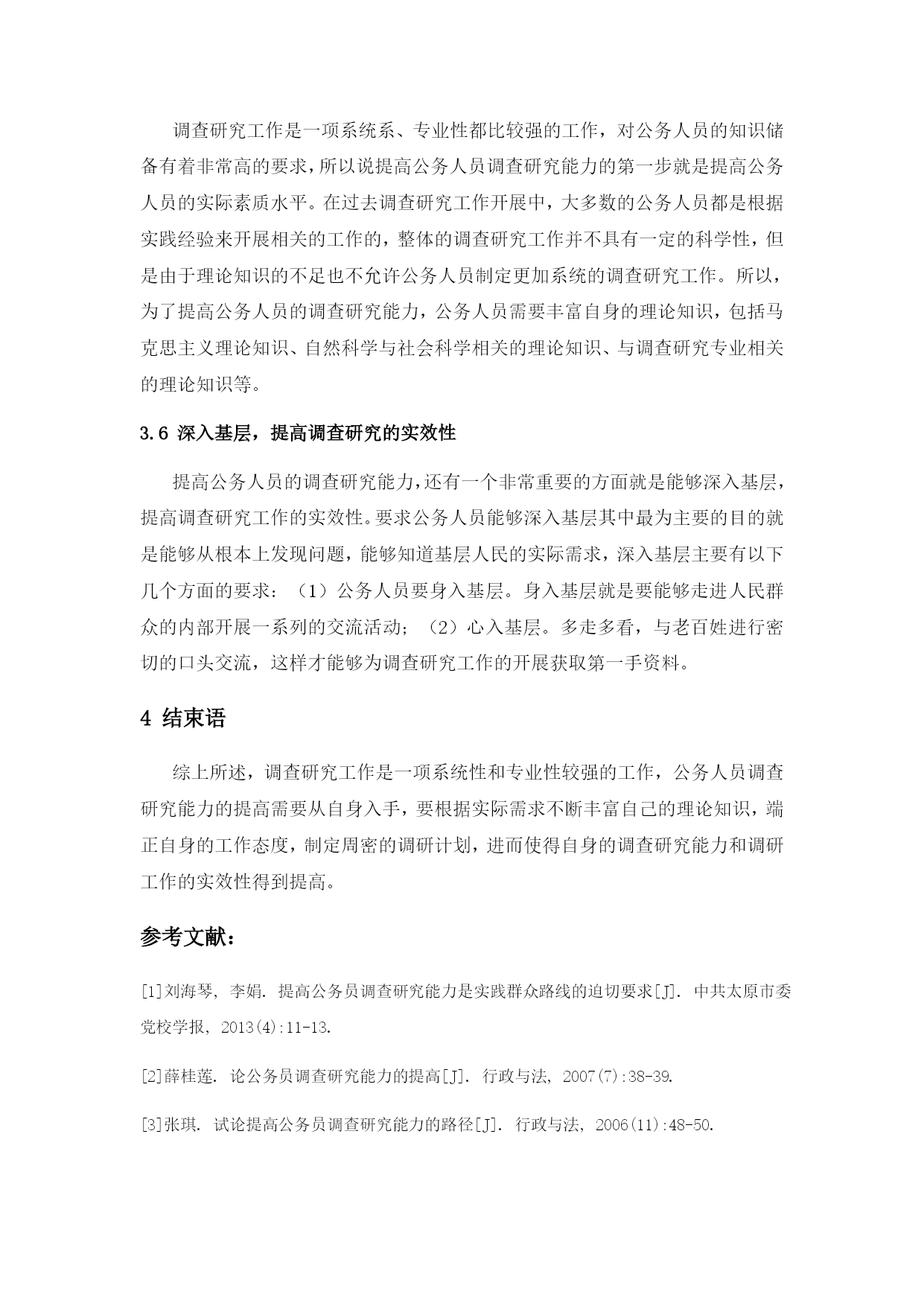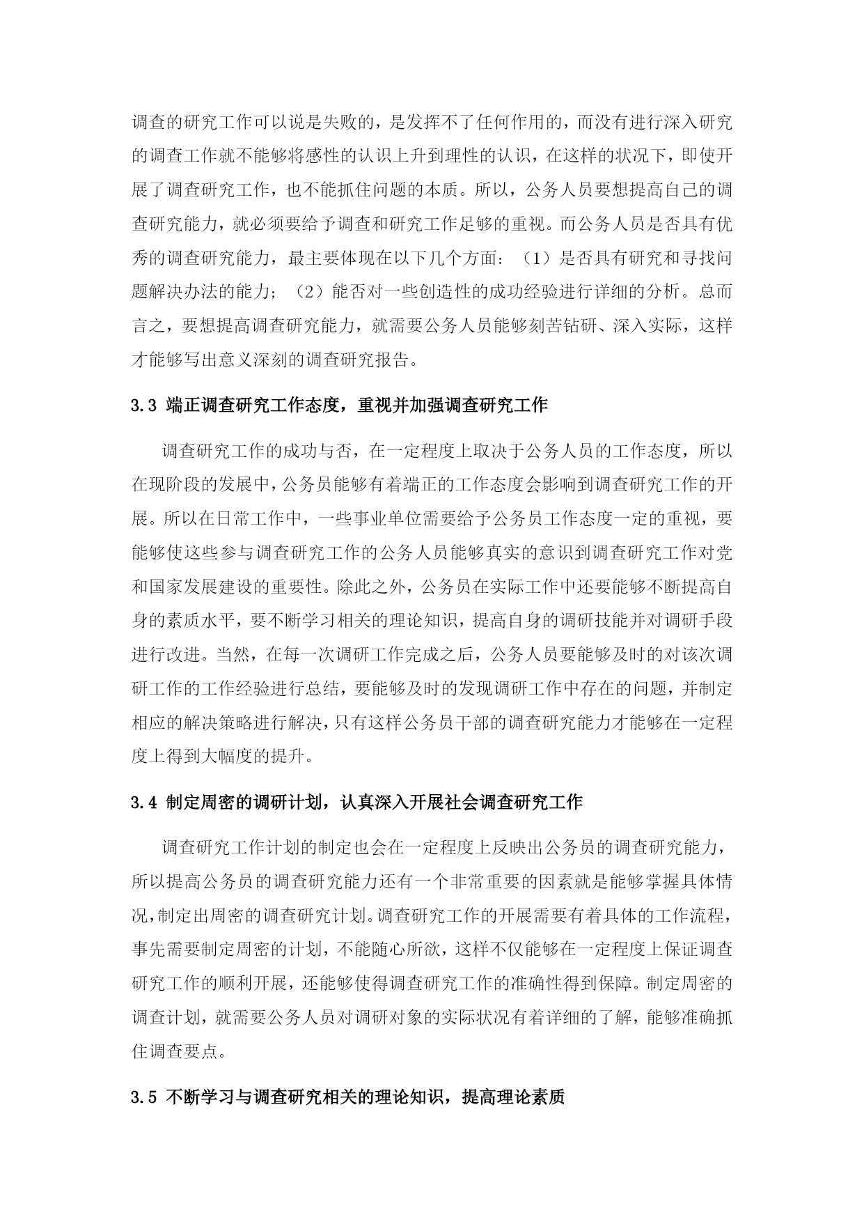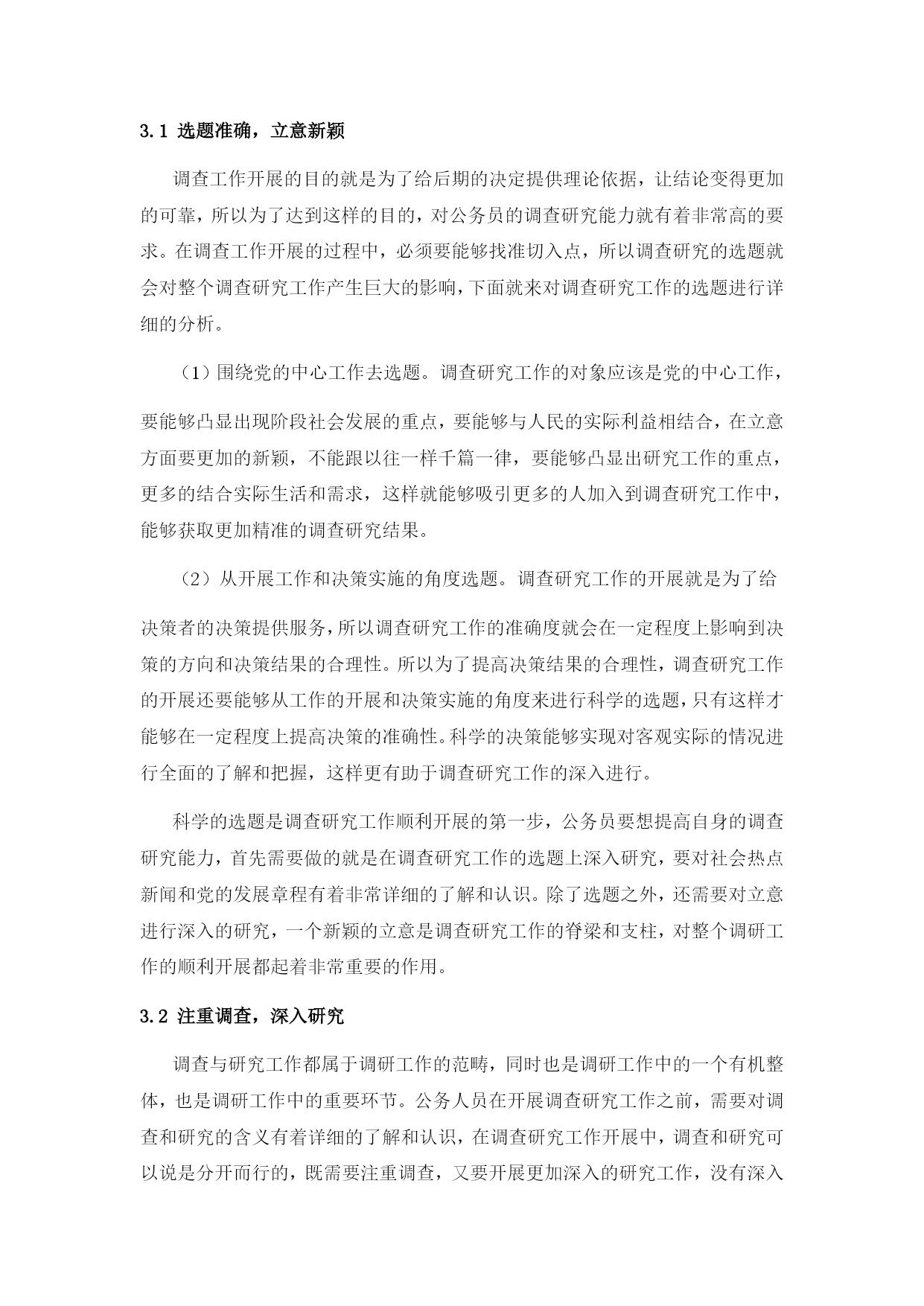 论公务员调查研究能力的提高【摘要】:在现阶段工作开展过程中,调查研究是其主要的工作方法之一,也是公务员在开展工作过程中所必须要具备的能力之一。为了适应时代发展的需求,同时也为了提高实际工作效率,在现阶段单位的发展中,对公务员的调查研究能力有着非常高的要求。本文主要对公务员调查研究能力的提高进行详细的分析研究,并根据具体状况指出相应的解决办法。【关键词】:公务员;调查研究能力;提高1引言调查研究是我党的主要工作方法,而调查研究能力也是对公务员最为基本的业务能力要求,近些年来随着改革开放的不断深入,社会主义市场经济得到了快速的发展,为了及时的了解到社会需求、民生需求,就必须要开展相关的调查研究工作,因此对公务员的调查研究能力有着非常高的要求。但是现阶段的实际发展状况并非如此,由于很多单位在过去的工作中并没有意识到调查研究能力对工作顺利开展的重要性,很多单位都忽略了对公务员调查研究能力的提高,因此在现阶段社会发展和转型的重要时期,没有可靠的调查研究人才,使得调查研究工作的开展有着非常大的阻力。2继承传统,提高认识调查研究工作方式是我党传统的工作方式,在过去的社会发展和社会建设中都发挥出了重要的作用,党的几代领导人也都向我们强调了调查研究工作的重要性。作为一名为社会服务为社会发展建设服务的公务人员,需要以调查研究的方式来对群众的需求有着大致的了解,调查研究工作的开展也不能趋于表面,要能够开展更加深入的研究。要想提高公务人员的调查研究能力,最重要的就是提高公务人员的政治素质、思想素质和深厚的理论功底,这样才能够使得调查研究工作更加的精细和准确,才能够从根本上提高公务人员的调查研究能力。3提高公务员调查研究能力的具体措施3.1选题准确,立意新颖调查工作开展的目的就是为了给后期的决定提供理论依据,让结论变得更加的可靠,所以为了达到这样的目的,对公务员的调查研究能力就有着非常高的要求。在调查工作开展的过程中,必须要能够找准切入点,所以调查研究的选题就会对整个调查研究工作产生巨大的影响,下面就来对调查研究工作的选题进行详细的分析。围绕党的中心工作去选题。调查研究工作的对象应该是党的中心工作,要能够凸显出现阶段社会发展的重点,要能够与人民的实际利益相结合,在立意方面要更加的新颖,不能跟以往一样千篇一律,要能够凸显出研究工作的重点,更多的结合实际生活和需求,这样就能够吸引更多的人加入到调查研究工作中,能够获取更加精准的调查研究结果。从开展工作和决策实施的角度选题。调查研究工作的开展就是为了给决策者的决策提供服务,所以调查研究工作的准确度就会在一定程度上影响到决策的方向和决策结果的合理性。所以为了提高决策结果的合理性,调查研究工作的开展还要能够从工作的开展和决策实施的角度来进行科学的选题,只有这样才能够在一定程度上提高决策的准确性。科学的决策能够实现对客观实际的情况进行全面的了解和把握,这样更有助于调查研究工作的深入进行。科学的选题是调查研究工作顺利开展的第一步,公务员要想提高自身的调查研究能力,首先需要做的就是在调查研究工作的选题上深入研究,要对社会热点新闻和党的发展章程有着非常详细的了解和认识。除了选题之外,还需要对立意进行深入的研究,一个新颖的立意是调查研究工作的脊梁和支柱,对整个调研工作的顺利开展都起着非常重要的作用。3.2注重调查,深入研究调查与研究工作都属于调研工作的范畴,同时也是调研工作中的一个有机整体,也是调研工作中的重要环节。公务人员在开展调查研究工作之前,需要对调查和研究的含义有着详细的了解和认识,在调查研究工作开展中,调查和研究可以说是分开而行的,既需要注重调查,又要开展更加深入的研究工作,没有深入调查的研究工作可以说是失败的,是发挥不了任何作用的,而没有进行深入研究的调查工作就不能够将感性的认识上升到理性的认识,在这样的状况下,即使开展了调查研究工作,也不能抓住问题的本质。所以,公务人员要想提高自己的调查研究能力,就必须要给予调查和研究工作足够的重视。而公务人员是否具有优秀的调查研究能力,最主要体现在以下几个方面:(1)是否具有研究和寻找问题解决办法的能力;(2)能否对一些创造性的成功经验进行详细的分析。总而言之,要想提高调查研究能力,就需要公务人员能够刻苦钻研、深入实际,这样才能够写出意义深刻的调查研究报告。3.3端正调查研究工作态度,重视并加强调查研究工作调查研究工作的成功与否,在一定程度上取决于公务人员的工作态度,所以在现阶段的发展中,公务员能够有着端正的工作态度会影响到调查研究工作的开展。所以在日常工作中,一些事业单位需要给予公务员工作态度一定的重视,要能够使这些参与调查研究工作的公务人员能够真实的意识到调查研究工作对党和国家发展建设的重要性。除此之外,公务员在实际工作中还要能够不断