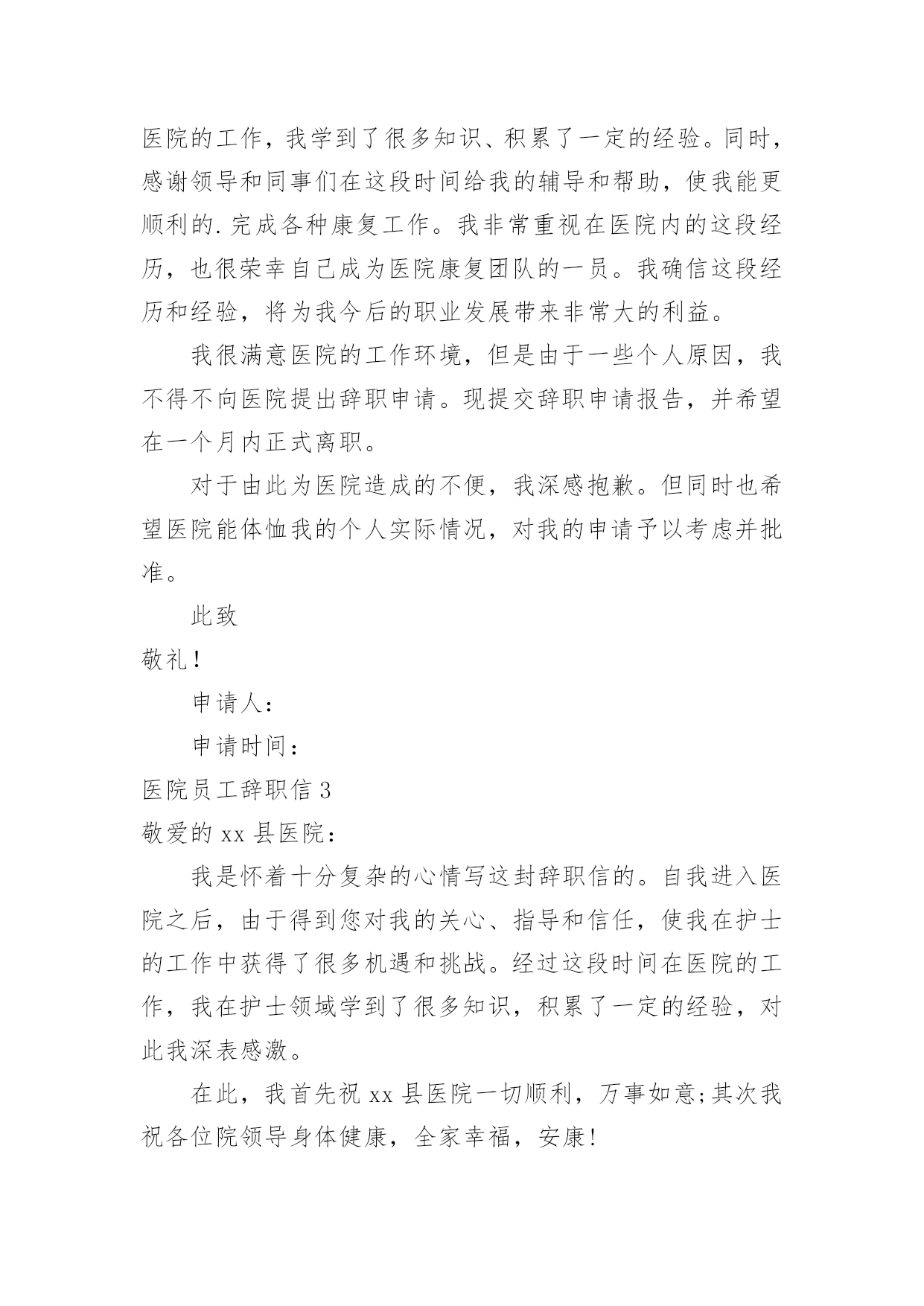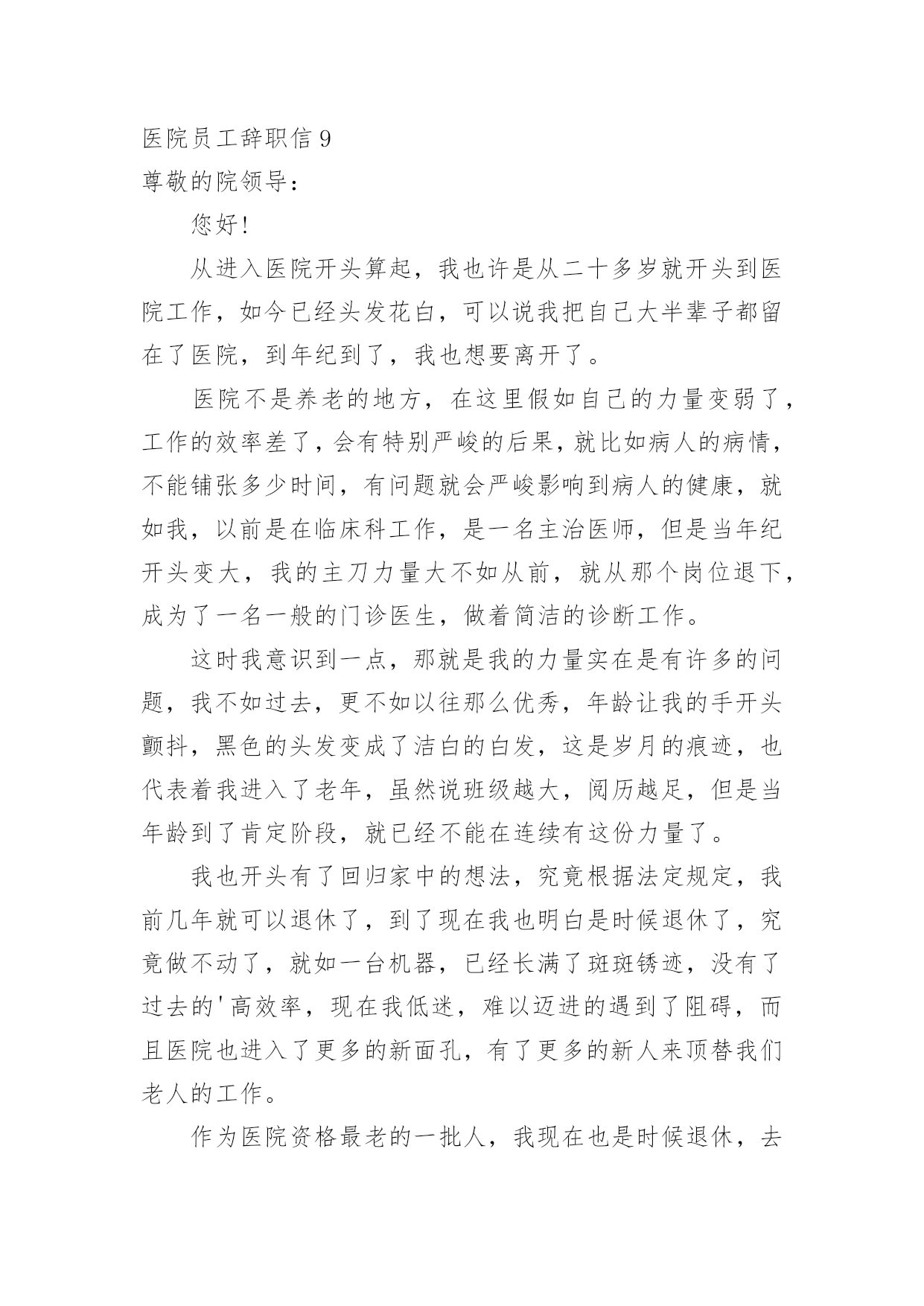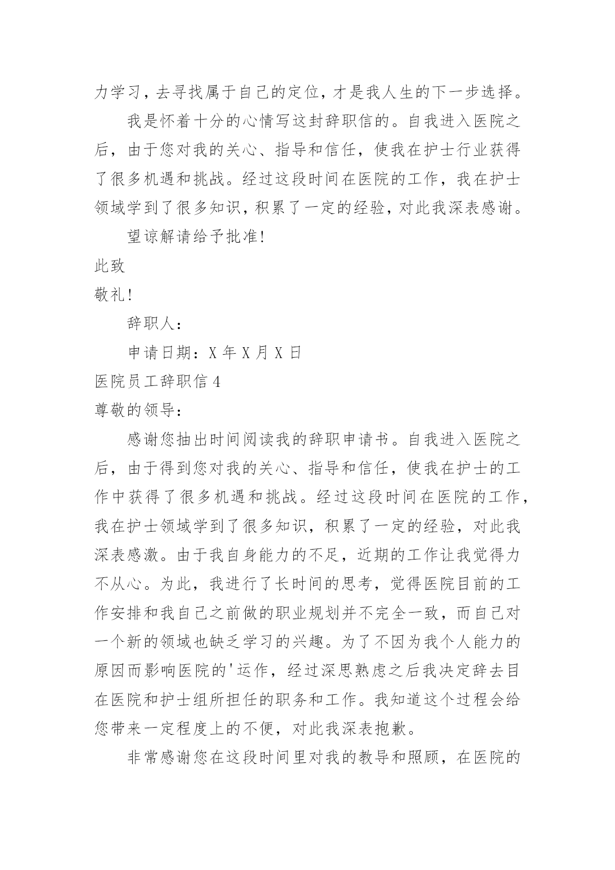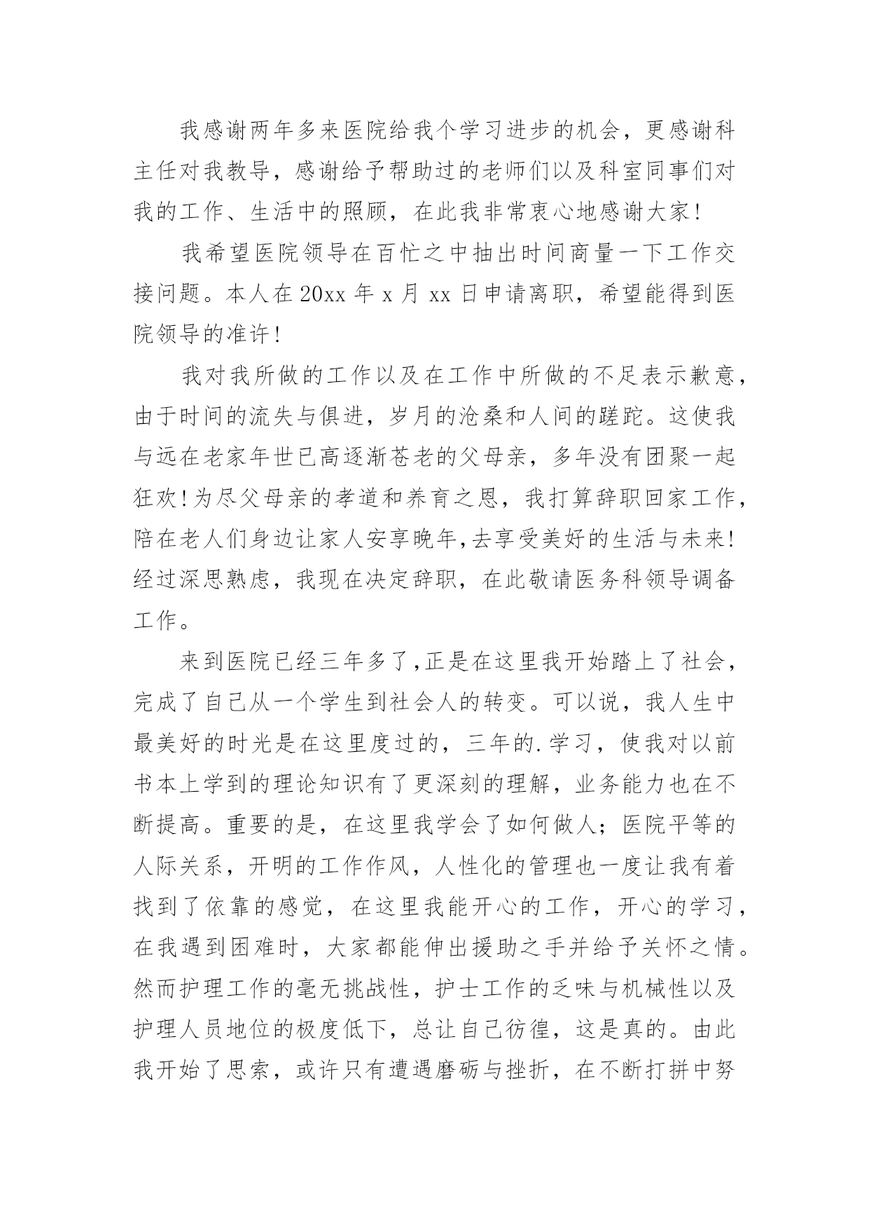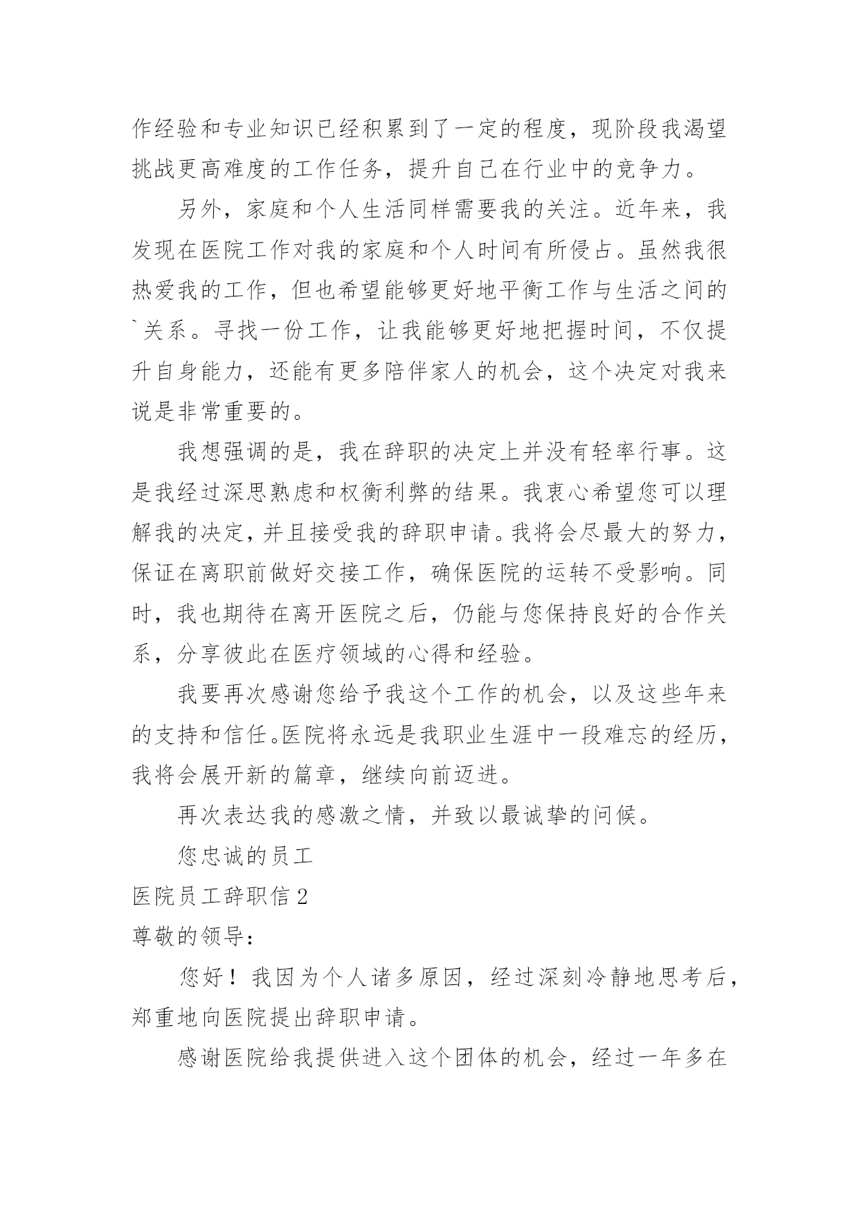 医院员工辞职信医院员工辞职信在一家公司辛苦了一段时间后,某些条件下我们会离开岗位,为此很有必要写好辞职信。不知道辞职信里该写什么?下面是小编为大家收集的医院员工辞职信,欢迎大家分享。医院员工辞职信1亲爱的领导/同事们:我衷心地感谢您一直以来对我的信任和支持。今天,我写下这封辞职信,是因为我经历了一段思考和反思,最终决定寻求新的机会和挑战。在过去的几年里,我有幸在这家医院工作,这段经历给予我了很多宝贵的人生经验。回顾这些年来,我实在难以忘怀在医院中度过的时光。作为医院的一员,我学到了很多专业技能,提升了自己的能力。在与医院的各个部门合作的过程中,我发现团队的协作精神是无比强大的。无论是在急诊室、病房还是手术室,都能高效地协同工作,为患者提供高质量的医疗服务。这种团队精神不仅使我成为了一名更优秀的医护人员,也增强了我的责任感和荣誉感。尽管医院的工作给予了我成长的机会和满足感,但个人的发展也是不可避免的课题。这些年来,我一直在思考如何进一步提升自己,在医疗行业中寻找更大的突破点。我的工作经验和专业知识已经积累到了一定的程度,现阶段我渴望挑战更高难度的工作任务,提升自己在行业中的竞争力。另外,家庭和个人生活同样需要我的关注。近年来,我发现在医院工作对我的家庭和个人时间有所侵占。虽然我很热爱我的工作,但也希望能够更好地平衡工作与生活之间的`关系。寻找一份工作,让我能够更好地把握时间,不仅提升自身能力,还能有更多陪伴家人的机会,这个决定对我来说是非常重要的。我想强调的是,我在辞职的决定上并没有轻率行事。这是我经过深思熟虑和权衡利弊的结果。我衷心希望您可以理解我的决定,并且接受我的辞职申请。我将会尽最大的努力,保证在离职前做好交接工作,确保医院的运转不受影响。同时,我也期待在离开医院之后,仍能与您保持良好的合作关系,分享彼此在医疗领域的心得和经验。我要再次感谢您给予我这个工作的机会,以及这些年来的支持和信任。医院将永远是我职业生涯中一段难忘的经历,我将会展开新的篇章,继续向前迈进。再次表达我的感激之情,并致以最诚挚的问候。您忠诚的员工医院员工辞职信2尊敬的领导:您好!我因为个人诸多原因,经过深刻冷静地思考后,郑重地向医院提出辞职申请。感谢医院给我提供进入这个团体的机会,经过一年多在医院的工作,我学到了很多知识、积累了一定的经验。同时,感谢领导和同事们在这段时间给我的辅导和帮助,使我能更顺利的.完成各种康复工作。我非常重视在医院内的这段经历,也很荣幸自己成为医院康复团队的一员。我确信这段经历和经验,将为我今后的职业发展带来非常大的利益。我很满意医院的工作环境,但是由于一些个人原因,我不得不向医院提出辞职申请。现提交辞职申请报告,并希望在一个月内正式离职。对于由此为医院造成的不便,我深感抱歉。但同时也希望医院能体恤我的个人实际情况,对我的申请予以考虑并批准。此致敬礼!申请人:申请时间:医院员工辞职信3敬爱的xx县医院:我是怀着十分复杂的心情写这封辞职信的。自我进入医院之后,由于得到您对我的关心、指导和信任,使我在护士的工作中获得了很多机遇和挑战。经过这段时间在医院的工作,我在护士领域学到了很多知识,积累了一定的经验,对此我深表感激。在此,我首先祝xx县医院一切顺利,万事如意;其次我祝各位院领导身体健康,全家幸福,安康!我感谢两年多来医院给我个学习进步的机会,更感谢科主任对我教导,感谢给予帮助过的老师们以及科室同事们对我的工作、生活中的照顾,在此我非常衷心地感谢大家!我希望医院领导在百忙之中抽出时间商量一下工作交接问题。本人在20xx年x月xx日申请离职,希望能得到医院领导的准许!我对我所做的工作以及在工作中所做的不足表示歉意,由于时间的流失与俱进,岁月的沧桑和人间的蹉跎。这使我与远在老家年世已高逐渐苍老的父母亲,多年没有团聚一起狂欢!为尽父母亲的孝道和养育之恩,我打算辞职回家工作,陪在老人们身边让家人安享晚年,去享受美好的生活与未来!经过深思熟虑,我现在决定辞职,在此敬请医务科领导调备工作。来到医院已经三年多了,正是在这里我开始踏上了社会,完成了自己从一个学生到社会人的转变。可以说,我人生中最美好的时光是在这里度过的,三年的.学习,使我对以前书本上学到的理论知识有了更深刻的理解,业务能力也在不断提高。重要的是,在这里我学会了如何做人;医院平等的人际关系,开明的工作作风,人性化的管理也一度让我有着找到了依靠的感觉,在这里我能开心的工作,开心的学习,在我遇到困难时,大家都能伸出援助之手并给予关怀之情。然而护理工作的毫无挑战性,护士工作的乏味与机械性以及护理人员地位的极度低下,总让自己彷徨,这是真的。由此我开始了思索,或许只有遭遇磨砺与挫折,在不断打拼中努力学习,去寻找属于自己的定位,才是我人生的下一步选择。我是怀着十分的心情写这封辞职信的。自我