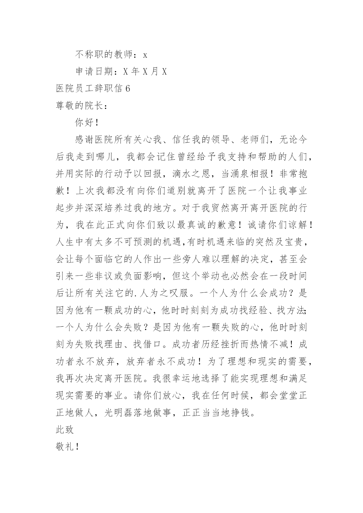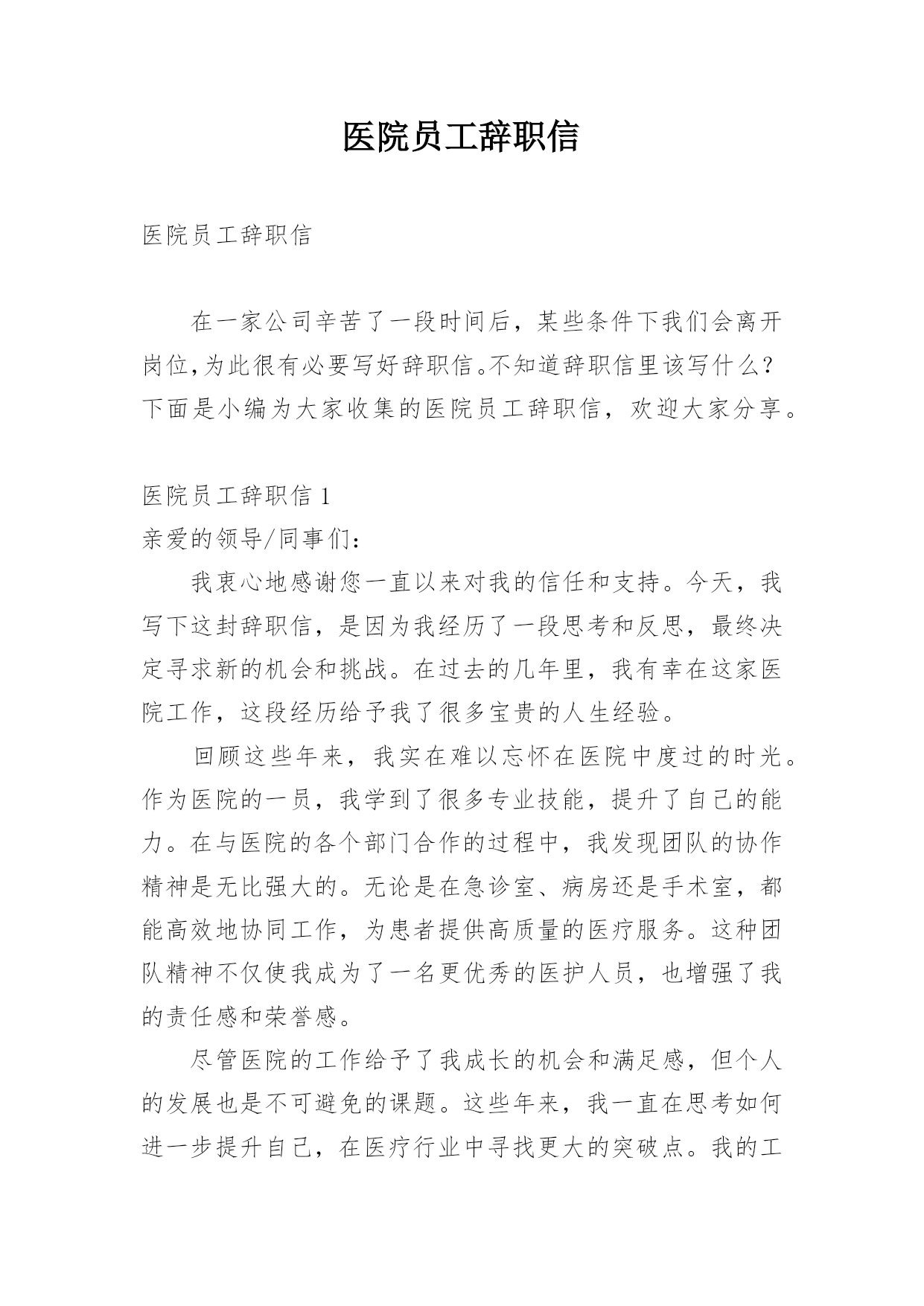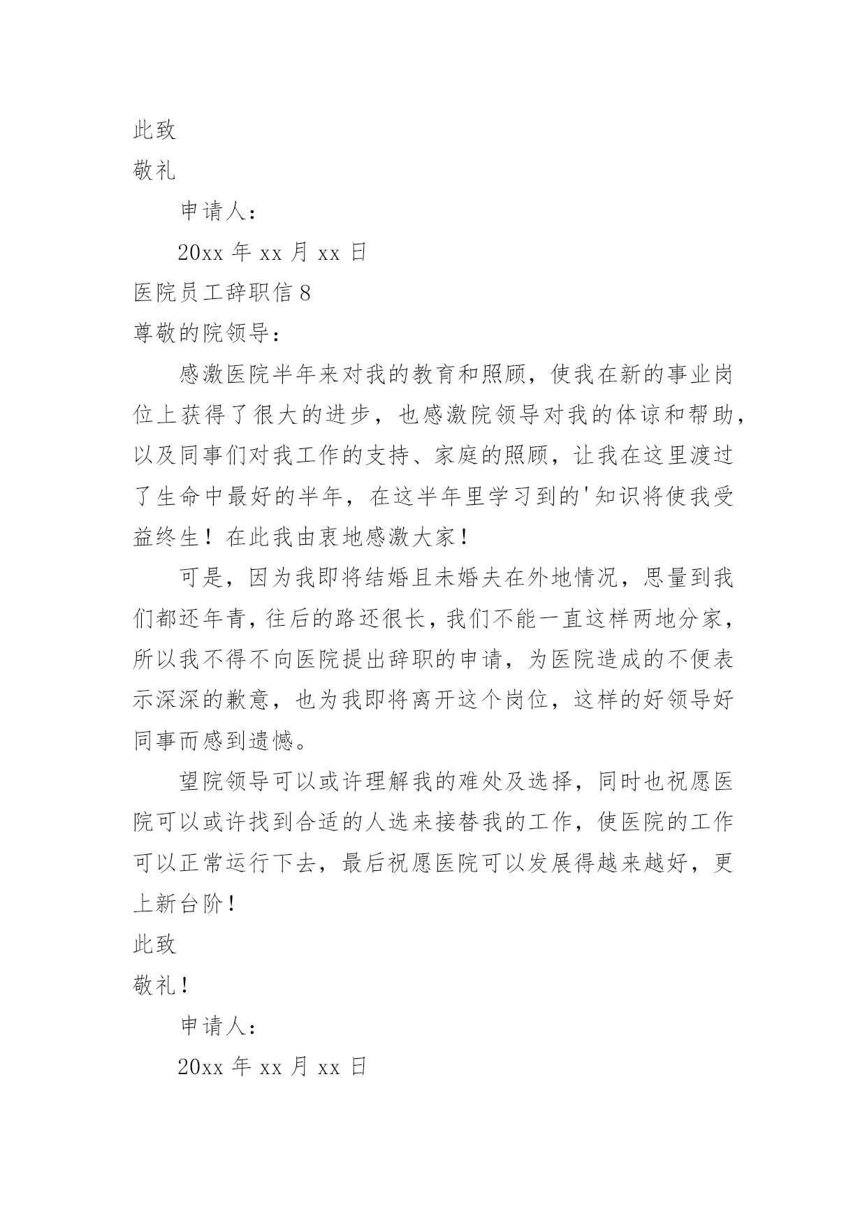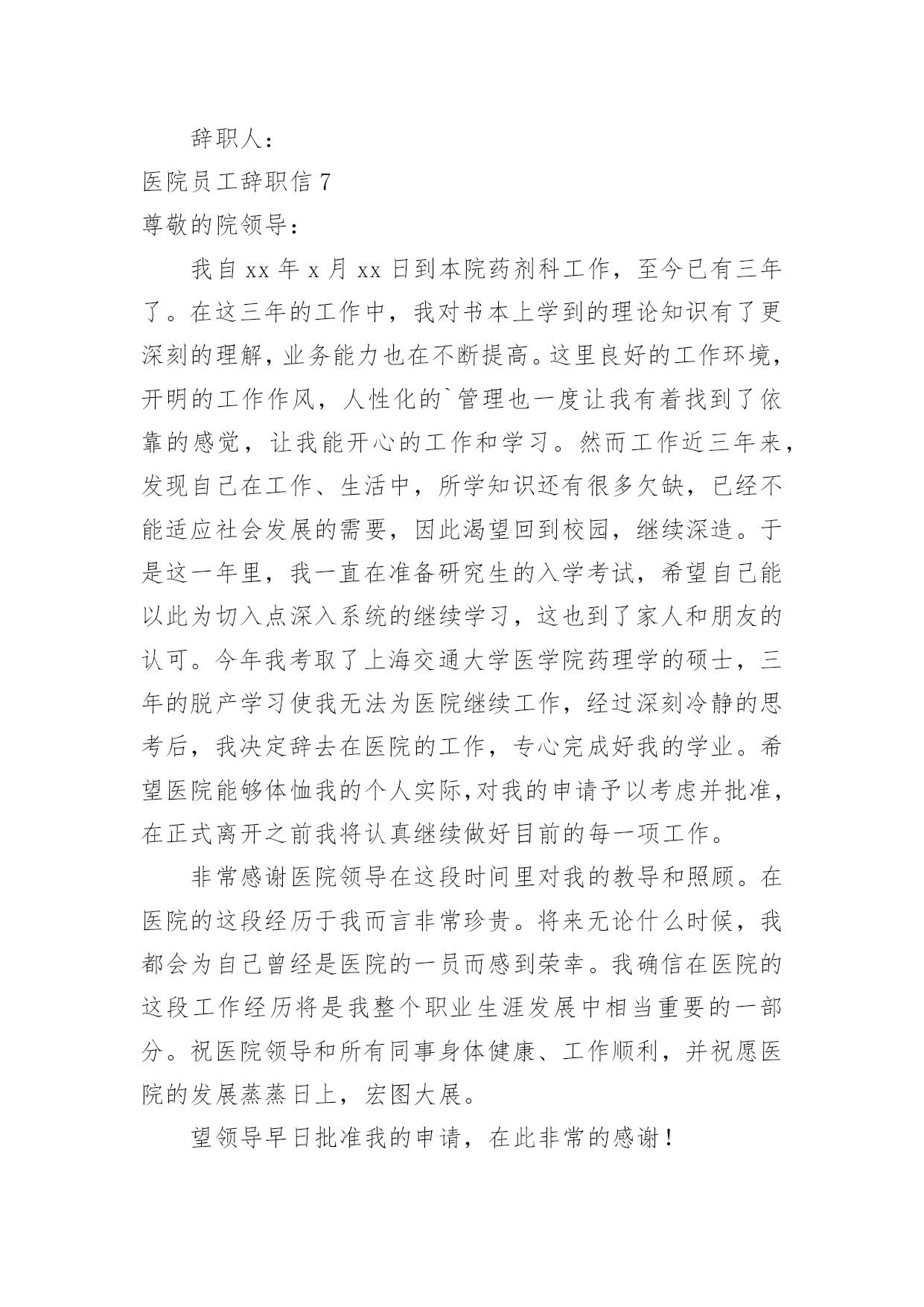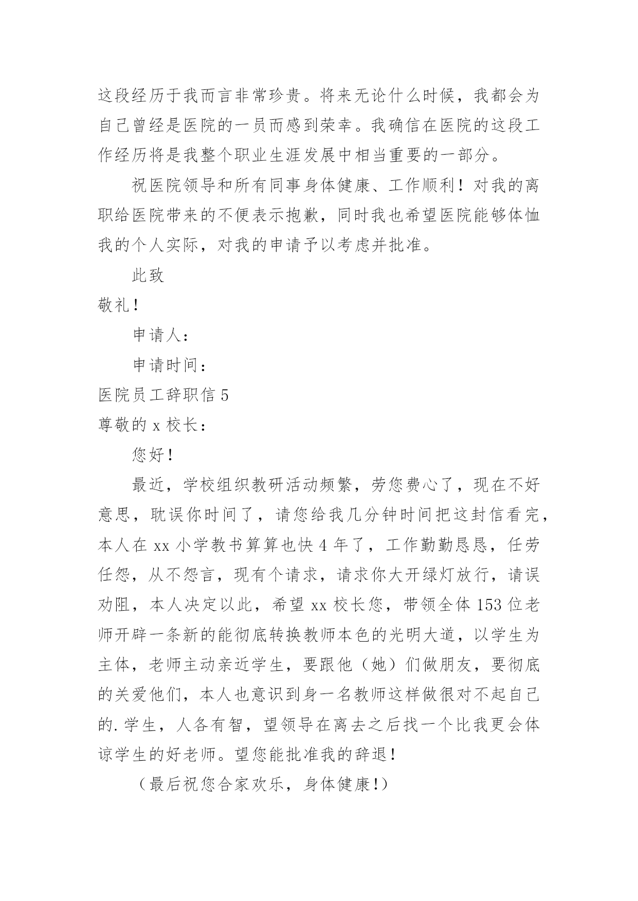 医院员工辞职信医院员工辞职信在一家公司辛苦了一段时间后,某些条件下我们会离开岗位,为此很有必要写好辞职信。不知道辞职信里该写什么?下面是小编为大家收集的医院员工辞职信,欢迎大家分享。医院员工辞职信1亲爱的领导/同事们:我衷心地感谢您一直以来对我的信任和支持。今天,我写下这封辞职信,是因为我经历了一段思考和反思,最终决定寻求新的机会和挑战。在过去的几年里,我有幸在这家医院工作,这段经历给予我了很多宝贵的人生经验。回顾这些年来,我实在难以忘怀在医院中度过的时光。作为医院的一员,我学到了很多专业技能,提升了自己的能力。在与医院的各个部门合作的过程中,我发现团队的协作精神是无比强大的。无论是在急诊室、病房还是手术室,都能高效地协同工作,为患者提供高质量的医疗服务。这种团队精神不仅使我成为了一名更优秀的医护人员,也增强了我的责任感和荣誉感。尽管医院的工作给予了我成长的机会和满足感,但个人的发展也是不可避免的课题。这些年来,我一直在思考如何进一步提升自己,在医疗行业中寻找更大的突破点。我的工作经验和专业知识已经积累到了一定的程度,现阶段我渴望挑战更高难度的工作任务,提升自己在行业中的竞争力。另外,家庭和个人生活同样需要我的关注。近年来,我发现在医院工作对我的家庭和个人时间有所侵占。虽然我很热爱我的工作,但也希望能够更好地平衡工作与生活之间的`关系。寻找一份工作,让我能够更好地把握时间,不仅提升自身能力,还能有更多陪伴家人的机会,这个决定对我来说是非常重要的。我想强调的是,我在辞职的决定上并没有轻率行事。这是我经过深思熟虑和权衡利弊的结果。我衷心希望您可以理解我的决定,并且接受我的辞职申请。我将会尽最大的努力,保证在离职前做好交接工作,确保医院的运转不受影响。同时,我也期待在离开医院之后,仍能与您保持良好的合作关系,分享彼此在医疗领域的心得和经验。我要再次感谢您给予我这个工作的机会,以及这些年来的支持和信任。医院将永远是我职业生涯中一段难忘的经历,我将会展开新的篇章,继续向前迈进。再次表达我的感激之情,并致以最诚挚的问候。您忠诚的员工医院员工辞职信2尊敬的领导:您好!我因为个人诸多原因,经过深刻冷静地思考后,郑重地向医院提出辞职申请。感谢医院给我提供进入这个团体的机会,经过一年多在医院的工作,我学到了很多知识、积累了一定的经验。同时,感谢领导和同事们在这段时间给我的辅导和帮助,使我能更顺利的.完成各种康复工作。我非常重视在医院内的这段经历,也很荣幸自己成为医院康复团队的一员。我确信这段经历和经验,将为我今后的职业发展带来非常大的利益。我很满意医院的工作环境,但是由于一些个人原因,我不得不向医院提出辞职申请。现提交辞职申请报告,并希望在一个月内正式离职。对于由此为医院造成的不便,我深感抱歉。但同时也希望医院能体恤我的个人实际情况,对我的申请予以考虑并批准。此致敬礼!申请人:申请时间:医院员工辞职信3敬爱的xx县医院:我是怀着十分复杂的心情写这封辞职信的。自我进入医院之后,由于得到您对我的关心、指导和信任,使我在护士的工作中获得了很多机遇和挑战。经过这段时间在医院的工作,我在护士领域学到了很多知识,积累了一定的经验,对此我深表感激。在此,我首先祝xx县医院一切顺利,万事如意;其次我祝各位院领导身体健康,全家幸福,安康!我感谢两年多来医院给我个学习进步的机会,更感谢科主任对我教导,感谢给予帮助过的老师们以及科室同事们对我的工作、生活中的照顾,在此我非常衷心地感谢大家!我希望医院领导在百忙之中抽出时间商量一下工作交接问题。本人在20xx年x月xx日申请离职,希望能得到医院领导的准许!我对我所做的工作以及在工作中所做的不足表示歉意,由于时间的流失与俱进,岁月的沧桑和人间的蹉跎。这使我与远在老家年世已高逐渐苍老的父母亲,多年没有团聚一起狂欢!为尽父母亲的孝道和养育之恩,我打算辞职回家工作,陪在老人们身边让家人安享晚年,去享受美好的生活与未来!经过深思熟虑,我现在决定辞职,在此敬请医务科领导调备工作。来到医院已经三年多了,正是在这里我开始踏上了社会,完成了自己从一个学生到社会人的转变。可以说,我人生中最美好的时光是在这里度过的,三年的.学习,使我对以前书本上学到的理论知识有了更深刻的理解,业务能力也在不断提高。重要的是,在这里我学会了如何做人;医院平等的人际关系,开明的工作作风,人性化的管理也一度让我有着找到了依靠的感觉,在这里我能开心的工作,开心的学习,在我遇到困难时,大家都能伸出援助之手并给予关怀之情。然而护理工作的毫无挑战性,护士工作的乏味与机械性以及护理人员地位的极度低下,总让自己彷徨,这是真的。由此我开始了思索,或许只有遭遇磨砺与挫折,在不断打拼中努力学习,去寻找属于自己的定位,才是我人生的下一步选择。我是怀着十分的心情写这封辞职信的。自我