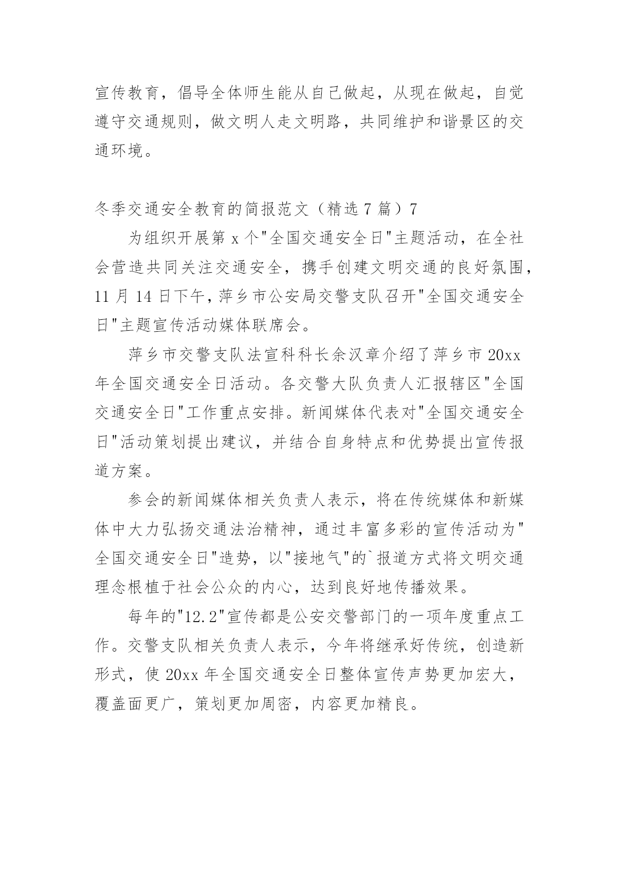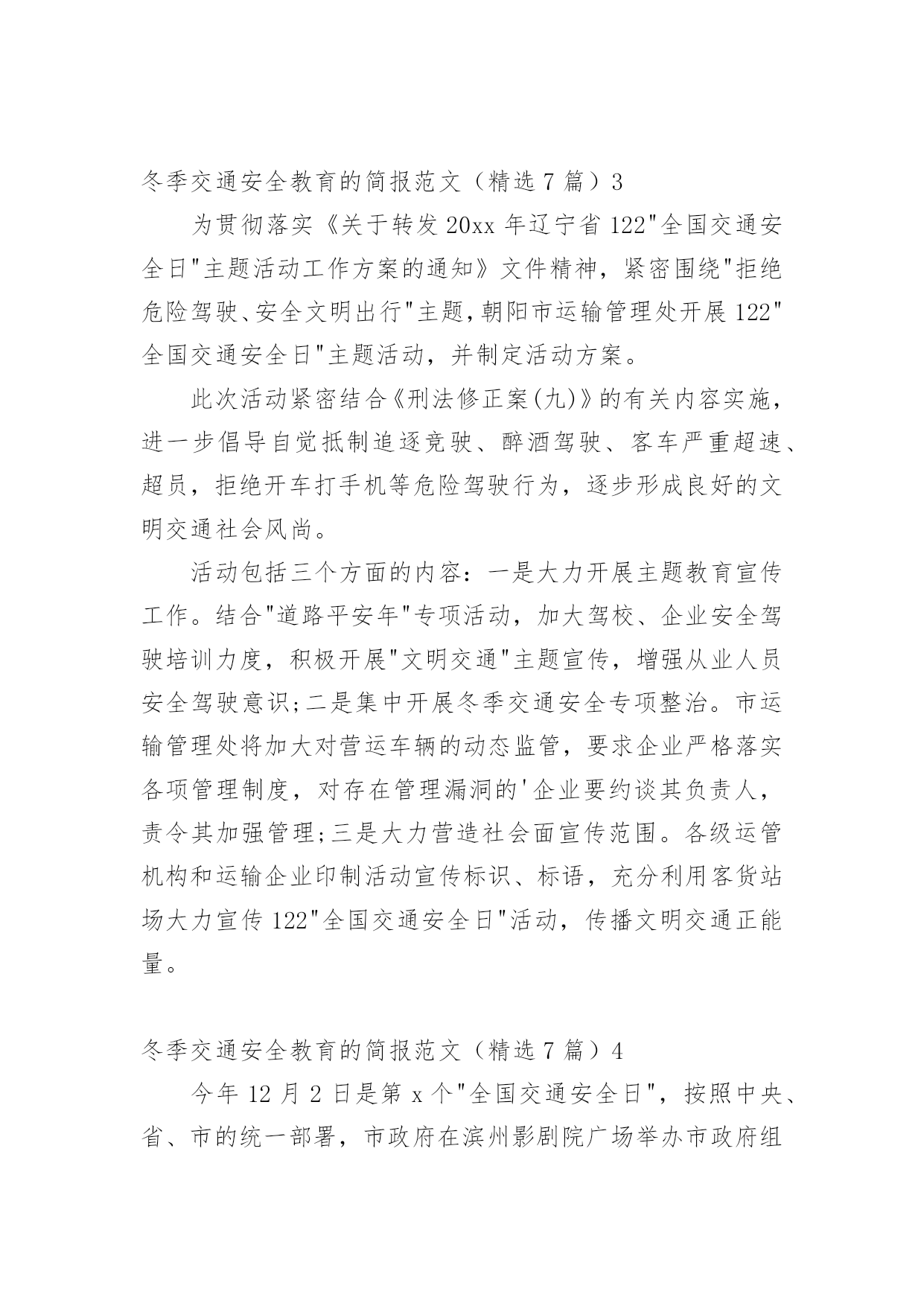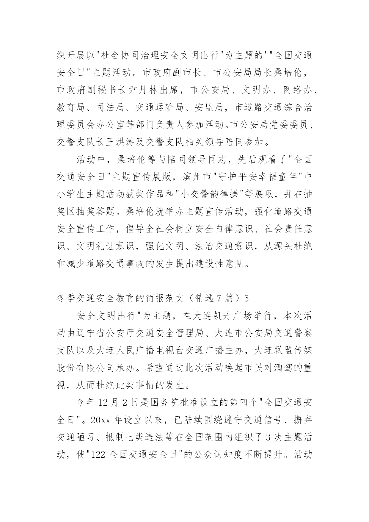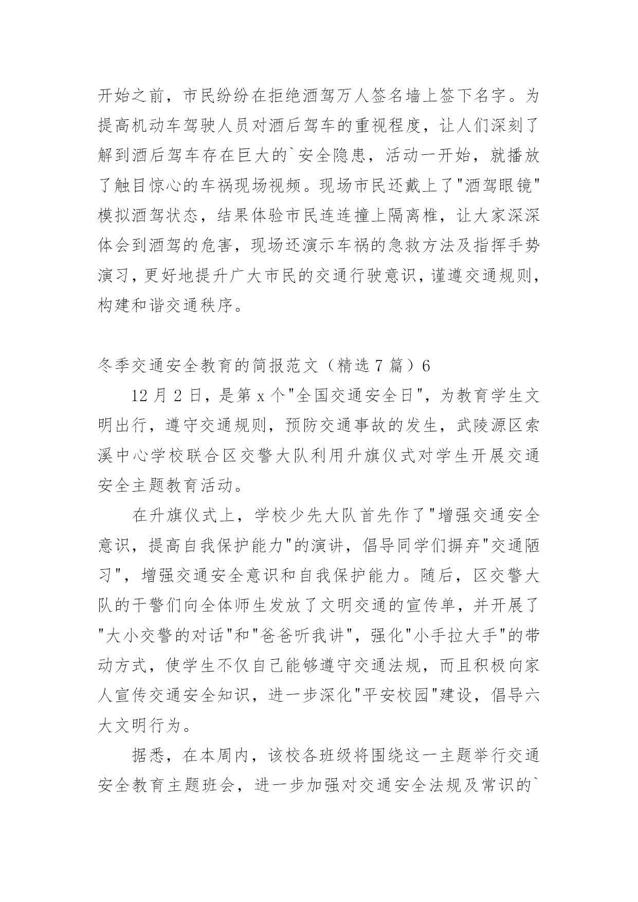 冬季交通安全教育的简报冬季交通安全教育的简报范文(精选7篇)在当今社会生活中,很多场合都离不了简报,简报的写作既不同于文字作品,也不同于评论文章。你知道什么样的简报才能算得上是好的简报吗?以下是小编为大家整理的冬季交通安全教育的简报范文(精选7篇),希望能够帮助到大家。冬季交通安全教育的简报范文(精选7篇)1近日来,泸州市纳溪区大渡口镇中心小学联合大渡口镇派出所开展为期一个月的交通安全宣传教育活动。在活动中,学校领导及安办工作人员与派出所民警在学生上学和放学时不定期进行交通安全检查。重点检查三轮车、摩托车、农用四轮车等车辆,对无牌无证、超载超速、非法运载学生的车辆驾驶员进行严肃查处,向乘车的学生及家长进行耐心细致的教育。要求相关家长到学校参加交通安全知识培训,并签定安全责任书,提高家长对交通安全的认识,帮助家长牢固树立"安全第一"的思想,带头做好学生的.表率,杜绝交通安全事故的`发生。同时,学校通过举办专题讲座、晨会、专刊、主题班队会、安全课等多种途径,广泛开展交通安全知识的宣传教育活动,增强学生的交通安全意识,提高学生自我保护能力。活动的开展,让广大学生及家长充分认识到交通安全的重要性,更明白了每个人都是交通安全的参与者、监督者,只有全社会都行动起来,才能筑牢保护孩子生命的防火墙。冬季交通安全教育的简报范文(精选7篇)2为了进一步加强幼儿园交通安全启蒙教育,全面提高幼儿的交通安全意识和文明交通意识,5月15日我园利用周五下午家长会邀请乡派出所干警宣传了交通安全教育活动,安全关系到每一个孩子和家庭的幸福。交通安全意识从幼儿抓起,随着交通事故逐年增多,为了有效预防交通事故的发生,让幼儿和家长感悟生命的珍贵,萌发保护自己的安全意识,减少幼儿身心受到意外伤害的可能性,提高学生的安全出行自我防护能力。期间,乡派出所结合幼儿园周边交通状况、幼儿出行等习惯、安全出行注意事项等内容,向幼儿宣传交通安全法律法规和安全出行常识。活动中,乡派出所干警紧紧结合幼儿园学生自我保护意识差以及当前交通安全的严峻形势等特点,以通俗易懂的语言、活生生的交通事故案例,认真分析了幼儿园学生在参与交通过程中存在的'交通违法行为,并就如何保障幼儿外出、骑车、乘车安全,预防和避免交通事故的发生与老师作了详细的探讨。通过此次活动,使广大师生对交通安全方面的知识有了进一步的了解,提醒孩子们要从小养成遵守交通法规的好习惯,并将所学的安全常识告诉身边的亲朋好友,共同遵守交通法规,做到安全出行。冬季交通安全教育的简报范文(精选7篇)3为贯彻落实《关于转发20xx年辽宁省122"全国交通安全日"主题活动工作方案的通知》文件精神,紧密围绕"拒绝危险驾驶、安全文明出行"主题,朝阳市运输管理处开展122"全国交通安全日"主题活动,并制定活动方案。此次活动紧密结合《刑法修正案(九)》的有关内容实施,进一步倡导自觉抵制追逐竞驶、醉酒驾驶、客车严重超速、超员,拒绝开车打手机等危险驾驶行为,逐步形成良好的文明交通社会风尚。活动包括三个方面的内容:一是大力开展主题教育宣传工作。结合"道路平安年"专项活动,加大驾校、企业安全驾驶培训力度,积极开展"文明交通"主题宣传,增强从业人员安全驾驶意识;二是集中开展冬季交通安全专项整治。市运输管理处将加大对营运车辆的动态监管,要求企业严格落实各项管理制度,对存在管理漏洞的'企业要约谈其负责人,责令其加强管理;三是大力营造社会面宣传范围。各级运管机构和运输企业印制活动宣传标识、标语,充分利用客货站场大力宣传122"全国交通安全日"活动,传播文明交通正能量。冬季交通安全教育的简报范文(精选7篇)4今年12月2日是第x个"全国交通安全日",按照中央、省、市的统一部署,市政府在滨州影剧院广场举办市政府组织开展以"社会协同治理安全文明出行"为主题的'"全国交通安全日"主题活动。市政府副市长、市公安局局长桑培伦,市政府副秘书长尹月林出席,市公安局、文明办、网络办、教育局、司法局、交通运输局、安监局,市道路交通综合治理委员会办公室等部门负责人参加活动。市公安局党委委员、交警支队长王洪涛及交警支队相关领导陪同参加。活动中,桑培伦等与陪同领导同志,先后观看了"全国交通安全日"主题宣传展版,滨州市"守护平安幸福童年"中小学生主题活动获奖作品和"小交警韵律操"等展项,并在抽奖区抽奖答题。桑培伦就举办主题宣传活动,强化道路交通安全宣传工作,倡导全社会树立安全自律意识、社会责任意识、文明礼让意识,强化文明、法治交通意识,从源头杜绝和减少道路交通事故的发生提出建设性意见。冬季交通安全教育的简报范文(精选7篇)5安全文明出行"为主题,在大连凯丹广场举行,本次活动由辽宁省公安厅交通安全管理局、大连市公安局交通警察支队以及大连人民广播电视台交通广播主办,大连联盟传媒股份有限公司承办。希望