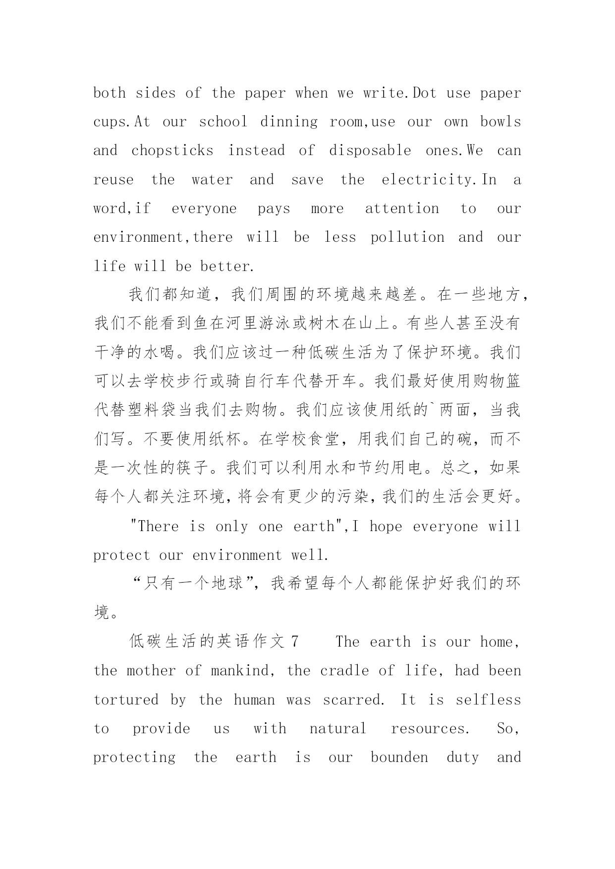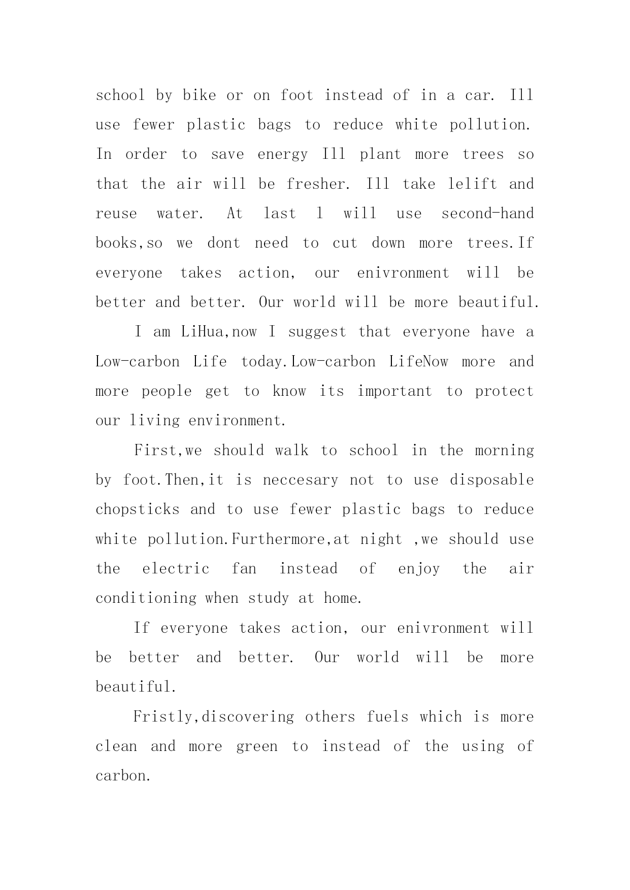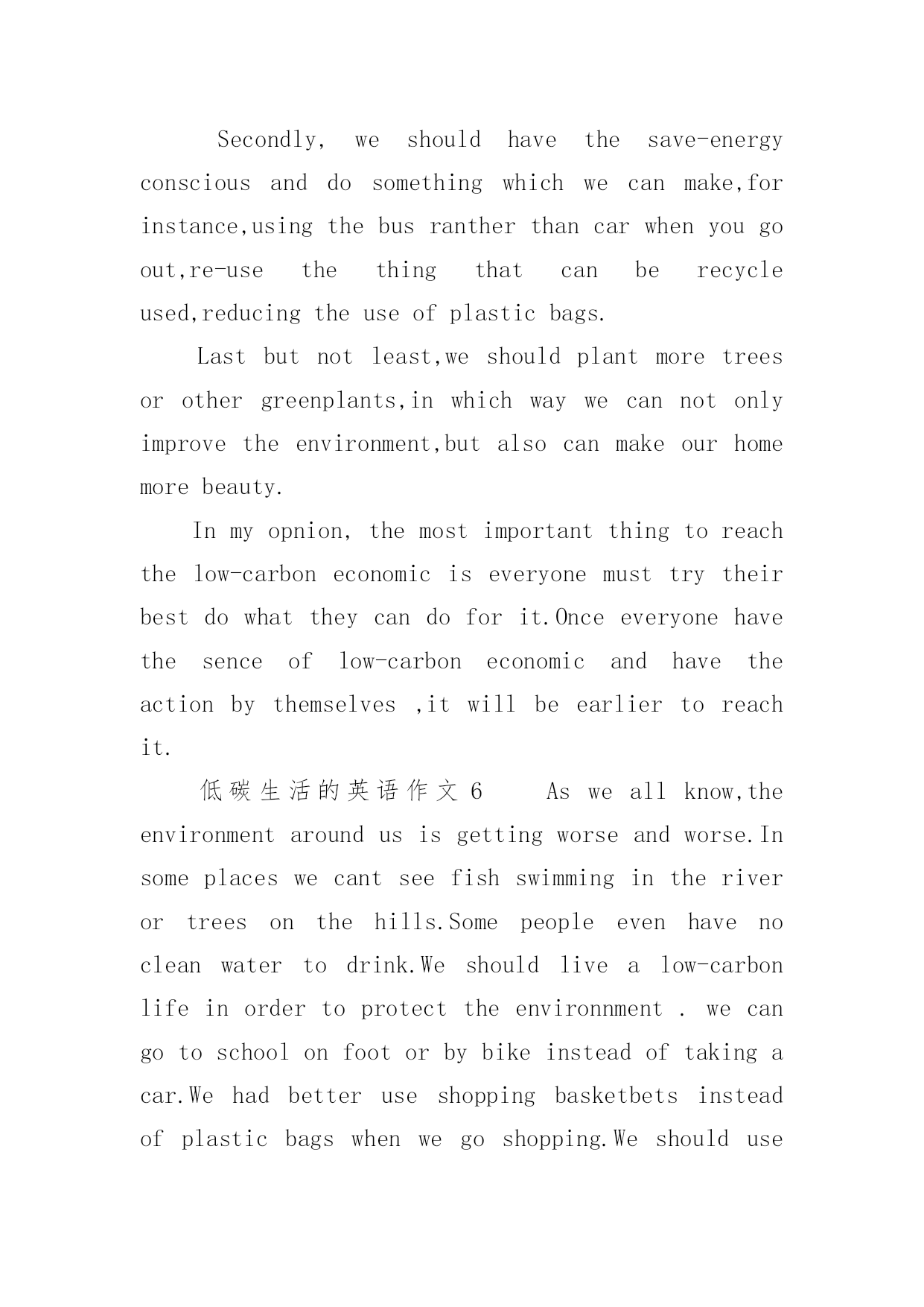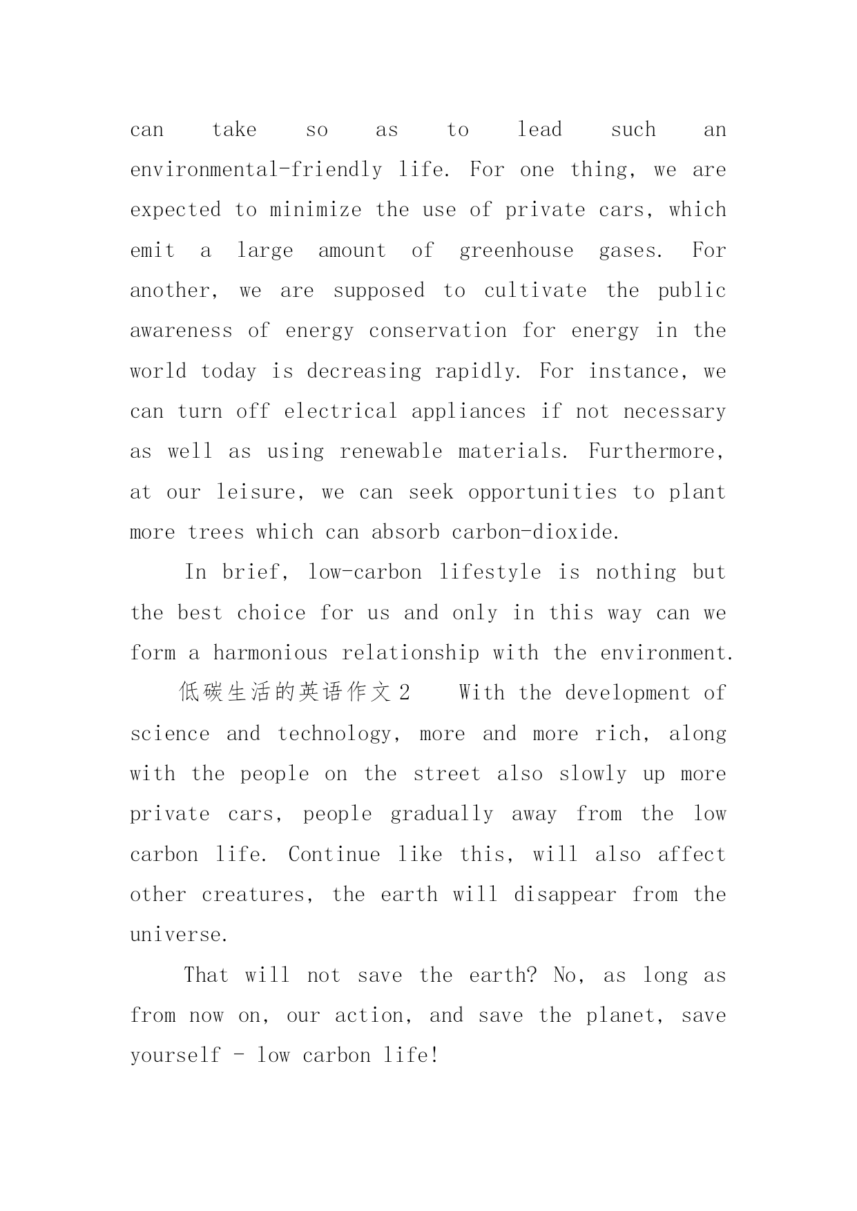 低碳生活的英语作文低碳生活的英语作文(精选23篇)无论在学习、工作或是生活中,大家总少不了接触作文吧,通过作文可以把我们那些零零散散的思想,聚集在一块。相信许多人会觉得作文很难写吧,以下是小编为大家整理的低碳生活的英语作文(精选23篇),欢迎阅读,希望大家能够喜欢。低碳生活的英语作文1Nowadays,thereareaconsiderablenumberofinpidualswhoprefertoleadalow-carbonlifestylewhichfindexpressioninthefactthatmoreandmorecommutersareusingpublictransportationsystemintheirdailylife.Lowcarbonlifestylecanendowusandoursocietywithnumerousbenefits.Firstly,itgoesbeyonddoubtthatlowcarbonlifestylecontributesalottotheenvironmentalprotectionanditisafavorablewaytoslowdowntherateofclimatechangeofourearth,whichalsomeansalottoourhealth.Wearesupposedtoundertaketheresponsibilitytoleadalow-carbonlifestyle,whichisofgreatsignificance.Andthereisapersityofmeasureswecantakesoastoleadsuchanenvironmental-friendlylife.Foronething,weareexpectedtominimizetheuseofprivatecars,whichemitalargeamountofgreenhousegases.Foranother,wearesupposedtocultivatethepublicawarenessofenergyconservationforenergyintheworldtodayisdecreasingrapidly.Forinstance,wecanturnoffelectricalappliancesifnotnecessaryaswellasusingrenewablematerials.Furthermore,atourleisure,wecanseekopportunitiestoplantmoretreeswhichcanabsorbcarbon-dioxide.Inbrief,low-carbonlifestyleisnothingbutthebestchoiceforusandonlyinthiswaycanweformaharmoniousrelationshipwiththeenvironment.低碳生活的英语作文2Withthedevelopmentofscienceandtechnology,moreandmorerich,alongwiththepeopleonthestreetalsoslowlyupmoreprivatecars,peoplegraduallyawayfromthelowcarbonlife.Continuelikethis,willalsoaffectothercreatures,theearthwilldisappearfromtheuniverse.Thatwillnotsavetheearth?No,aslongasfromnowon,ouraction,andsavetheplanet,saveyourself-lowcarbonlife!Speakingoflow-carbonlife,sinceIcanremember,mygrandfatherwouldhelpmetodevelopagoodhabit-whichwouldbesomewastepaperandthecartonsarecollected,andthengetajunkyardtosell.Istilldontunderstandwhatthen,istosave,nowthinkabout,ifeverybodycandoso,thelesswehumanbeingswillbeabletocutdownmanytrees!EverytimeIwenttothesupermarketshoppingwithmyfamily,Iwillremindadultstakeenvironmentalprotectionbag,nor