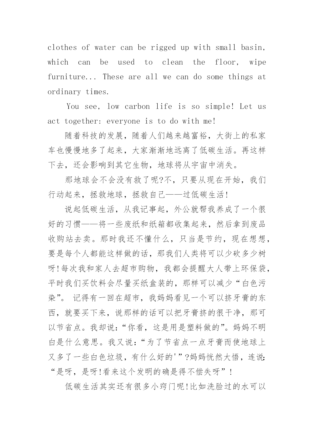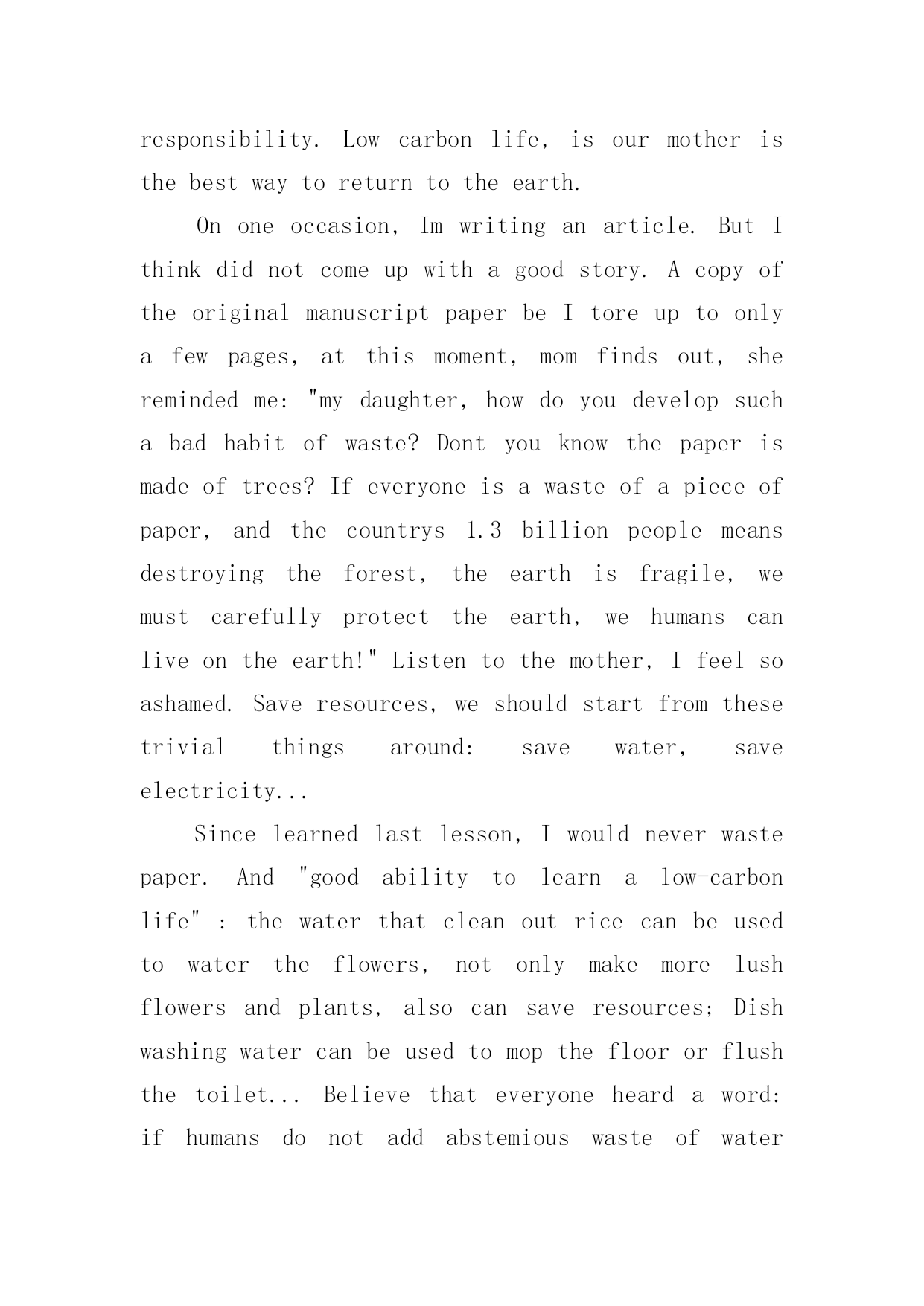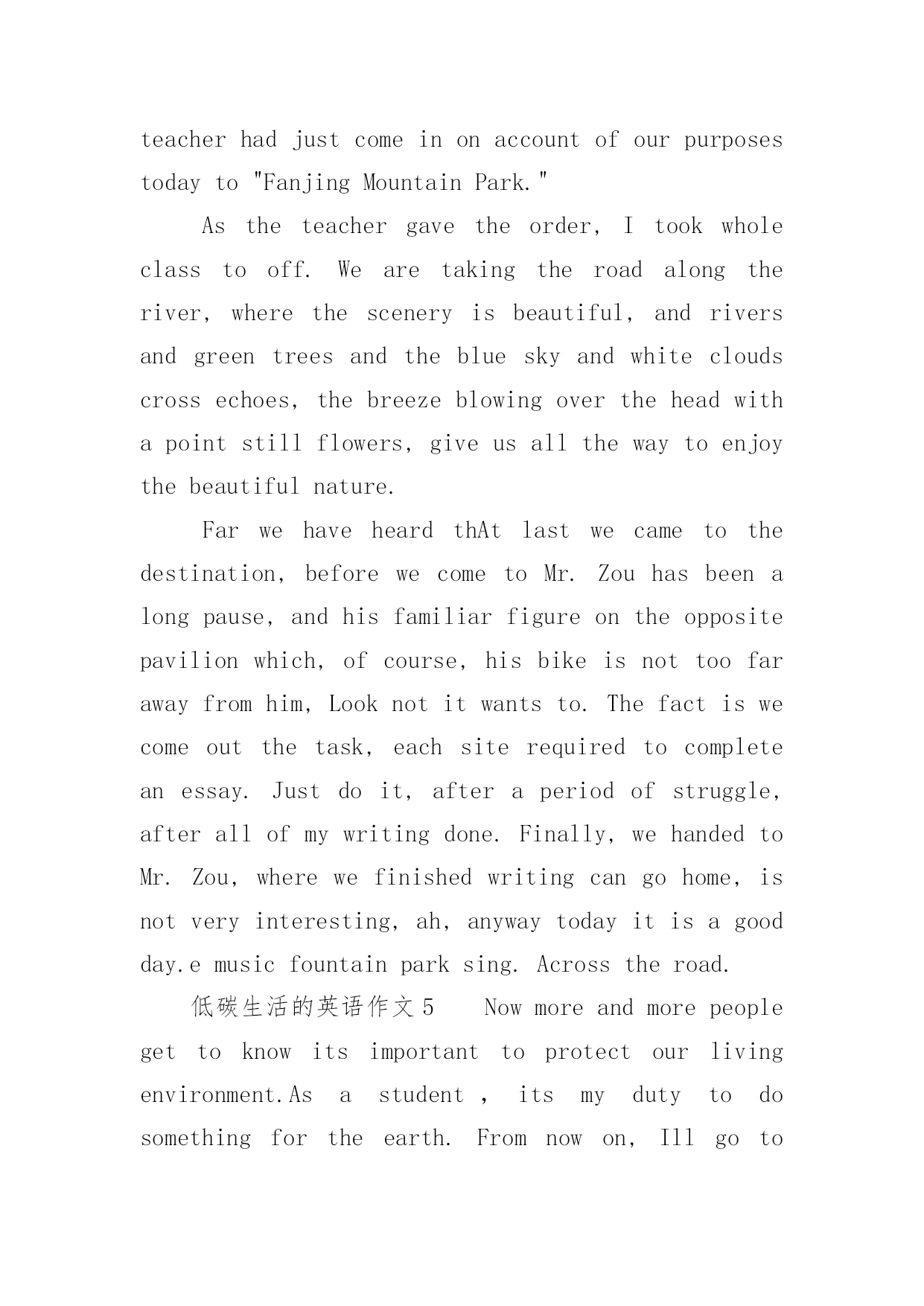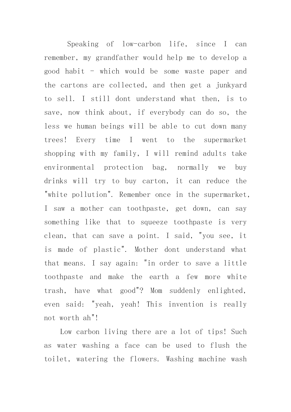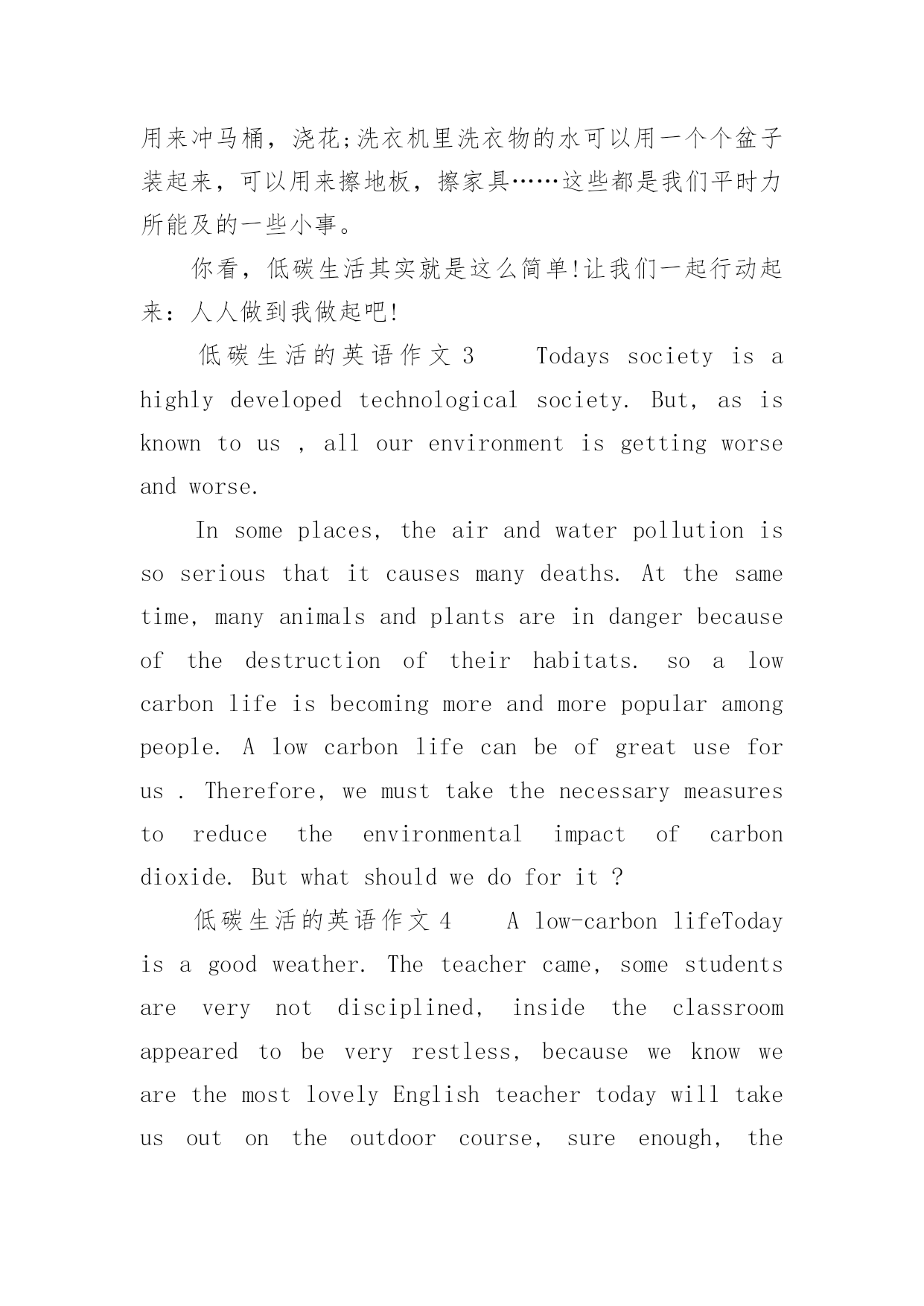 低碳生活的英语作文低碳生活的英语作文(精选23篇)无论在学习、工作或是生活中,大家总少不了接触作文吧,通过作文可以把我们那些零零散散的思想,聚集在一块。相信许多人会觉得作文很难写吧,以下是小编为大家整理的低碳生活的英语作文(精选23篇),欢迎阅读,希望大家能够喜欢。低碳生活的英语作文1Nowadays,thereareaconsiderablenumberofinpidualswhoprefertoleadalow-carbonlifestylewhichfindexpressioninthefactthatmoreandmorecommutersareusingpublictransportationsystemintheirdailylife.Lowcarbonlifestylecanendowusandoursocietywithnumerousbenefits.Firstly,itgoesbeyonddoubtthatlowcarbonlifestylecontributesalottotheenvironmentalprotectionanditisafavorablewaytoslowdowntherateofclimatechangeofourearth,whichalsomeansalottoourhealth.Wearesupposedtoundertaketheresponsibilitytoleadalow-carbonlifestyle,whichisofgreatsignificance.Andthereisapersityofmeasureswecantakesoastoleadsuchanenvironmental-friendlylife.Foronething,weareexpectedtominimizetheuseofprivatecars,whichemitalargeamountofgreenhousegases.Foranother,wearesupposedtocultivatethepublicawarenessofenergyconservationforenergyintheworldtodayisdecreasingrapidly.Forinstance,wecanturnoffelectricalappliancesifnotnecessaryaswellasusingrenewablematerials.Furthermore,atourleisure,wecanseekopportunitiestoplantmoretreeswhichcanabsorbcarbon-dioxide.Inbrief,low-carbonlifestyleisnothingbutthebestchoiceforusandonlyinthiswaycanweformaharmoniousrelationshipwiththeenvironment.低碳生活的英语作文2Withthedevelopmentofscienceandtechnology,moreandmorerich,alongwiththepeopleonthestreetalsoslowlyupmoreprivatecars,peoplegraduallyawayfromthelowcarbonlife.Continuelikethis,willalsoaffectothercreatures,theearthwilldisappearfromtheuniverse.Thatwillnotsavetheearth?No,aslongasfromnowon,ouraction,andsavetheplanet,saveyourself-lowcarbonlife!Speakingoflow-carbonlife,sinceIcanremember,mygrandfatherwouldhelpmetodevelopagoodhabit-whichwouldbesomewastepaperandthecartonsarecollected,andthengetajunkyardtosell.Istilldontunderstandwhatthen,istosave,nowthinkabout,ifeverybodycandoso,thelesswehumanbeingswillbeabletocutdownmanytrees!EverytimeIwenttothesupermarketshoppingwithmyfamily,Iwillremindadultstakeenvironmentalprotectionbag,nor
