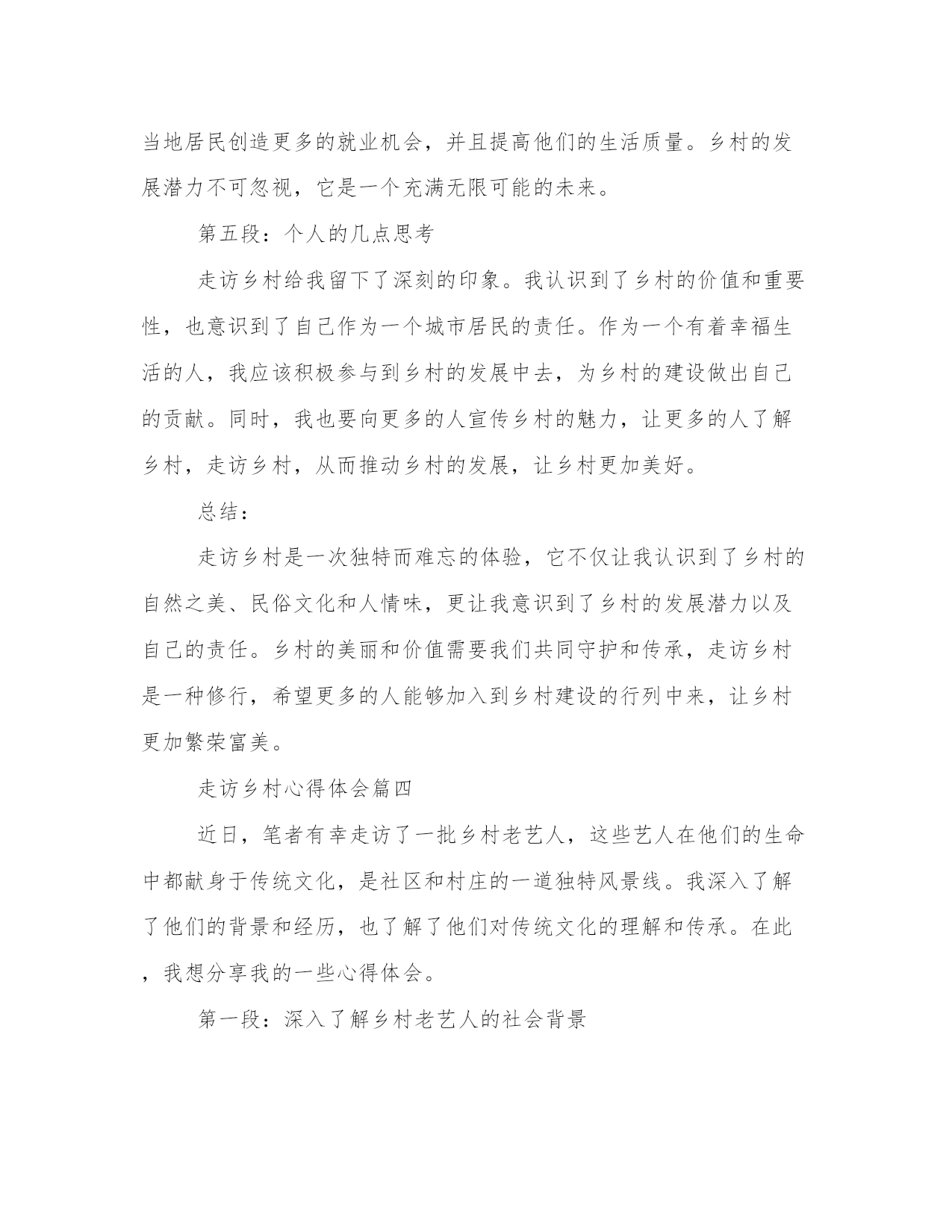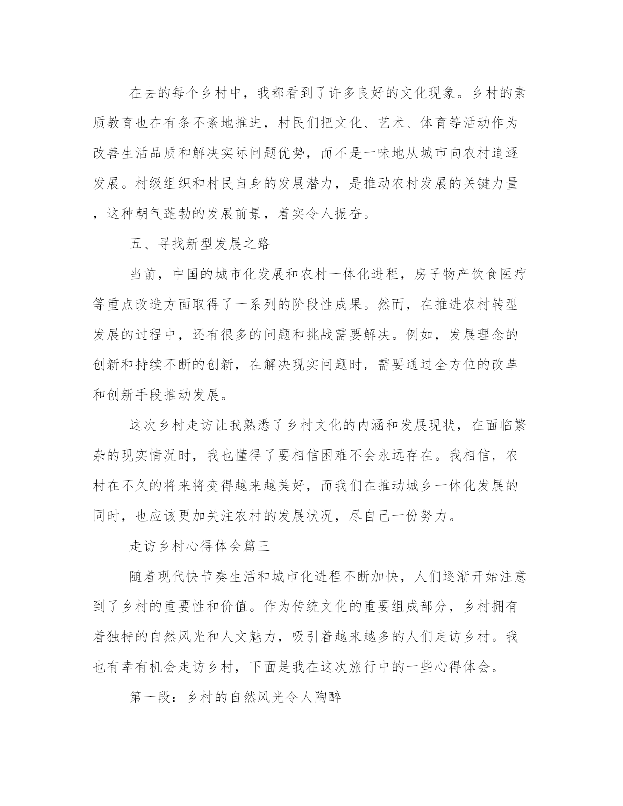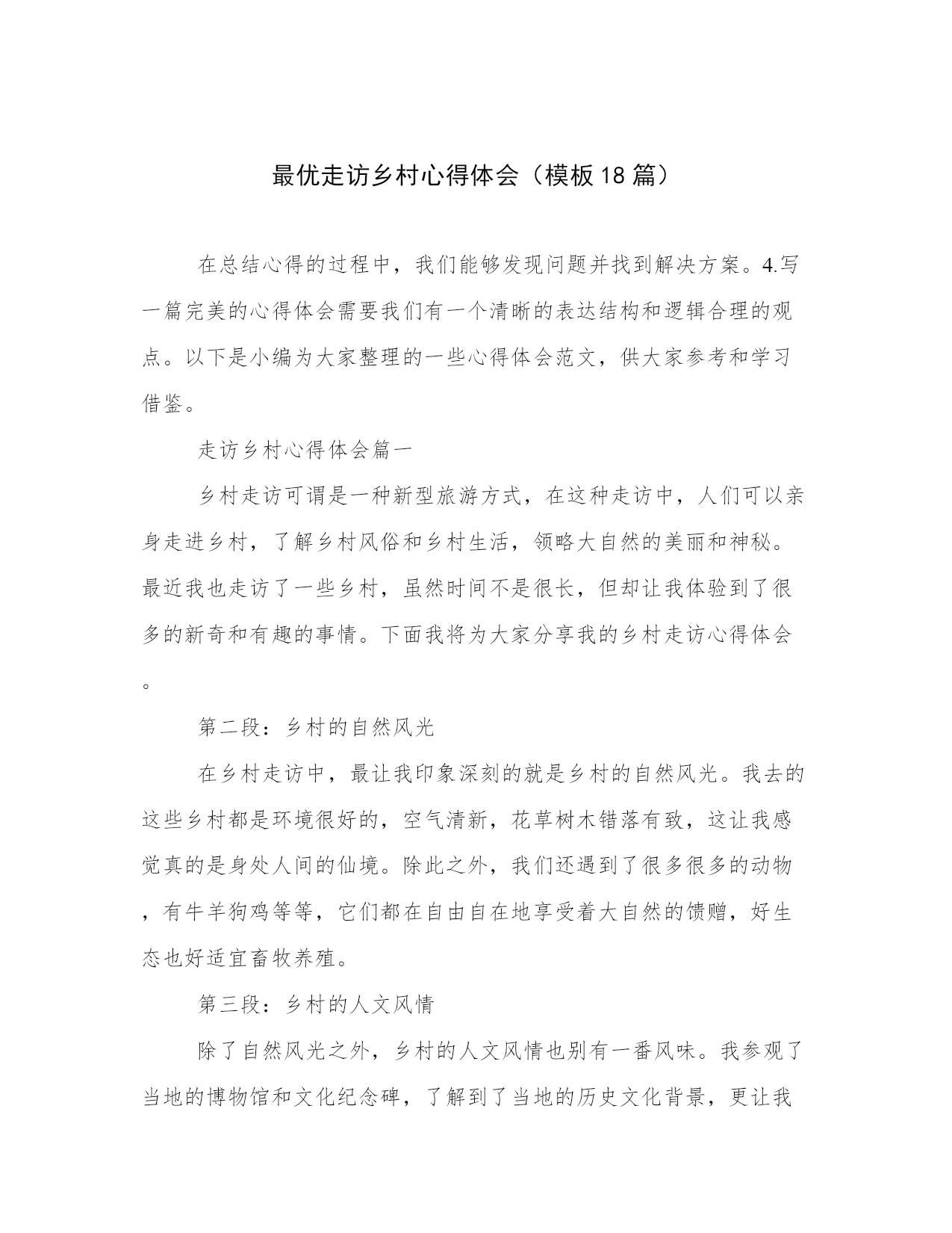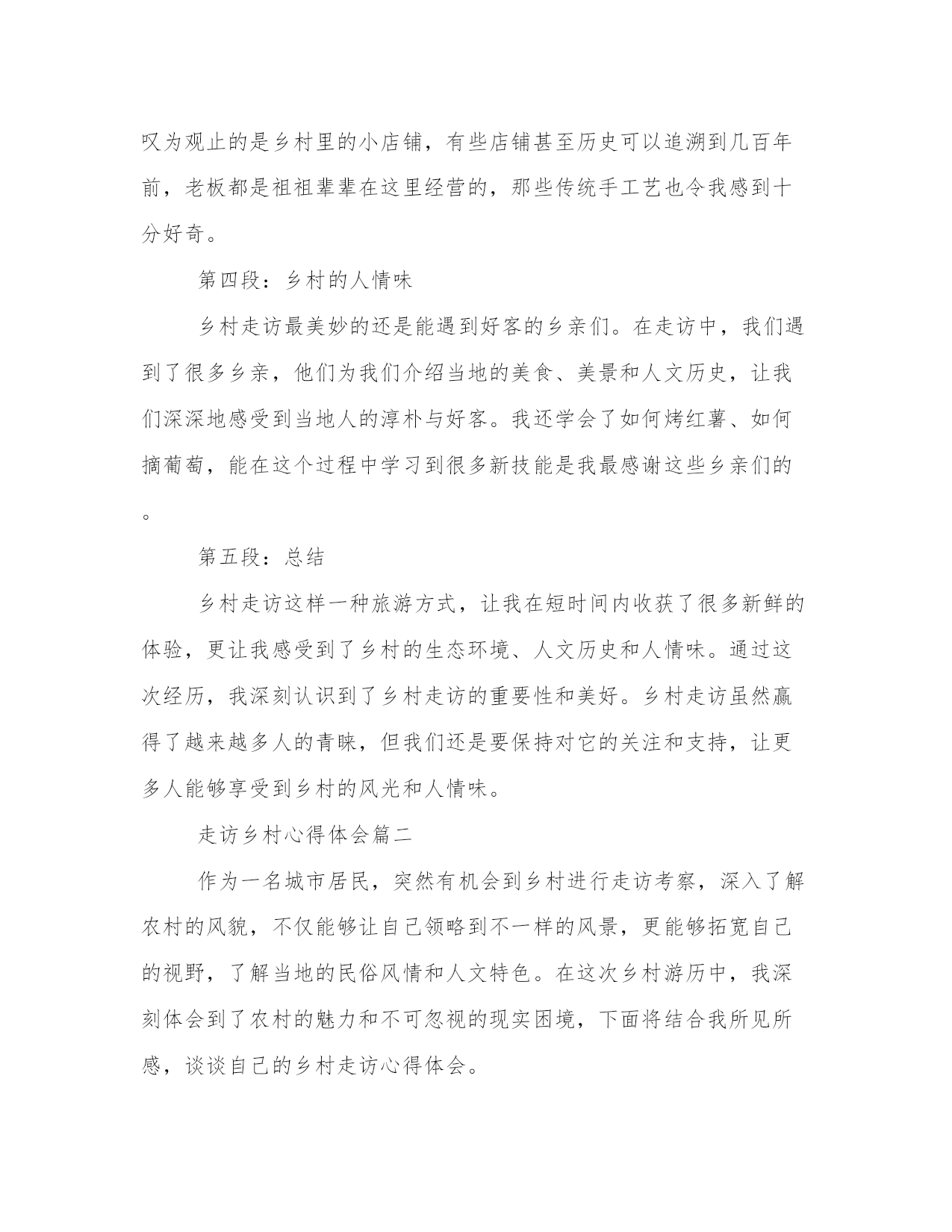 最优走访乡村心得体会(模板18篇)在总结心得的过程中,我们能够发现问题并找到解决方案。4.写一篇完美的心得体会需要我们有一个清晰的表达结构和逻辑合理的观点。以下是小编为大家整理的一些心得体会范文,供大家参考和学习借鉴。走访乡村心得体会篇一乡村走访可谓是一种新型旅游方式,在这种走访中,人们可以亲身走进乡村,了解乡村风俗和乡村生活,领略大自然的美丽和神秘。最近我也走访了一些乡村,虽然时间不是很长,但却让我体验到了很多的新奇和有趣的事情。下面我将为大家分享我的乡村走访心得体会。第二段:乡村的自然风光在乡村走访中,最让我印象深刻的就是乡村的自然风光。我去的这些乡村都是环境很好的,空气清新,花草树木错落有致,这让我感觉真的是身处人间的仙境。除此之外,我们还遇到了很多很多的动物,有牛羊狗鸡等等,它们都在自由自在地享受着大自然的馈赠,好生态也好适宜畜牧养殖。第三段:乡村的人文风情除了自然风光之外,乡村的人文风情也别有一番风味。我参观了当地的博物馆和文化纪念碑,了解到了当地的历史文化背景,更让我叹为观止的是乡村里的小店铺,有些店铺甚至历史可以追溯到几百年前,老板都是祖祖辈辈在这里经营的,那些传统手工艺也令我感到十分好奇。第四段:乡村的人情味乡村走访最美妙的还是能遇到好客的乡亲们。在走访中,我们遇到了很多乡亲,他们为我们介绍当地的美食、美景和人文历史,让我们深深地感受到当地人的淳朴与好客。我还学会了如何烤红薯、如何摘葡萄,能在这个过程中学习到很多新技能是我最感谢这些乡亲们的。第五段:总结乡村走访这样一种旅游方式,让我在短时间内收获了很多新鲜的体验,更让我感受到了乡村的生态环境、人文历史和人情味。通过这次经历,我深刻认识到了乡村走访的重要性和美好。乡村走访虽然赢得了越来越多人的青睐,但我们还是要保持对它的关注和支持,让更多人能够享受到乡村的风光和人情味。走访乡村心得体会篇二作为一名城市居民,突然有机会到乡村进行走访考察,深入了解农村的风貌,不仅能够让自己领略到不一样的风景,更能够拓宽自己的视野,了解当地的民俗风情和人文特色。在这次乡村游历中,我深刻体会到了农村的魅力和不可忽视的现实困境,下面将结合我所见所感,谈谈自己的乡村走访心得体会。一、了解乡村民俗风情乡村走访的第一站,我到达了一个传统的农家院落,那里的老房子依旧保持着古老的建筑风格,生活用具也是精致的老物件。主人热情地接待我们,向我们展示了当地的手工艺品,那手艺精湛,虽然表面看起来很简单,但是却给人深刻的印象。此外,跟随主人的引导,我们参加了一次农家自制绿豆汤,整个过程简单又热闹,一家人聚在一起,同享天伦之乐。二、接受农村文化的熏陶乡村文化有着非常丰富和独特的特点,我发现在那里的人民有着浓郁的家风和家训,他们对待事物的态度和观念也和城市人很不相同。与他们共处的时间让我感受到了这种文化的魅力,一个些看似不起眼的细节,都在告诉我们一些独特的文化内涵。三、面对乡村现实问题在农村,并不只有那种凄凉和落寞的景象,还有一些很实际的问题,例如家庭加强农业生产和聚拢资源,人口流失和后继无人。当地的老百姓告诉我们,过去他们还有很多村庄,而今只剩下一些简陋的房屋,生活质量有所下降。这次乡村考察,让我意识到农村面临的困境,以及我们城市居民在与农村相比时的优越性,也让我懂得爱护城市和农村的环境,为打造更加美丽的中国做出自己的贡献。四、良好文化氛围聚焦发展在去的每个乡村中,我都看到了许多良好的文化现象。乡村的素质教育也在有条不紊地推进,村民们把文化、艺术、体育等活动作为改善生活品质和解决实际问题优势,而不是一味地从城市向农村追逐发展。村级组织和村民自身的发展潜力,是推动农村发展的关键力量,这种朝气蓬勃的发展前景,着实令人振奋。五、寻找新型发展之路当前,中国的城市化发展和农村一体化进程,房子物产饮食医疗等重点改造方面取得了一系列的阶段性成果。然而,在推进农村转型发展的过程中,还有很多的问题和挑战需要解决。例如,发展理念的创新和持续不断的创新,在解决现实问题时,需要通过全方位的改革和创新手段推动发展。这次乡村走访让我熟悉了乡村文化的内涵和发展现状,在面临繁杂的现实情况时,我也懂得了要相信困难不会永远存在。我相信,农村在不久的将来将变得越来越美好,而我们在推动城乡一体化发展的同时,也应该更加关注农村的发展状况,尽自己一份努力。走访乡村心得体会篇三随着现代快节奏生活和城市化进程不断加快,人们逐渐开始注意到了乡村的重要性和价值。作为传统文化的重要组成部分,乡村拥有着独特的自然风光和人文魅力,吸引着越来越多的人们走访乡村。我也有幸有机会走访乡村,下面是我在这次旅行中的一些心得体会。第一段:乡村的自然风光令人陶醉乡村拥有着辽阔的土地和壮美的自然风光,这是城市无法比拟的。当我