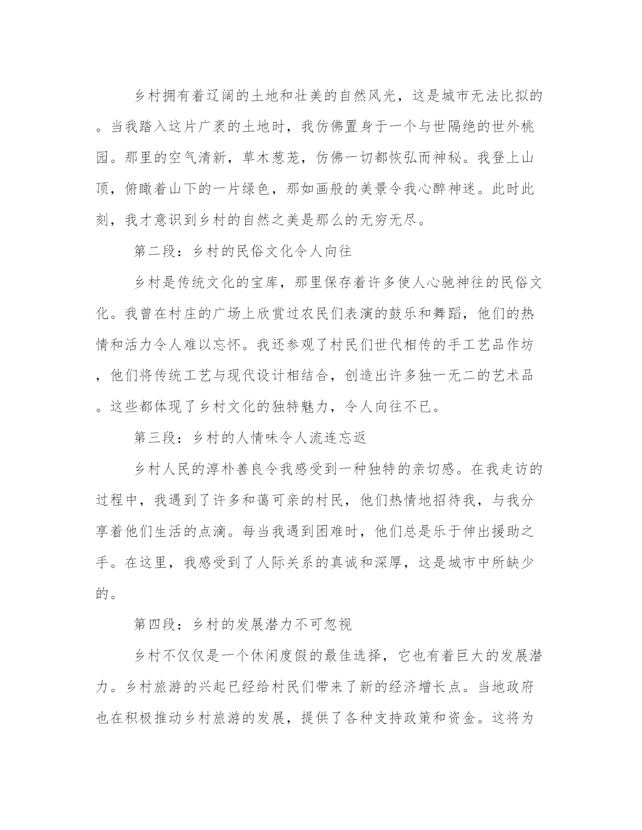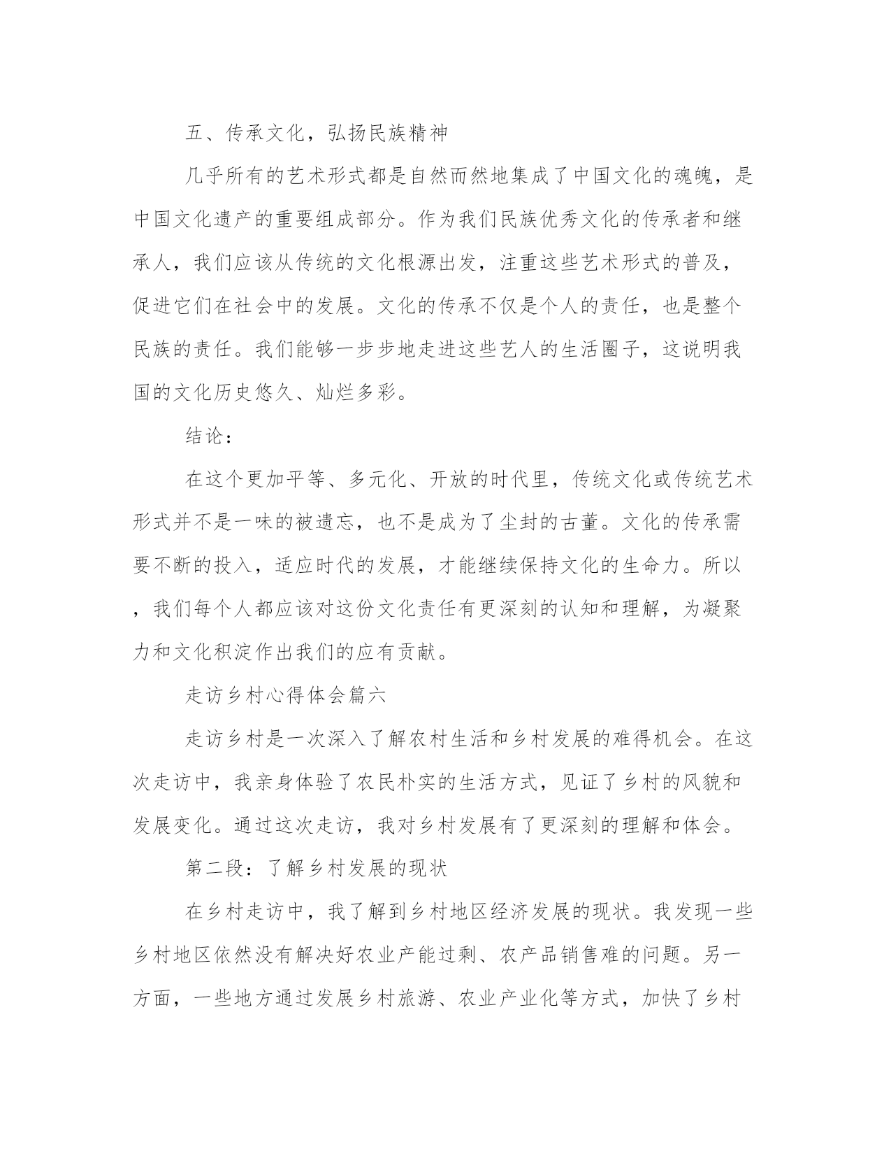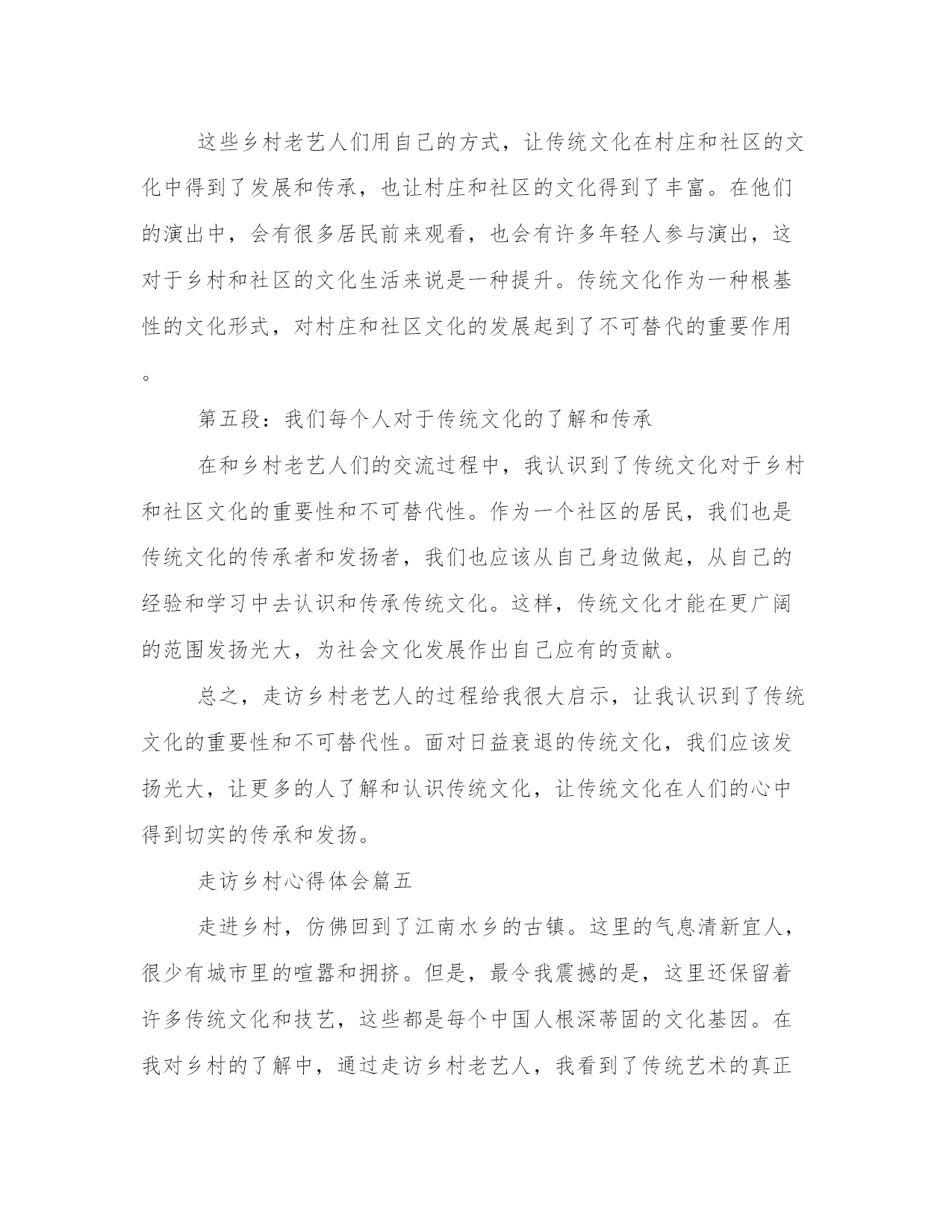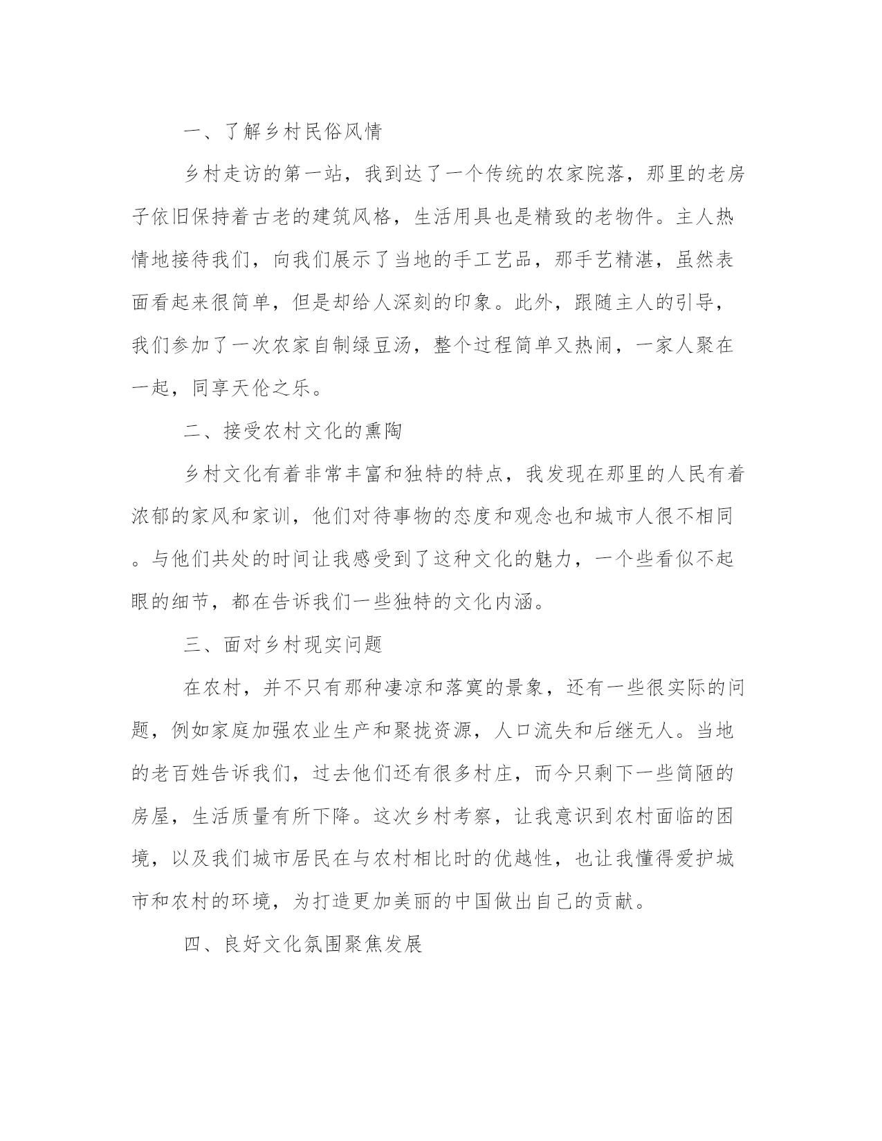 最优走访乡村心得体会(模板18篇)在总结心得的过程中,我们能够发现问题并找到解决方案。4.写一篇完美的心得体会需要我们有一个清晰的表达结构和逻辑合理的观点。以下是小编为大家整理的一些心得体会范文,供大家参考和学习借鉴。走访乡村心得体会篇一乡村走访可谓是一种新型旅游方式,在这种走访中,人们可以亲身走进乡村,了解乡村风俗和乡村生活,领略大自然的美丽和神秘。最近我也走访了一些乡村,虽然时间不是很长,但却让我体验到了很多的新奇和有趣的事情。下面我将为大家分享我的乡村走访心得体会。第二段:乡村的自然风光在乡村走访中,最让我印象深刻的就是乡村的自然风光。我去的这些乡村都是环境很好的,空气清新,花草树木错落有致,这让我感觉真的是身处人间的仙境。除此之外,我们还遇到了很多很多的动物,有牛羊狗鸡等等,它们都在自由自在地享受着大自然的馈赠,好生态也好适宜畜牧养殖。第三段:乡村的人文风情除了自然风光之外,乡村的人文风情也别有一番风味。我参观了当地的博物馆和文化纪念碑,了解到了当地的历史文化背景,更让我叹为观止的是乡村里的小店铺,有些店铺甚至历史可以追溯到几百年前,老板都是祖祖辈辈在这里经营的,那些传统手工艺也令我感到十分好奇。第四段:乡村的人情味乡村走访最美妙的还是能遇到好客的乡亲们。在走访中,我们遇到了很多乡亲,他们为我们介绍当地的美食、美景和人文历史,让我们深深地感受到当地人的淳朴与好客。我还学会了如何烤红薯、如何摘葡萄,能在这个过程中学习到很多新技能是我最感谢这些乡亲们的。第五段:总结乡村走访这样一种旅游方式,让我在短时间内收获了很多新鲜的体验,更让我感受到了乡村的生态环境、人文历史和人情味。通过这次经历,我深刻认识到了乡村走访的重要性和美好。乡村走访虽然赢得了越来越多人的青睐,但我们还是要保持对它的关注和支持,让更多人能够享受到乡村的风光和人情味。走访乡村心得体会篇二作为一名城市居民,突然有机会到乡村进行走访考察,深入了解农村的风貌,不仅能够让自己领略到不一样的风景,更能够拓宽自己的视野,了解当地的民俗风情和人文特色。在这次乡村游历中,我深刻体会到了农村的魅力和不可忽视的现实困境,下面将结合我所见所感,谈谈自己的乡村走访心得体会。一、了解乡村民俗风情乡村走访的第一站,我到达了一个传统的农家院落,那里的老房子依旧保持着古老的建筑风格,生活用具也是精致的老物件。主人热情地接待我们,向我们展示了当地的手工艺品,那手艺精湛,虽然表面看起来很简单,但是却给人深刻的印象。此外,跟随主人的引导,我们参加了一次农家自制绿豆汤,整个过程简单又热闹,一家人聚在一起,同享天伦之乐。二、接受农村文化的熏陶乡村文化有着非常丰富和独特的特点,我发现在那里的人民有着浓郁的家风和家训,他们对待事物的态度和观念也和城市人很不相同。与他们共处的时间让我感受到了这种文化的魅力,一个些看似不起眼的细节,都在告诉我们一些独特的文化内涵。三、面对乡村现实问题在农村,并不只有那种凄凉和落寞的景象,还有一些很实际的问题,例如家庭加强农业生产和聚拢资源,人口流失和后继无人。当地的老百姓告诉我们,过去他们还有很多村庄,而今只剩下一些简陋的房屋,生活质量有所下降。这次乡村考察,让我意识到农村面临的困境,以及我们城市居民在与农村相比时的优越性,也让我懂得爱护城市和农村的环境,为打造更加美丽的中国做出自己的贡献。四、良好文化氛围聚焦发展在去的每个乡村中,我都看到了许多良好的文化现象。乡村的素质教育也在有条不紊地推进,村民们把文化、艺术、体育等活动作为改善生活品质和解决实际问题优势,而不是一味地从城市向农村追逐发展。村级组织和村民自身的发展潜力,是推动农村发展的关键力量,这种朝气蓬勃的发展前景,着实令人振奋。五、寻找新型发展之路当前,中国的城市化发展和农村一体化进程,房子物产饮食医疗等重点改造方面取得了一系列的阶段性成果。然而,在推进农村转型发展的过程中,还有很多的问题和挑战需要解决。例如,发展理念的创新和持续不断的创新,在解决现实问题时,需要通过全方位的改革和创新手段推动发展。这次乡村走访让我熟悉了乡村文化的内涵和发展现状,在面临繁杂的现实情况时,我也懂得了要相信困难不会永远存在。我相信,农村在不久的将来将变得越来越美好,而我们在推动城乡一体化发展的同时,也应该更加关注农村的发展状况,尽自己一份努力。走访乡村心得体会篇三随着现代快节奏生活和城市化进程不断加快,人们逐渐开始注意到了乡村的重要性和价值。作为传统文化的重要组成部分,乡村拥有着独特的自然风光和人文魅力,吸引着越来越多的人们走访乡村。我也有幸有机会走访乡村,下面是我在这次旅行中的一些心得体会。第一段:乡村的自然风光令人陶醉乡村拥有着辽阔的土地和壮美的自然风光,这是城市无法比拟的。当我