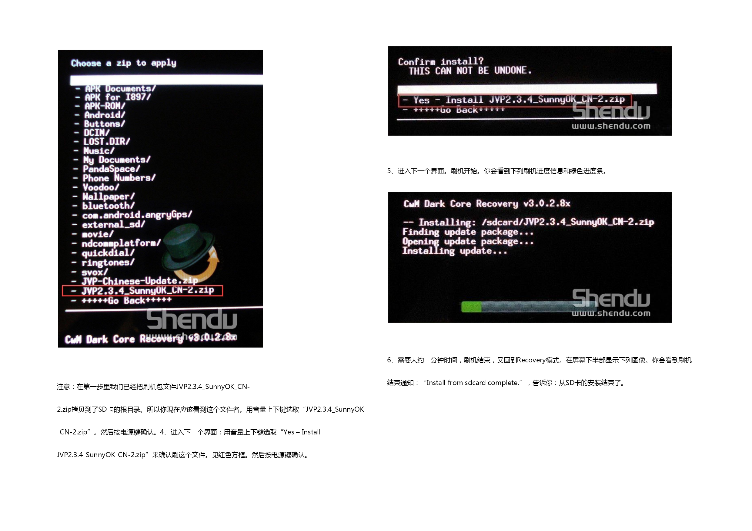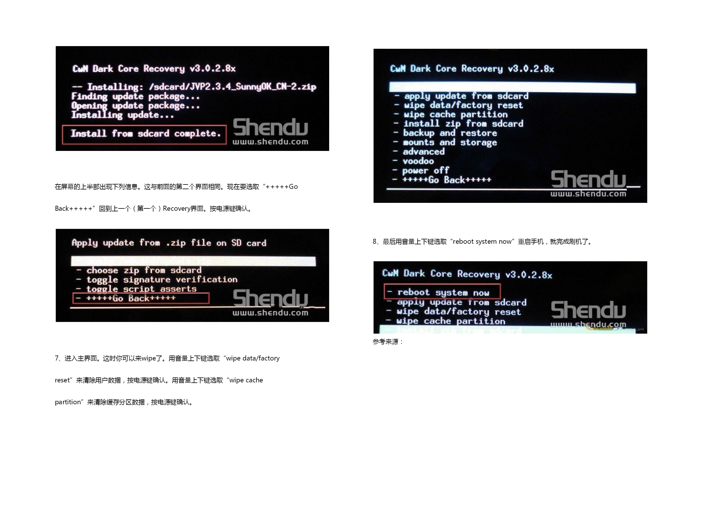 想给三星i9000刷机的朋友看这里,这还提供了三星i9000ROOT、刷Recovery教程,三星i9000刷机驱动,下面来看看三星i9000刷机教程。HYPERLINKi9000刷机驱动三星i9000ROOT教程:HYPERLINK"http://www.shendu.com/android/tutorial-3193.html"\t"_blank"三星i9000刷Recovery:HYPERLINK"http://www.shendu.com/android/tutorial-3194.html"\t"_blank"1、进入Recovery模式后,你会看到下面界面:用音量上下键选取“installzipfromsdcard”。见红色方框。然后按电源键确认。2、进入下一个界面:用音量上下键选取“choosezipfromsdcard”。见红色方框。然后按电源键确认。3、进入下一个界面:在这个界面里,你可以看到你SD卡上根目录下的所有目录和文件。注意:在第一步里我们已经把刷机包文件JVP2.3.4_SunnyOK_CN-2.zip拷贝到了SD卡的根目录。所以你现在应该看到这个文件名。用音量上下键选取“JVP2.3.4_SunnyOK_CN-2.zip”。然后按电源键确认。4、进入下一个界面:用音量上下键选取“Yes–InstallJVP2.3.4_SunnyOK_CN-2.zip”来确认刷这个文件。见红色方框。然后按电源键确认。5、进入下一个界面。刷机开始。你会看到下列刷机进度信息和绿色进度条。6、需要大约一分钟时间,刷机结束,又回到Recovery模式。在屏幕下半部显示下列图像。你会看到刷机结束通知:“Installfromsdcardcomplete.”,告诉你:从SD卡的安装结束了。在屏幕的上半部出现下列信息。这与前面的第二个界面相同。现在要选取“+++++GoBack+++++”回到上一个(第一个)Recovery界面。按电源键确认。7、进入主界面。这时你可以来wipe了。用音量上下键选取“wipedata/factoryreset”来清除用户数据,按电源键确认。用音量上下键选取“wipecachepartition”来清除缓存分区数据,按电源键确认。8、最后用音量上下键选取“rebootsystemnow”重启手机,就完成刷机了。参考来源:HYPERLINK"http://www.shendu.com/android/tutorial-3195.html"