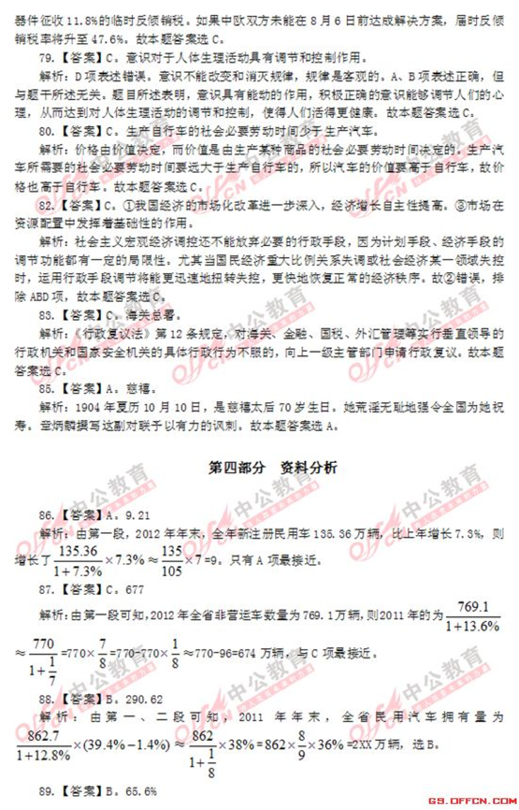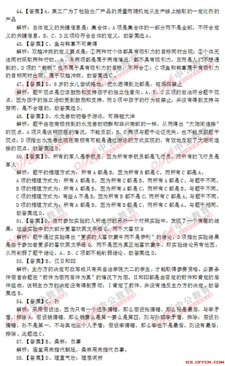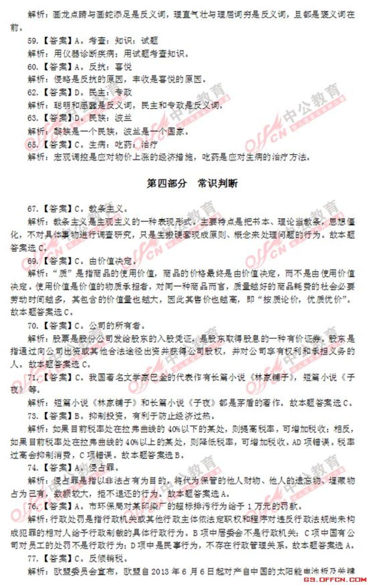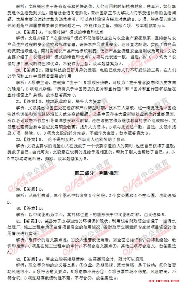 第一部分言语理解与表达L【答案】Bst章程主幸析:gu谦虚n对应u吉普扬n可知.所填词语应与"激动n对应s四个选项中,ε'清运刀轰合适=故本题答案为B,3.【答案】B,升堂入室第析"温故知新'3tE温习学运的知识,而得到新的军装和心得-"升童入室n比喻学识!I(技能自浅入深,循序渐远.逐步达到很高的成就Je闻名遥远刀形容名声很大.远远的人们都知道Je集居f益n指集中群众的智慧,广泛吸收有益的意见:83tt主E比循序渐远,积淀港台刀可知.u登堂入室刀是台句意-故本~答案为B,4.【答案】A,窒其项背纷沓而至,每析"望其项背"比喻赶得上,明显不合句意,持除B.<t趋之着雪n比喻很多人争着去追逐(不好的事钩),其色彩与遥远不符,f草除C::t门庭若市刀形容来的人很多.在常热闹,明显不能与"国内外投资者刀搭配,f草除0,故本豆豆答案为A,6.【答案】C,堂堂正正掷莲实地震析:分析可知,第一空所填词语应与t'M辱".意思扫对J·循规蹈矩刀、"名正言JIjij"均与此不符,传E在A、D两项事再看第二空,与2实事求是M裙比~"3却E去实生在."用来形容"弯着摆做事n更恰当z故本题答案为C,8.【答案】A,欢乐幻灭浪高主草草析:分析可知,第一空、第二空所填入的词语应与"痛苦"、"追求刀构成反义关系,由此持除C、D两项e再看第三空,所填词语应和"投入刀构成并列关系,且程度主要深予"投入刀,再根据"它是我们永远的记忆n可知,与u交织刀相比,aet高高主n更恰当事故本寇在EZZ为儿9.【答案】0,般害品格主军析:先看第一空."1圭吝刀、u损害刀二者营与利益、权利搭配,一般不亘族形容人-81这l4草除B、c两项s再看第二空-u品质n是指一个人在心Jg过程中和个性心理将t[,两方面表现出来的本质特征:"品格"是指人的道德素质的核心.更多指向正面的人格z分析句意可知.此处说的应是书籍对人的u品格n的影响.而~~"品,景气故本题答案为0,11.【答案]A,调整规范健康皇军析:分析可知Je主主领n与u关系"搭配不当Je优化n与u行为"搭配不当,8此可持除B、c两项=u牵主康有序发晨刀为常用搭配=故本主主正确答案为A,12.【答案】A,二十园集团提供万亿美元帮助困难国主幸祈2分析可知.文段说的是二十国集团领导人同意提供l万亿美元资金.来帮助受金黯危机影响拖入西霉的国家,A项与此招待,B、c、D三项表述均不移全面、准确.不符合标题将征,可在辛2在=故本题正确答案为A,15.【答案】0,恰恰有利于弥补畜考制度固有的续焰,是在更高J~次上体现了公平、公正的竞争原则,也要符合实施素质教育的改革浪海主军析:本题主要考查的是句子内容的先后逻慧眼序s按照艰序.应该是弥补击走路.事导体现公平公正原则.轰后符合改革浪i总故本.~答案为0,16.[答案】B,红杏枝头春意闹第析:UZ草胀"$z.~旨事韧的扩大!I(边长,A项号虽词梨花主主开的数量之多:B项建词春意正浓,"阔n字与"澎涨"稳对应,当选:C项措绘了山沟的色彩之美:0项主要抒发离别愁绪=故本~答案为B,17.【答案】A,如何享受悠闲的运休生活GS.口FFC闵.C口M