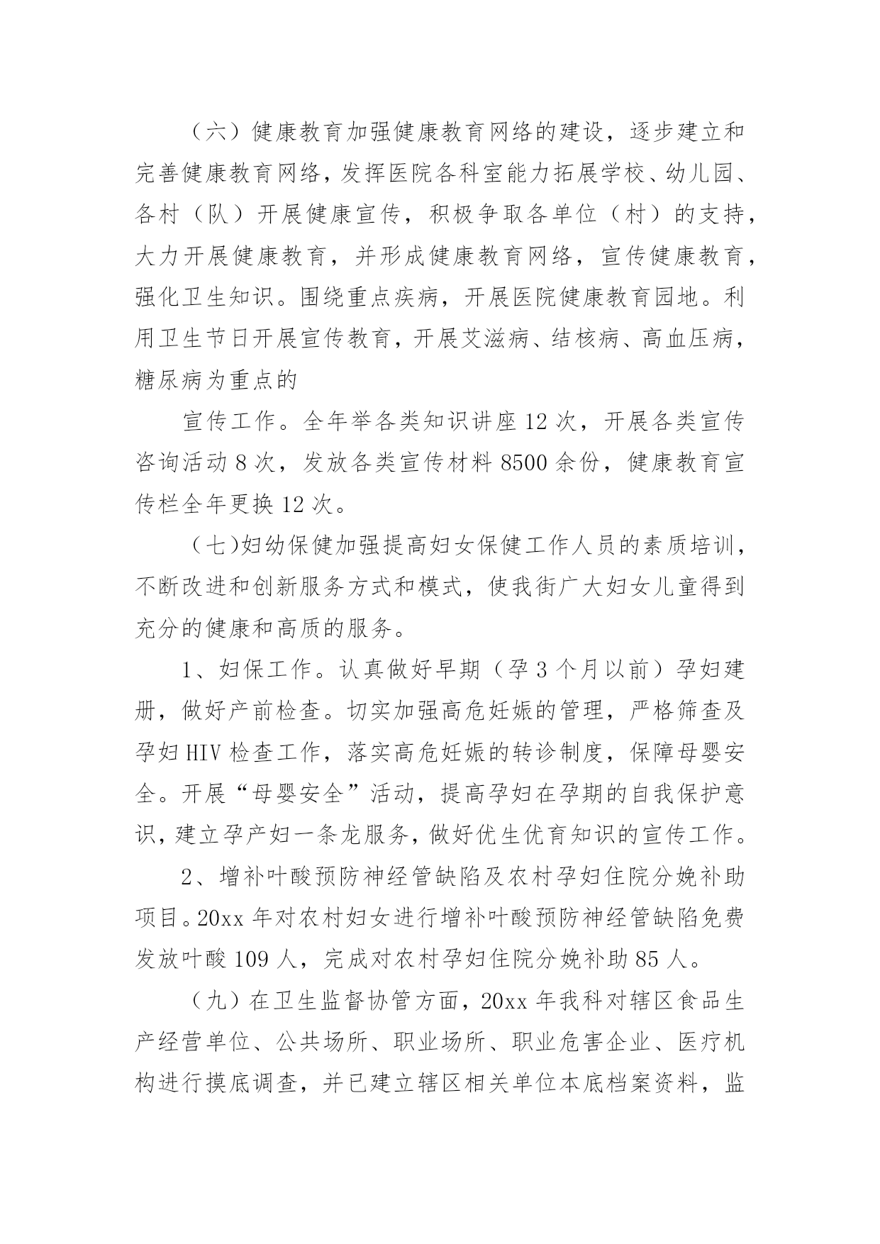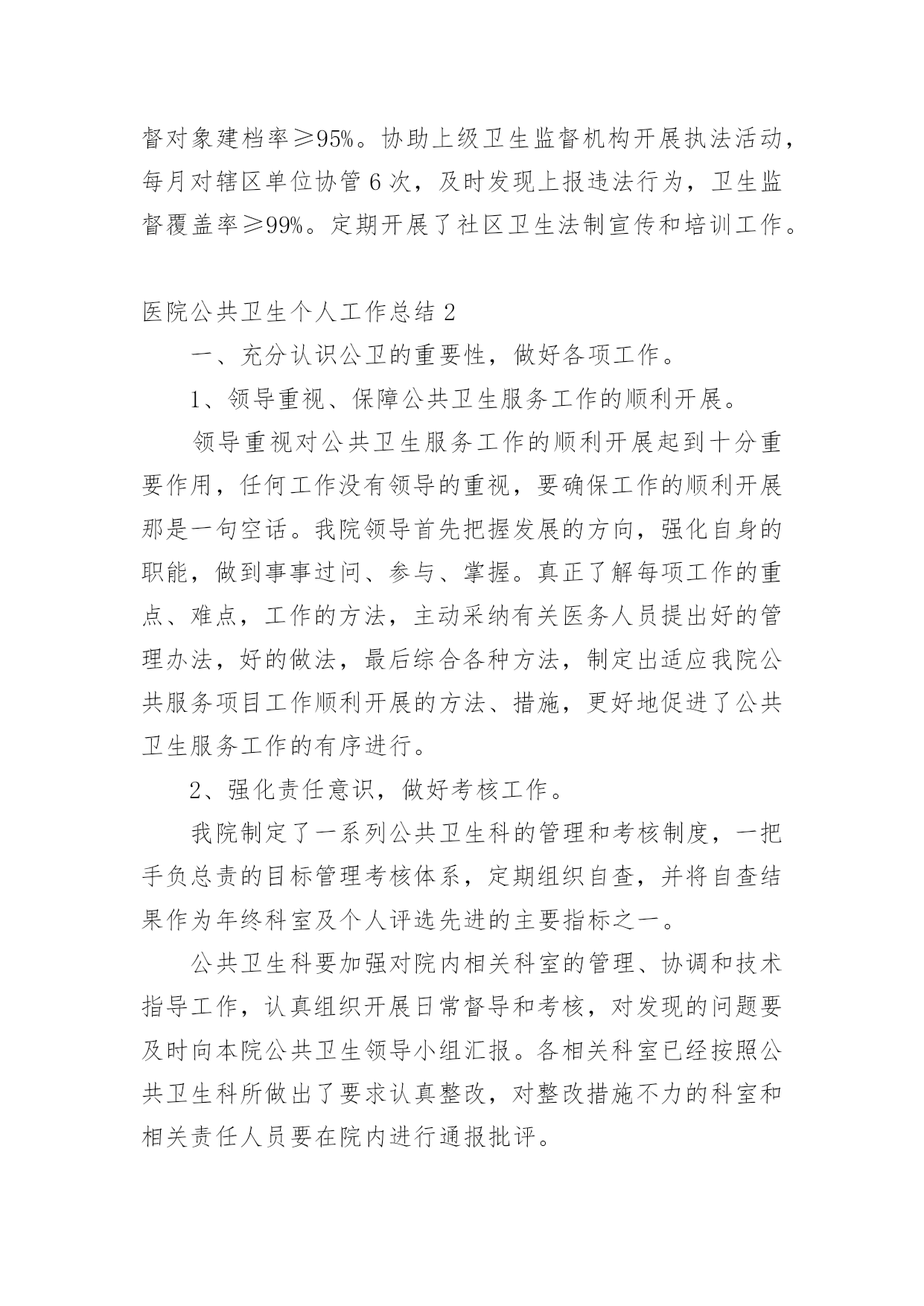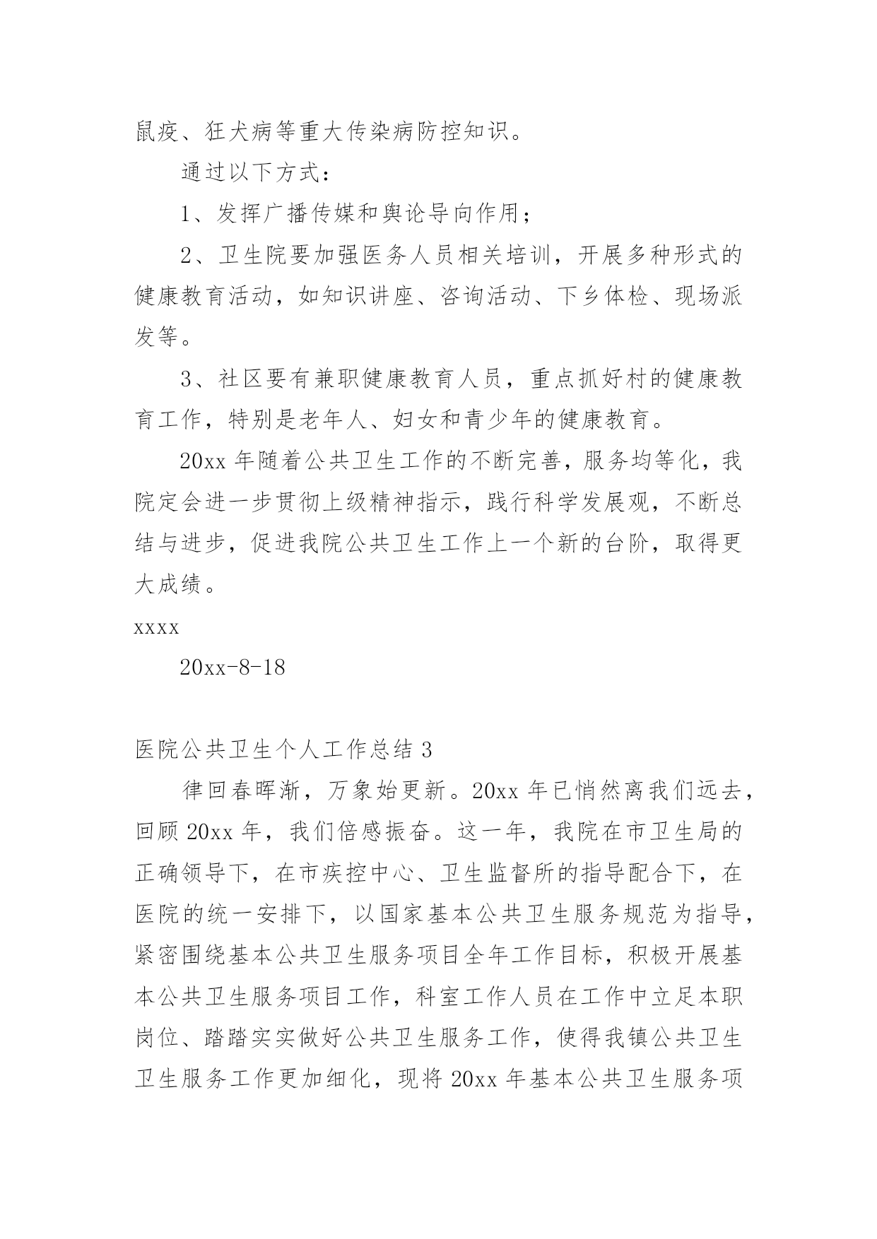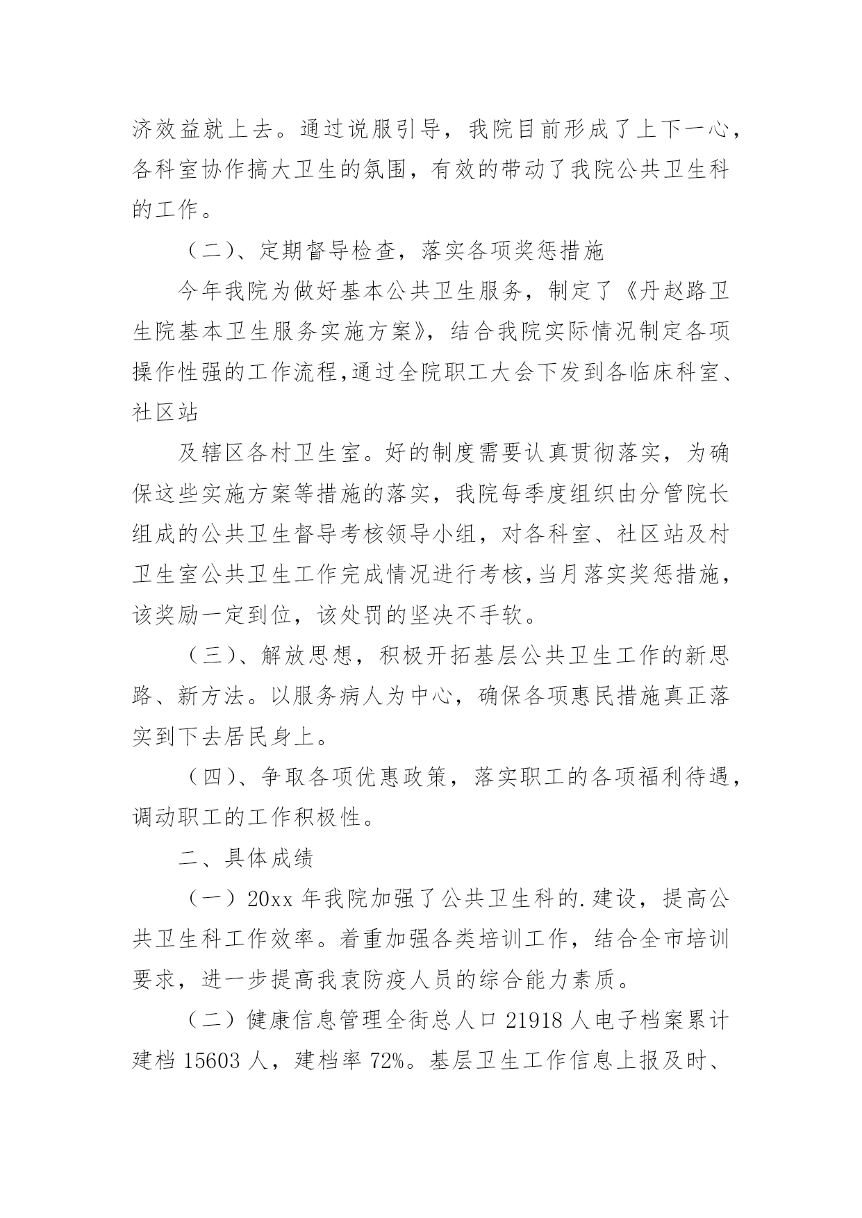 医院公共卫生个人工作总结总结在一个时期、一个年度、一个阶段对学习和工作生活等情况加以回顾和分析的一种书面材料,它可以使我们更有效率,是时候写一份总结了。我们该怎么去写总结呢?以下是小编为大家收集的医院公共卫生个人工作总结,仅供参考,希望能够帮助到大家。医院公共卫生个人工作总结1今年我院公共卫生科在卫生局、市疾控中心指导下,根据卫生局相关文件精神,扎实开展公共卫生服务工作,取得了一些成绩,现将我院20xx年公共卫生科工作总结如下:一、主要做法(一)、统一思想,全院上下参与基本公共卫生服务我院针对其他业务科室认为公共卫生工作就是公共卫生科一个科室的错误认识,在全院职工、科室主任会议上不断引导其他科室同志,让他们意识到公共卫生工作是全院工作,是在院每个职工的共同工作。如果公共卫生工作不上去,其他工作做的再好,医院的整体形象依然上不去,在辖区群众的接受认可我们医院的程度也不会很高。相反公共卫生科通过各种免费的基本公共卫生服务,如免费为育龄妇女增补叶酸、住院分娩补助及一类疫苗免费接种等宣传活动给卫生院带来巨大社会效益,使医院整体形象上去了,辖区居民相信我们医院医院是为他们解决实际问题,自然来就诊就多了,经济效益就上去。通过说服引导,我院目前形成了上下一心,各科室协作搞大卫生的氛围,有效的带动了我院公共卫生科的工作。(二)、定期督导检查,落实各项奖惩措施今年我院为做好基本公共卫生服务,制定了《丹赵路卫生院基本卫生服务实施方案》,结合我院实际情况制定各项操作性强的工作流程,通过全院职工大会下发到各临床科室、社区站及辖区各村卫生室。好的制度需要认真贯彻落实,为确保这些实施方案等措施的落实,我院每季度组织由分管院长组成的公共卫生督导考核领导小组,对各科室、社区站及村卫生室公共卫生工作完成情况进行考核,当月落实奖惩措施,该奖励一定到位,该处罚的坚决不手软。(三)、解放思想,积极开拓基层公共卫生工作的新思路、新方法。以服务病人为中心,确保各项惠民措施真正落实到下去居民身上。(四)、争取各项优惠政策,落实职工的各项福利待遇,调动职工的工作积极性。二、具体成绩(一)20xx年我院加强了公共卫生科的.建设,提高公共卫生科工作效率。着重加强各类培训工作,结合全市培训要求,进一步提高我袁防疫人员的综合能力素质。(二)健康信息管理全街总人口21918人电子档案累计建档15603人,建档率72%。基层卫生工作信息上报及时、准确。(三)传染病的防制1、20xx年我院共报告和管理辖区传染病28例,传染病疫情报告及时、准确,无漏报、无迟报、无谎报现象。2、突发公共卫生应急工作做好突发公共卫生事件应急处理物资储备,并设置专用储藏室。制定突发公共卫生事件应急处理演练计划与方案,认真落实做好5个“一”工程。20xx年无突发公共卫生应急事件发生。3、结核病防治加强结核病人归口管理工作,做好结核病人发现、管理工作,20xx年管理督导结核病人29人(其中在村卫生室管理督导16人),管理督导其按时服药,服药率≥90%,病人转阴率达90%。做好结核全民防治健康教育工作,病人宣传覆盖率达100%。(四)计划免疫掌握辖区内0—15岁儿童的本底资料,加强流动人口及儿童的同步调查,进行流动儿童的动态管理。加强免疫接种各项指标均达98%以上。进一步搞好入托、入园、入学接种证检查,验证率达100%。20xx年全年适龄儿童计划免疫建证、簿79人,完成接种7782针/剂次。(五)慢病管理20xx年慢病管理实现“关口前移”至村卫生室。在卫生院及村卫生室开展高血压、糖尿病人群筛查,18岁以上人群首诊测血压率≥85%;进行就诊病人登记、建档。目前,现管理高血压病病人839人,糖尿病病人201人,精神病病人97人,并按要求开展慢病患者定期随访。(六)健康教育加强健康教育网络的建设,逐步建立和完善健康教育网络,发挥医院各科室能力拓展学校、幼儿园、各村(队)开展健康宣传,积极争取各单位(村)的支持,大力开展健康教育,并形成健康教育网络,宣传健康教育,强化卫生知识。围绕重点疾病,开展医院健康教育园地。利用卫生节日开展宣传教育,开展艾滋病、结核病、高血压病,糖尿病为重点的宣传工作。全年举各类知识讲座12次,开展各类宣传咨询活动8次,发放各类宣传材料8500余份,健康教育宣传栏全年更换12次。(七)妇幼保健加强提高妇女保健工作人员的素质培训,不断改进和创新服务方式和模式,使我街广大妇女儿童得到充分的健康和高质的服务。1、妇保工作。认真做好早期(孕3个月以前)孕妇建册,做好产前检查。切实加强高危妊娠的管理,严格筛查及孕妇HIV检查工作,落实高危妊娠的转诊制度,保障母婴安全。开展“母婴安全”活动,提高孕妇在孕期的自我保护意识,建立孕产妇一条龙服务,做好优生优育知识的宣传工作。2、增补叶酸预防神经管缺陷及农村孕妇住院分