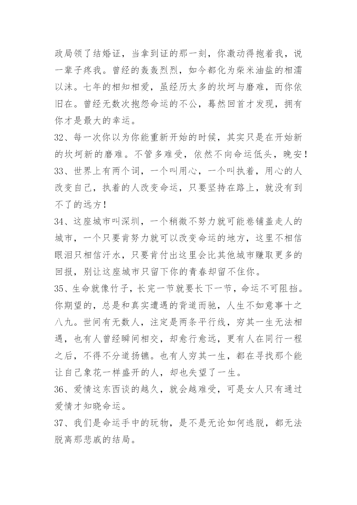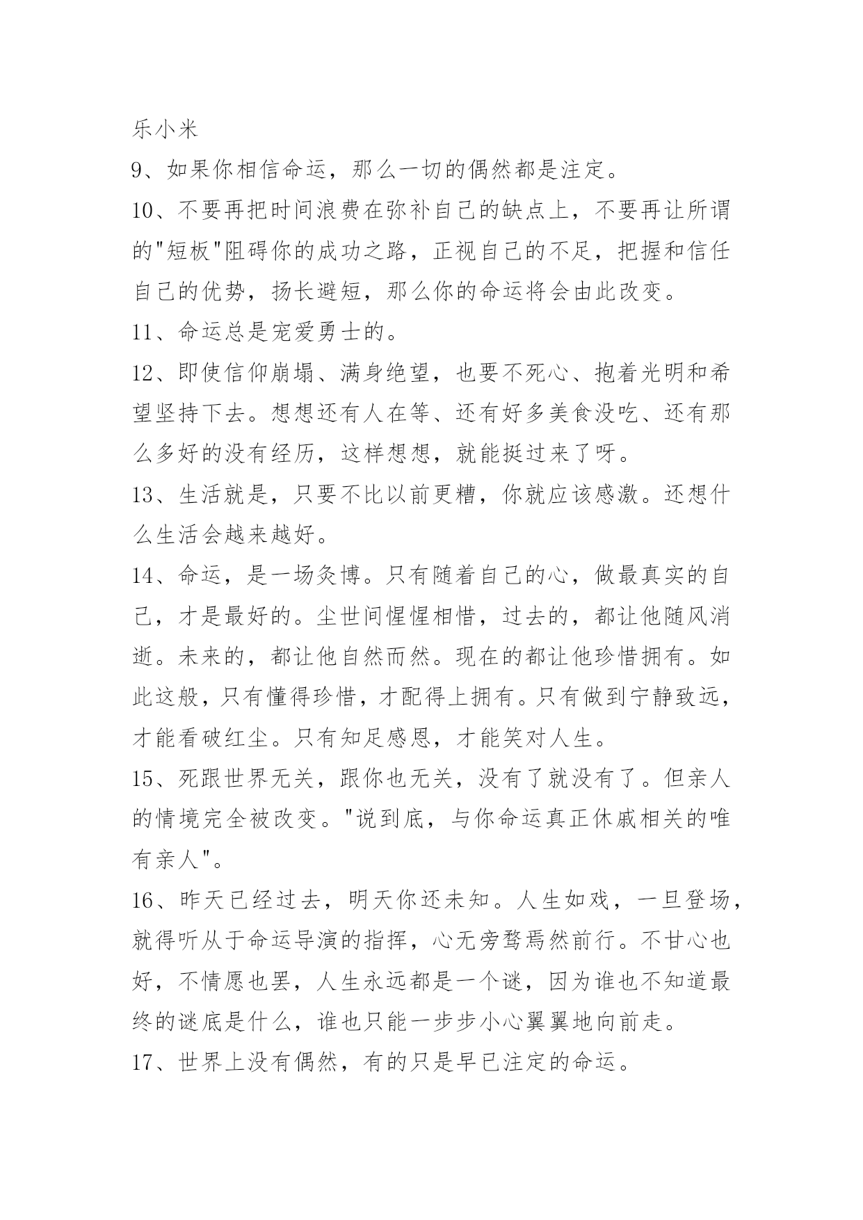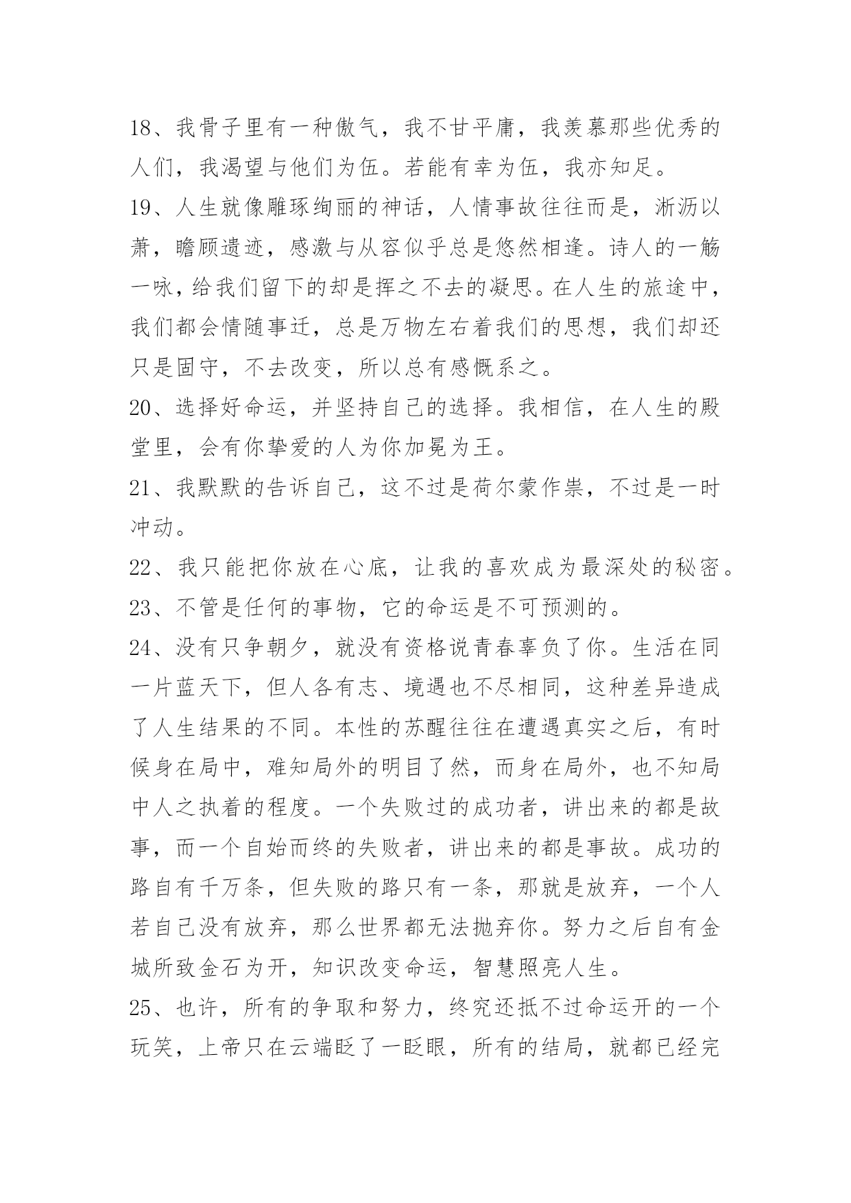 命运朋友圈心语文案命运朋友圈心语文案(精选60句)都像一根一根细小的针,若有似无的,扎在我心上。本篇文章是小编为大家推荐的命运朋友圈心语文案,欢迎大家分享借鉴。1、不要和命运谈条件,更不需要去埋怨命运没有如我们所愿,命运没有义务无条件地给我们想要的一切,只能是我们自己勤奋努力,然后才能从命运那里得到我们应该得到的。2、他们的青春,太悲,太伤,太无奈。是天意,是命运,抑或是人意使然?悲伤,也许是他们青春的主旋律。仿佛唯有悲,才能演驿他们张扬无悔的青春。也许,我是羡慕他们的。3、每个人的命运都是公平的,只不儒家有的人先苦后乐,有的人先乐后苦,人生的机会也是均等的,即使含着金汤匙出生的人,如果不肯勤劳努力,嘴里的金汤匙也终究要失落。4、命运是在自己手中,信就有,不信就没有。5、在对付男人这方面,全天下的女人都是同行。6、我认为,每个人都有一个觉醒期,但觉醒的早晚决定个人的命运。——路遥7、长大了之后总会学不一样的功课,走不一样的路,遇见不一样的人,我们根本避免不了分道而行的命运。——九夜茴8、命运的轮盘上,零散着我们各自不知未来的命运。——乐小米9、如果你相信命运,那么一切的偶然都是注定。10、不要再把时间浪费在弥补自己的缺点上,不要再让所谓的"短板"阻碍你的成功之路,正视自己的不足,把握和信任自己的优势,扬长避短,那么你的命运将会由此改变。11、命运总是宠爱勇士的。12、即使信仰崩塌、满身绝望,也要不死心、抱着光明和希望坚持下去。想想还有人在等、还有好多美食没吃、还有那么多好的没有经历,这样想想,就能挺过来了呀。13、生活就是,只要不比以前更糟,你就应该感激。还想什么生活会越来越好。14、命运,是一场灸博。只有随着自己的心,做最真实的自己,才是最好的。尘世间惺惺相惜,过去的,都让他随风消逝。未来的,都让他自然而然。现在的都让他珍惜拥有。如此这般,只有懂得珍惜,才配得上拥有。只有做到宁静致远,才能看破红尘。只有知足感恩,才能笑对人生。15、死跟世界无关,跟你也无关,没有了就没有了。但亲人的情境完全被改变。"说到底,与你命运真正休戚相关的唯有亲人"。16、昨天已经过去,明天你还未知。人生如戏,一旦登场,就得听从于命运导演的指挥,心无旁骛焉然前行。不甘心也好,不情愿也罢,人生永远都是一个谜,因为谁也不知道最终的谜底是什么,谁也只能一步步小心翼翼地向前走。17、世界上没有偶然,有的只是早已注定的命运。18、我骨子里有一种傲气,我不甘平庸,我羡慕那些优秀的人们,我渴望与他们为伍。若能有幸为伍,我亦知足。19、人生就像雕琢绚丽的神话,人情事故往往而是,淅沥以萧,瞻顾遗迹,感激与从容似乎总是悠然相逢。诗人的一觞一咏,给我们留下的却是挥之不去的凝思。在人生的旅途中,我们都会情随事迁,总是万物左右着我们的思想,我们却还只是固守,不去改变,所以总有感慨系之。20、选择好命运,并坚持自己的选择。我相信,在人生的殿堂里,会有你挚爱的人为你加冕为王。21、我默默的告诉自己,这不过是荷尔蒙作祟,不过是一时冲动。22、我只能把你放在心底,让我的喜欢成为最深处的秘密。23、不管是任何的事物,它的命运是不可预测的。24、没有只争朝夕,就没有资格说青春辜负了你。生活在同一片蓝天下,但人各有志、境遇也不尽相同,这种差异造成了人生结果的不同。本性的苏醒往往在遭遇真实之后,有时候身在局中,难知局外的明目了然,而身在局外,也不知局中人之执着的程度。一个失败过的成功者,讲出来的都是故事,而一个自始而终的失败者,讲出来的都是事故。成功的路自有千万条,但失败的路只有一条,那就是放弃,一个人若自己没有放弃,那么世界都无法抛弃你。努力之后自有金城所致金石为开,知识改变命运,智慧照亮人生。25、也许,所有的争取和努力,终究还抵不过命运开的一个玩笑,上帝只在云端眨了一眨眼,所有的结局,就都已经完全改变。26、有些故事的结局,我们不服气,不认输,虽然知道再努力也无法改写,但是那种倔强的心是最后的抵抗和态度。我们各自扮演着特别的角色,有人喜欢,也有人厌恨,无法左右别人的思想,却可以靠自己,改变未来的命运。27、我总是通过自身的努力改变命运对我的牵绊。可是命运总是束缚着我的内心,拷问着我的灵魂,最后,我只能在命运的注视下默默顺从。28、最近一段时间,都会讲一些漂亮的人,漂亮的女人,漂亮的男人,命运真的差别极大,但漂亮的人大部分也比较坎坷,不知道为什么?我心里希望这些漂亮的人儿能过得很圆满,但评价的标准终有所不同,有时候会不自觉带入主观评价,自我检讨。有些人只讲感情,因为她自己也把感情看过天。其实吧,什么是成功或幸福的人生,大概是达到这个人她自己内心的标准就可以了。29、女人一旦心定,即使身处飓风中心也心神不慌,即使背临深渊也能面不改色,就算遭遇再糟糕的事件也安之若素。人生走到关键处,清除情