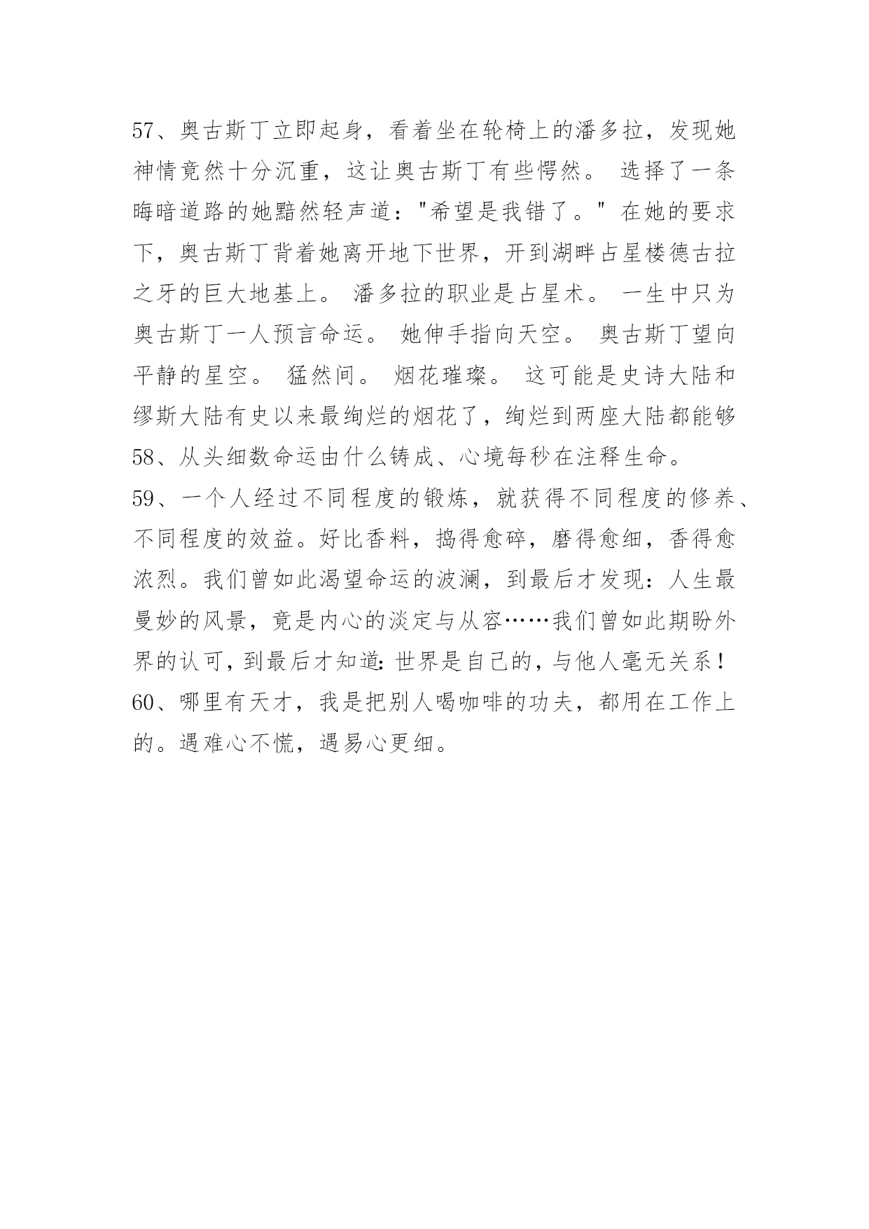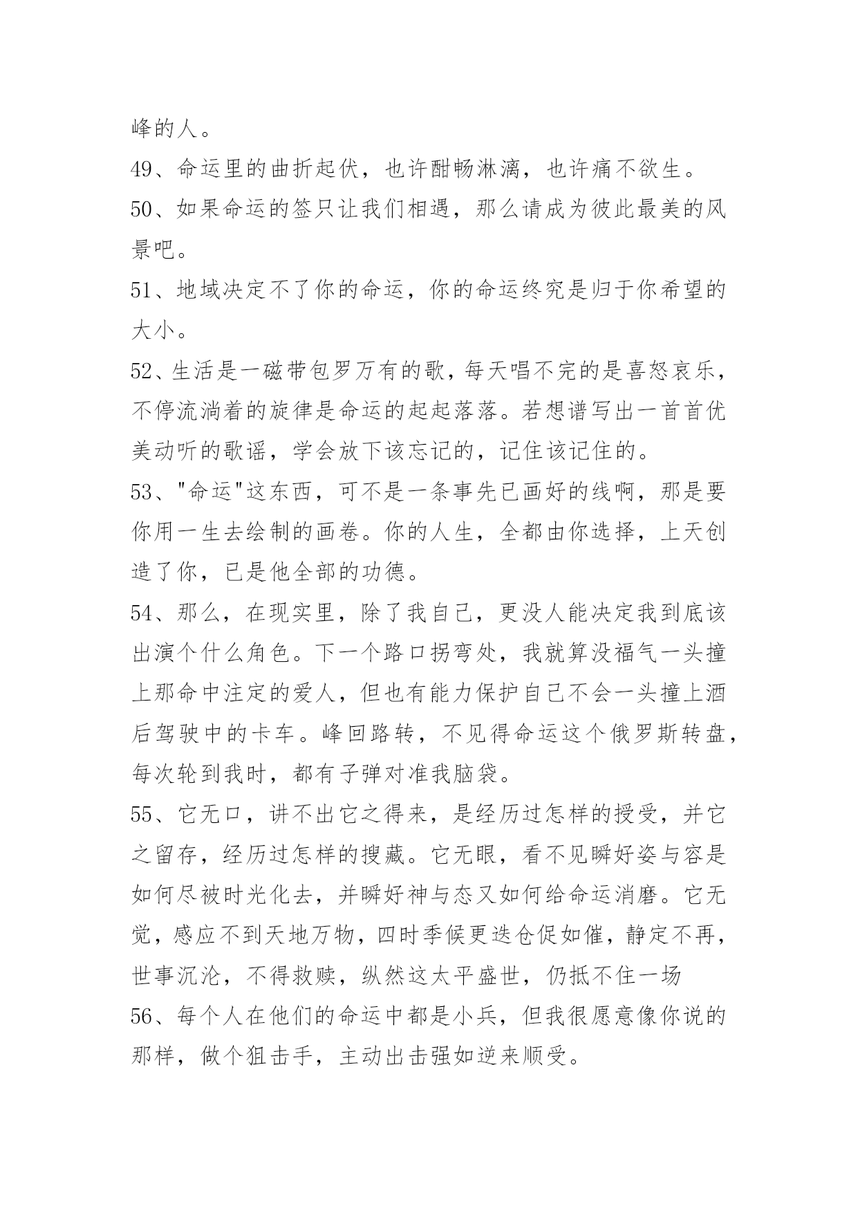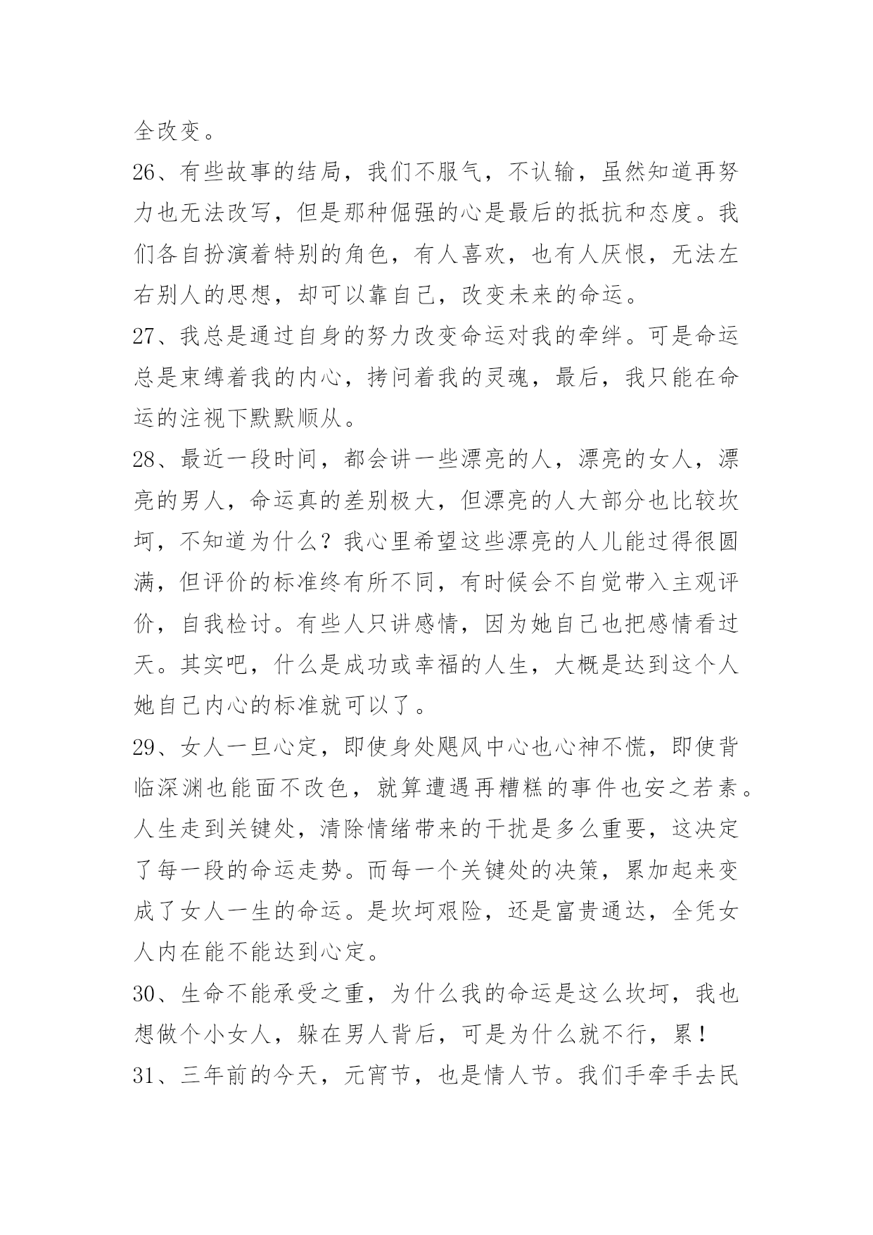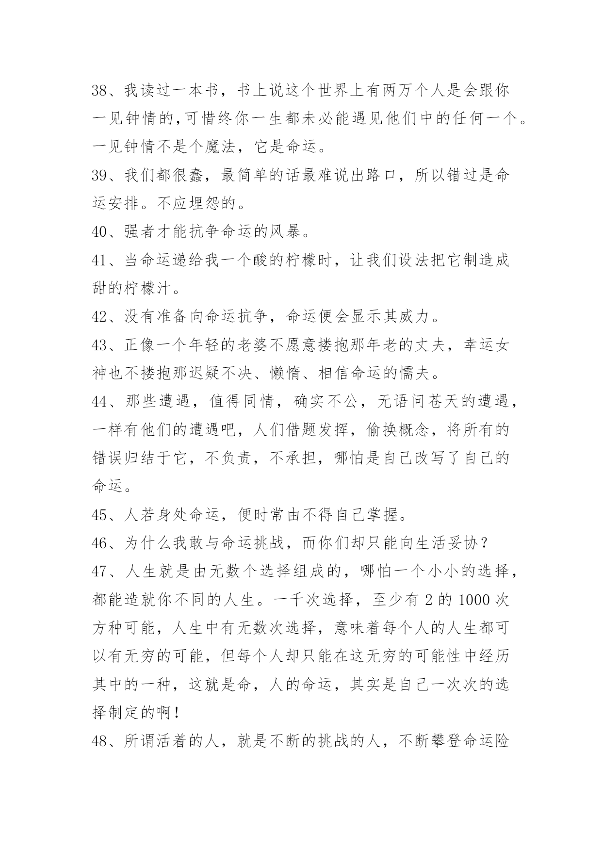 命运朋友圈心语文案命运朋友圈心语文案(精选60句)都像一根一根细小的针,若有似无的,扎在我心上。本篇文章是小编为大家推荐的命运朋友圈心语文案,欢迎大家分享借鉴。1、不要和命运谈条件,更不需要去埋怨命运没有如我们所愿,命运没有义务无条件地给我们想要的一切,只能是我们自己勤奋努力,然后才能从命运那里得到我们应该得到的。2、他们的青春,太悲,太伤,太无奈。是天意,是命运,抑或是人意使然?悲伤,也许是他们青春的主旋律。仿佛唯有悲,才能演驿他们张扬无悔的青春。也许,我是羡慕他们的。3、每个人的命运都是公平的,只不儒家有的人先苦后乐,有的人先乐后苦,人生的机会也是均等的,即使含着金汤匙出生的人,如果不肯勤劳努力,嘴里的金汤匙也终究要失落。4、命运是在自己手中,信就有,不信就没有。5、在对付男人这方面,全天下的女人都是同行。6、我认为,每个人都有一个觉醒期,但觉醒的早晚决定个人的命运。——路遥7、长大了之后总会学不一样的功课,走不一样的路,遇见不一样的人,我们根本避免不了分道而行的命运。——九夜茴8、命运的轮盘上,零散着我们各自不知未来的命运。——乐小米9、如果你相信命运,那么一切的偶然都是注定。10、不要再把时间浪费在弥补自己的缺点上,不要再让所谓的"短板"阻碍你的成功之路,正视自己的不足,把握和信任自己的优势,扬长避短,那么你的命运将会由此改变。11、命运总是宠爱勇士的。12、即使信仰崩塌、满身绝望,也要不死心、抱着光明和希望坚持下去。想想还有人在等、还有好多美食没吃、还有那么多好的没有经历,这样想想,就能挺过来了呀。13、生活就是,只要不比以前更糟,你就应该感激。还想什么生活会越来越好。14、命运,是一场灸博。只有随着自己的心,做最真实的自己,才是最好的。尘世间惺惺相惜,过去的,都让他随风消逝。未来的,都让他自然而然。现在的都让他珍惜拥有。如此这般,只有懂得珍惜,才配得上拥有。只有做到宁静致远,才能看破红尘。只有知足感恩,才能笑对人生。15、死跟世界无关,跟你也无关,没有了就没有了。但亲人的情境完全被改变。"说到底,与你命运真正休戚相关的唯有亲人"。16、昨天已经过去,明天你还未知。人生如戏,一旦登场,就得听从于命运导演的指挥,心无旁骛焉然前行。不甘心也好,不情愿也罢,人生永远都是一个谜,因为谁也不知道最终的谜底是什么,谁也只能一步步小心翼翼地向前走。17、世界上没有偶然,有的只是早已注定的命运。18、我骨子里有一种傲气,我不甘平庸,我羡慕那些优秀的人们,我渴望与他们为伍。若能有幸为伍,我亦知足。19、人生就像雕琢绚丽的神话,人情事故往往而是,淅沥以萧,瞻顾遗迹,感激与从容似乎总是悠然相逢。诗人的一觞一咏,给我们留下的却是挥之不去的凝思。在人生的旅途中,我们都会情随事迁,总是万物左右着我们的思想,我们却还只是固守,不去改变,所以总有感慨系之。20、选择好命运,并坚持自己的选择。我相信,在人生的殿堂里,会有你挚爱的人为你加冕为王。21、我默默的告诉自己,这不过是荷尔蒙作祟,不过是一时冲动。22、我只能把你放在心底,让我的喜欢成为最深处的秘密。23、不管是任何的事物,它的命运是不可预测的。24、没有只争朝夕,就没有资格说青春辜负了你。生活在同一片蓝天下,但人各有志、境遇也不尽相同,这种差异造成了人生结果的不同。本性的苏醒往往在遭遇真实之后,有时候身在局中,难知局外的明目了然,而身在局外,也不知局中人之执着的程度。一个失败过的成功者,讲出来的都是故事,而一个自始而终的失败者,讲出来的都是事故。成功的路自有千万条,但失败的路只有一条,那就是放弃,一个人若自己没有放弃,那么世界都无法抛弃你。努力之后自有金城所致金石为开,知识改变命运,智慧照亮人生。25、也许,所有的争取和努力,终究还抵不过命运开的一个玩笑,上帝只在云端眨了一眨眼,所有的结局,就都已经完全改变。26、有些故事的结局,我们不服气,不认输,虽然知道再努力也无法改写,但是那种倔强的心是最后的抵抗和态度。我们各自扮演着特别的角色,有人喜欢,也有人厌恨,无法左右别人的思想,却可以靠自己,改变未来的命运。27、我总是通过自身的努力改变命运对我的牵绊。可是命运总是束缚着我的内心,拷问着我的灵魂,最后,我只能在命运的注视下默默顺从。28、最近一段时间,都会讲一些漂亮的人,漂亮的女人,漂亮的男人,命运真的差别极大,但漂亮的人大部分也比较坎坷,不知道为什么?我心里希望这些漂亮的人儿能过得很圆满,但评价的标准终有所不同,有时候会不自觉带入主观评价,自我检讨。有些人只讲感情,因为她自己也把感情看过天。其实吧,什么是成功或幸福的人生,大概是达到这个人她自己内心的标准就可以了。29、女人一旦心定,即使身处飓风中心也心神不慌,即使背临深渊也能面不改色,就算遭遇再糟糕的事件也安之若素。人生走到关键处,清除情