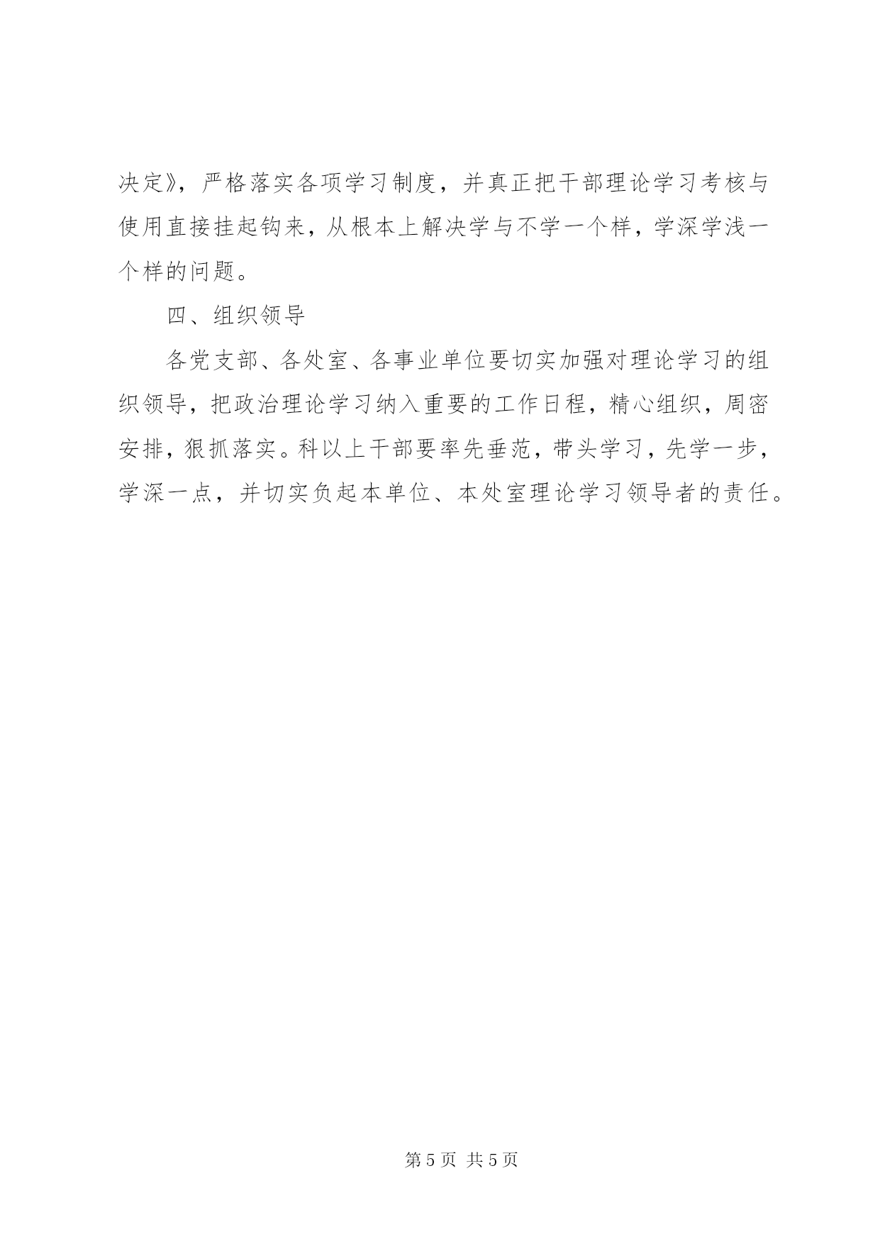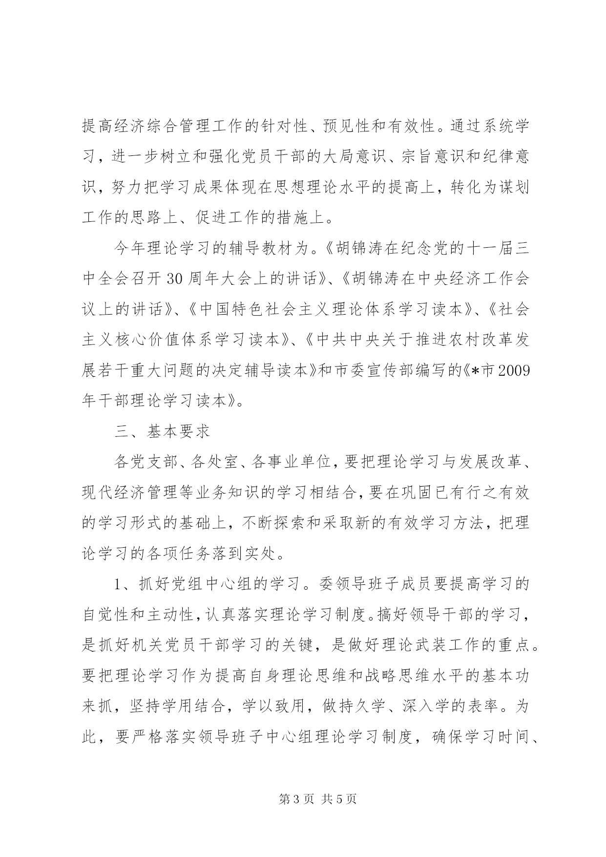 第PAGE\*Arabic\*MERGEFORMAT5页共NUMPAGES\*MERGEFORMAT5页市发改委干部理论学习安排意见机关各党支部、各处室、各事业单位:根据市委宣传部《关于2009年全市干部理论学习的安排意见》(唐宣发[2009]9号)和市直党工委《关于2009年市直机关干部理论学习的安排意见》(市直党工字[2009]2号)的部署要求,结合*市发改委的实际,现将2009年机关党员干部理论学习安排如下:一、指导思想坚持以邓小平理论和“三个代表”重要思想为指导,深入贯彻落实科学发展观,以学习贯彻党的十七大和十七届三中全会精神、省委七届四次全会精神和市委八届五次全会精神为主线,扎实开展“干部作风建设年”活动,用马克思主义最新理论成果武装党员干部的头脑,进一步创新发展理念、创新发展思路、创新发展举措,为科学发展示范区建设,加快转变发展方式和结构调整,保持经济平稳较快发展奠定坚实的思想理论基础,以优异成绩迎接建国60周年。二、主要内容今年干部理论学习,共分六个专题:第一专题。深入学习中国特色社会主义理论体系,用党的最新理论成果武装头脑。第二专题。深入学习贯彻党的十七大和十七届三中全会精神,牢牢把握精神实质,自觉把思想和行动统一到中央部署上来。第三专题。深入学习贯彻省委七届四次全会精神,牢牢把握全省解放思想、推进改革开放的重要战略部署。第四专题。深入学习贯彻市委八届五次会会精神,充分认识和把握建设科学发展示范区和建设人民群众幸福之都的重大意义和战略举措。第五专题。深入学习贯彻落实科学发展观,努力使科学发展观成为解放思想指导实践的行动指南。第六专题。认真学习经济理论和经济知识,提高领导和驾驭发展经济的能力,积极应对当前复杂多变的经济形势。此外,还要学习好胡锦涛同志在中纪委十七届三次全会上的重要讲话精神、中央经济工作会议精神和全国两会精神等内容。在搞理论学习的同时,各处室要紧密结合我委承担的发展改革的各项职能,加强现代经济学等各类业务知识的学习,在业务学习方面,今年重点学习机关编印的三本书:《申报中央投资项目工作手册》、《扩大内需促进经济增长文件汇编》和《中央投资项目稽察管理法律法规政策摘编》。每个干部坚持天天读报,周周读书,每季读一本业务书籍,半年写一份读书报告。通过业务知识的学习,进一步增加现代经济、现代管理等知识储备,进一步提升运用现代经济学工具分析研究解决经济问题的能力,不断提高经济综合管理工作的针对性、预见性和有效性。通过系统学习,进一步树立和强化党员干部的大局意识、宗旨意识和纪律意识,努力把学习成果体现在思想理论水平的提高上,转化为谋划工作的思路上、促进工作的措施上。今年理论学习的辅导教材为。《胡锦涛在纪念党的十一届三中全会召开30周年大会上的讲话》、《胡锦涛在中央经济工作会议上的讲话》、《中国特色社会主义理论体系学习读本》、《社会主义核心价值体系学习读本》、《中共中央关于推进农村改革发展若干重大问题的决定辅导读本》和市委宣传部编写的《*市2009年干部理论学习读本》。三、基本要求各党支部、各处室、各事业单位,要把理论学习与发展改革、现代经济管理等业务知识的学习相结合,要在巩固已有行之有效的学习形式的基础上,不断探索和采取新的有效学习方法,把理论学习的各项任务落到实处。1、抓好党组中心组的学习。委领导班子成员要提高学习的自觉性和主动性,认真落实理论学习制度。搞好领导干部的学习,是抓好机关党员干部学习的关键,是做好理论武装工作的重点。要把理论学习作为提高自身理论思维和战略思维水平的基本功来抓,坚持学用结合,学以致用,做持久学、深入学的表率。为此,要严格落实领导班子中心组理论学习制度,确保学习时间、学习人员和学习内容“三落实”。每年集中学习时间达到12天以上,个人撰写理论学习体会文章2篇以上。2、采取多种形式和方法,增强学习效果。委领导班子成员除按要求参加各级党校的脱产集中培训外,主要采取在职集中学习的方法;科级以下干部,采取集中学习与自学相结合的方法,坚持周四学习日制度,并养成平时自学的习惯,注重日积月累。还要通过举办各种形式的报告会、座谈会、研讨会、读书恳谈会等形式,深化理论学习。一是要紧密结合*市发展改革的实际,结合本处室的职能任务和工作职责,坚持干什么学什么,缺什么补什么,在干中学,在学中干,增强学习的实效性,提高学习效果。二是开展学习交流活动。为加强相互间的交流与勾通,结合专题教育和机关党员干部的思想、工作实际,机关党委将适时组织学习交流活动。三是坚持“一把手”讲党课制度。在理论学习中心组学习的基础上,紧密结合*市经济社会发展的实际,围绕科学发展示范区建设,由委主要领导给机关党员干部作集中辅导。四是邀请专家学者辅导。结合*发展改革和“四点一带”建设的实际,以六个专题教育为重点,邀请专家