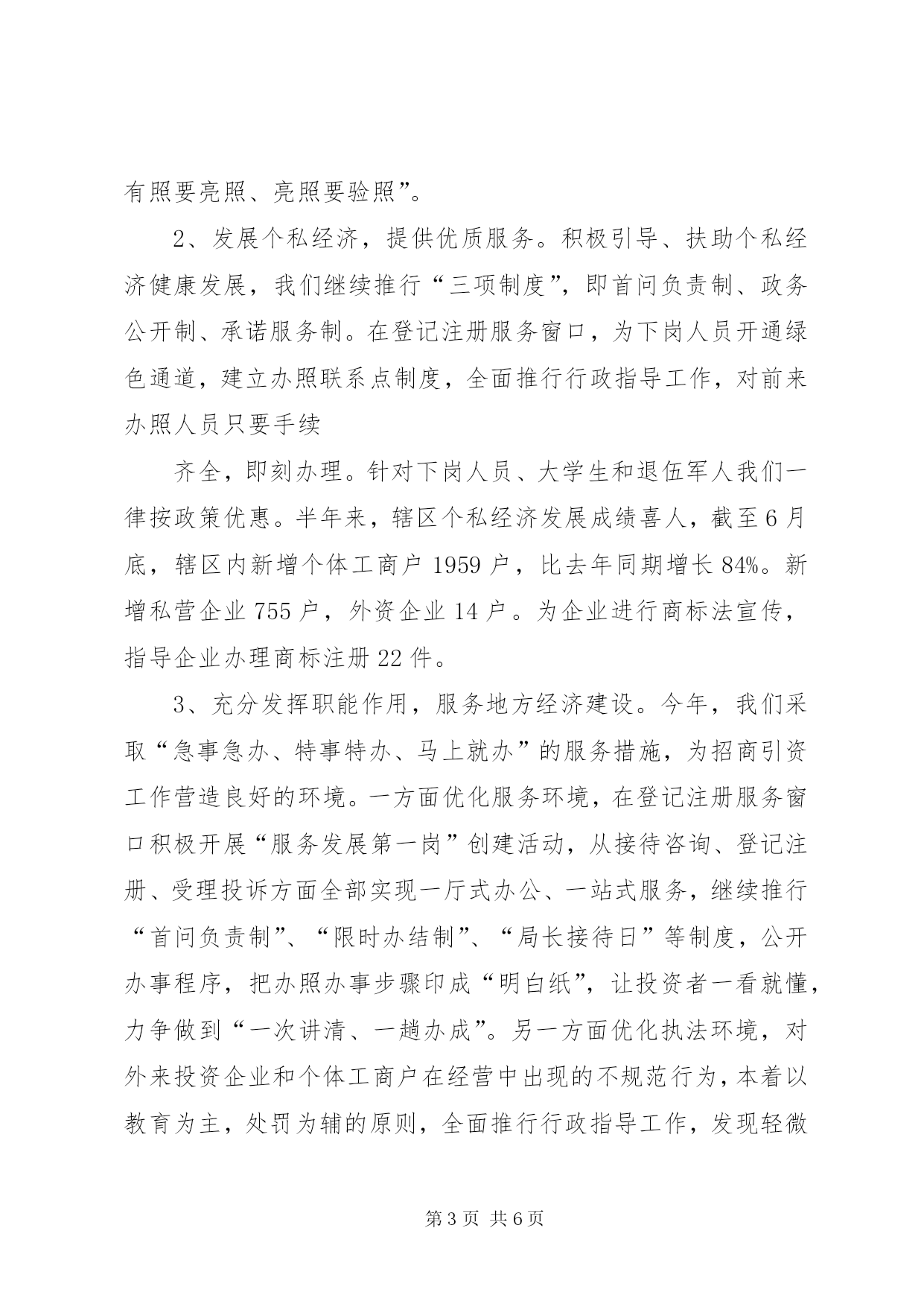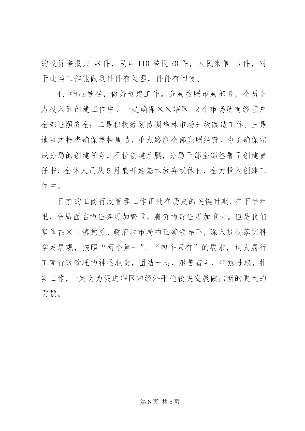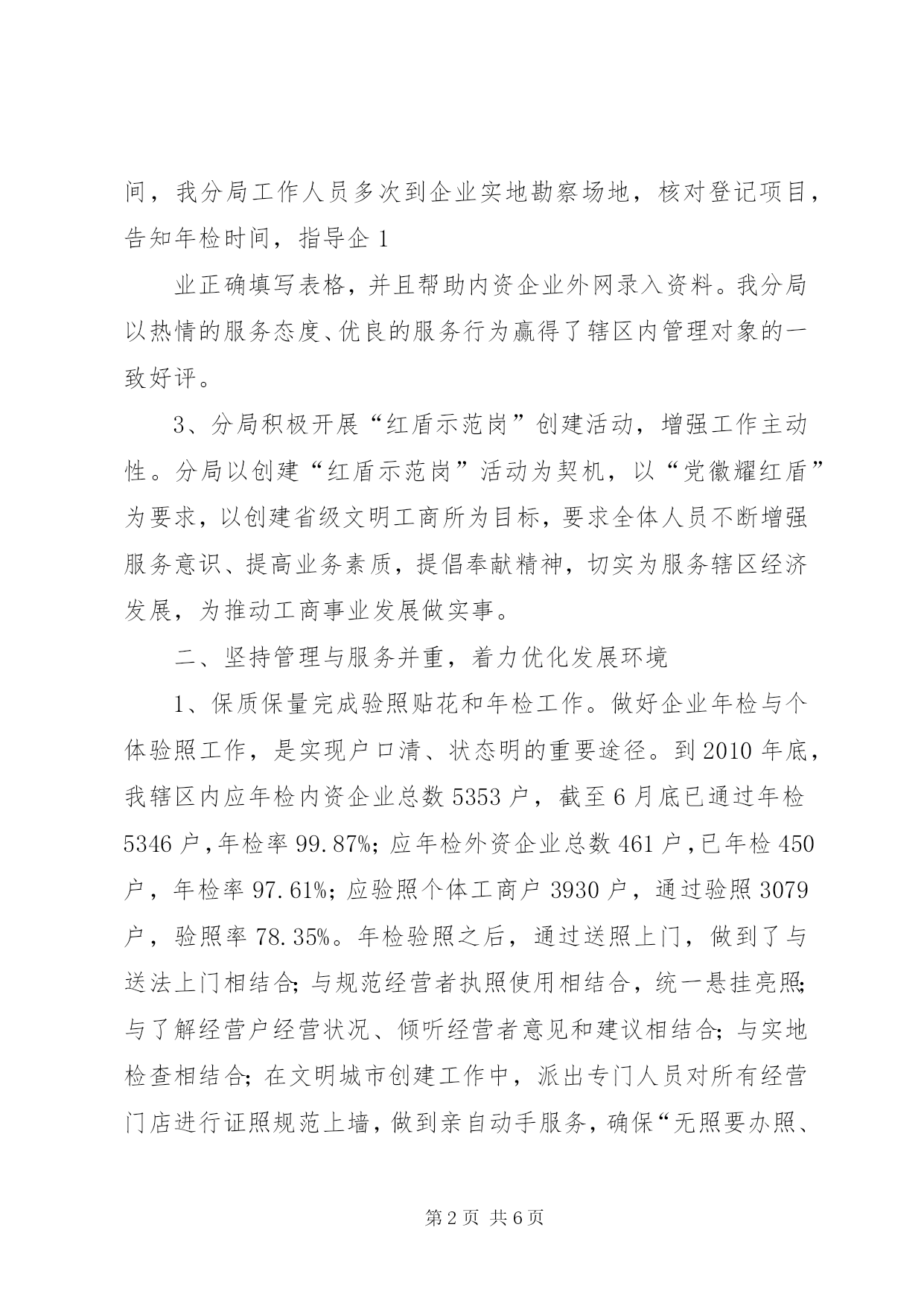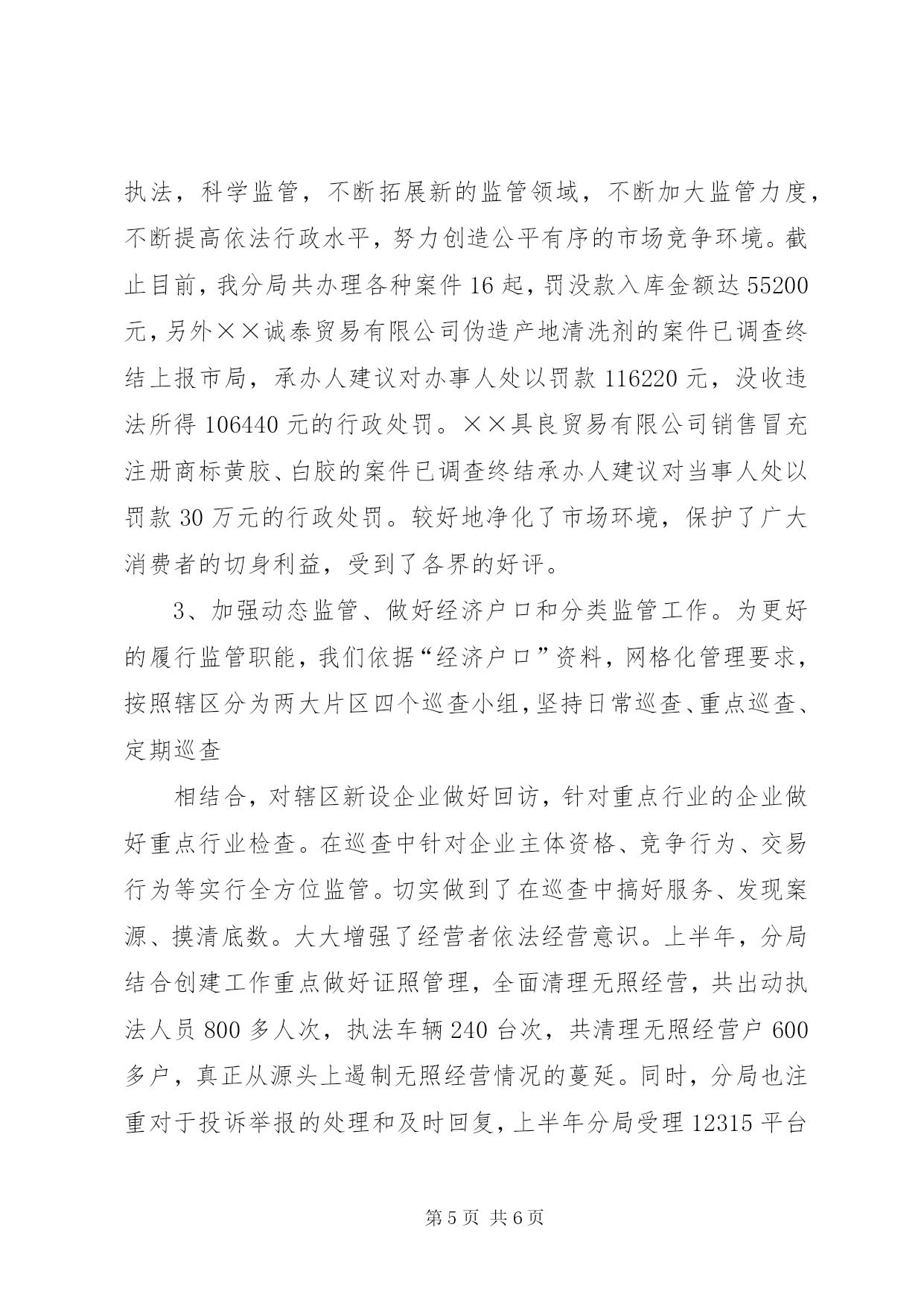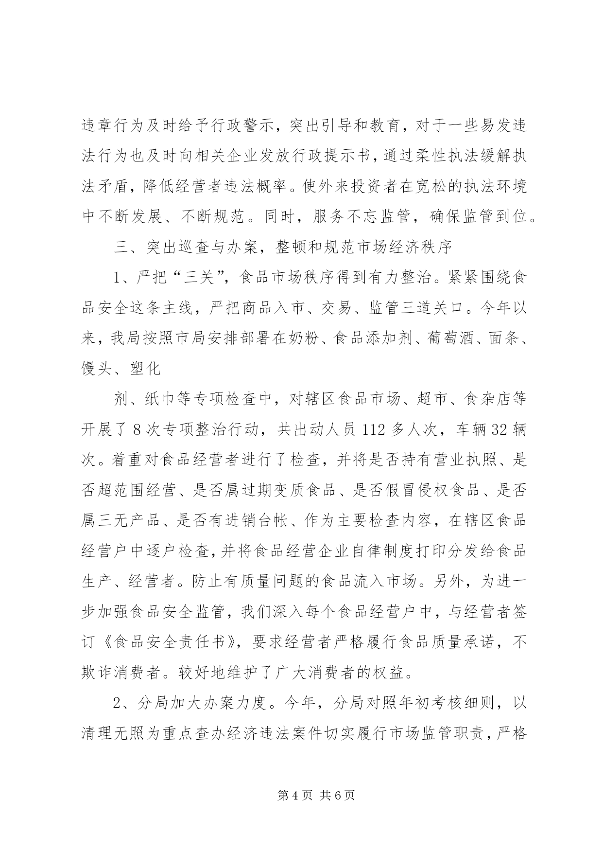 第PAGE\*Arabic\*MERGEFORMAT6页共NUMPAGES\*MERGEFORMAT6页工商分局述职报告××工商分局班子述职报告2011年上半年,××工商分局在市局党组的正确领导下,在××镇党委、政府的大力支持下,在机关相关科室的业务指导下,在全体工作人员的勤奋努力下,立足市场淮入、消费维权、经济户口、市场管理和行政执法五个工作平台,以科学发展观等重要思想为指导,以开展“红盾示范岗”创建活动为契机,以助推经济发展为根本,以依法科学监管为重点,不断强化日常管理,提升队伍素质,把市局党组、××镇党委和政府上半年部署的各项任务基本落实到位。现将具体情况报告如下:一、加强理论和业务学习、工作效率进一步提高1、继续加强法律法规学习和业务基础知识学习,提高业务水平。分局每个人根据自己的工作范围制定学习方案并坚持“一月一法”学习。通过学习和岗位练兵活动出现了“三多三少”现象,即:遇到案件查法律条文的少了,张口说出法律法规的多了;外来办事人员排队等待的少了,当场办结的多了;工作人员坐下闲聊的少了,讨论法律学习业务的多了。无论是各项登记业务还是办案水平都得到进一步提高。2、充分发挥登记职能,扶持企业进一步发展状大。工作中严格执行首问责任制、ab角制、“一口清、一口准”工作制、即时办结制。只要企业需要,随到随办,即时办结。今年年检期间,我分局工作人员多次到企业实地勘察场地,核对登记项目,告知年检时间,指导企1业正确填写表格,并且帮助内资企业外网录入资料。我分局以热情的服务态度、优良的服务行为赢得了辖区内管理对象的一致好评。3、分局积极开展“红盾示范岗”创建活动,增强工作主动性。分局以创建“红盾示范岗”活动为契机,以“党徽耀红盾”为要求,以创建省级文明工商所为目标,要求全体人员不断增强服务意识、提高业务素质,提倡奉献精神,切实为服务辖区经济发展,为推动工商事业发展做实事。二、坚持管理与服务并重,着力优化发展环境1、保质保量完成验照贴花和年检工作。做好企业年检与个体验照工作,是实现户口清、状态明的重要途径。到2010年底,我辖区内应年检内资企业总数5353户,截至6月底已通过年检5346户,年检率99.87%;应年检外资企业总数461户,已年检450户,年检率97.61%;应验照个体工商户3930户,通过验照3079户,验照率78.35%。年检验照之后,通过送照上门,做到了与送法上门相结合;与规范经营者执照使用相结合,统一悬挂亮照;与了解经营户经营状况、倾听经营者意见和建议相结合;与实地检查相结合;在文明城市创建工作中,派出专门人员对所有经营门店进行证照规范上墙,做到亲自动手服务,确保“无照要办照、有照要亮照、亮照要验照”。2、发展个私经济,提供优质服务。积极引导、扶助个私经济健康发展,我们继续推行“三项制度”,即首问负责制、政务公开制、承诺服务制。在登记注册服务窗口,为下岗人员开通绿色通道,建立办照联系点制度,全面推行行政指导工作,对前来办照人员只要手续齐全,即刻办理。针对下岗人员、大学生和退伍军人我们一律按政策优惠。半年来,辖区个私经济发展成绩喜人,截至6月底,辖区内新增个体工商户1959户,比去年同期增长84%。新增私营企业755户,外资企业14户。为企业进行商标法宣传,指导企业办理商标注册22件。3、充分发挥职能作用,服务地方经济建设。今年,我们采取“急事急办、特事特办、马上就办”的服务措施,为招商引资工作营造良好的环境。一方面优化服务环境,在登记注册服务窗口积极开展“服务发展第一岗”创建活动,从接待咨询、登记注册、受理投诉方面全部实现一厅式办公、一站式服务,继续推行“首问负责制”、“限时办结制”、“局长接待日”等制度,公开办事程序,把办照办事步骤印成“明白纸”,让投资者一看就懂,力争做到“一次讲清、一趟办成”。另一方面优化执法环境,对外来投资企业和个体工商户在经营中出现的不规范行为,本着以教育为主,处罚为辅的原则,全面推行行政指导工作,发现轻微违章行为及时给予行政警示,突出引导和教育,对于一些易发违法行为也及时向相关企业发放行政提示书,通过柔性执法缓解执法矛盾,降低经营者违法概率。使外来投资者在宽松的执法环境中不断发展、不断规范。同时,服务不忘监管,确保监管到位。三、突出巡查与办案,整顿和规范市场经济秩序1、严把“三关”,食品市场秩序得到有力整治。紧紧围绕食品安全这条主线,严把商品入市、交易、监管三道关口。今年以来,我局按照市局安排部署在奶粉、食品添加剂、葡萄酒、面条、馒头、塑化剂、纸巾等专项检查中,对辖区食品市场、超市、食杂店等开展了8次专项整治行动,共出动人员112多人次,车辆32辆次。着重对食品经营者进行了检查,并将是否持有营业执照、是否超范围经营、是否属过期变质食品、是否假冒侵权食品、是否属