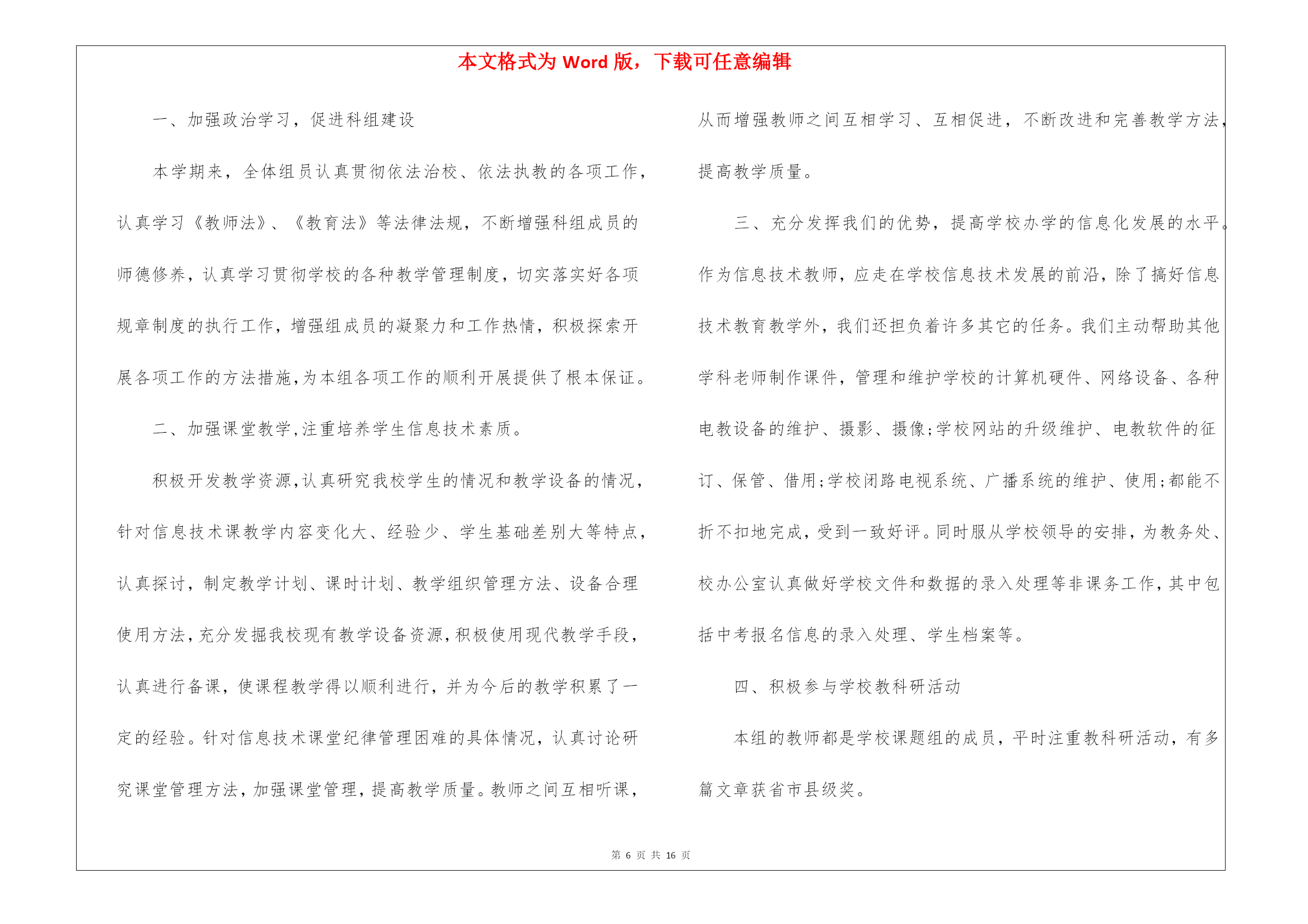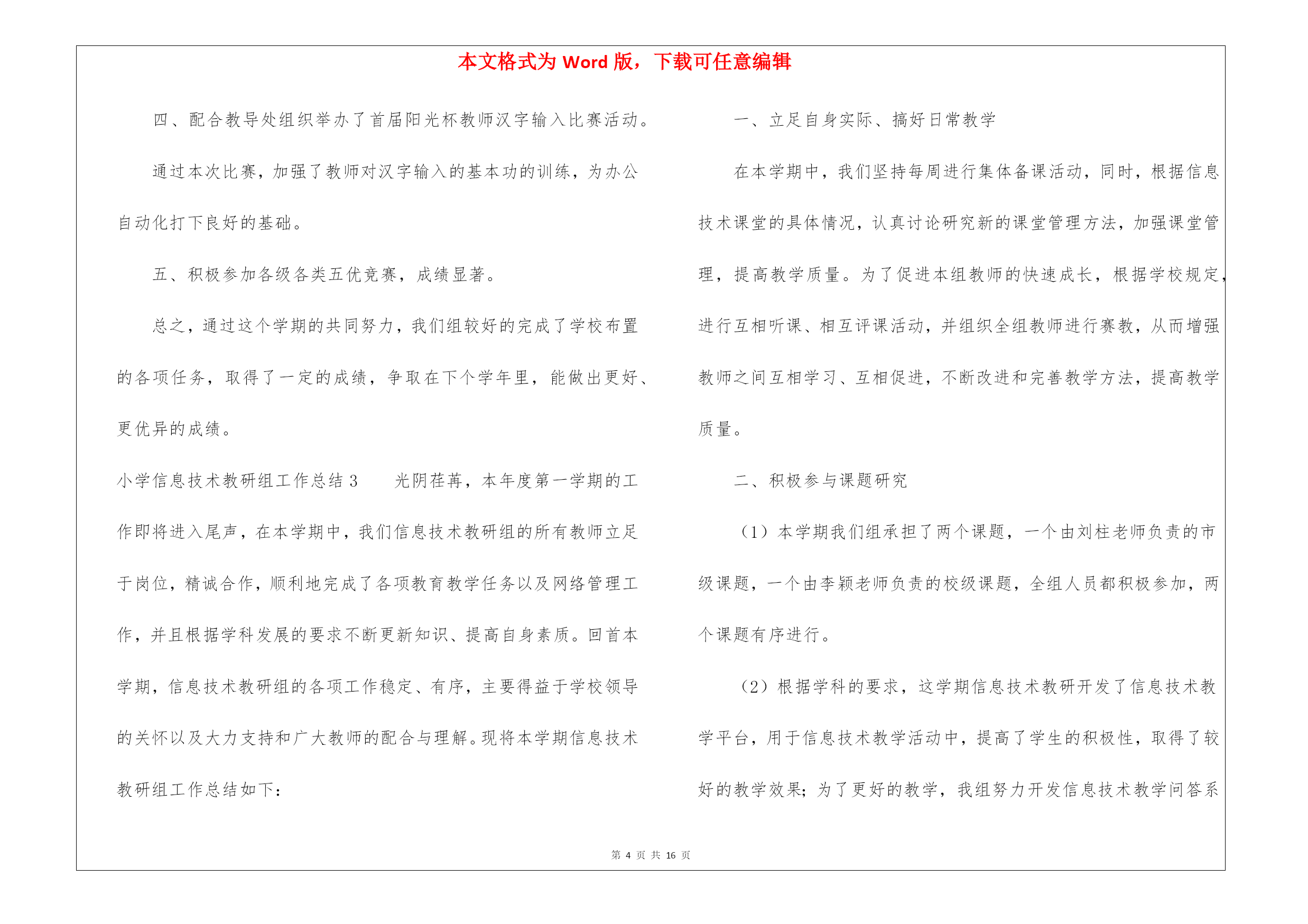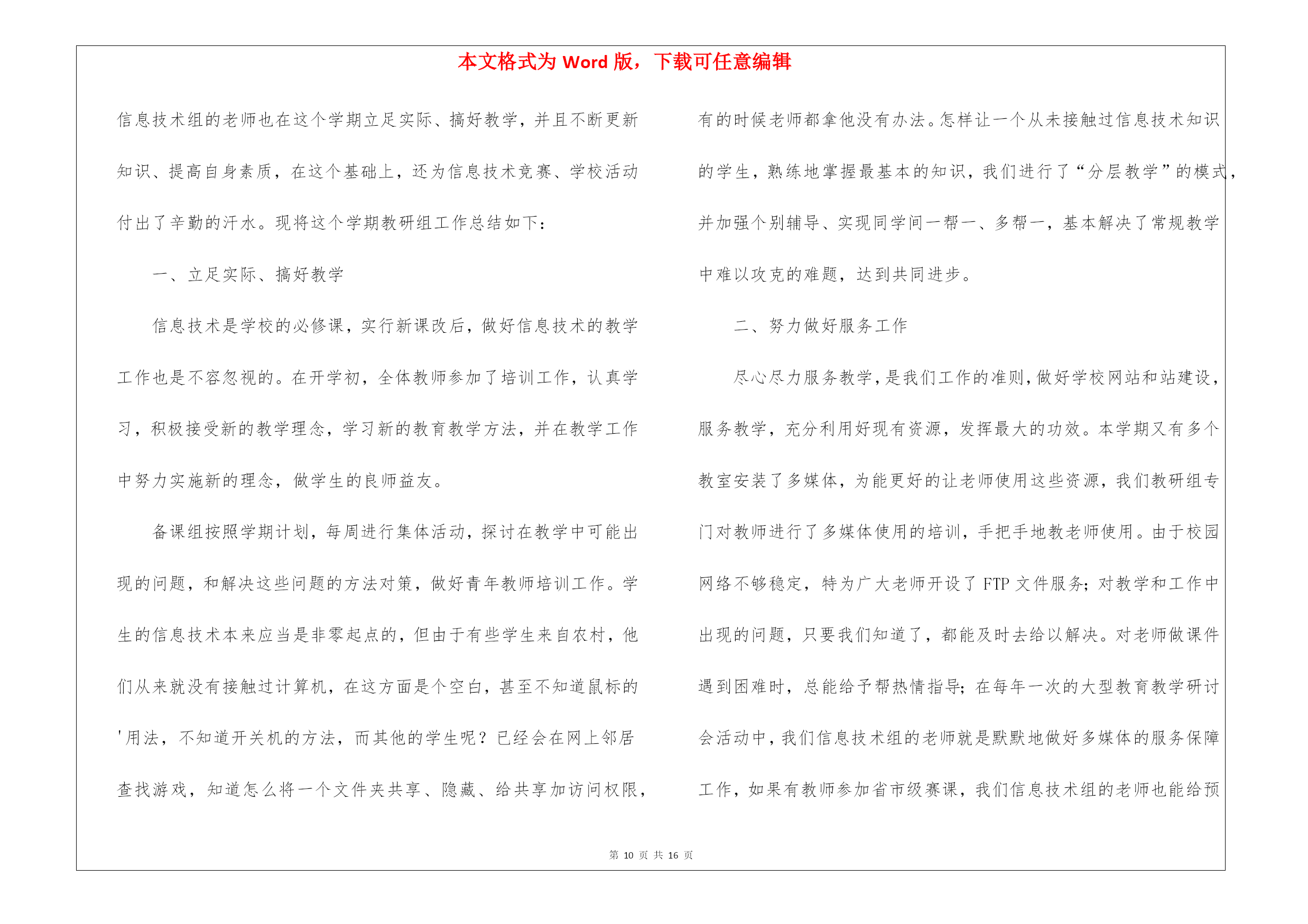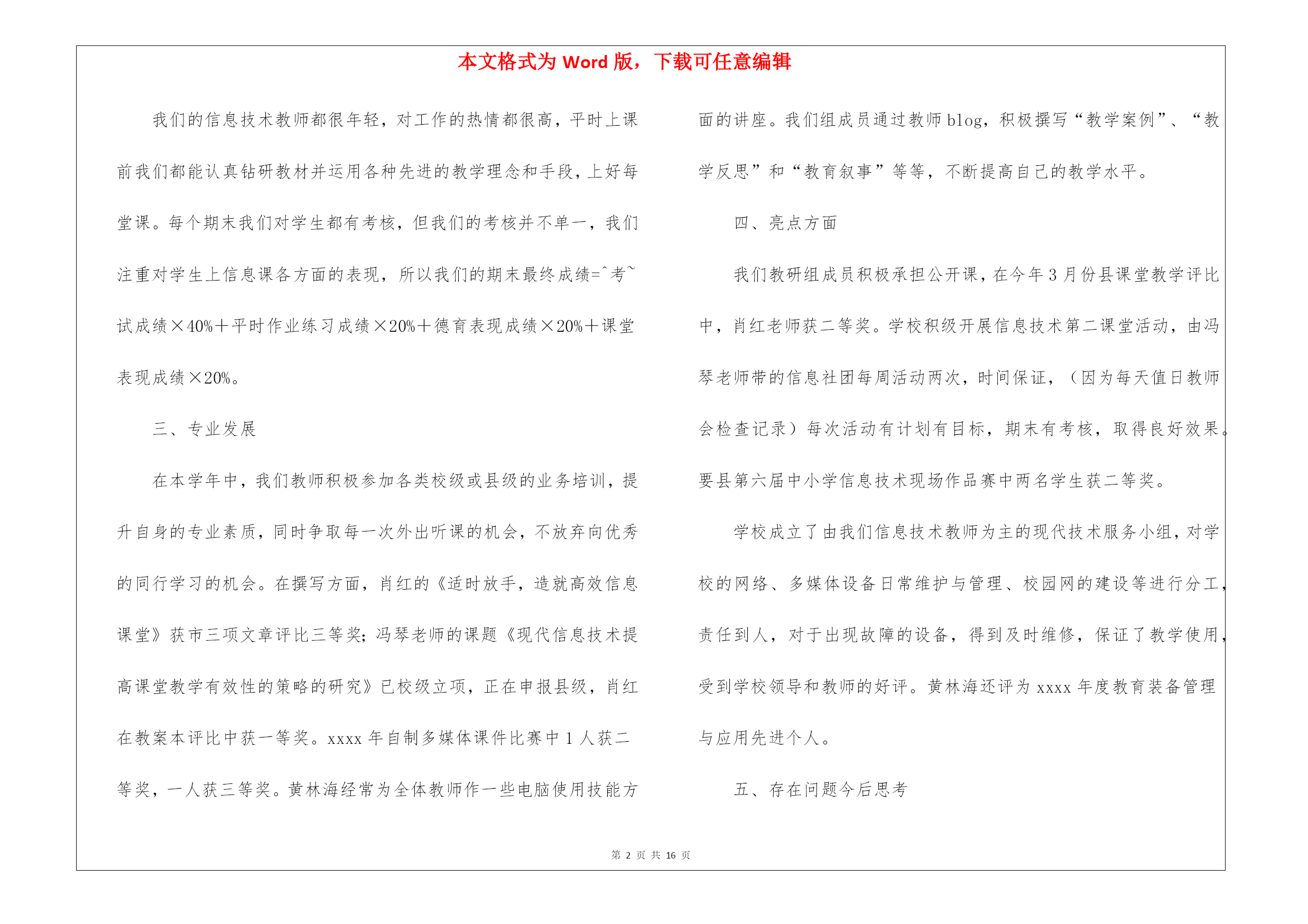 本文格式为Word版,下载可任意编辑第PAGE\*MERGEFORMAT16页共NUMPAGES\*MERGEFORMAT16页小学信息技术教研组工作总结小学信息技术教研组工作总结总结是指对某一阶段的工作、学习或思想中的经验或情况加以总结和概括的书面材料,它可以给我们下一阶段的学习和工作生活做指导,让我们来为自己写一份总结吧。我们该怎么写总结呢?以下是我整理的小学信息技术教研组工作总结,希望能够帮助到大家。小学信息技术教研组工作总结1在学校领导的关心支持下,我们信息技术组的老师也在这个学期立足实际、搞好教学,并且不断更新知识、提高自身素质,在这个基础上,还为信息技术竞赛、学校活动付出了辛勤的汗水。现将这个学期教研组工作总结如下:一、课程开设、师资配备我们学校是三年级至六年级开设信息技术课,每周一节,并且严格按照课程设置来进行,专课专用。我们的信息技术教师共有4位,2名本科,2名专科,其中2名是计算机专业毕业。虽然都是兼职,但并不因此而放松对信息教学的要求,相反,因为我们人多,力量大,遇事有商有量,反而促进课堂教学和其它的一系列工作,我想我们对信息技术的工作热情完全不亚于专职的信息教师。二、课堂教学、校本教研根据教导处的要求,我们信息教研组在期初就制定了教研组工作计划,并且按照计划开展工作。本学期共有四次教研活动,第一次是制定工作计划,各册教材确定期末考核的目标,因为我们学校每个学期末都会由教导处组织领导对各技能类学科进行考核,信息技术的考核分为学生座谈(主要是调查老师上课的情况),还要每班抽取学生现场操作。第二次、第三次是磨课,为我参加课堂教学评比出谋划策。第四次是为了做了本次六年级信息抽测,我们几个老师在一起讨论出卷。我们的信息技术教师都很年轻,对工作的热情都很高,平时上课前我们都能认真钻研教材并运用各种先进的教学理念和手段,上好每堂课。每个期末我们对学生都有考核,但我们的考核并不单一,我们注重对学生上信息课各方面的表现,所以我们的期末最终成绩=^考~试成绩×40%+平时作业练习成绩×20%+德育表现成绩×20%+课堂表现成绩×20%。三、专业发展在本学年中,我们教师积极参加各类校级或县级的业务培训,提升自身的专业素质,同时争取每一次外出听课的机会,不放弃向优秀的同行学习的机会。在撰写方面,肖红的《适时放手,造就高效信息课堂》获市三项文章评比三等奖;冯琴老师的课题《现代信息技术提高课堂教学有效性的策略的研究》已校级立项,正在申报县级,肖红在教案本评比中获一等奖。xxxx年自制多媒体课件比赛中1人获二等奖,一人获三等奖。黄林海经常为全体教师作一些电脑使用技能方面的讲座。我们组成员通过教师blog,积极撰写“教学案例”、“教学反思”和“教育叙事”等等,不断提高自己的教学水平。四、亮点方面我们教研组成员积极承担公开课,在今年3月份县课堂教学评比中,肖红老师获二等奖。学校积级开展信息技术第二课堂活动,由冯琴老师带的信息社团每周活动两次,时间保证,(因为每天值日教师会检查记录)每次活动有计划有目标,期末有考核,取得良好效果。要县第六届中小学信息技术现场作品赛中两名学生获二等奖。学校成立了由我们信息技术教师为主的现代技术服务小组,对学校的网络、多媒体设备日常维护与管理、校园网的建设等进行分工,责任到人,对于出现故障的设备,得到及时维修,保证了教学使用,受到学校领导和教师的好评。黄林海还评为xxxx年度教育装备管理与应用先进个人。五、存在问题今后思考我们学校有一个机房,共48台电脑,但最多的班级人数有56人,无法做到一人一机。作为我们教研组的成员,我们都有过一些收获,但是我们应该清醒的看到还存在不少有待提高的方面:如创新意识还要加强;计算机的维护技术有待于提高;对病毒的预见能力还要进一步加强,对工作的总结还不够及时,有些工作还不够主动……在接下来的工作中,我们信息教研组的全体老师会更加努力,力争在平凡的工作中体现人身价值,力争使我们的教研组做得更好。小学信息技术教研组工作总结2本学期以来,我们组坚持以教学工作为中心,以重实际,求实效为工作原则,以培养学生创新精神和实践能力为重点,以新课程改革为契机,加强教学常规管理,认真落实课程计划,坚持以学生为主体,教师为主导,训练为主线的教学模式,努力提高教学质量。一、加强学习,树立新的教育理念1、我们紧紧围绕学习新课程,构建新课程,尝试新教法的目标,不断更新教学观念。注重把学习新课程标准与构件新理念有机的结合起来。2、通过学习新的《课程标准》,确立了“一切为了人的发展”的教学理念。树立“以人为本,育人为本”的思想。3、加强了教育的开放性,加强了教学与学生生活,现代社会,现代科技的联系。二、继续加强校园网建设校园网是我校走向社会、通向世界的窗口,也是我们组除教学工作以外的重要任务。