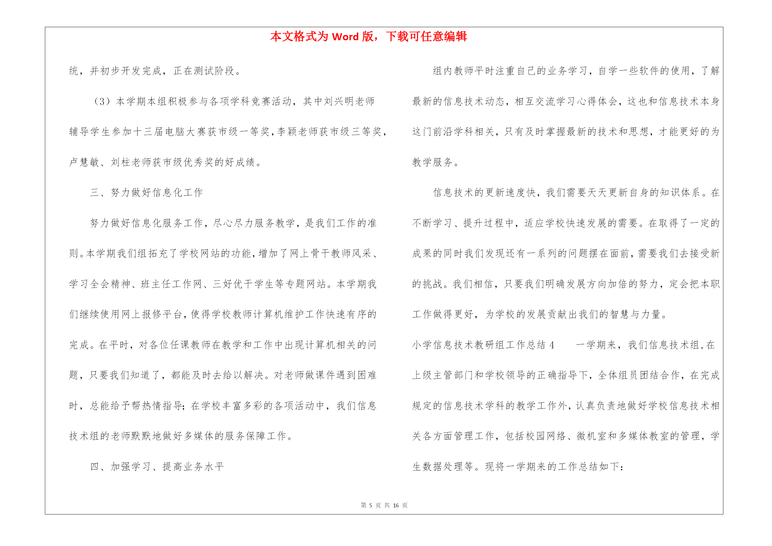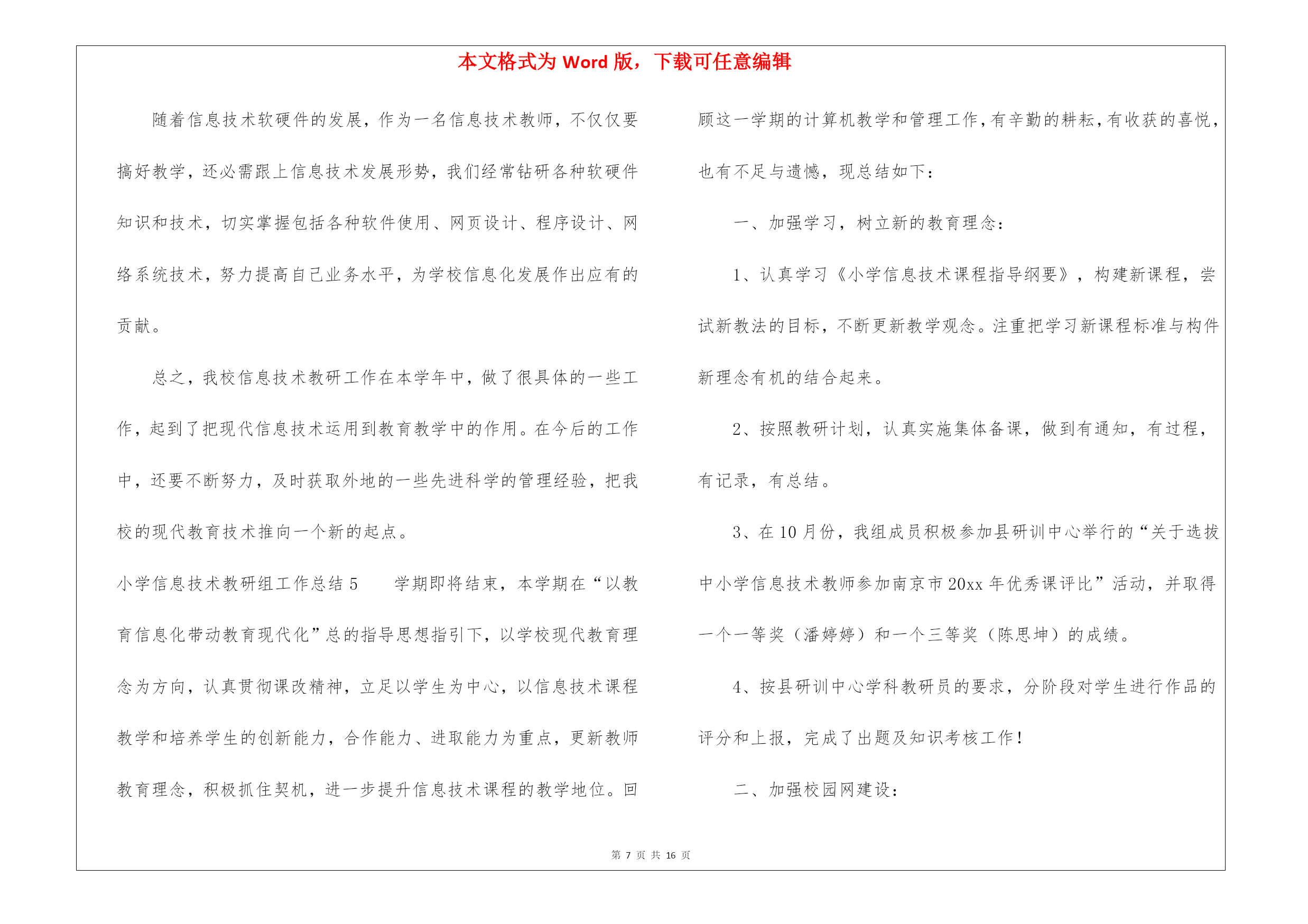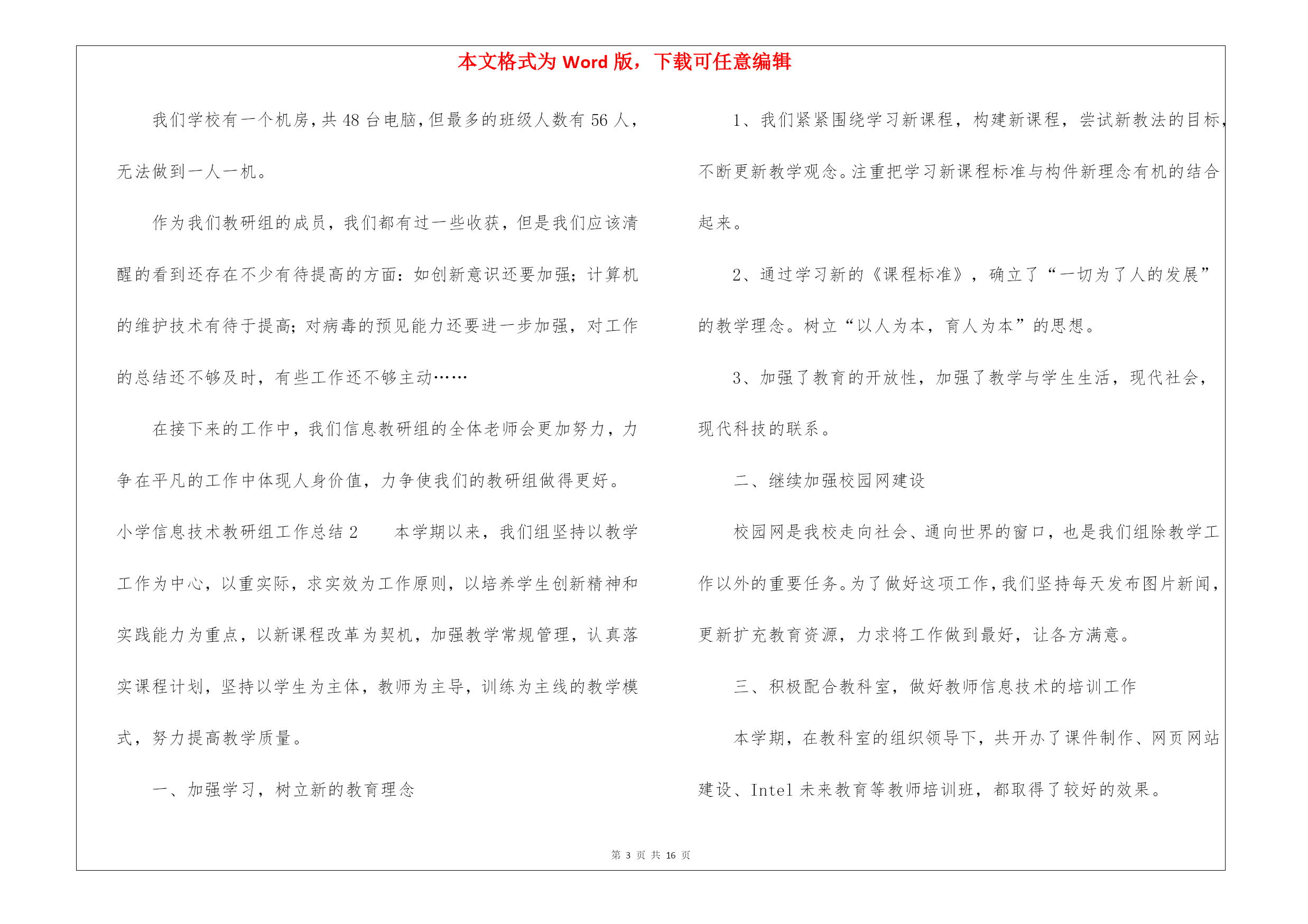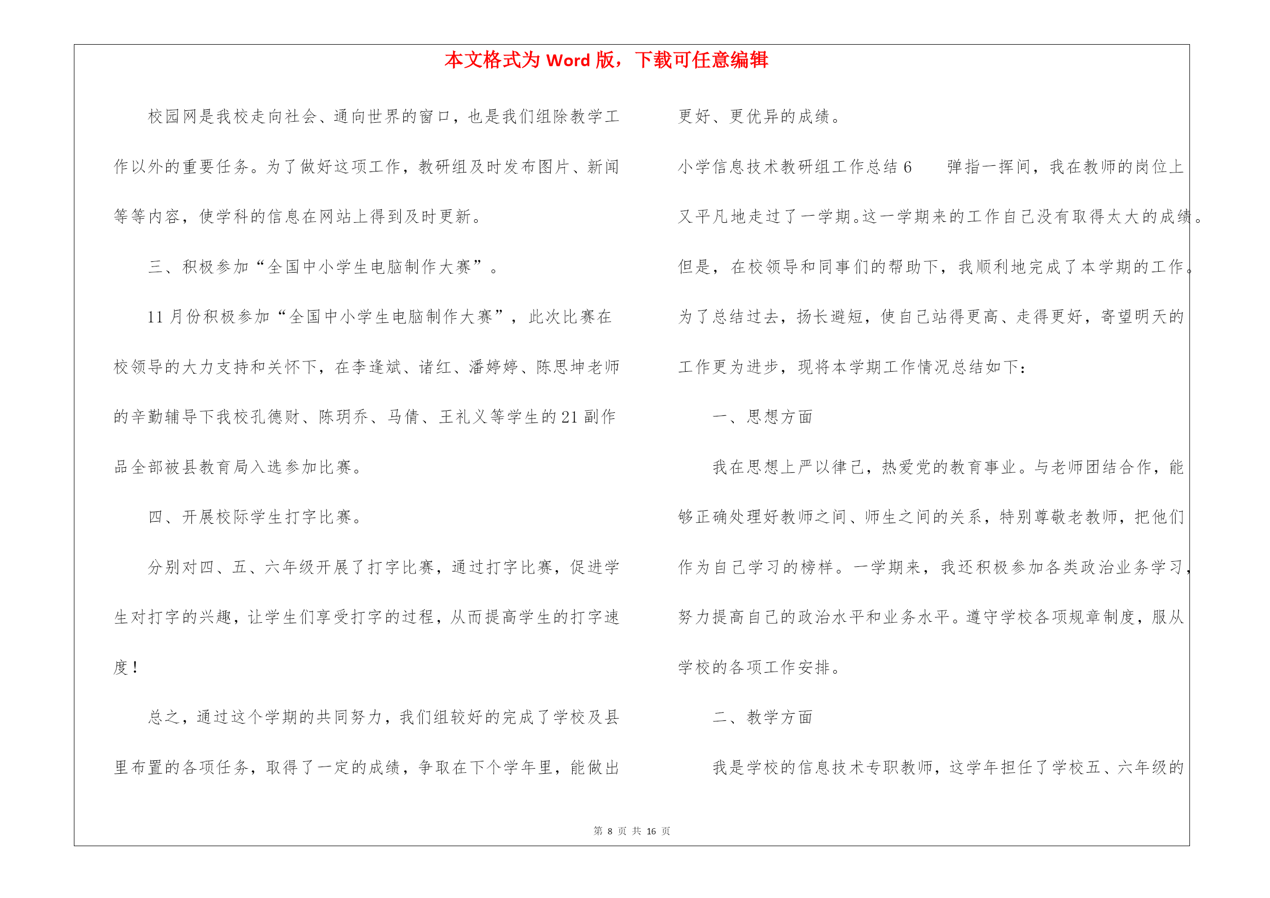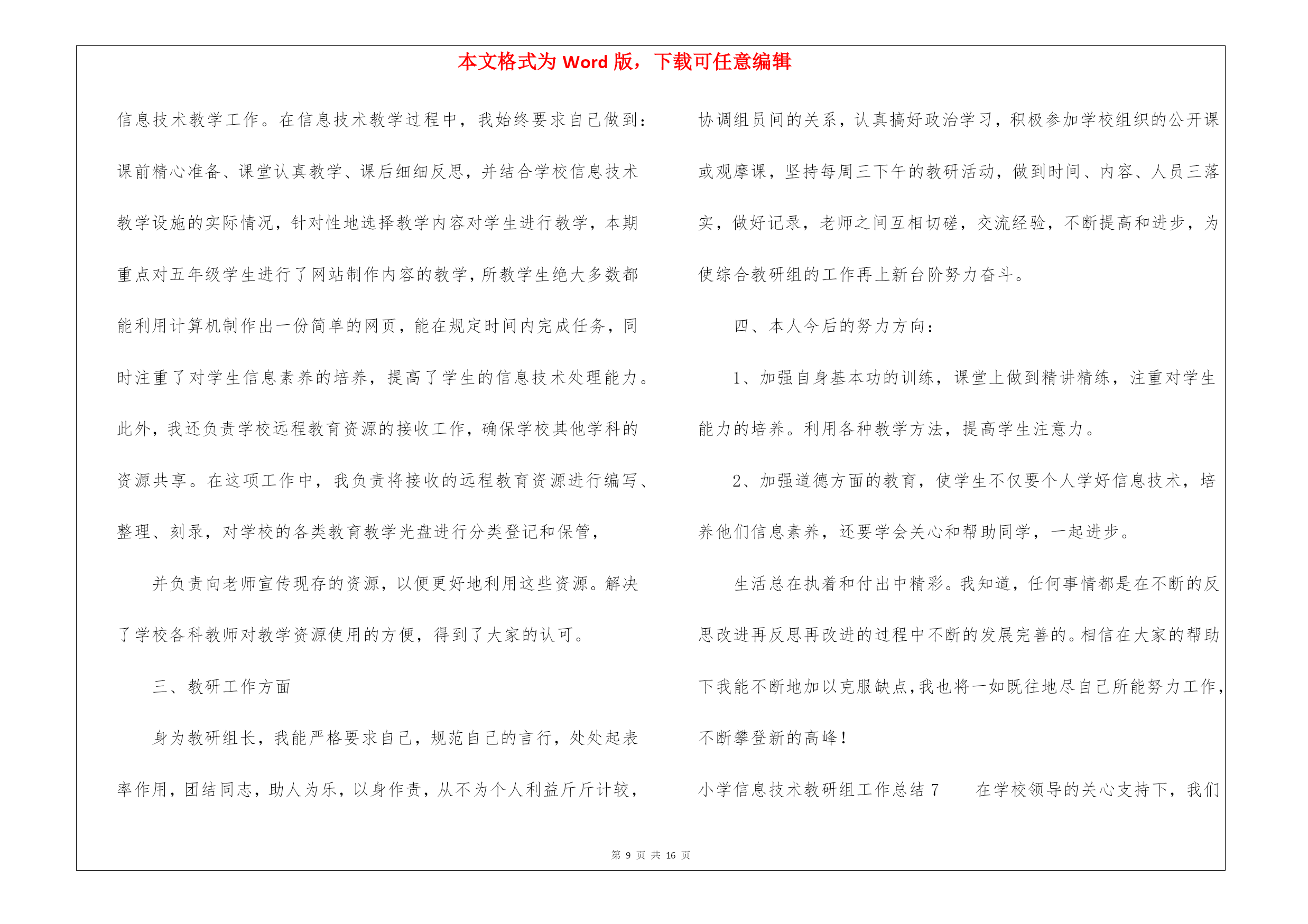 本文格式为Word版,下载可任意编辑第PAGE\*MERGEFORMAT16页共NUMPAGES\*MERGEFORMAT16页小学信息技术教研组工作总结小学信息技术教研组工作总结总结是指对某一阶段的工作、学习或思想中的经验或情况加以总结和概括的书面材料,它可以给我们下一阶段的学习和工作生活做指导,让我们来为自己写一份总结吧。我们该怎么写总结呢?以下是我整理的小学信息技术教研组工作总结,希望能够帮助到大家。小学信息技术教研组工作总结1在学校领导的关心支持下,我们信息技术组的老师也在这个学期立足实际、搞好教学,并且不断更新知识、提高自身素质,在这个基础上,还为信息技术竞赛、学校活动付出了辛勤的汗水。现将这个学期教研组工作总结如下:一、课程开设、师资配备我们学校是三年级至六年级开设信息技术课,每周一节,并且严格按照课程设置来进行,专课专用。我们的信息技术教师共有4位,2名本科,2名专科,其中2名是计算机专业毕业。虽然都是兼职,但并不因此而放松对信息教学的要求,相反,因为我们人多,力量大,遇事有商有量,反而促进课堂教学和其它的一系列工作,我想我们对信息技术的工作热情完全不亚于专职的信息教师。二、课堂教学、校本教研根据教导处的要求,我们信息教研组在期初就制定了教研组工作计划,并且按照计划开展工作。本学期共有四次教研活动,第一次是制定工作计划,各册教材确定期末考核的目标,因为我们学校每个学期末都会由教导处组织领导对各技能类学科进行考核,信息技术的考核分为学生座谈(主要是调查老师上课的情况),还要每班抽取学生现场操作。第二次、第三次是磨课,为我参加课堂教学评比出谋划策。第四次是为了做了本次六年级信息抽测,我们几个老师在一起讨论出卷。我们的信息技术教师都很年轻,对工作的热情都很高,平时上课前我们都能认真钻研教材并运用各种先进的教学理念和手段,上好每堂课。每个期末我们对学生都有考核,但我们的考核并不单一,我们注重对学生上信息课各方面的表现,所以我们的期末最终成绩=^考~试成绩×40%+平时作业练习成绩×20%+德育表现成绩×20%+课堂表现成绩×20%。三、专业发展在本学年中,我们教师积极参加各类校级或县级的业务培训,提升自身的专业素质,同时争取每一次外出听课的机会,不放弃向优秀的同行学习的机会。在撰写方面,肖红的《适时放手,造就高效信息课堂》获市三项文章评比三等奖;冯琴老师的课题《现代信息技术提高课堂教学有效性的策略的研究》已校级立项,正在申报县级,肖红在教案本评比中获一等奖。xxxx年自制多媒体课件比赛中1人获二等奖,一人获三等奖。黄林海经常为全体教师作一些电脑使用技能方面的讲座。我们组成员通过教师blog,积极撰写“教学案例”、“教学反思”和“教育叙事”等等,不断提高自己的教学水平。四、亮点方面我们教研组成员积极承担公开课,在今年3月份县课堂教学评比中,肖红老师获二等奖。学校积级开展信息技术第二课堂活动,由冯琴老师带的信息社团每周活动两次,时间保证,(因为每天值日教师会检查记录)每次活动有计划有目标,期末有考核,取得良好效果。要县第六届中小学信息技术现场作品赛中两名学生获二等奖。学校成立了由我们信息技术教师为主的现代技术服务小组,对学校的网络、多媒体设备日常维护与管理、校园网的建设等进行分工,责任到人,对于出现故障的设备,得到及时维修,保证了教学使用,受到学校领导和教师的好评。黄林海还评为xxxx年度教育装备管理与应用先进个人。五、存在问题今后思考我们学校有一个机房,共48台电脑,但最多的班级人数有56人,无法做到一人一机。作为我们教研组的成员,我们都有过一些收获,但是我们应该清醒的看到还存在不少有待提高的方面:如创新意识还要加强;计算机的维护技术有待于提高;对病毒的预见能力还要进一步加强,对工作的总结还不够及时,有些工作还不够主动……在接下来的工作中,我们信息教研组的全体老师会更加努力,力争在平凡的工作中体现人身价值,力争使我们的教研组做得更好。小学信息技术教研组工作总结2本学期以来,我们组坚持以教学工作为中心,以重实际,求实效为工作原则,以培养学生创新精神和实践能力为重点,以新课程改革为契机,加强教学常规管理,认真落实课程计划,坚持以学生为主体,教师为主导,训练为主线的教学模式,努力提高教学质量。一、加强学习,树立新的教育理念1、我们紧紧围绕学习新课程,构建新课程,尝试新教法的目标,不断更新教学观念。注重把学习新课程标准与构件新理念有机的结合起来。2、通过学习新的《课程标准》,确立了“一切为了人的发展”的教学理念。树立“以人为本,育人为本”的思想。3、加强了教育的开放性,加强了教学与学生生活,现代社会,现代科技的联系。二、继续加强校园网建设校园网是我校走向社会、通向世界的窗口,也是我们组除教学工作以外的重要任务。