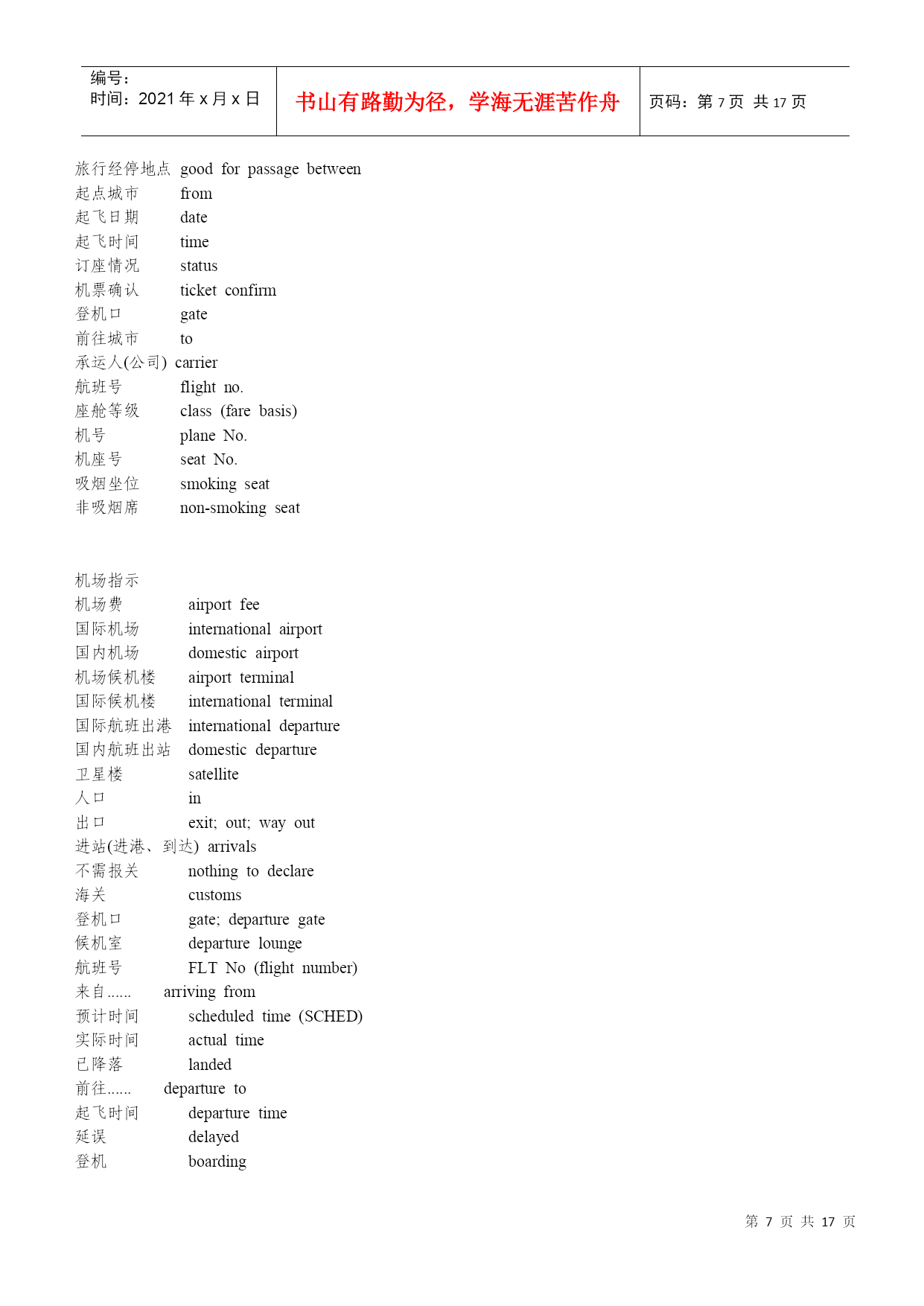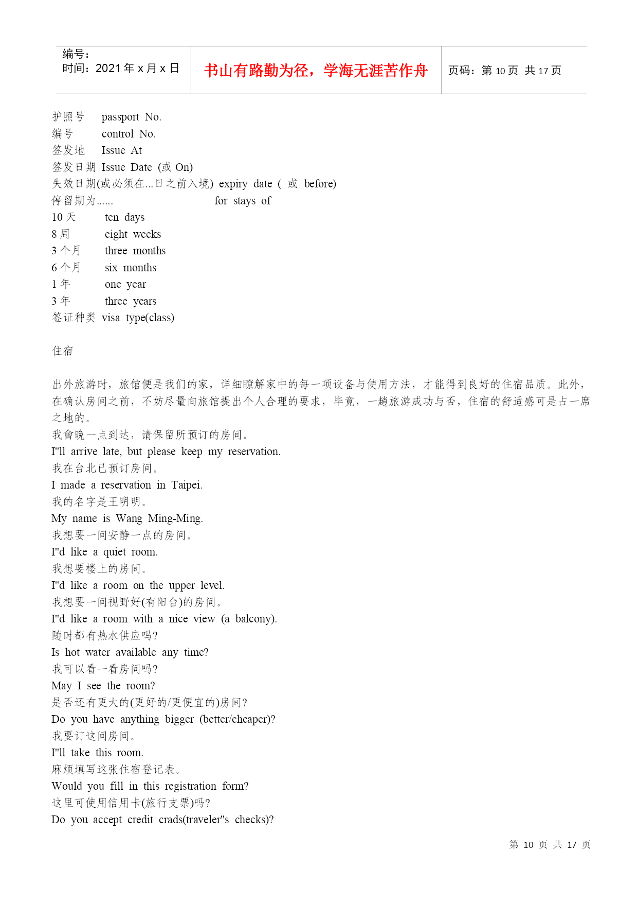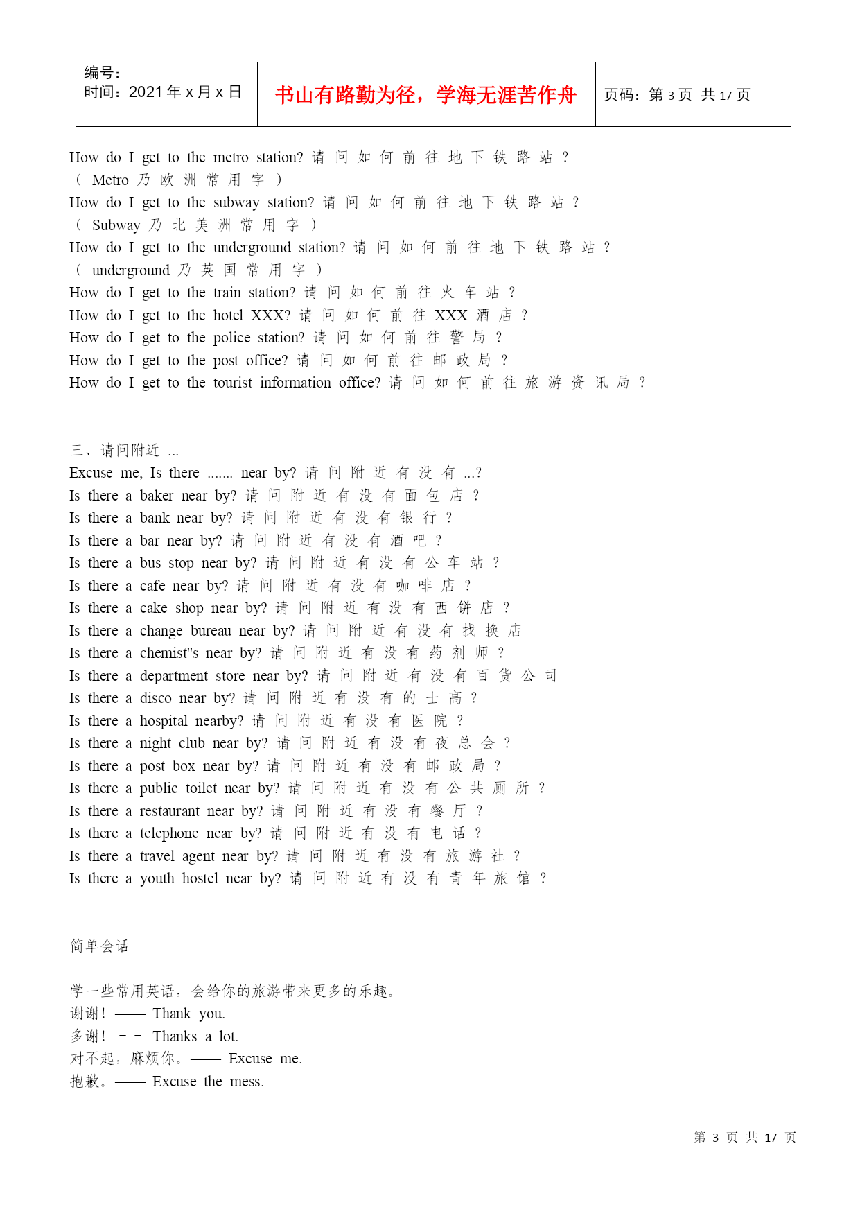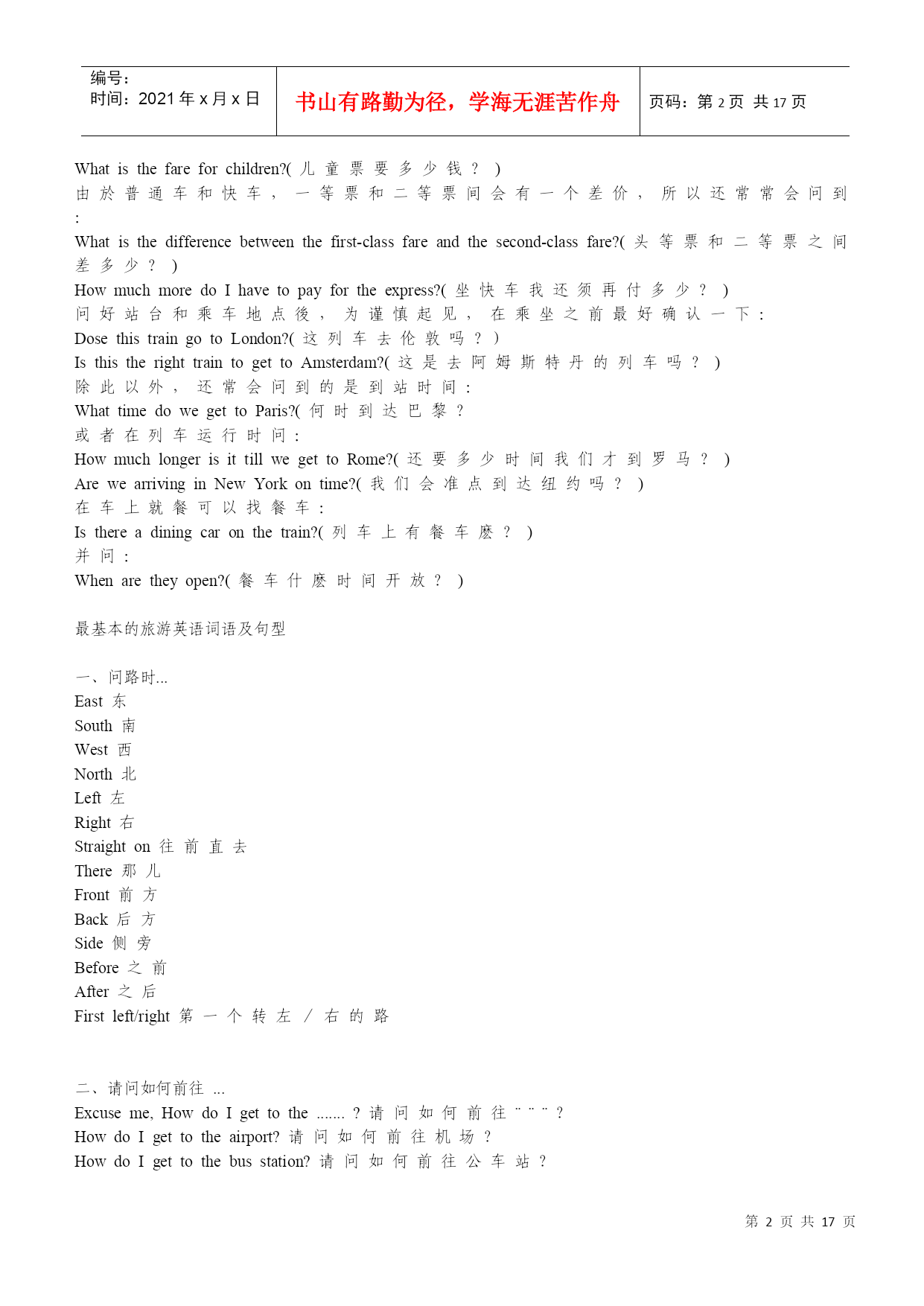 编号:时间:2021年x月x日书山有路勤为径,学海无涯苦作舟页码:第PAGE17页共NUMPAGES17页第PAGE\*MERGEFORMAT17页共NUMPAGES\*MERGEFORMAT17页旅游英语大汇总叫出租车在酒店要taxi可以请酒店服务人员为你叫一辆:Couldyoucallmeataxi?(请为我叫辆的士。)或者直接打电话到出租车公司:CanyousendataxitoStateHospital?I''llbewaitingatthemainentrance.(请派辆的士到州立医院好吗?我会在大门处等候。)如果在街上叫taxi,直接说:Taxi!(的士!)就可以了。上车以後,先告诉司机目的地:CityHall,please.(请到市政厅。)或者说,PleasedropmeoffatParkStreet.(请让我在公园路下车。)如果对路线熟悉可以告诉司机:CanyoutaketheVictoryBridge?(请从胜利挢那条路过去。)上车後,可以先问一下行车所需的时间:HowmanyminutesdoesittaketogettotheCapitalAirport?(到首都机场要几分钟?)如果赶时间需要催促司机快些开时,可以说:Wouldyouhurry,please?(能不能快一点?)Canyoumakeitinfiveminutes?(能否在五分钟内赶到?)当然也可能会提醒司机小心驾驶:Canyouslowdownalittle?(能否慢点开?)或者,I''mnotinahurry,sopleasedriveslowlyandcarefully.(我不赶时间,所以请小心慢慢开。)如果越过了目的地,你可以说:Wemissedit.Wouldyoumindturningaround?(我们走过头了,请绕回来好不好?)到了目的地後付车费时,你要说,Pleaseletmeoffhere.HowmuchdoIoweyou?(请让我在这里下车。我该付你多少钱?)通常要付些小费给司机。付小费的方式可以是:Keepthechange.(不用找零钱了。)Givemethreeback.(找给我三块钱。)即给司机的整钱比车费高(超过三块),而要求找回三块,请司机留下其馀坐火车火车分为几种,普通车是regulartrain或localtrain,快车是expresstrain,直达车是throughtrain。购买火车票时,卧铺票是sleeperticket,餐车是diningcar,头等票是first-classticket,二等票是second-classticket。如果问票价可以说:Howmuchisthefarefortwofirst-classticketstoParis?(两张到巴黎去的头等票多少钱?)What''stheexpresscharge?(快车票价是多少?)Whatisthefareforchildren?(儿童票要多少钱?)由於普通车和快车,一等票和二等票间会有一个差价,所以还常常会问到:Whatisthedifferencebetweenthefirst-classfareandthesecond-classfare?(头等票和二等票之间差多少?)HowmuchmoredoIhavetopayfortheexpress?(坐快车我还须再付多少?)问好站台和乘车地点後,为谨慎起见,在乘坐之前最好确认一下:DosethistraingotoLondon?(这列车去伦敦吗?)IsthistherighttraintogettoAmsterdam?(这是去阿姆斯特丹的列车吗?)除此以外,还常会问到的是到站时间:WhattimedowegettoParis?(何时到达巴黎?或者在列车运行时问:HowmuchlongerisittillwegettoRome?(还要多少时间我们才到罗马?)ArewearrivinginNewYorkontime?(我们会准点到达纽约吗?)在车上就餐可以找餐车:Isthereadiningcaronthetrain?(列车上有餐车麽?)并问:Whenaretheyopen?(餐车什麽时间开放?)最基本的旅游英语词语及句型一、问路时...East东South南West西North北Left左Right右Straighton往前直去There那儿Front前方Back后方Side侧旁Before之前After之后Firstleft/right第一个转左/右的路二、请问如何前往...Excuseme,Howdo