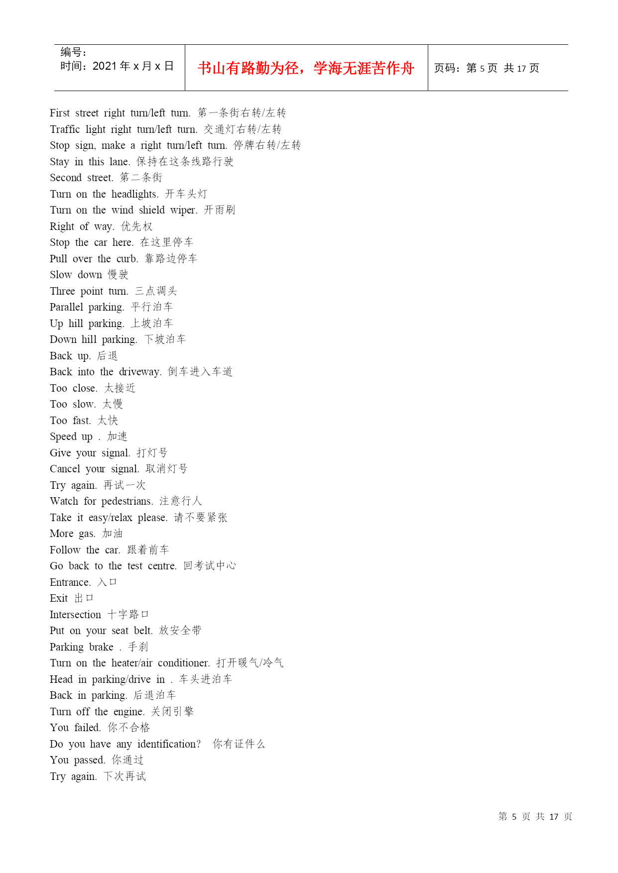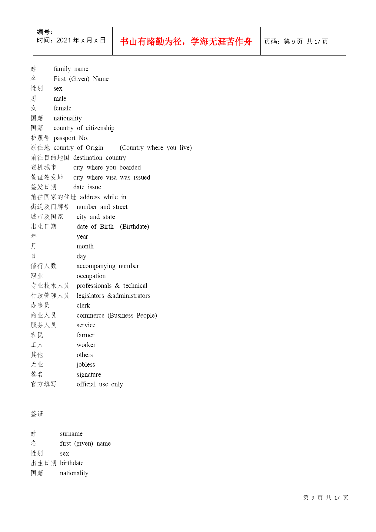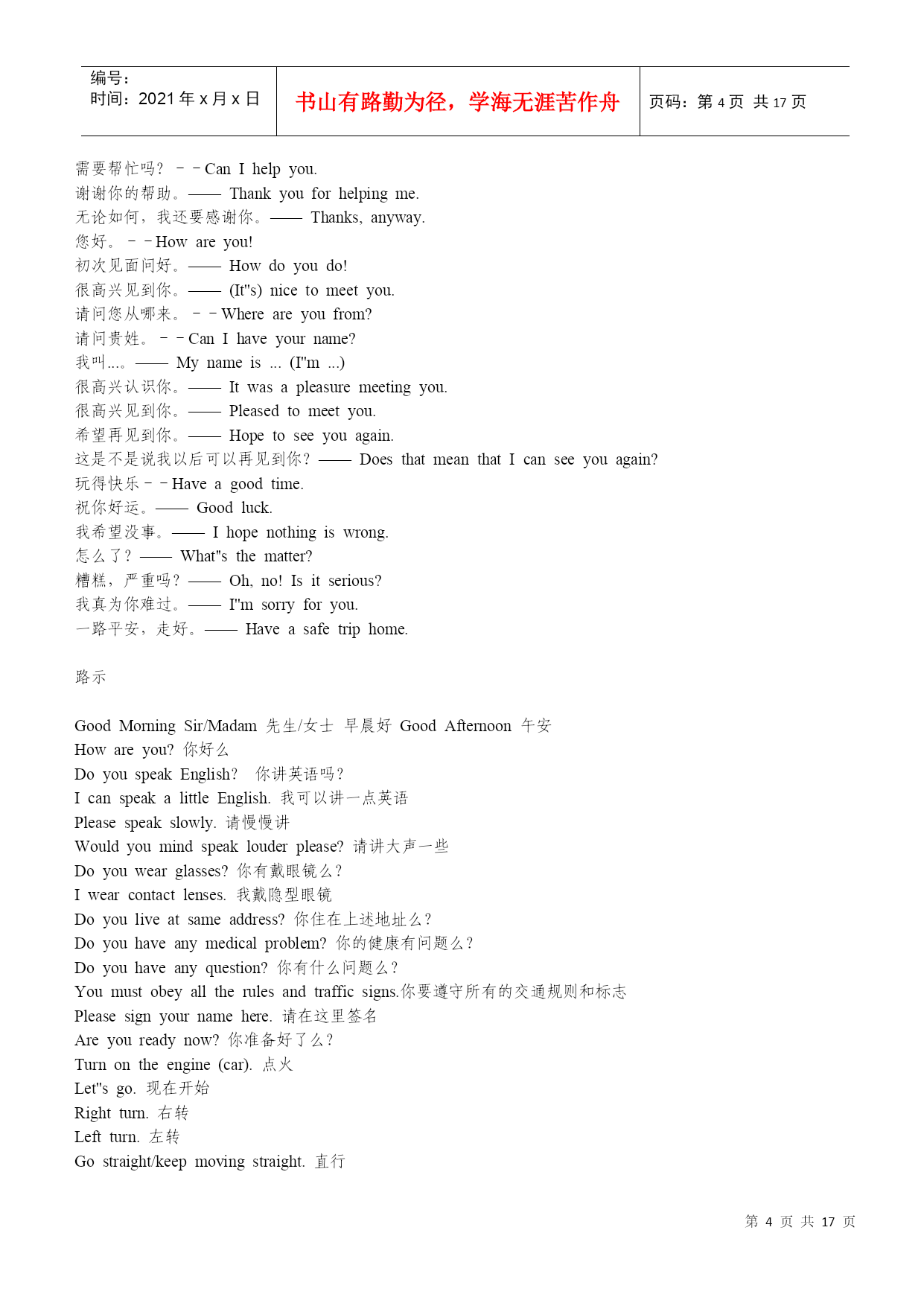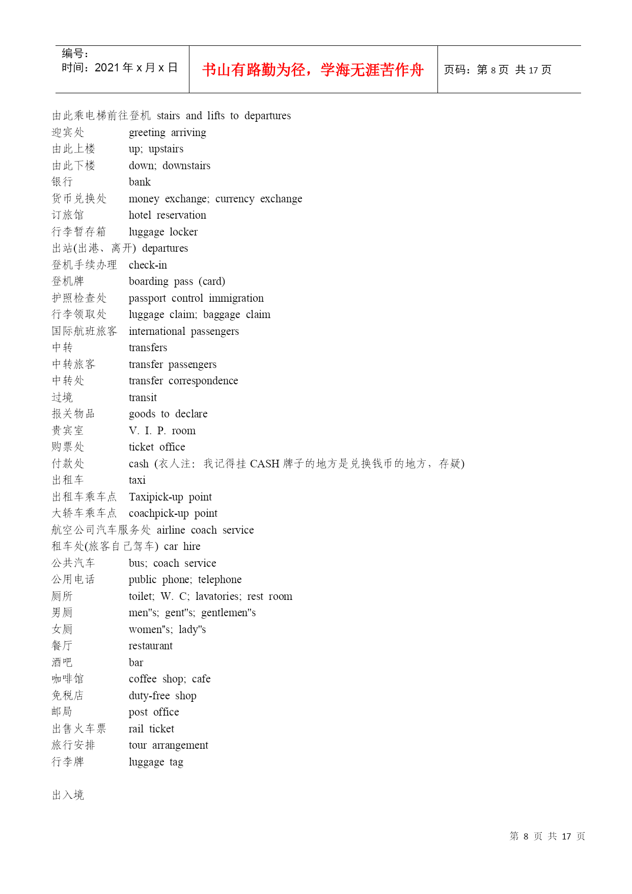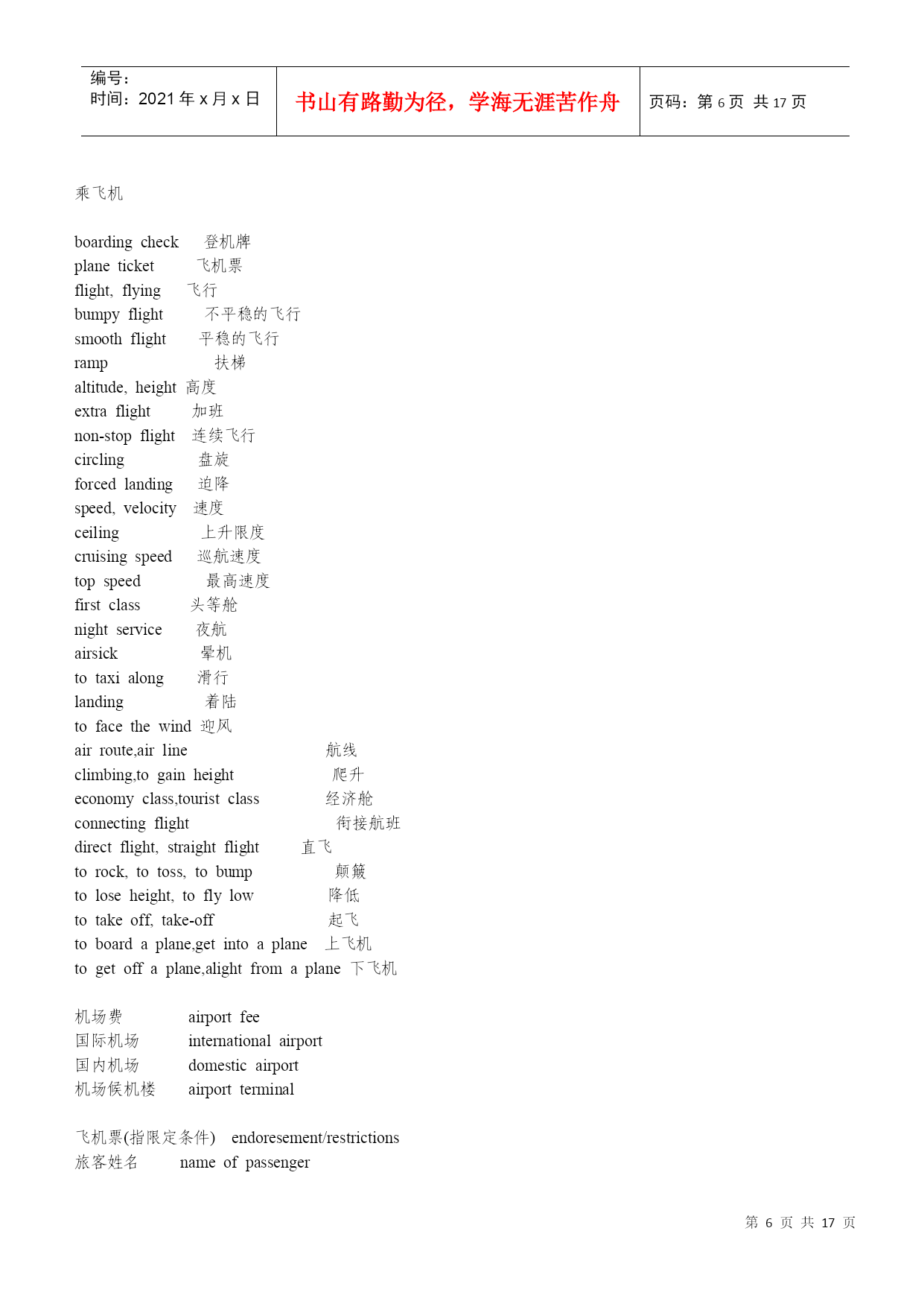 编号:时间:2021年x月x日书山有路勤为径,学海无涯苦作舟页码:第PAGE17页共NUMPAGES17页第PAGE\*MERGEFORMAT17页共NUMPAGES\*MERGEFORMAT17页旅游英语大汇总叫出租车在酒店要taxi可以请酒店服务人员为你叫一辆:Couldyoucallmeataxi?(请为我叫辆的士。)或者直接打电话到出租车公司:CanyousendataxitoStateHospital?I''llbewaitingatthemainentrance.(请派辆的士到州立医院好吗?我会在大门处等候。)如果在街上叫taxi,直接说:Taxi!(的士!)就可以了。上车以後,先告诉司机目的地:CityHall,please.(请到市政厅。)或者说,PleasedropmeoffatParkStreet.(请让我在公园路下车。)如果对路线熟悉可以告诉司机:CanyoutaketheVictoryBridge?(请从胜利挢那条路过去。)上车後,可以先问一下行车所需的时间:HowmanyminutesdoesittaketogettotheCapitalAirport?(到首都机场要几分钟?)如果赶时间需要催促司机快些开时,可以说:Wouldyouhurry,please?(能不能快一点?)Canyoumakeitinfiveminutes?(能否在五分钟内赶到?)当然也可能会提醒司机小心驾驶:Canyouslowdownalittle?(能否慢点开?)或者,I''mnotinahurry,sopleasedriveslowlyandcarefully.(我不赶时间,所以请小心慢慢开。)如果越过了目的地,你可以说:Wemissedit.Wouldyoumindturningaround?(我们走过头了,请绕回来好不好?)到了目的地後付车费时,你要说,Pleaseletmeoffhere.HowmuchdoIoweyou?(请让我在这里下车。我该付你多少钱?)通常要付些小费给司机。付小费的方式可以是:Keepthechange.(不用找零钱了。)Givemethreeback.(找给我三块钱。)即给司机的整钱比车费高(超过三块),而要求找回三块,请司机留下其馀坐火车火车分为几种,普通车是regulartrain或localtrain,快车是expresstrain,直达车是throughtrain。购买火车票时,卧铺票是sleeperticket,餐车是diningcar,头等票是first-classticket,二等票是second-classticket。如果问票价可以说:Howmuchisthefarefortwofirst-classticketstoParis?(两张到巴黎去的头等票多少钱?)What''stheexpresscharge?(快车票价是多少?)Whatisthefareforchildren?(儿童票要多少钱?)由於普通车和快车,一等票和二等票间会有一个差价,所以还常常会问到:Whatisthedifferencebetweenthefirst-classfareandthesecond-classfare?(头等票和二等票之间差多少?)HowmuchmoredoIhavetopayfortheexpress?(坐快车我还须再付多少?)问好站台和乘车地点後,为谨慎起见,在乘坐之前最好确认一下:DosethistraingotoLondon?(这列车去伦敦吗?)IsthistherighttraintogettoAmsterdam?(这是去阿姆斯特丹的列车吗?)除此以外,还常会问到的是到站时间:WhattimedowegettoParis?(何时到达巴黎?或者在列车运行时问:HowmuchlongerisittillwegettoRome?(还要多少时间我们才到罗马?)ArewearrivinginNewYorkontime?(我们会准点到达纽约吗?)在车上就餐可以找餐车:Isthereadiningcaronthetrain?(列车上有餐车麽?)并问:Whenaretheyopen?(餐车什麽时间开放?)最基本的旅游英语词语及句型一、问路时...East东South南West西North北Left左Right右Straighton往前直去There那儿Front前方Back后方Side侧旁Before之前After之后Firstleft/right第一个转左/右的路二、请问如何前往...Excuseme,Howdo