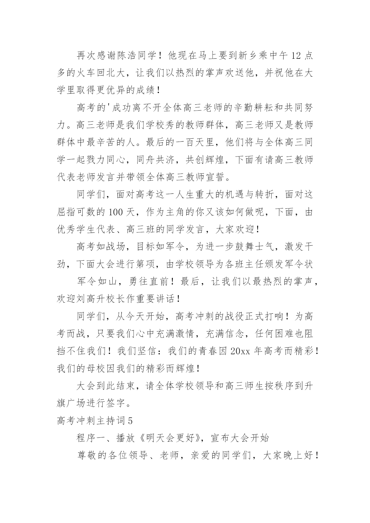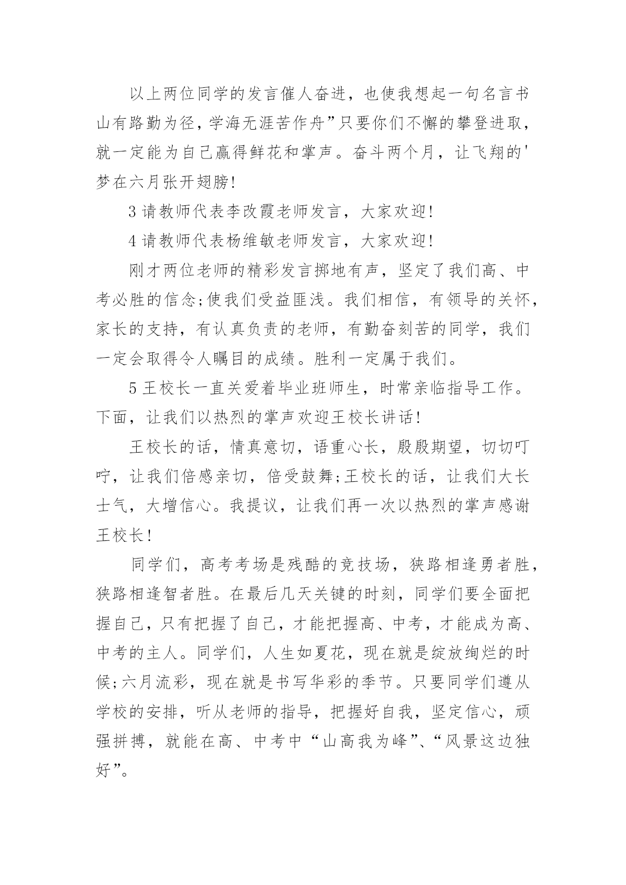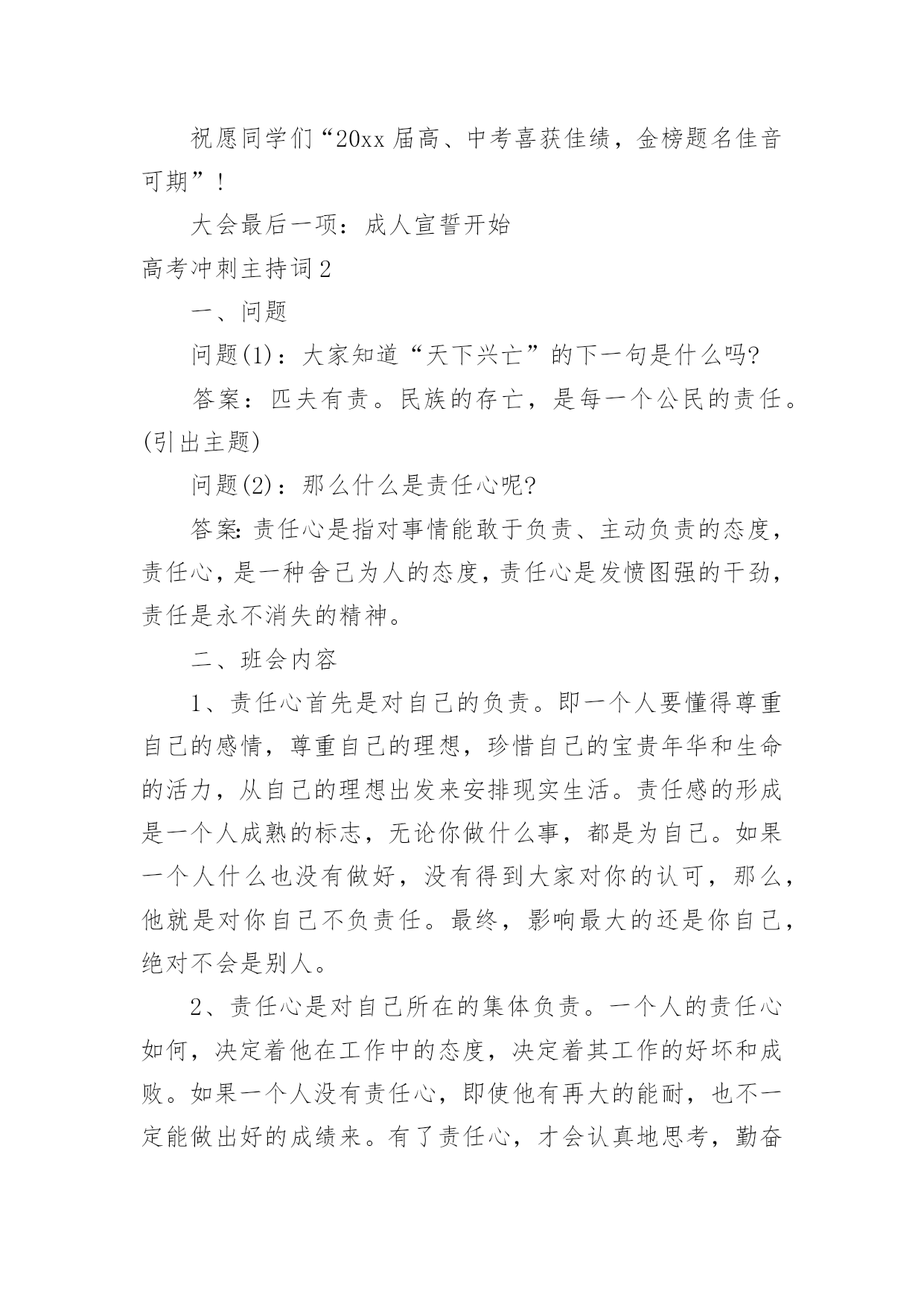 高考冲刺主持词高考冲刺主持词根据活动对象的不同,需要设置不同的主持词。现今社会在不断向前发展,主持人在各种场合变得越来越重要,主持词怎么写才合适呢?以下是小编整理的高考冲刺主持词,希望能够帮助到大家。高考冲刺主持词1老师们,同学们:大家下午好!又是一年芳草绿,今年花好胜往昔。今天,在同学们即将奔赴高、中考赛场之际,在同学们即将“十年磨剑、今朝亮剑”之时,我们全体师生在这里隆重集会,就是为了给全体同学加油、鼓劲、祝福、壮行,就是为了让同学们能够在短暂的高、中考征途中一路走好、一路欢歌。一路风雨兼程,意志磨砺已如钢;三载苦乐同享,师生协力必辉煌。同学们,学校领导对你们寄予了殷切希望,全校教师将为你们保驾护航,毕业班的同学还有许多知心的话语对你们讲。请所有同学仔细聆听,细心体会,在近期迎考应考中灵活运用。1首先,请学生代表宓倩同学发言,大家欢迎!2再请学生代表袁丽萍同学发言,大家欢迎!以上两位同学的发言催人奋进,也使我想起一句名言书山有路勤为径,学海无涯苦作舟”只要你们不懈的攀登进取,就一定能为自己赢得鲜花和掌声。奋斗两个月,让飞翔的'梦在六月张开翅膀!3请教师代表李改霞老师发言,大家欢迎!4请教师代表杨维敏老师发言,大家欢迎!刚才两位老师的精彩发言掷地有声,坚定了我们高、中考必胜的信念;使我们受益匪浅。我们相信,有领导的关怀,家长的支持,有认真负责的老师,有勤奋刻苦的同学,我们一定会取得令人瞩目的成绩。胜利一定属于我们。5王校长一直关爱着毕业班师生,时常亲临指导工作。下面,让我们以热烈的掌声欢迎王校长讲话!王校长的话,情真意切,语重心长,殷殷期望,切切叮咛,让我们倍感亲切,倍受鼓舞;王校长的话,让我们大长士气,大增信心。我提议,让我们再一次以热烈的掌声感谢王校长!同学们,高考考场是残酷的竞技场,狭路相逢勇者胜,狭路相逢智者胜。在最后几天关键的时刻,同学们要全面把握自己,只有把握了自己,才能把握高、中考,才能成为高、中考的主人。同学们,人生如夏花,现在就是绽放绚烂的时候;六月流彩,现在就是书写华彩的季节。只要同学们遵从学校的安排,听从老师的指导,把握好自我,坚定信心,顽强拼搏,就能在高、中考中“山高我为峰”、“风景这边独好”。祝愿同学们“20xx届高、中考喜获佳绩,金榜题名佳音可期”!大会最后一项:成人宣誓开始高考冲刺主持词2一、问题问题(1):大家知道“天下兴亡”的下一句是什么吗?答案:匹夫有责。民族的存亡,是每一个公民的责任。(引出主题)问题(2):那么什么是责任心呢?答案:责任心是指对事情能敢于负责、主动负责的态度,责任心,是一种舍己为人的态度,责任心是发愤图强的干劲,责任是永不消失的精神。二、班会内容1、责任心首先是对自己的负责。即一个人要懂得尊重自己的感情,尊重自己的理想,珍惜自己的宝贵年华和生命的活力,从自己的理想出发来安排现实生活。责任感的形成是一个人成熟的标志,无论你做什么事,都是为自己。如果一个人什么也没有做好,没有得到大家对你的认可,那么,他就是对你自己不负责任。最终,影响最大的还是你自己,绝对不会是别人。2、责任心是对自己所在的集体负责。一个人的责任心如何,决定着他在工作中的态度,决定着其工作的好坏和成败。如果一个人没有责任心,即使他有再大的能耐,也不一定能做出好的成绩来。有了责任心,才会认真地思考,勤奋地工作,细致踏实,实事求是;才会按时、按质、按量完成任务,圆满解决问题;才能主动处理好分内与分外的相关工作。3、责任心是成就事业的可靠途径。责任心出勇气、出智慧、出力量。有了责任心,再大的困难也可以克服;责任心差,很小的问题也可能酿成大祸4、有责任心,是为别人赴汤蹈火的'壮举;是为别人两肋插刀的豪情,因此,才有了黄继光以身体挡子弹;才有邱少云至死不移半步。做他人不敢做的事,担他人不敢担的后果,叶欣才会在生前留下那句刻骨铭心的话:“这里危险,让我来!”5、有责任心,是面对失败,坚强屹立,不畏挫折的意志。有责任心的人,敢于披荆斩棘,风雨无阻,勇于直面困难,从零开始。所以,司马迁的《史记》千古传承;鲁迅会写出那一篇篇犀利的文章;中国女排才会获得“五连冠”。责任心是发愤图强的基础,没有责任心,发愤图强也只会是海市蜃楼。6、没有责任哪来大唐的“贞观之治”;没有责任,哪来卧薪尝胆的成功;没有责任,哪来马克思《资本论》的光耀后世;没有责任,哪来用21年心血换来的李时珍的《本草纲目》;没有责任哪来繁荣富强的今天!7、“勿以善小而不为,勿以恶小而为之”。天下有大事吗?没有。但任何小事都是大事。集小恶则成大恶,集小善则为大善。培养良好的道德,是从尊敬老师开始的,是从那很小很小的事开始的。三、责任心小故事1、美国有个“福特公司”,福特是一个人,他大学毕业后,去一家汽车公司应聘。和他同应聘的三四个人都比他学历高,当前面几个人面试之