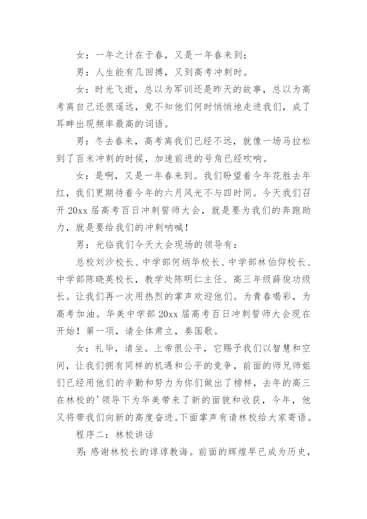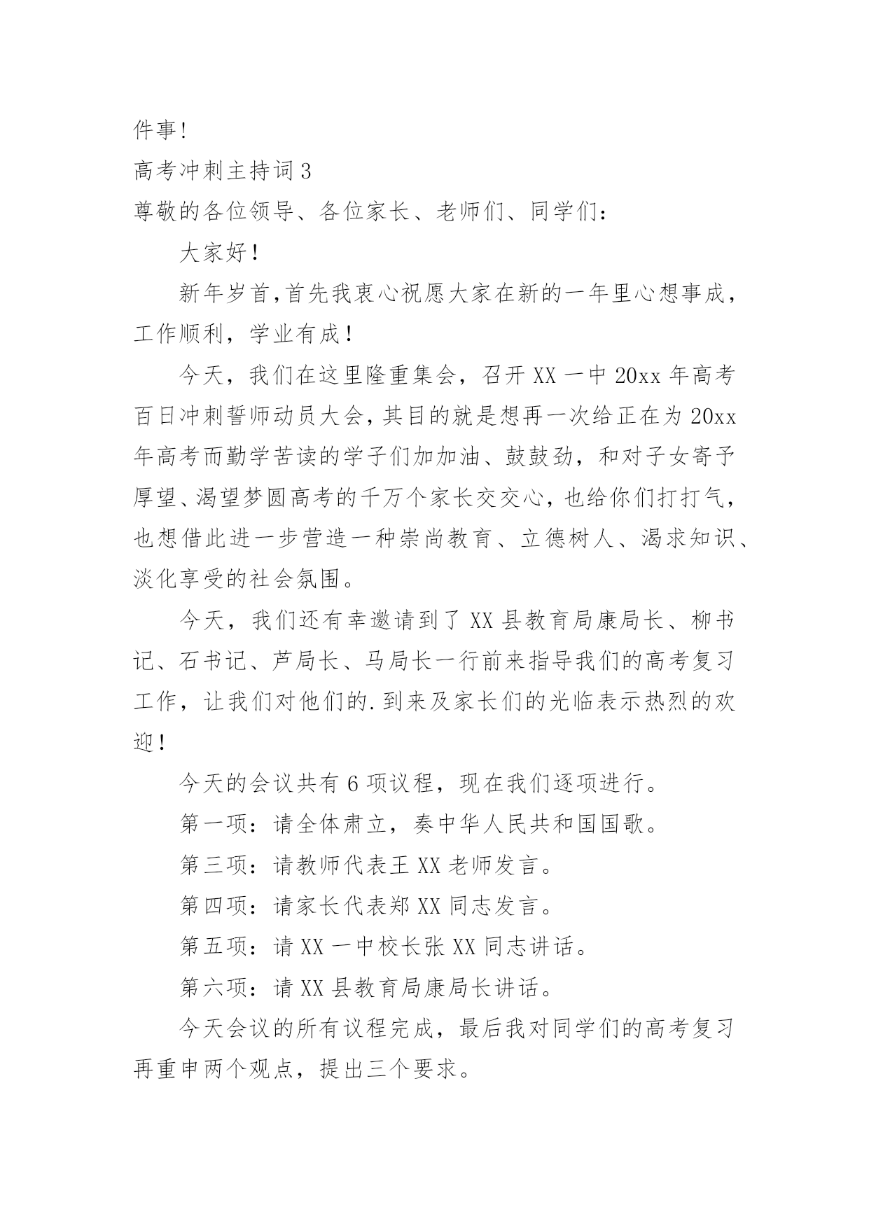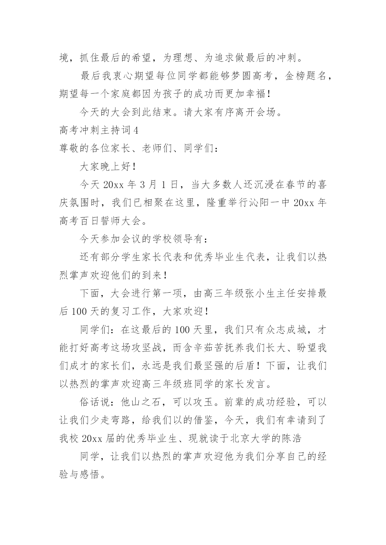 高考冲刺主持词高考冲刺主持词根据活动对象的不同,需要设置不同的主持词。现今社会在不断向前发展,主持人在各种场合变得越来越重要,主持词怎么写才合适呢?以下是小编整理的高考冲刺主持词,希望能够帮助到大家。高考冲刺主持词1老师们,同学们:大家下午好!又是一年芳草绿,今年花好胜往昔。今天,在同学们即将奔赴高、中考赛场之际,在同学们即将“十年磨剑、今朝亮剑”之时,我们全体师生在这里隆重集会,就是为了给全体同学加油、鼓劲、祝福、壮行,就是为了让同学们能够在短暂的高、中考征途中一路走好、一路欢歌。一路风雨兼程,意志磨砺已如钢;三载苦乐同享,师生协力必辉煌。同学们,学校领导对你们寄予了殷切希望,全校教师将为你们保驾护航,毕业班的同学还有许多知心的话语对你们讲。请所有同学仔细聆听,细心体会,在近期迎考应考中灵活运用。1首先,请学生代表宓倩同学发言,大家欢迎!2再请学生代表袁丽萍同学发言,大家欢迎!以上两位同学的发言催人奋进,也使我想起一句名言书山有路勤为径,学海无涯苦作舟”只要你们不懈的攀登进取,就一定能为自己赢得鲜花和掌声。奋斗两个月,让飞翔的'梦在六月张开翅膀!3请教师代表李改霞老师发言,大家欢迎!4请教师代表杨维敏老师发言,大家欢迎!刚才两位老师的精彩发言掷地有声,坚定了我们高、中考必胜的信念;使我们受益匪浅。我们相信,有领导的关怀,家长的支持,有认真负责的老师,有勤奋刻苦的同学,我们一定会取得令人瞩目的成绩。胜利一定属于我们。5王校长一直关爱着毕业班师生,时常亲临指导工作。下面,让我们以热烈的掌声欢迎王校长讲话!王校长的话,情真意切,语重心长,殷殷期望,切切叮咛,让我们倍感亲切,倍受鼓舞;王校长的话,让我们大长士气,大增信心。我提议,让我们再一次以热烈的掌声感谢王校长!同学们,高考考场是残酷的竞技场,狭路相逢勇者胜,狭路相逢智者胜。在最后几天关键的时刻,同学们要全面把握自己,只有把握了自己,才能把握高、中考,才能成为高、中考的主人。同学们,人生如夏花,现在就是绽放绚烂的时候;六月流彩,现在就是书写华彩的季节。只要同学们遵从学校的安排,听从老师的指导,把握好自我,坚定信心,顽强拼搏,就能在高、中考中“山高我为峰”、“风景这边独好”。祝愿同学们“20xx届高、中考喜获佳绩,金榜题名佳音可期”!大会最后一项:成人宣誓开始高考冲刺主持词2一、问题问题(1):大家知道“天下兴亡”的下一句是什么吗?答案:匹夫有责。民族的存亡,是每一个公民的责任。(引出主题)问题(2):那么什么是责任心呢?答案:责任心是指对事情能敢于负责、主动负责的态度,责任心,是一种舍己为人的态度,责任心是发愤图强的干劲,责任是永不消失的精神。二、班会内容1、责任心首先是对自己的负责。即一个人要懂得尊重自己的感情,尊重自己的理想,珍惜自己的宝贵年华和生命的活力,从自己的理想出发来安排现实生活。责任感的形成是一个人成熟的标志,无论你做什么事,都是为自己。如果一个人什么也没有做好,没有得到大家对你的认可,那么,他就是对你自己不负责任。最终,影响最大的还是你自己,绝对不会是别人。2、责任心是对自己所在的集体负责。一个人的责任心如何,决定着他在工作中的态度,决定着其工作的好坏和成败。如果一个人没有责任心,即使他有再大的能耐,也不一定能做出好的成绩来。有了责任心,才会认真地思考,勤奋地工作,细致踏实,实事求是;才会按时、按质、按量完成任务,圆满解决问题;才能主动处理好分内与分外的相关工作。3、责任心是成就事业的可靠途径。责任心出勇气、出智慧、出力量。有了责任心,再大的困难也可以克服;责任心差,很小的问题也可能酿成大祸4、有责任心,是为别人赴汤蹈火的'壮举;是为别人两肋插刀的豪情,因此,才有了黄继光以身体挡子弹;才有邱少云至死不移半步。做他人不敢做的事,担他人不敢担的后果,叶欣才会在生前留下那句刻骨铭心的话:“这里危险,让我来!”5、有责任心,是面对失败,坚强屹立,不畏挫折的意志。有责任心的人,敢于披荆斩棘,风雨无阻,勇于直面困难,从零开始。所以,司马迁的《史记》千古传承;鲁迅会写出那一篇篇犀利的文章;中国女排才会获得“五连冠”。责任心是发愤图强的基础,没有责任心,发愤图强也只会是海市蜃楼。6、没有责任哪来大唐的“贞观之治”;没有责任,哪来卧薪尝胆的成功;没有责任,哪来马克思《资本论》的光耀后世;没有责任,哪来用21年心血换来的李时珍的《本草纲目》;没有责任哪来繁荣富强的今天!7、“勿以善小而不为,勿以恶小而为之”。天下有大事吗?没有。但任何小事都是大事。集小恶则成大恶,集小善则为大善。培养良好的道德,是从尊敬老师开始的,是从那很小很小的事开始的。三、责任心小故事1、美国有个“福特公司”,福特是一个人,他大学毕业后,去一家汽车公司应聘。和他同应聘的三四个人都比他学历高,当前面几个人面试之