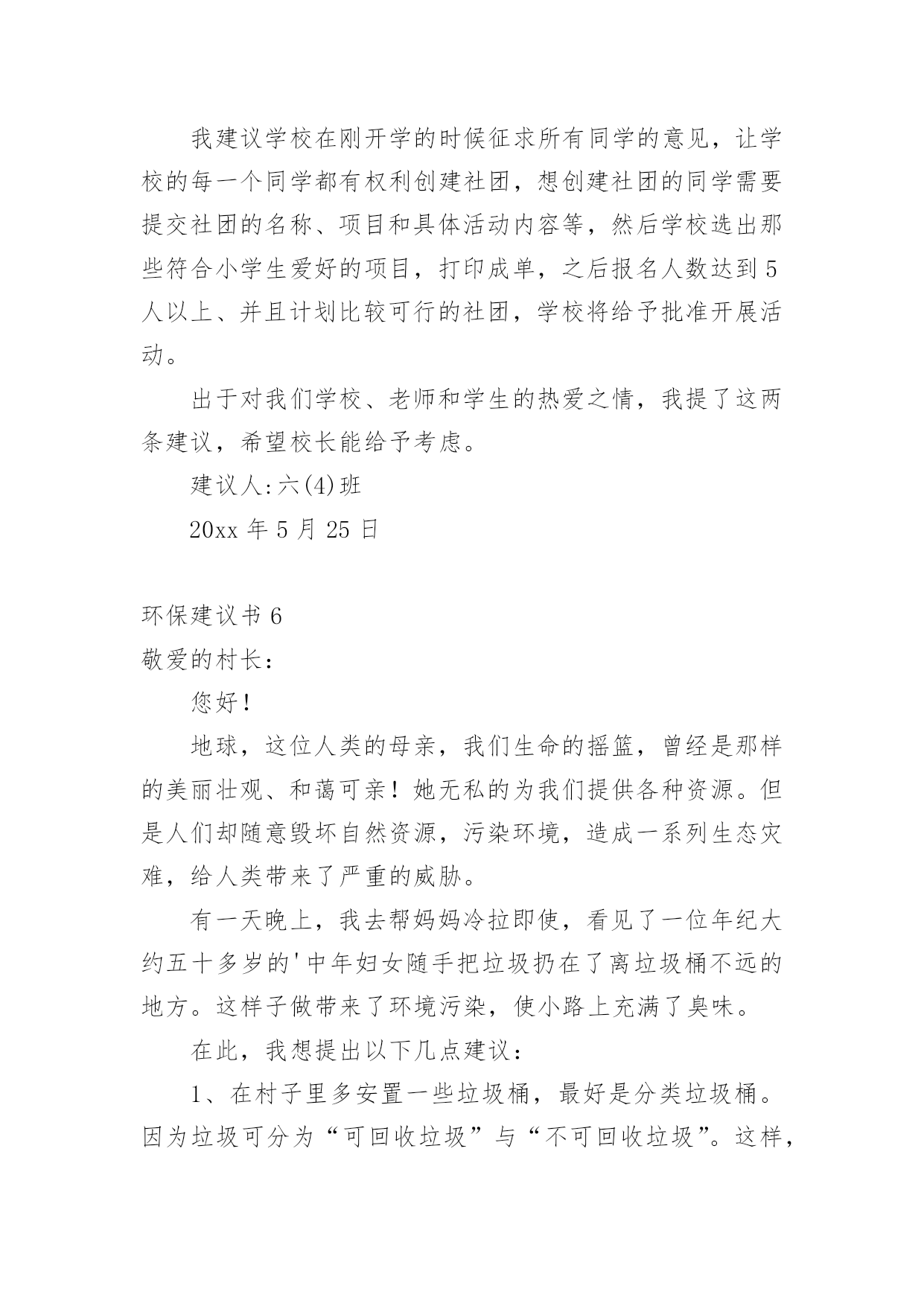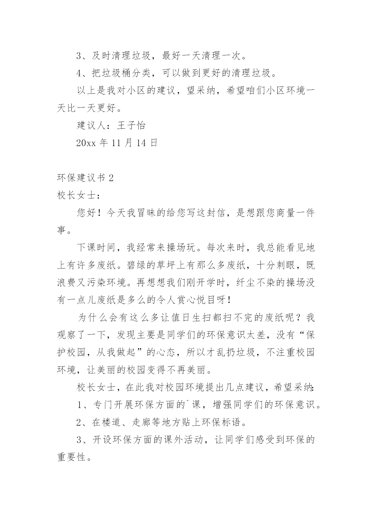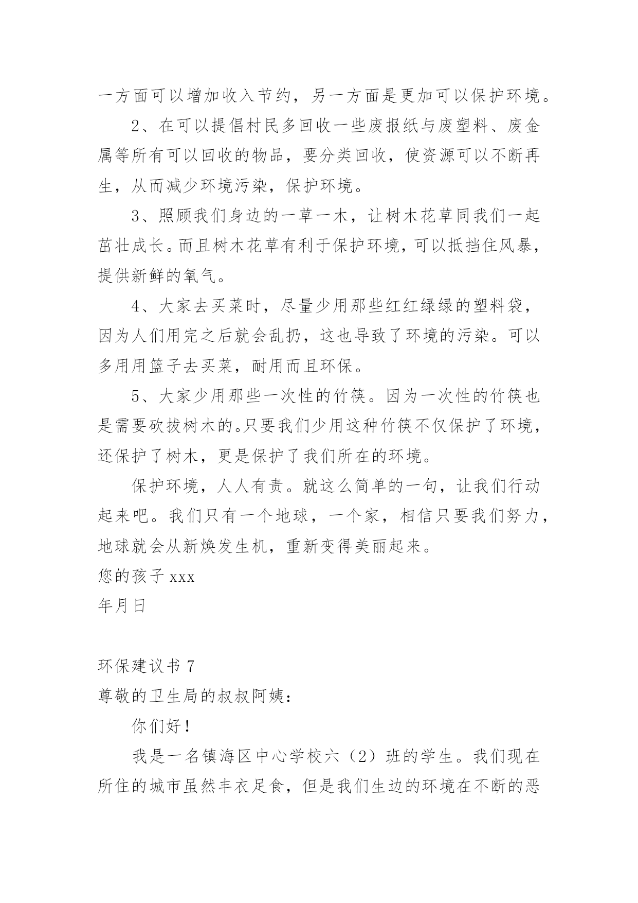 环保建议书环保建议书15篇【实用】在不断进步的时代,建议书的使用越来越广泛,建议书是一连串的管理实践,往往有着至关重要的作用。相信写建议书是一个让许多人都头痛的问题,下面是小编整理的环保建议书,欢迎大家分享。环保建议书1物业叔叔:您好!今天写这封信,是想向您反映一件事。近几年,尽管咱们小区每个单元门口前都有垃圾桶,但是,垃圾桶周围的垃圾到处都是。每当我从单元门走出时,都会闻见一股怪怪的.味道。这也对我们小区里许多人造成了影响。最近,我也在关注这个问题。原来,是一些居民们在扔垃圾时。并不是走向垃圾桶前扔下去,而是,从远处投向垃圾桶。如果投进去就是幸运好,如果投不进去,也不上前捡起。面对这一现象,并没有人去阻止。并且,咱们小区不能及时清理垃圾。久而久之,垃圾桶周围又臭又脏。物业叔叔,在此我向您提出几点建议,希望您能采纳。1、可以在垃圾桶旁边立一个标志牌或开展一个小活动,提醒大家注意保护环境,不要乱扔垃圾。2、多派一些管理人员,来阻止大家这种不良习惯。3、及时清理垃圾,最好一天清理一次。4、把垃圾桶分类,可以做到更好的清理垃圾。以上是我对小区的建议,望采纳,希望咱们小区环境一天比一天更好。建议人:王子怡20xx年11月14日环保建议书2校长女士:您好!今天我冒昧的给您写这封信,是想跟您商量一件事。下课时间,我经常来操场玩。每次来时,我总能看见地上有许多废纸。碧绿的草坪上有那么多废纸,十分刺眼,既浪费又污染环境。再想想我们刚开学时,纤尘不染的操场没有一点儿废纸是多么的令人赏心悦目呀!为什么会有这么多让值日生扫都扫不完的废纸呢?我观察了一下,发现主要是同学们的环保意识太差,没有“保护校园,从我做起”的心态,所以才乱扔垃圾,不注重校园环境,让美丽的校园变得不再美丽。校长女士,在此我对校园环境提出几点建议,希望采纳:1、专门开展环保方面的`课,增强同学们的环保意识。2、在楼道、走廊等地方贴上环保标语。3、开设环保方面的课外活动,让同学们感受到环保的重要性。以上是我的几点建议,希望可以让我们的校园重新变得干净、整洁。建议人:聂晶彤20xx年10月28日环保建议书3环保是全中国人民的大事,也是我们每个小学生应该参与的大事。我作为一个小学五年级的学生应该积极的投入到环保中去,让环保意识深入到每个人的心中,使每一个人自觉做到我环保我参与。我家门前有一条通往城镇的旅游大道,每逢星期六。星期天或节假日总有不少游客,去来都要经过这条旅游大道,有的游客自觉参与在环保中,他们将随身携带的食品包装物等废品收集在一起放在垃圾堆上;有的游客却不是这样,他们将吃过的食品包装物和各类饮料瓶。矿泉水瓶随地乱扔乱丢,弄的满地都是脏物,严重的影响了游客的行走,也给这条道路的容貌抹上了黑,这些人的环保意识也太差了。他们的这些不良行为,我看在眼里记在心上,我想;我要自觉参与环保。于是,我拿着竹篓和火钳,沿路将他们丢下的废物一点一点的捡到竹篓内,然后带回家中把它烧掉,这样我从小学三年级直到现在都是这样做的。附近的爷爷奶奶。伯伯叔叔。阿姨大姐他们给我送了一个光荣的好听的绰号,称我是个“小环保”。我的环保意识还得从很小说起,三岁的我,爷爷奶奶爸爸妈妈就叫我讲卫生,并叫我扫地擦桌子,把东西及用品收拾的干干净净。整整齐齐。还叫我不要随地乱丢瓜果皮和废物,不要随地吐痰,要保持屋前屋后的整齐和干净。并带我把屋边周围的空地栽上绿化树。种上美丽的花草,让屋前屋后漂漂亮亮,让来客一见心情舒畅。后来,上幼儿园和小学一二级的时候,每个老师也是这样教育我的,所以,我从小就有一个良好的环保意识。现在我体会到;环保要体现在每件小事中,随时随地应该做到,这样,我就做到了我环保我参与。环保,从我做起在现今,优于人们无穷无尽地开采资源,大自然遭到了严重的.破坏。为了拯救奄奄一息的地球,世界各地都纷纷号召人们保护环境、珍惜元,我也参与其中并乐在其中。一个星期天,我在家里发现有许多废旧塑料、纸张??各种各样,但它们都是相同的待遇??送去垃圾场。我心想:这些物品都能循环时用,如果不能物尽其用真是太可惜了,何不做一个可分类的垃圾箱呢?对!说干就干!首先,像别的大城市的垃圾桶那样,做两个箱,非为可回收垃圾不可回收垃圾,涂上一些颜色后让人容易分辨,垃圾箱就完成了。我的“杰作”诞生,家人也慢慢接受了,还真给全家带来不少好处呢:我家离倒垃圾的垃圾场很远,又没有人上来收。每次妈妈拿着大包小包的垃圾去倒是,汗流浃背,气喘吁吁,现在轻松多了,别人问妈妈为什么用这么少垃圾,当他们知道变废为宝的好处后,还要向我们学习呢。此外,我觉得光是进行垃圾分类还不够,还要尽力地节约谁资源。在家里,妈妈洗脸的刚想倒掉时,我阻止了她,并说水还可以循环使用,不要浪费;在学校,那个水龙头滴水,我一定把它拧紧。万物之泉,水,不得不珍惜。如果全省、全国,乃至