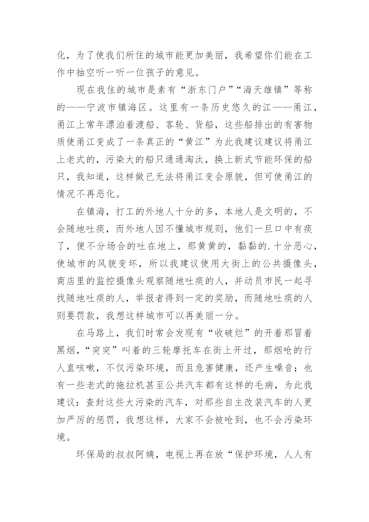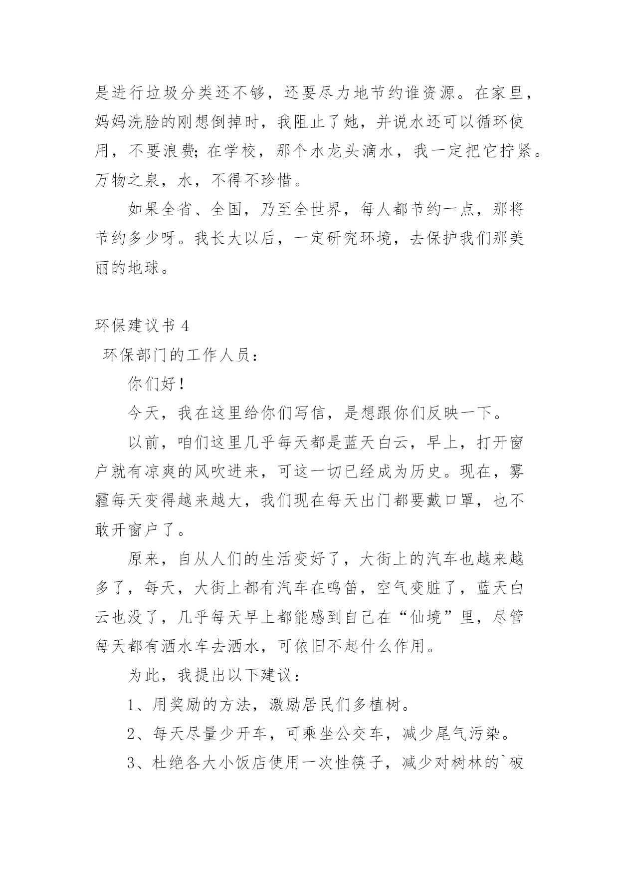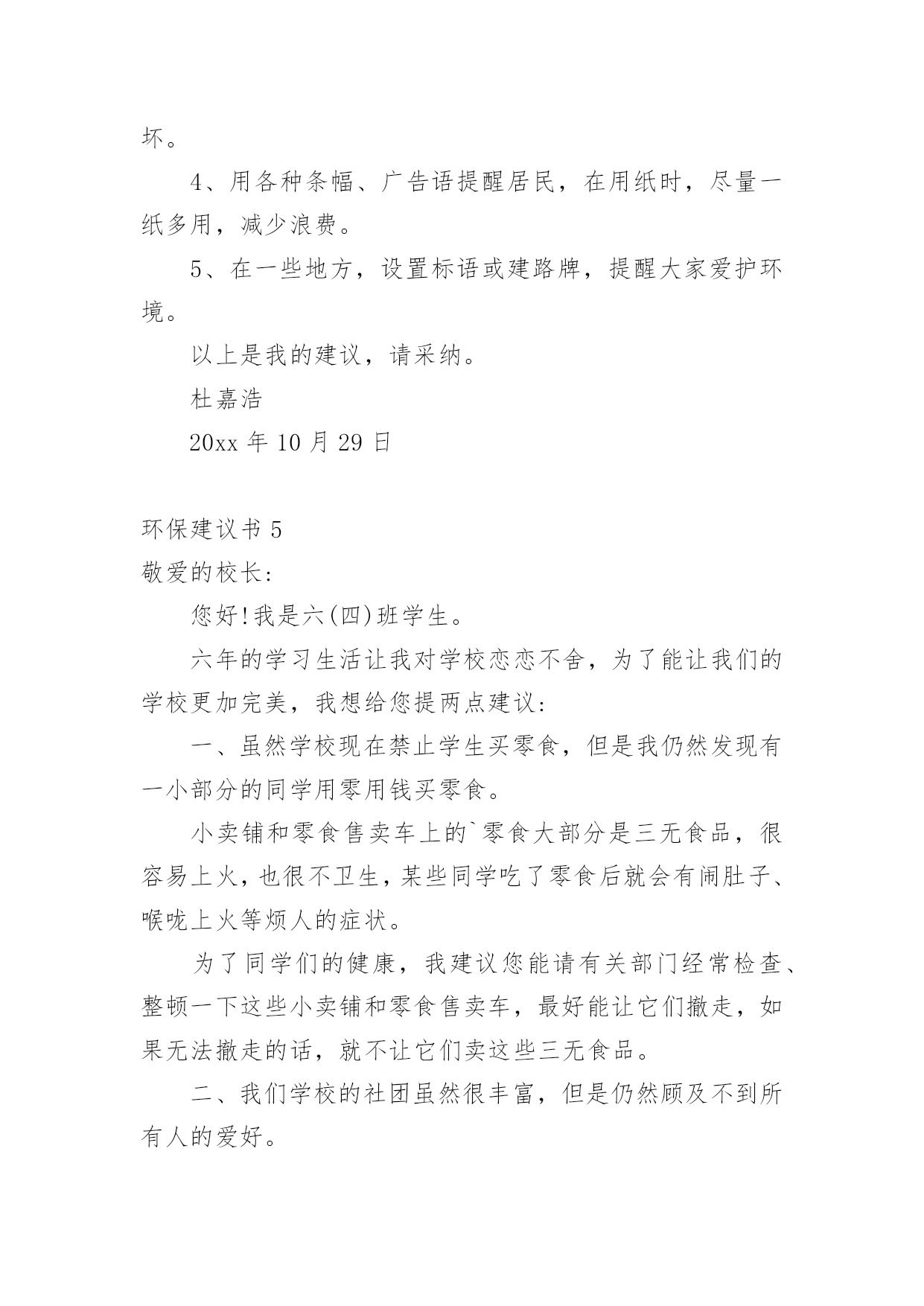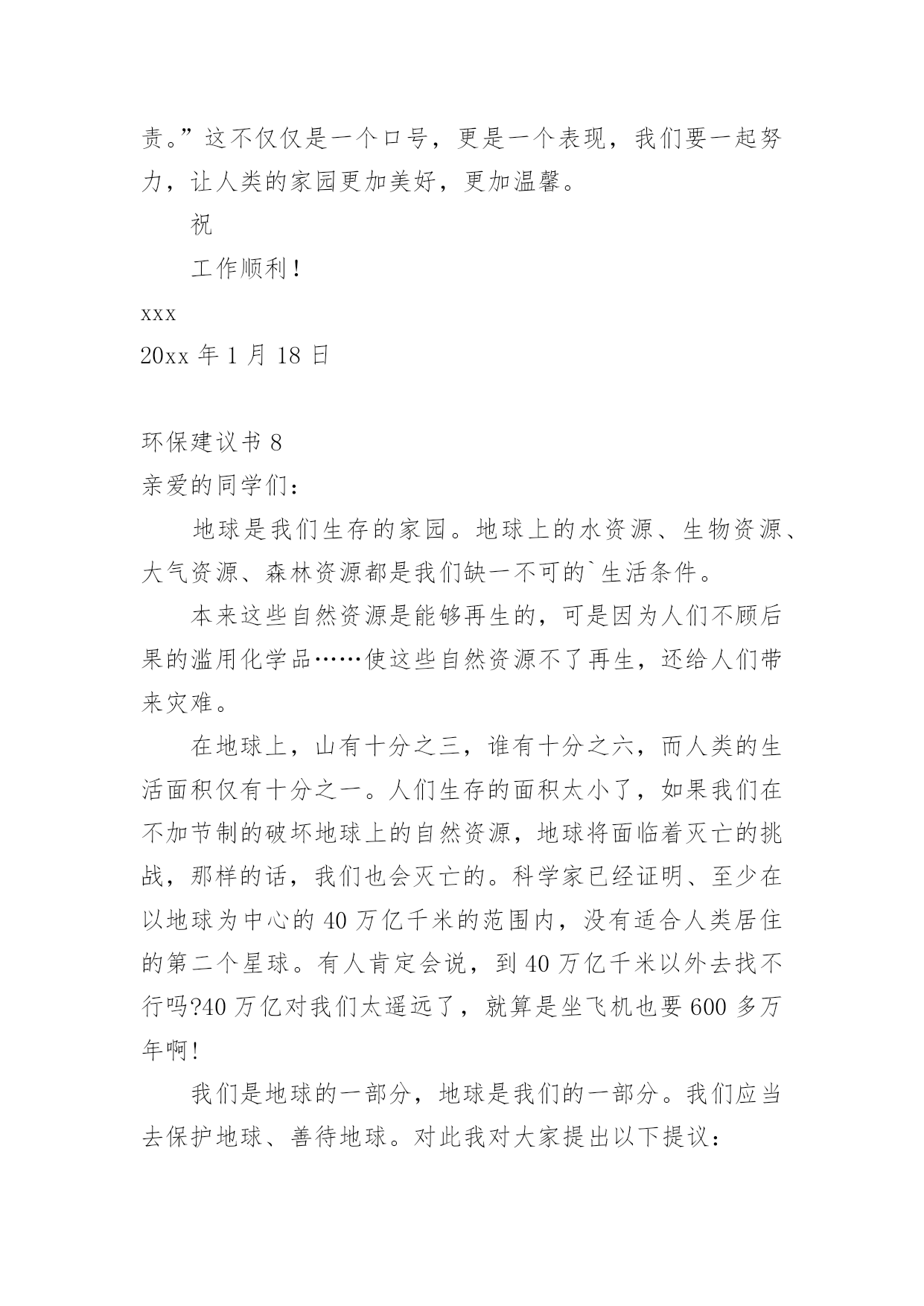环保建议书环保建议书15篇【实用】在不断进步的时代,建议书的使用越来越广泛,建议书是一连串的管理实践,往往有着至关重要的作用。相信写建议书是一个让许多人都头痛的问题,下面是小编整理的环保建议书,欢迎大家分享。环保建议书1物业叔叔:您好!今天写这封信,是想向您反映一件事。近几年,尽管咱们小区每个单元门口前都有垃圾桶,但是,垃圾桶周围的垃圾到处都是。每当我从单元门走出时,都会闻见一股怪怪的.味道。这也对我们小区里许多人造成了影响。最近,我也在关注这个问题。原来,是一些居民们在扔垃圾时。并不是走向垃圾桶前扔下去,而是,从远处投向垃圾桶。如果投进去就是幸运好,如果投不进去,也不上前捡起。面对这一现象,并没有人去阻止。并且,咱们小区不能及时清理垃圾。久而久之,垃圾桶周围又臭又脏。物业叔叔,在此我向您提出几点建议,希望您能采纳。1、可以在垃圾桶旁边立一个标志牌或开展一个小活动,提醒大家注意保护环境,不要乱扔垃圾。2、多派一些管理人员,来阻止大家这种不良习惯。3、及时清理垃圾,最好一天清理一次。4、把垃圾桶分类,可以做到更好的清理垃圾。以上是我对小区的建议,望采纳,希望咱们小区环境一天比一天更好。建议人:王子怡20xx年11月14日环保建议书2校长女士:您好!今天我冒昧的给您写这封信,是想跟您商量一件事。下课时间,我经常来操场玩。每次来时,我总能看见地上有许多废纸。碧绿的草坪上有那么多废纸,十分刺眼,既浪费又污染环境。再想想我们刚开学时,纤尘不染的操场没有一点儿废纸是多么的令人赏心悦目呀!为什么会有这么多让值日生扫都扫不完的废纸呢?我观察了一下,发现主要是同学们的环保意识太差,没有“保护校园,从我做起”的心态,所以才乱扔垃圾,不注重校园环境,让美丽的校园变得不再美丽。校长女士,在此我对校园环境提出几点建议,希望采纳:1、专门开展环保方面的`课,增强同学们的环保意识。2、在楼道、走廊等地方贴上环保标语。3、开设环保方面的课外活动,让同学们感受到环保的重要性。以上是我的几点建议,希望可以让我们的校园重新变得干净、整洁。建议人:聂晶彤20xx年10月28日环保建议书3环保是全中国人民的大事,也是我们每个小学生应该参与的大事。我作为一个小学五年级的学生应该积极的投入到环保中去,让环保意识深入到每个人的心中,使每一个人自觉做到我环保我参与。我家门前有一条通往城镇的旅游大道,每逢星期六。星期天或节假日总有不少游客,去来都要经过这条旅游大道,有的游客自觉参与在环保中,他们将随身携带的食品包装物等废品收集在一起放在垃圾堆上;有的游客却不是这样,他们将吃过的食品包装物和各类饮料瓶。矿泉水瓶随地乱扔乱丢,弄的满地都是脏物,严重的影响了游客的行走,也给这条道路的容貌抹上了黑,这些人的环保意识也太差了。他们的这些不良行为,我看在眼里记在心上,我想;我要自觉参与环保。于是,我拿着竹篓和火钳,沿路将他们丢下的废物一点一点的捡到竹篓内,然后带回家中把它烧掉,这样我从小学三年级直到现在都是这样做的。附近的爷爷奶奶。伯伯叔叔。阿姨大姐他们给我送了一个光荣的好听的绰号,称我是个“小环保”。我的环保意识还得从很小说起,三岁的我,爷爷奶奶爸爸妈妈就叫我讲卫生,并叫我扫地擦桌子,把东西及用品收拾的干干净净。整整齐齐。还叫我不要随地乱丢瓜果皮和废物,不要随地吐痰,要保持屋前屋后的整齐和干净。并带我把屋边周围的空地栽上绿化树。种上美丽的花草,让屋前屋后漂漂亮亮,让来客一见心情舒畅。后来,上幼儿园和小学一二级的时候,每个老师也是这样教育我的,所以,我从小就有一个良好的环保意识。现在我体会到;环保要体现在每件小事中,随时随地应该做到,这样,我就做到了我环保我参与。环保,从我做起在现今,优于人们无穷无尽地开采资源,大自然遭到了严重的.破坏。为了拯救奄奄一息的地球,世界各地都纷纷号召人们保护环境、珍惜元,我也参与其中并乐在其中。一个星期天,我在家里发现有许多废旧塑料、纸张??各种各样,但它们都是相同的待遇??送去垃圾场。我心想:这些物品都能循环时用,如果不能物尽其用真是太可惜了,何不做一个可分类的垃圾箱呢?对!说干就干!首先,像别的大城市的垃圾桶那样,做两个箱,非为可回收垃圾不可回收垃圾,涂上一些颜色后让人容易分辨,垃圾箱就完成了。我的“杰作”诞生,家人也慢慢接受了,还真给全家带来不少好处呢:我家离倒垃圾的垃圾场很远,又没有人上来收。每次妈妈拿着大包小包的垃圾去倒是,汗流浃背,气喘吁吁,现在轻松多了,别人问妈妈为什么用这么少垃圾,当他们知道变废为宝的好处后,还要向我们学习呢。此外,我觉得光是进行垃圾分类还不够,还要尽力地节约谁资源。在家里,妈妈洗脸的刚想倒掉时,我阻止了她,并说水还可以循环使用,不要浪费;在学校,那个水龙头滴水,我一定把它拧紧。万物之泉,水,不得不珍惜。如果全省、全国,乃至