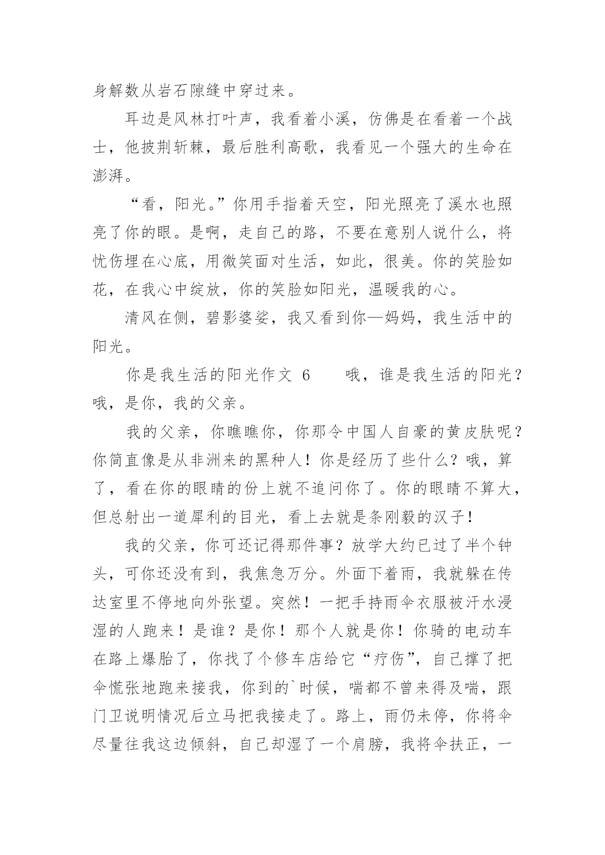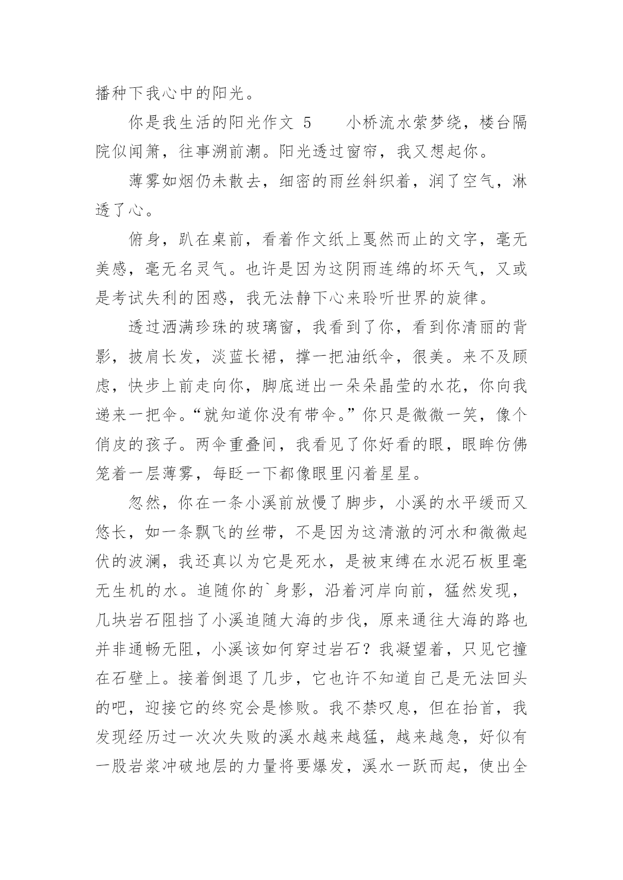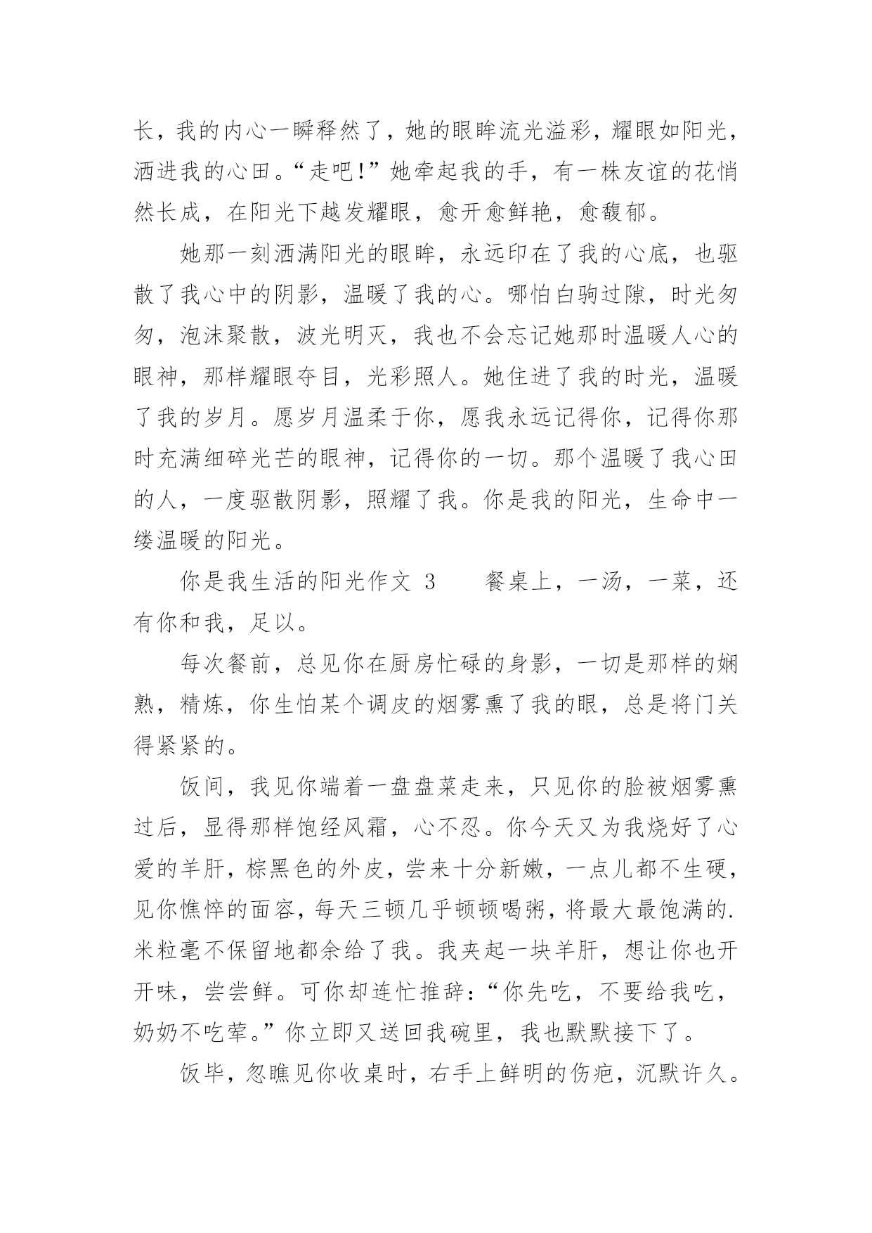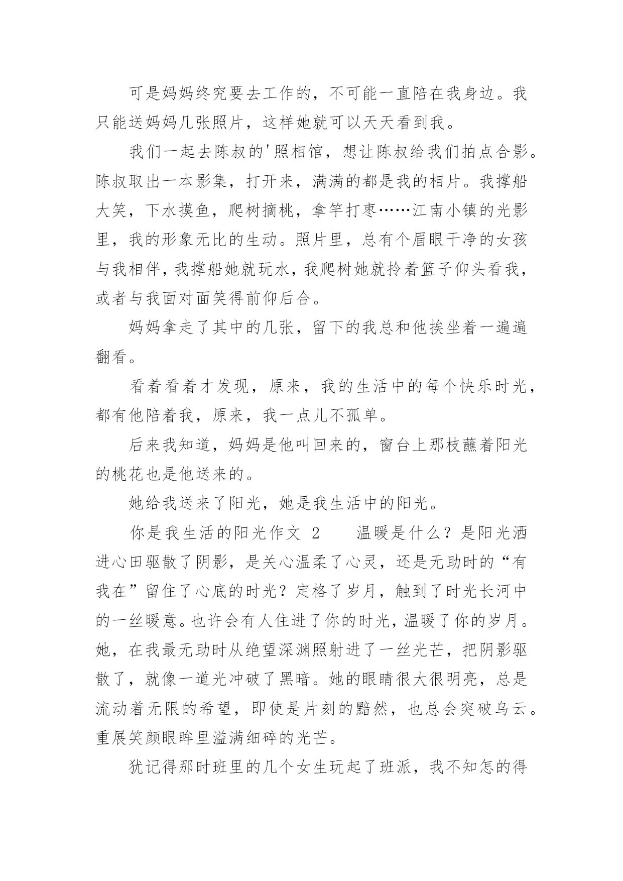 你是我生活的阳光作文精选你是我生活的阳光作文25篇在日常生活或是工作学习中,大家对作文都不陌生吧,作文要求篇章结构完整,一定要避免无结尾作文的出现。那么你知道一篇好的作文该怎么写吗?以下是小编为大家整理的精选你是我生活的阳光作文,仅供参考,希望能够帮助到大家。你是我生活的阳光作文1他小我两岁,听说陈姨怀她的时候怎么怎么着了,反正她是生下来就听不到的。她从小身体就不好,听说小学上跑操课时突然晕了,后来就不上学堂了。我是从小野到大的,镇里人都这么说。我和公公婆婆住,爸妈那时都在外地工作。我们桃花镇的水路四通八达,我常常一个人撑船玩。小船一路顺水而下,陈姨做的花糕香气也顺着水巷飘来。我把竹篙在船头一立,只要在糕坊前停留一会儿,她准会给我几个热腾腾香喷喷的花糕。而我呢,会把早晨刚折的桃花枝递给她,让她插在糕坊的招牌下面,这是我打小就做的“买卖”。他呢,坐在木凳上,望着我笑。没小孩愿意和他玩的——嫌她麻烦,我呢,正好嫌别的孩子吵,就凑合着带上她,摘摘莲蓬,打打青枣。陈叔,他的爸爸,也在水巷边开了个照相馆,没有客人的时候,就经常拿着相机对着我们比比划划。三月,听说市里面开了绘画比赛。不知道他从哪“听”来的,但消息是准的——市里来人通知了。我喜欢画画,没人玩的时候,就自己一个人画画。被先生追着在巷子里跑,测验总不过关,愁到不行的时候,我也画画。我画画的时候他常常在一边托着腮帮子看着,一点声音都没有。公公婆婆说我画得好,我怕他们眼花看不真,问了他和陈姨,她们也是点头的,我快活地举着画转圈,他也跟我一块儿转圈,咯咯地笑。可我隔天从树上摔了下来,断了右胳膊。这下好了,什么也别想了。听说这比赛再过一礼拜就开始了,听说这比赛好几年才会有一次,听说拿奖了可以当某先生的学生……不管怎样我都赶不上了,我的情绪越来越低落。他来看我了,她比个动作,我很烦:“疼!当然疼!要不你也摔断一下试试?”反正她也听不见,我的话就越说越难听,声音越来越大,还把她往门外推。我关上门,躲进被窝,哭了。他又进了屋,拍了拍我的肩,好像她才是姐姐。我拉下被子,对她大喊自己最想说的话:我想我爸爸妈妈了!我喊了好几遍,哭得很难看。三天后,窗台上瓶子里的桃花向我微笑的时候,妈妈回来了,她抱着我。她好久没有抱我了,我好久没有被她抱着了。那天妈妈摇船带我去了石桥南,桃花镇最美的地方就在那,桃花朵朵像云烟一样,轻轻的,一缕一缕,我和妈妈的笑声在桃花林里穿梭。可是妈妈终究要去工作的,不可能一直陪在我身边。我只能送妈妈几张照片,这样她就可以天天看到我。我们一起去陈叔的'照相馆,想让陈叔给我们拍点合影。陈叔取出一本影集,打开来,满满的都是我的相片。我撑船大笑,下水摸鱼,爬树摘桃,拿竿打枣……江南小镇的光影里,我的形象无比的生动。照片里,总有个眉眼干净的女孩与我相伴,我撑船她就玩水,我爬树她就拎着篮子仰头看我,或者与我面对面笑得前仰后合。妈妈拿走了其中的几张,留下的我总和他挨坐着一遍遍翻看。看着看着才发现,原来,我的生活中的每个快乐时光,都有他陪着我,原来,我一点儿不孤单。后来我知道,妈妈是他叫回来的,窗台上那枝蘸着阳光的桃花也是他送来的。她给我送来了阳光,她是我生活中的阳光。你是我生活的阳光作文2温暖是什么?是阳光洒进心田驱散了阴影,是关心温柔了心灵,还是无助时的“有我在”留住了心底的时光?定格了岁月,触到了时光长河中的一丝暖意。也许会有人住进了你的时光,温暖了你的岁月。她,在我最无助时从绝望深渊照射进了一丝光芒,把阴影驱散了,就像一道光冲破了黑暗。她的眼睛很大很明亮,总是流动着无限的希望,即使是片刻的黯然,也总会突破乌云。重展笑颜眼眸里溢满细碎的光芒。犹记得那时班里的几个女生玩起了班派,我不知怎的得罪了她们,随之而来的是孤立,精神的孤立。告诉你,你与她们不是一路人。那次上体育课,老师说自由活动,她们自然在一起一对一,而并没有人来找我。我坐在石阶上,抬头看着蓝天,天上只有几片白云,我的心里无限烦闷。夏的熏风吹来,将身上的热意微微吹散了点,可心里却有千军万马在行走,烦闷无时无刻在身旁。这时一道阴影遮住了光线,原来是她。脑中的记忆翻动,依稀记得她没有参与班派。她疑惑地问我:“沁瑜,你怎么坐在这?夏天太热会中暑的。”她并没有问我怎么没和人组队,不管无意有意。我最初的戒备降低了一层。她自顾自地坐下,阳光洒下来在她的脸上笼上一层金色的面纱,将她的眼眸照得流盼光亮,好像盛满了阳光。微风拂过,时而传出几阵躲在树梢上乘凉的小鸟的婉转低吟,我们谁也没有开口,一时气氛有些尴尬。她先开了口:“沁瑜其实我……也并不喜欢她们的作派,但是我觉得你也没必要躲着她们,你可以证明给她们看,她们那样,你依然可以重展笑顔,每天都快乐。”她短短的几句话,击溃了我的防线,她说话时诚挚的眼眸里划过的是“加油”。不知怎的,看到那样的眼神,我相