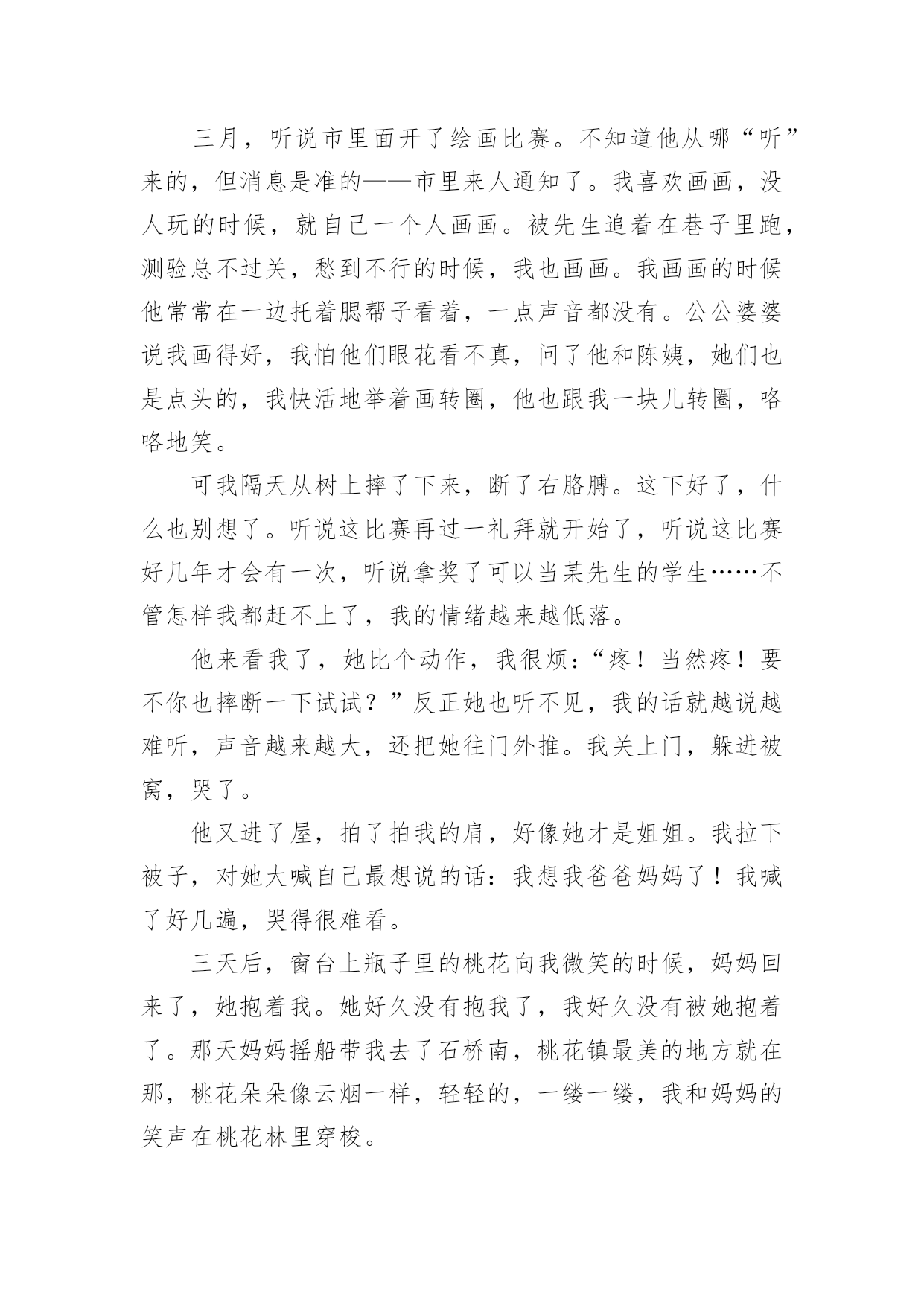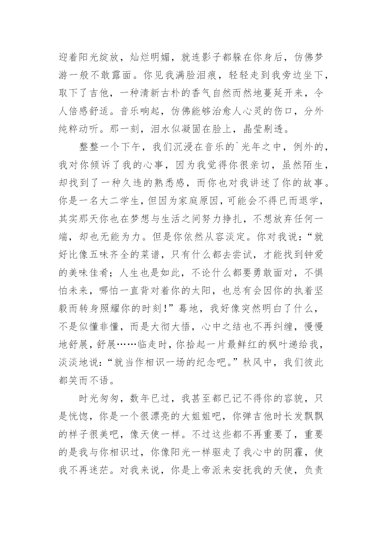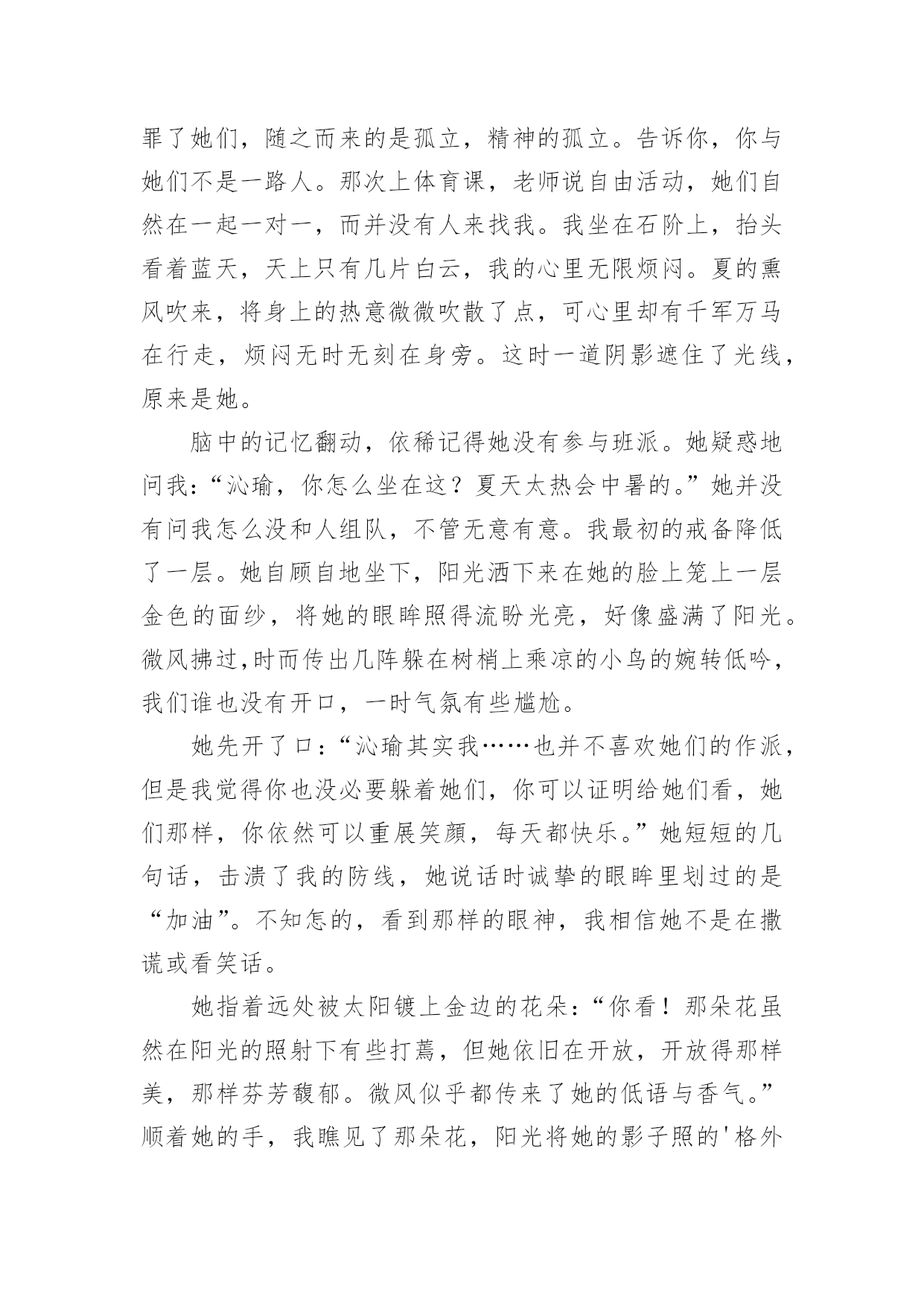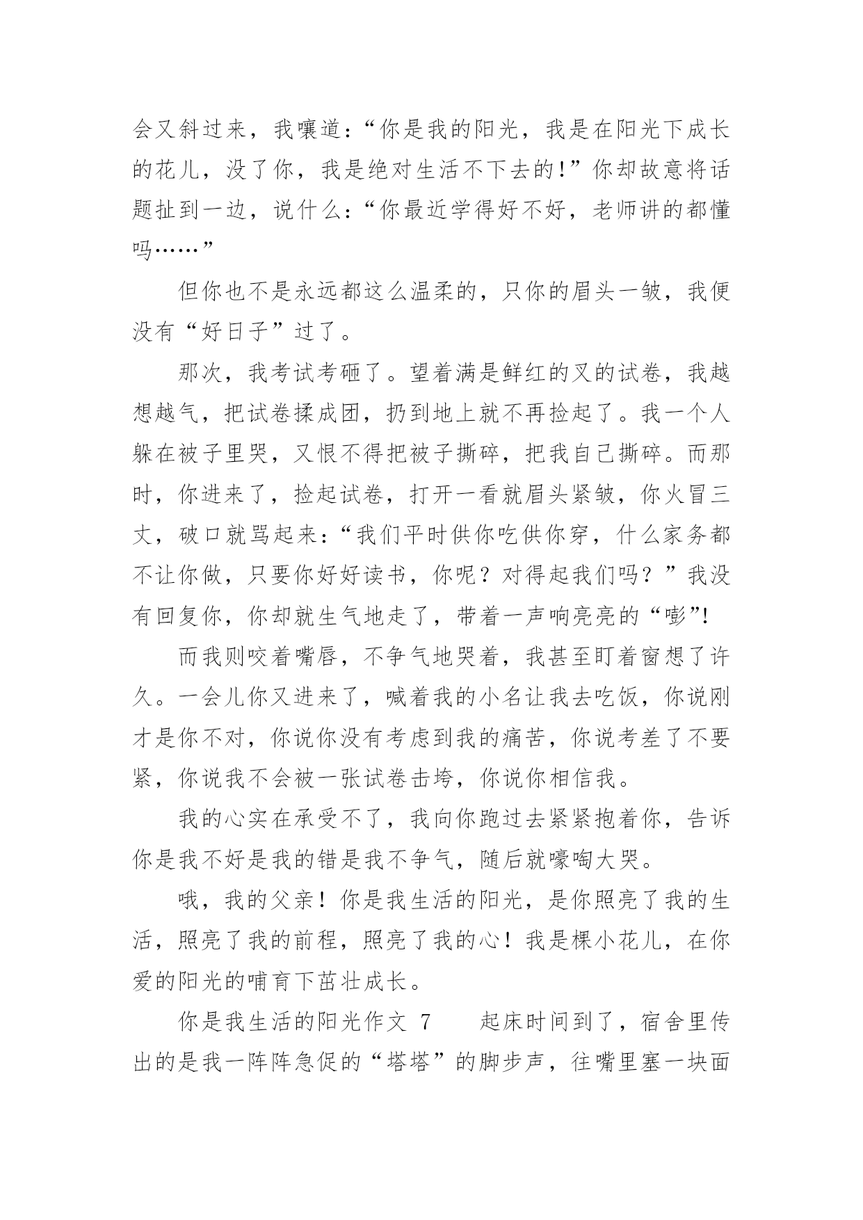 你是我生活的阳光作文精选你是我生活的阳光作文25篇在日常生活或是工作学习中,大家对作文都不陌生吧,作文要求篇章结构完整,一定要避免无结尾作文的出现。那么你知道一篇好的作文该怎么写吗?以下是小编为大家整理的精选你是我生活的阳光作文,仅供参考,希望能够帮助到大家。你是我生活的阳光作文1他小我两岁,听说陈姨怀她的时候怎么怎么着了,反正她是生下来就听不到的。她从小身体就不好,听说小学上跑操课时突然晕了,后来就不上学堂了。我是从小野到大的,镇里人都这么说。我和公公婆婆住,爸妈那时都在外地工作。我们桃花镇的水路四通八达,我常常一个人撑船玩。小船一路顺水而下,陈姨做的花糕香气也顺着水巷飘来。我把竹篙在船头一立,只要在糕坊前停留一会儿,她准会给我几个热腾腾香喷喷的花糕。而我呢,会把早晨刚折的桃花枝递给她,让她插在糕坊的招牌下面,这是我打小就做的“买卖”。他呢,坐在木凳上,望着我笑。没小孩愿意和他玩的——嫌她麻烦,我呢,正好嫌别的孩子吵,就凑合着带上她,摘摘莲蓬,打打青枣。陈叔,他的爸爸,也在水巷边开了个照相馆,没有客人的时候,就经常拿着相机对着我们比比划划。三月,听说市里面开了绘画比赛。不知道他从哪“听”来的,但消息是准的——市里来人通知了。我喜欢画画,没人玩的时候,就自己一个人画画。被先生追着在巷子里跑,测验总不过关,愁到不行的时候,我也画画。我画画的时候他常常在一边托着腮帮子看着,一点声音都没有。公公婆婆说我画得好,我怕他们眼花看不真,问了他和陈姨,她们也是点头的,我快活地举着画转圈,他也跟我一块儿转圈,咯咯地笑。可我隔天从树上摔了下来,断了右胳膊。这下好了,什么也别想了。听说这比赛再过一礼拜就开始了,听说这比赛好几年才会有一次,听说拿奖了可以当某先生的学生……不管怎样我都赶不上了,我的情绪越来越低落。他来看我了,她比个动作,我很烦:“疼!当然疼!要不你也摔断一下试试?”反正她也听不见,我的话就越说越难听,声音越来越大,还把她往门外推。我关上门,躲进被窝,哭了。他又进了屋,拍了拍我的肩,好像她才是姐姐。我拉下被子,对她大喊自己最想说的话:我想我爸爸妈妈了!我喊了好几遍,哭得很难看。三天后,窗台上瓶子里的桃花向我微笑的时候,妈妈回来了,她抱着我。她好久没有抱我了,我好久没有被她抱着了。那天妈妈摇船带我去了石桥南,桃花镇最美的地方就在那,桃花朵朵像云烟一样,轻轻的,一缕一缕,我和妈妈的笑声在桃花林里穿梭。可是妈妈终究要去工作的,不可能一直陪在我身边。我只能送妈妈几张照片,这样她就可以天天看到我。我们一起去陈叔的'照相馆,想让陈叔给我们拍点合影。陈叔取出一本影集,打开来,满满的都是我的相片。我撑船大笑,下水摸鱼,爬树摘桃,拿竿打枣……江南小镇的光影里,我的形象无比的生动。照片里,总有个眉眼干净的女孩与我相伴,我撑船她就玩水,我爬树她就拎着篮子仰头看我,或者与我面对面笑得前仰后合。妈妈拿走了其中的几张,留下的我总和他挨坐着一遍遍翻看。看着看着才发现,原来,我的生活中的每个快乐时光,都有他陪着我,原来,我一点儿不孤单。后来我知道,妈妈是他叫回来的,窗台上那枝蘸着阳光的桃花也是他送来的。她给我送来了阳光,她是我生活中的阳光。你是我生活的阳光作文2温暖是什么?是阳光洒进心田驱散了阴影,是关心温柔了心灵,还是无助时的“有我在”留住了心底的时光?定格了岁月,触到了时光长河中的一丝暖意。也许会有人住进了你的时光,温暖了你的岁月。她,在我最无助时从绝望深渊照射进了一丝光芒,把阴影驱散了,就像一道光冲破了黑暗。她的眼睛很大很明亮,总是流动着无限的希望,即使是片刻的黯然,也总会突破乌云。重展笑颜眼眸里溢满细碎的光芒。犹记得那时班里的几个女生玩起了班派,我不知怎的得罪了她们,随之而来的是孤立,精神的孤立。告诉你,你与她们不是一路人。那次上体育课,老师说自由活动,她们自然在一起一对一,而并没有人来找我。我坐在石阶上,抬头看着蓝天,天上只有几片白云,我的心里无限烦闷。夏的熏风吹来,将身上的热意微微吹散了点,可心里却有千军万马在行走,烦闷无时无刻在身旁。这时一道阴影遮住了光线,原来是她。脑中的记忆翻动,依稀记得她没有参与班派。她疑惑地问我:“沁瑜,你怎么坐在这?夏天太热会中暑的。”她并没有问我怎么没和人组队,不管无意有意。我最初的戒备降低了一层。她自顾自地坐下,阳光洒下来在她的脸上笼上一层金色的面纱,将她的眼眸照得流盼光亮,好像盛满了阳光。微风拂过,时而传出几阵躲在树梢上乘凉的小鸟的婉转低吟,我们谁也没有开口,一时气氛有些尴尬。她先开了口:“沁瑜其实我……也并不喜欢她们的作派,但是我觉得你也没必要躲着她们,你可以证明给她们看,她们那样,你依然可以重展笑顔,每天都快乐。”她短短的几句话,击溃了我的防线,她说话时诚挚的眼眸里划过的是“加油”。不知怎的,看到那样的眼神,我相
