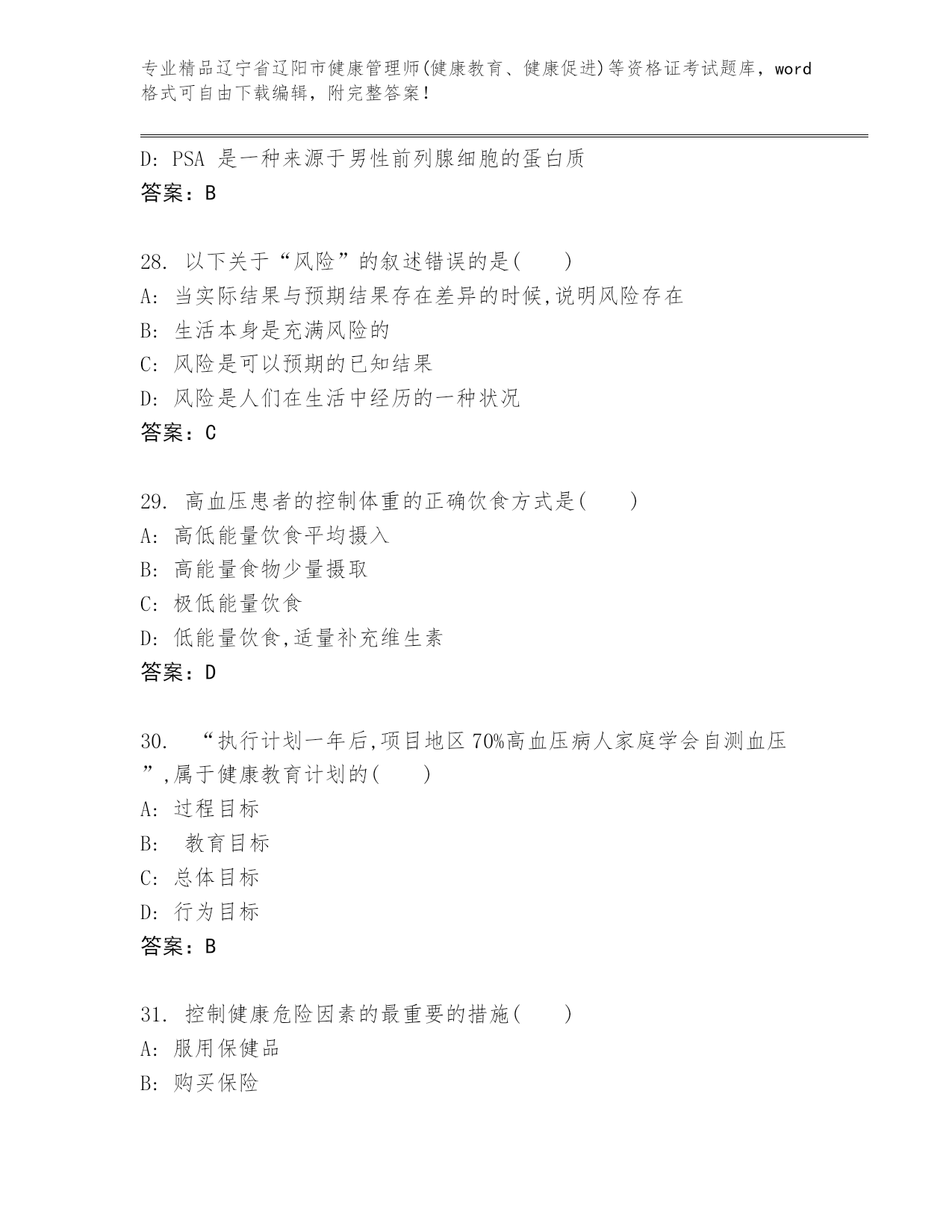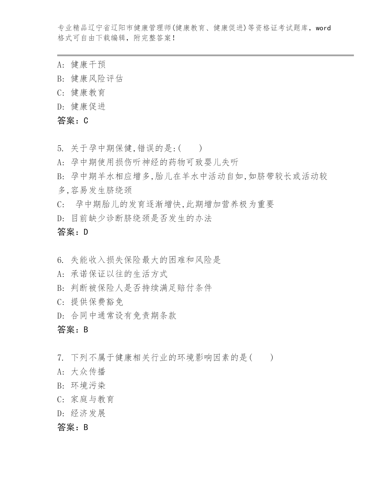 历年辽宁省辽阳市健康管理师(健康教育、健康促进)等资格证考试通用题库(典优)