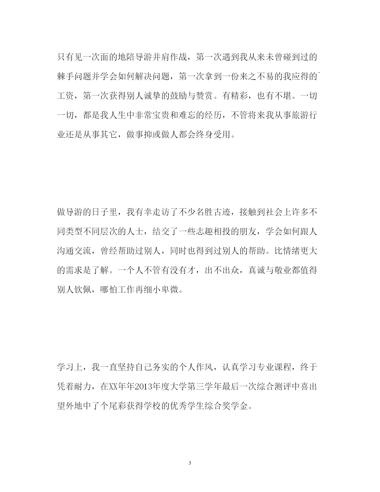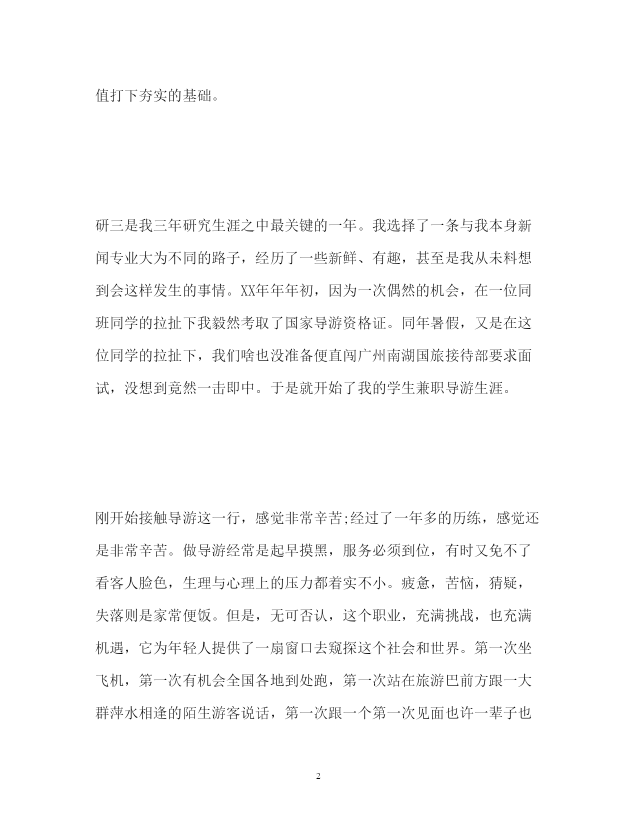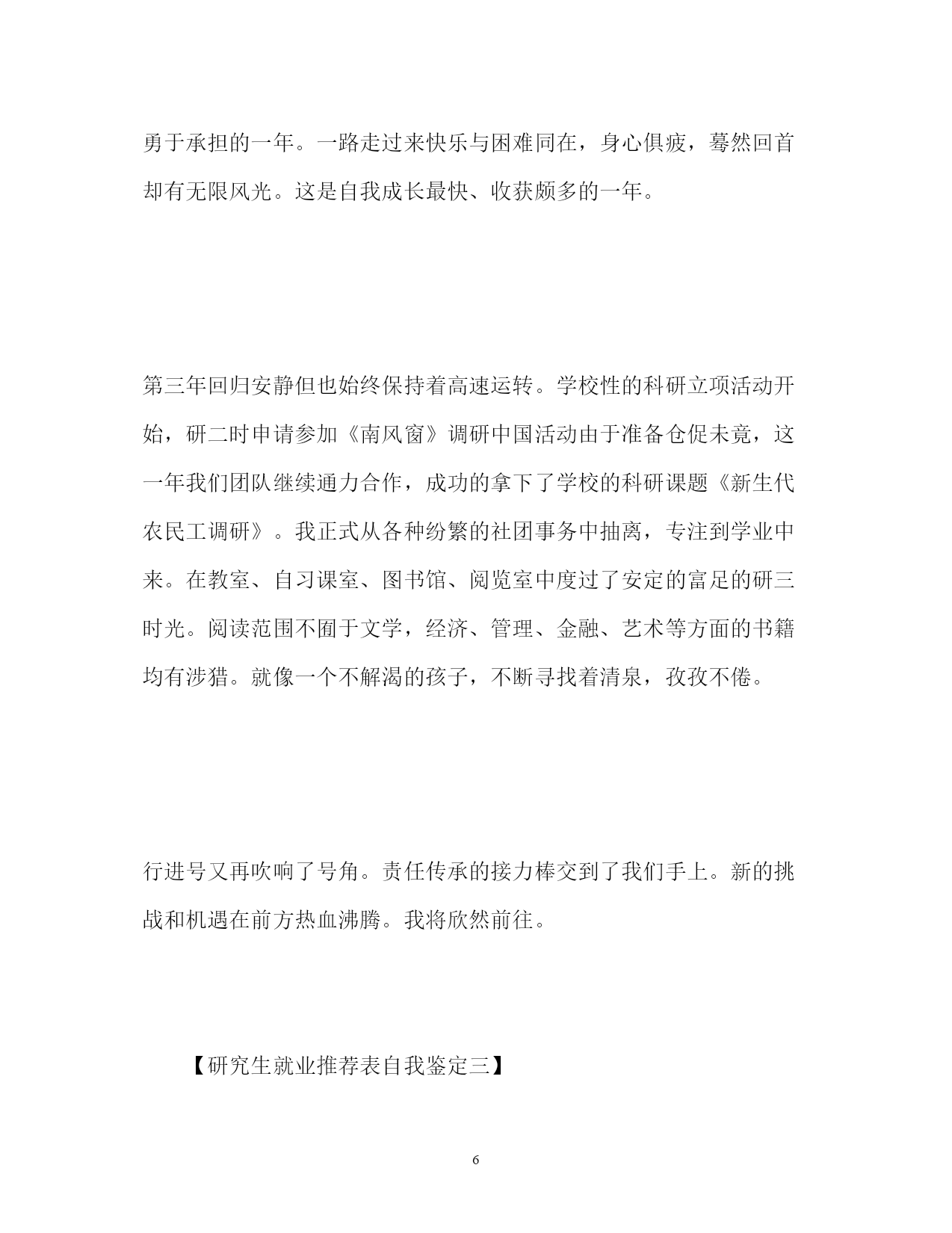 此资料由网络收集而来,如有侵权请告知上传者立即删除。资料共分享,我们负责传递知识。PAGEPAGE9研究生就业表自我鉴定填写研究生就业推荐表自我鉴定填写三年的研究生涯将在我的进步和忙碌中挥手说告别,这三年的时光是不再复返的,我努力我青春无悔。以下是我的硕士研究生自我鉴定的总结资料,请各位参考并提出宝贵建议。下面是关于研究生就业推荐表自我鉴定填写范文,欢迎阅读!【研究生就业推荐表自我鉴定一】硕士三年转瞬即逝,回首几年来的研究生生涯及社会实践生活,有甜有苦,有笑有泪,有成功也有失败。我孜孜不倦,凭着超强的战斗力,不断地挑战自我,充实自己,希望能为将来投身社会、实现人生价值打下夯实的基础。研三是我三年研究生涯之中最关键的一年。我选择了一条与我本身新闻专业大为不同的路子,经历了一些新鲜、有趣,甚至是我从未料想到会这样发生的事情。XX年年年初,因为一次偶然的机会,在一位同班同学的拉扯下我毅然考取了国家导游资格证。同年暑假,又是在这位同学的拉扯下,我们啥也没准备便直闯广州南湖国旅接待部要求面试,没想到竟然一击即中。于是就开始了我的学生兼职导游生涯。刚开始接触导游这一行,感觉非常辛苦;经过了一年多的历练,感觉还是非常辛苦。做导游经常是起早摸黑,服务必须到位,有时又免不了看客人脸色,生理与心理上的压力都着实不小。疲惫,苦恼,猜疑,失落则是家常便饭。但是,无可否认,这个职业,充满挑战,也充满机遇,它为年轻人提供了一扇窗口去窥探这个社会和世界。第一次坐飞机,第一次有机会全国各地到处跑,第一次站在旅游巴前方跟一大群萍水相逢的陌生游客说话,第一次跟一个第一次见面也许一辈子也只有见一次面的地陪导游并肩作战,第一次遇到我从来未曾碰到过的棘手问题并学会如何解决问题,第一次拿到一份来之不易的我应得的`工资,第一次获得别人诚挚的鼓励与赞赏。有精彩,也有不堪。一切一切,都是我人生中非常宝贵和难忘的经历,不管将来我从事旅游行业还是从事其它,做事抑或做人都会终身受用。做导游的日子里,我有幸走访了不少名胜古迹,接触到社会上许多不同类型不同层次的人士,结交了一些志趣相投的朋友,学会如何跟人沟通交流,曾经帮助过别人,同时也得到过别人的帮助。比情绪更大的需求是了解。一个人不管有没有才,出不出众,真诚与敬业都值得别人钦佩,哪怕工作再细小卑微。学习上,我一直坚持自己务实的个人作风,认真学习专业课程,终于凭着耐力,在XX年年2013年度大学第三学年最后一次综合测评中喜出望外地中了个尾彩获得学校的优秀学生综合奖学金。工作上,我还稚嫩也欠缺经验。但我年轻并充满热情。我有顽强的战斗力,自信能凭自己的能力和学识在毕业以后的工作和生活中克服各种困难,实现自我目标及人生价值。【研究生就业推荐表自我鉴定二】时光如水,岁月如歌。硕士生涯是一曲蕴含了张扬、紧张、收获的丰富旋律。在XX大学这个快乐集体里,我做了很多第一次的尝试,第一次主持主题班会、第一次独立采访、第一次主持户外采风、采访活动、第一次认真关注弱势群体、第一次和弱势群体组织深入交流开展活动……这个集体给了我一方自由舒展的天地,在必要的时候也给我帮助和精神支持。XX大学的每一年对我而言都有不同的重要意义。第一年是多姿多彩的。在学院任宣传部干事、学生性的公益社团新视野中任采编部干事期间,丰富的班级活动、各种社团活动让我尽情地满足兴趣、挥洒汗水。在专业基础课的学习中,对汉语言文学专业有了初步的认识,明确今后的学习和研究方向。第二年我选择留任于学生性公益社团新视野,担任采编部部长一职。在职期间,主持户外采风、实地走访等活动,和社会上公益性团体如乐助会、麦田计划等展开交流与合作。关注学校农民工的生存状况,深入了解饭堂女工、校园保安等群体的工作状况,对一些值得大学生反思的问题和举动予以关注并以定期的图文展览形式与校内的同学共同探讨,主持社团年刊的采编工作。这是在责任中学会理解、包容、勇于承担的一年。一路走过来快乐与困难同在,身心俱疲,蓦然回首却有无限风光。这是自我成长最快、收获颇多的一年。第三年回归安静但也始终保持着高速运转。学校性的科研立项活动开始,研二时申请参加《南风窗》调研中国活动由于准备仓促未竟,这一年我们团队继续通力合作,成功的拿下了学校的科研课题《新生代农民工调研》。我正式从各种纷繁的社团事务中抽离,专注到学业中来。在教室、自习课室、图书馆、阅览室中度过了安定的富足的研三时光。阅读范围不囿于文学,经济、管理、金融、艺术等方面的书籍均有涉猎。就像一个不解渴的孩子,不断寻找着清泉,孜孜不倦。行进号又再吹响了号角。责任传承的接力棒交到了我们手上。新的挑战和机遇在前方热血沸腾。我将欣然前往。【研究生就业推荐表自我鉴定三