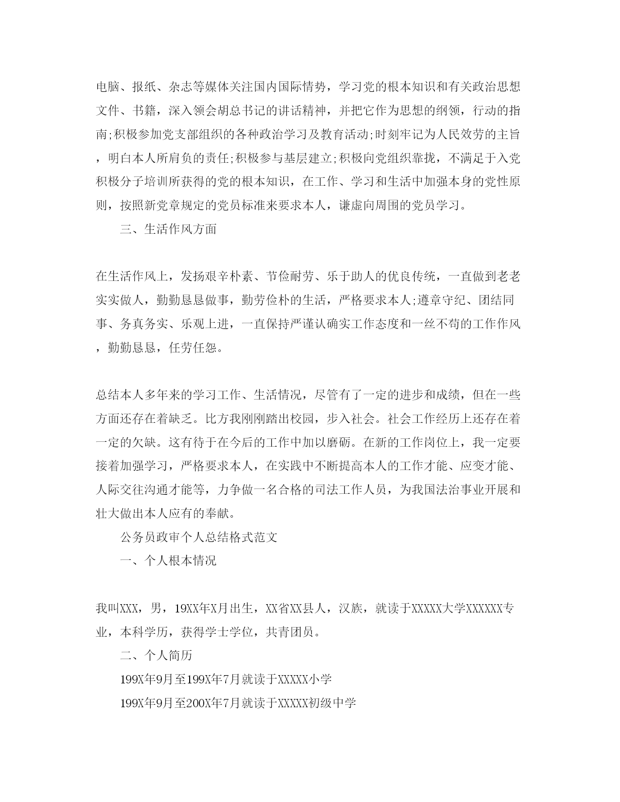 公务员政审个人参考总结格式范文公务员政审个人总结格式范文我叫XXX,女,于19XX年x月出生于XX省XX县,X族。20xx年x月进入XXXX学校法学专业学习,20xx年x月毕业,学制四年,大学本科学历,共青团员。毕业至今在XXX单位任职。20xx年x月,本人参加了XX省公务员考试,报考了XX职位,有幸以优良的成绩成为拟录用人员,如今我马上开场人生的另一段旅程,并逐步完成从事业单位到机关公务员的这种环境和角色的双重转变和习惯。为了能更好的走向工作岗位,让领导对我有更深的理解,现对本人以往的学习、工作、思想、生活情况做如下小结。一、学习工作方面在大学期间,本人恪守国家法律、学校纪律,作为一名法学专业的学生,在日常生活中以课堂所学为根底,培养本人的法律认识,通过教师的教诲、同学的协助以及本人的努力,认真学习、打下了扎实的法学根底。参加工作以来,围绕本职中心工作,对照相关标准,严以律己,较好的完成各项工作任务;同时,认真学习相关业务知识,不断提高本人的理论水平和综合素养;严格恪守单位制定的各项工作制度,积极参加单位组织的各项活动,谦虚向有经历的同志请教工作上的咨询题,学习他们的先进经历和知识;敢于吃苦、擅长研究,能按规定的时间与程序办事,较好地完成领导交办的工作;同时积极主动配合其他部门工作的开展,不断提高工作效能。二、思想政治方面在思想上,本人认真学习邓小平理论、领会党的道路方针政策精神,利用电视、电脑、报纸、杂志等媒体关注国内国际情势,学习党的根本知识和有关政治思想文件、书籍,深入领会胡总书记的讲话精神,并把它作为思想的纲领,行动的指南;积极参加党支部组织的各种政治学习及教育活动;时刻牢记为人民效劳的主旨,明白本人所肩负的责任;积极参与基层建立;积极向党组织靠拢,不满足于入党积极分子培训所获得的党的根本知识,在工作、学习和生活中加强本身的党性原则,按照新党章规定的党员标准来要求本人,谦虚向周围的党员学习。三、生活作风方面在生活作风上,发扬艰辛朴素、节俭耐劳、乐于助人的优良传统,一直做到老老实实做人,勤勤恳恳做事,勤劳俭朴的生活,严格要求本人;遵章守纪、团结同事、务真务实、乐观上进,一直保持严谨认确实工作态度和一丝不苟的工作作风,勤勤恳恳,任劳任怨。总结本人多年来的学习工作、生活情况,尽管有了一定的进步和成绩,但在一些方面还存在着缺乏。比方我刚刚踏出校园,步入社会。社会工作经历上还存在着一定的欠缺。这有待于在今后的工作中加以磨砺。在新的工作岗位上,我一定要接着加强学习,严格要求本人,在实践中不断提高本人的工作才能、应变才能、人际交往沟通才能等,力争做一名合格的司法工作人员,为我国法治事业开展和壮大做出本人应有的奉献。公务员政审个人总结格式范文一、个人根本情况我叫XXX,男,19XX年X月出生,XX省XX县人,汉族,就读于XXXXX大学XXXXXX专业,本科学历,获得学士学位,共青团员。二、个人简历199X年9月至199X年7月就读于XXXXX小学199X年9月至200X年7月就读于XXXXX初级中学200X年9月至200X年7月就读于XXXXX高级中学200X年9月至200X年7月就读于XXXXX大学三、学习、工作情况在校期间,我时刻将学习作为我的第一要务。我学的是XXXX专业,通过四年的系统学习,我已具备扎实的专业知识,在学习课本知识、掌握专业理论的同时,我积极培养本人的动手实践才能和处理实际咨询题的技能。同时,为了扩大知识面,我在课外时间阅读了大量哲学、政治、经济、法律、治理等方面的书籍,使本人能够成为一名具备丰富科学文化知识和过硬的专业技能的合格的跨世纪大学生。课余生活我留意培养、开展本人的兴趣和专长,在文笔写作和美术方面有一定功底,曾屡次参与学院宣传活动的材料撰写和图画绘制。大学期间我先后在班委、学院学生会、学校社团等担任学生干部,得到了教师和同学的一致好评,我的协调组织才能得到了非常好的锻炼和提高。课余时间,我积极参加学校组织的社会实践活动和志愿者效劳活动,认真完成专业实践和实习安排,使本人能够学习与实践相结合,学以致用,在实践过程中更提高了我发觉咨询题、分析咨询题、处理咨询题的才能,提高了我综合运用知识的才能。在生活上,我严格要求本人,节俭节约,团结同学,尊敬师长,友好和蔼地对待每一个人,坚持自我检查和自我反省。大学的学习让我认识到:要成为一名合格的社会主义接班人,必须有成熟可靠的思想素养和政治觉悟。因而,在日常的学习工作中我不断认真学习党的各项政策、方针,领会和总结党的重要思想的原理和在实践中的运用。大四学年我交了入党申请书,并从那时起,我就以一名党员的标准严格要求本人,以一名党员的标准标准本人的学习和工作,并认真恪守校规校纪、法律法规,拥护党和政府的领导方针,保持政治上的纯