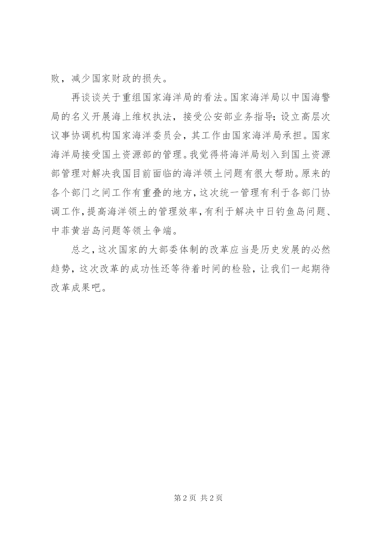 第PAGE\*Arabic\*MERGEFORMAT2页共NUMPAGES\*MERGEFORMAT2页关于两会的理论学习报告两会的大幕刚刚结束,又到了我们党员进行理论学习的时候了。这次我主要谈谈对国务院大部委制改革的看法,其中又主要讲关于撤销铁道部和重组国家海洋局的改革的看法。先谈谈什么是大部委制改革,有人说它的实质是一种权力结构的重构,政府运行体系和运行机制的一种重新确立,不能简单理解为部门间的简单合并,合并只是形式。大部委制改革简单地说就是对国家机构的精简,让有些原来看似权力分散的机构组并到一起,成为一个个有机的整体,更好地来处理国家事务,使之更加高效、协调地运转。先谈谈国务院撤销铁道部的决议吧。第十二届全国人大一次会议提出要将铁路发展规划和政策的行政职责划入交通运输部管理,不再保留铁道部。组建国家铁路总局,承担铁道部的其他行政职责,负责拟定铁路技术标准,监督管理铁路安全生产、运输服务质量和铁路工程质量等。组建中国铁路总公司,承担铁道部的企业职责。铁道部撤销的一个重要原因是铁路票价偏低,因此铁道部长年处于亏损的状态。将铁道部投入市场化运营可以有效缓解这一状况。但是这部分资金要靠老百姓来承担,因此铁道部被撤销后,民众最关心的是票价上涨的问题。当然这也要看政府的补贴政策是否能合民意。相信政府能给群众一个满意的答复。铁道部撤销后实行政企分开的管理,有利于防止铁路高管滋生腐败,减少国家财政的损失。再谈谈关于重组国家海洋局的看法。国家海洋局以中国海警局的名义开展海上维权执法,接受公安部业务指导;设立高层次议事协调机构国家海洋委员会,其工作由国家海洋局承担。国家海洋局接受国土资源部的管理。我觉得将海洋局划入到国土资源部管理对解决我国目前面临的海洋领土问题有很大帮助。原来的各个部门之间工作有重叠的地方,这次统一管理有利于各部门协调工作,提高海洋领土的管理效率,有利于解决中日钓鱼岛问题、中菲黄岩岛问题等领土争端。总之,这次国家的大部委体制的改革应当是历史发展的必然趋势,这次改革的成功性还等待着时间的检验,让我们一起期待改革成果吧。