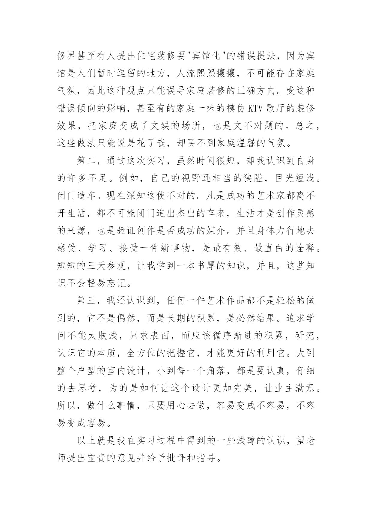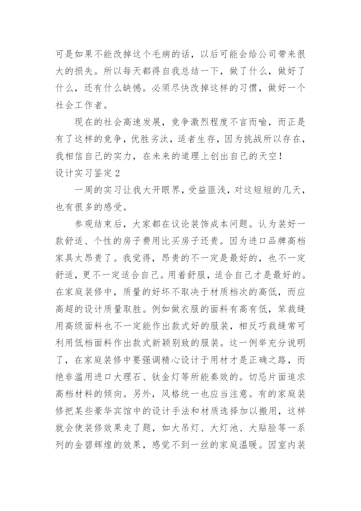 设计实习鉴定设计实习鉴定1本人是xx学校xx级美术设计专业毕业生,在步入社会正式工作之际,我先到xx公司为期两个月的实习,两个月的实习也许是短暂的,但对我来说是十分宝贵的,它是我在学校学习知识和实际应用的充分结合,是走上工作岗位的一个演习,使我不断的充实自己,提高自己,下面就是实习鉴定。我是学设计的,在书本上学过很多套经典设计方法,似乎通俗易懂,但从未付诸实践过,也许等到真正成为一个美工时,才会体会到难度有多大;我们在老师那里或书本上看到过很多精彩的设计案例,似乎轻而易举,也许亲临其境或亲自上阵才能意识到自己能力的欠缺和知识的匮乏。实习这两个月期间,我拓宽了视野,增长了见识,体验到社会竞争的残酷,而更多的是希望自己在工作中积累各方面的经验,为将来成为一名称职的美工做准备。在实习期间,我认真的听从前辈的意见,虚心的像他们学习,不懂的地方就积极的`去解决。性格比较开朗的我,能很好的跟同事沟通相处,培养了我良好的团队精神。这段时间学到了不少学校里没有教的东西,感觉很不一样。也许这就是社会吧。给我感触最深的还是认真的态度。不管做什么事都要认真对待,否则一不小心就会出错。因为我马马虎虎的毛病,老是做错。也许现在的错误看起来很小。可是如果不能改掉这个毛病的话,以后可能会给公司带来很大的损失。所以每天都得自我总结一下,做了什么,做好了什么,还有什么缺憾。必须尽快改掉这样的习惯,做好一个社会工作者。现在的社会高速发展,竞争激烈程度不言而喻,而正是有了这样的竞争,优胜劣汰,适者生存,因为挑战所以存在,我相信自己的实力,在未来的道理上创出自己的天空!设计实习鉴定2一周的实习让我大开眼界,受益匪浅,对这短短的几天,也有很多的感受。参观结束后,大家都在议论装饰成本问题。认为装好一款舒适、个性的房子费用比买房子还贵。因为进口品牌高档家具太昂贵了。我觉得,昂贵的不一定是最好的,也不一定舒适,更不一定适合自己。用着舒服,适合自己才是最好的。在家庭装修中,质量的好坏不取决于材质档次的高低,而应高超的设计质量取胜。例如做衣服的面料有高有低,笨裁缝用高级面料也不一定能作出款式好的服装,相反巧裁缝常可利用低档面料作出款式新颖别致的服装。这一例举充分说明了,在家庭装修中要强调精心设计于用材才是正确之路,而绝非滥用进口大理石、钛金灯等所能奏效的。切忌片面追求高档材料的倾向。另外,风格统一也应当注意。有的家庭装修把某些豪华宾馆中的设计手法和材质选择加以搬用,这样就会使装修效果走了题,如大吊灯、大灯池、大贴脸等一系列的金碧辉煌的效果,感觉不到一丝的家庭温暖。因室内装修界甚至有人提出住宅装修要"宾馆化"的错误提法,因为宾馆是人们暂时逗留的地方,人流熙熙攘攘,不可能存在家庭气氛,因此这种观点只能误导家庭装修的正确方向。受这种错误倾向的影响,甚至有的家庭一味的模仿KTV歌厅的装修效果,把家庭变成了文娱的场所,也是文不对题的。总之,这些做法只能说是花了钱,却买不到家庭温馨的气氛。第二,通过这次实习,虽然时间很短,却我认识到自身的许多不足。例如,自己的视野还相当的狭隘,目光短浅。闭门造车。现在深知这使不对的。凡是成功的艺术家都离不开生活,都不可能闭门造出杰出的车来,生活才是创作灵感的来源,也是验证创作是否成功的媒介。并且身体力行地去感受、学习、接受一件新事物,是最有效、最直白的诠释。短短的三天参观,让我学到一本书厚的知识,并且,这些知识不会轻易忘记。第三,我还认识到,任何一件艺术作品都不是轻松的做到的,它不是偶然,而是长期的积累,是必然结果。追求学问不能太肤浅,只求表面,而应该循序渐进的积累,研究,认识它的本质,全方位的把握它,才能更好的利用它。大到整个户型的室内设计,小到每一个角落,都是要认真,仔细的去思考,为的是如何让这个设计更加完美,让业主满意。所以,做什么事情,只要用心去做,容易变成不容易,不容易变成容易。以上就是我在实习过程中得到的一些浅薄的认识,望老师提出宝贵的意见并给予批评和指导。