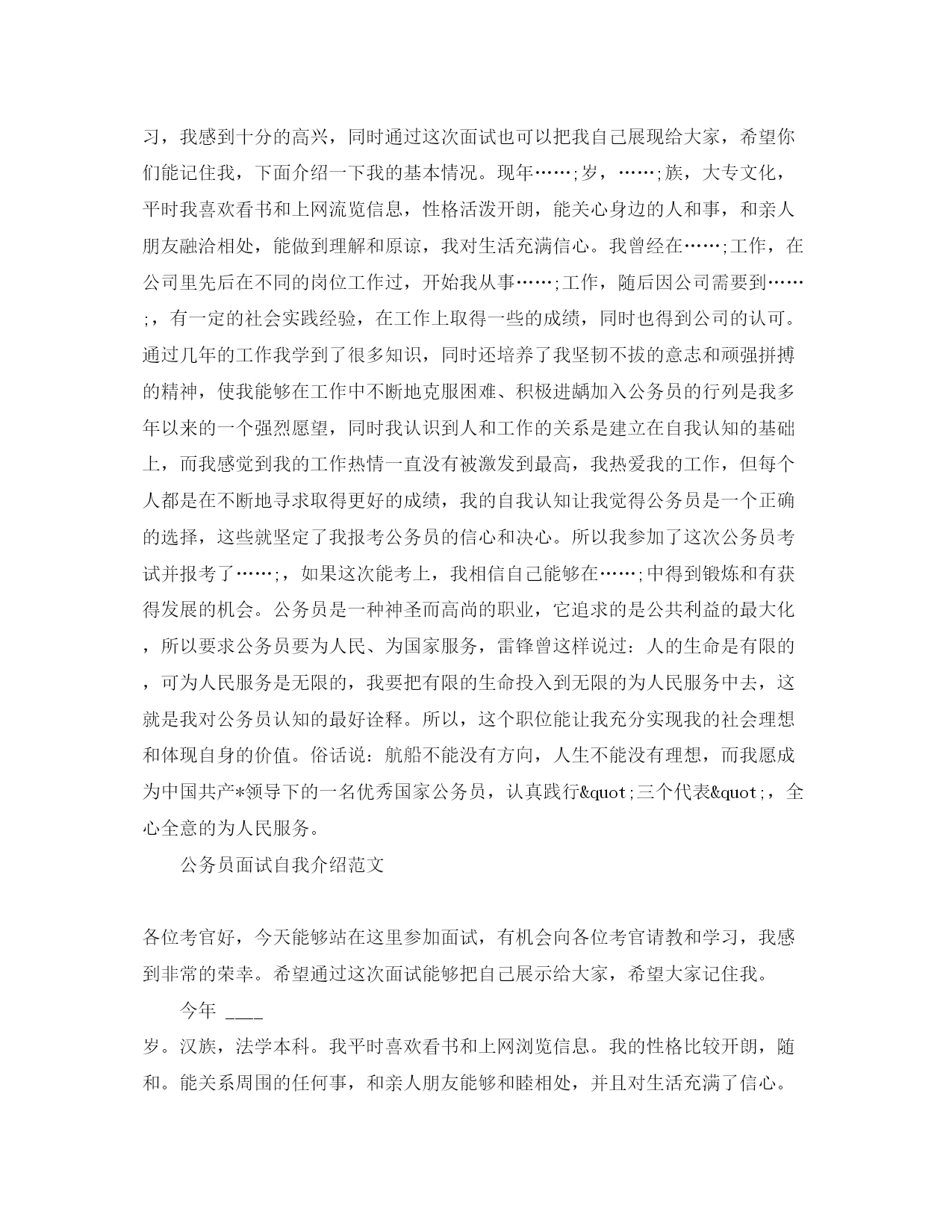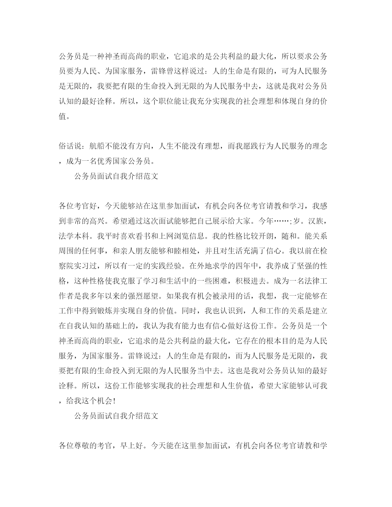 此资料由网络收集而来,如有侵权请告知上传者立即删除。资料共分享,我们负责传递知识。公务员面试自我介绍【荐读】公务员面试中我们的自我介绍是十分重要和关键的,因为自我介绍能给面试官留下印象的一个环节。下面是小编收集整理的公务员面试自我介绍,欢迎阅读借鉴,更多资讯请继续关注自我介绍栏目。公务员面试自我介绍范文各位尊敬的考官,早上好。今天能在这里参加面试,有机会向各位考官请教和学习,我感到十分的荣幸,同时通过这次面试也可以把我自己展现给大家,希望你们能记住我,下面介绍一下我的基本情况。(一般不能说名字)现年____岁,汉族,大专文化,平时我喜欢看书和上网流览信息,性格活泼开朗,能关心身边的人和事,和亲人朋友融洽相处,能做到理解和原谅,我对生活充满信心。我曾经在____工作,在公司里先后在不同的岗位工作过,开始我从事____工作,随后因公司需要到____,有一定的社会实践经验,在工作上取得一些的成绩,同时也得到公司的认可。通过几年的工作我学到了很多知识,同时还培养了我坚韧不拔的意志和顽强拼搏的精神,使我能够在工作中不断地克服困难、积极进取。加入公务员的行列是我多年以来的一个强烈愿望,同时我认识到人和工作的关系是建立在自我认知的基础上,而我感觉到我的工作热情一直没有被激发到最高,我热爱我的工作,但每个人都是在不断地寻求取得更好的成绩,我的自我认知让我觉得公务员是一个正确的选择,这些就坚定了我报考公务员的信心和决心。所以我参加了这次公务员考试并报考了____,如果这次能考上,我相信自己能够在____中得到锻炼和有获得发展的机会。公务员是一种神圣而高尚的职业,它追求的是公共利益的最大化,所以要求公务员要为人民、为国家服务,雷锋曾这样说过:人的生命是有限的,可为人民服务是无限的,我要把有限的生命投入到无限的为人民服务中去,这就是我对公务员认知的最好诠释。所以,这个职位能让我充分实现我的社会理想和体现自身的价值。俗话说:航船不能没有方向,人生不能没有理想,而我愿践行为人民服务的理念,成为一名优秀国家公务员。公务员面试自我介绍范文各位考官好,今天能够站在这里参加面试,有机会向各位考官请教和学习,我感到非常的高兴。希望通过这次面试能够把自己展示给大家。今年……;岁。汉族,法学本科。我平时喜欢看书和上网浏览信息。我的性格比较开朗,随和。能关系周围的任何事,和亲人朋友能够和睦相处,并且对生活充满了信心。我以前在检察院实习过,所以有一定的实践经验。在外地求学的四年中,我养成了坚强的性格,这种性格使我克服了学习和生活中的一些困难,积极进去。成为一名法律工作者是我多年以来的强烈愿望。如果我有机会被录用的话,我想,我一定能够在工作中得到锻炼并实现自身的价值。同时,我也认识到,人和工作的关系是建立在自我认知的基础上的,我认为我有能力也有信心做好这份工作。公务员是一个神圣而高尚的职业,它追求的是公共利益的最大化,它存在的根本目的是为人民服务,为国家服务。雷锋说过:人的生命是有限的,而为人民服务是无限的,我要把有限的生命投入到无限的为人民服务当中去。这也是我对公务员认知的最好诠释。所以,这份工作能够实现我的社会理想和人生价值,希望大家能够认可我,给我这个机会!公务员面试自我介绍范文各位尊敬的考官,早上好。今天能在这里参加面试,有机会向各位考官请教和学习,我感到十分的高兴,同时通过这次面试也可以把我自己展现给大家,希望你们能记住我,下面介绍一下我的基本情况。现年……;岁,……;族,大专文化,平时我喜欢看书和上网流览信息,性格活泼开朗,能关心身边的人和事,和亲人朋友融洽相处,能做到理解和原谅,我对生活充满信心。我曾经在……;工作,在公司里先后在不同的岗位工作过,开始我从事……;工作,随后因公司需要到……;,有一定的社会实践经验,在工作上取得一些的成绩,同时也得到公司的认可。通过几年的工作我学到了很多知识,同时还培养了我坚韧不拔的意志和顽强拼搏的精神,使我能够在工作中不断地克服困难、积极进龋加入公务员的行列是我多年以来的一个强烈愿望,同时我认识到人和工作的关系是建立在自我认知的基础上,而我感觉到我的工作热情一直没有被激发到最高,我热爱我的工作,但每个人都是在不断地寻求取得更好的成绩,我的自我认知让我觉得公务员是一个正确的选择,这些就坚定了我报考公务员的信心和决心。所以我参加了这次公务员考试并报考了……;,如果这次能考上,我相信自己能够在……;中得到锻炼和有获得发展的机会。公务员是一种神圣而高尚的职业,它追求的是公共利益的最大化,所以要求公务员要为人民、为国家服务,雷锋曾这样说过:人的生命是有限的,可为人民服务是无限的,我要把有限的生命投入到无限的为人民服务中去,这就是我对公务员认知的最好诠释。所以,这个职位能让我充分实现我的社会理想和体现自身的价值