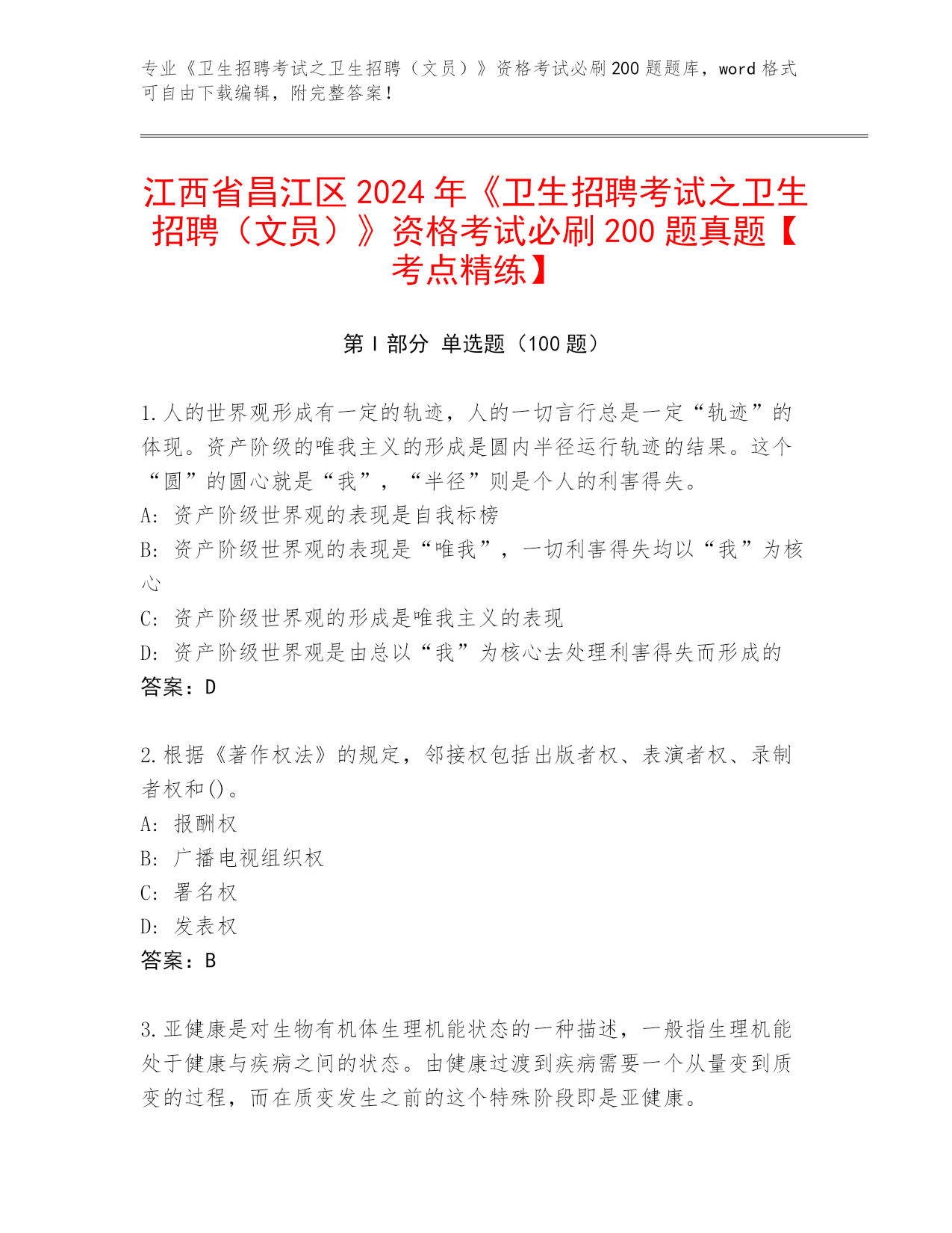 江西省昌江区2024年《卫生招聘考试之卫生招聘(文员)》资格考试必刷200题完整题库【精练】