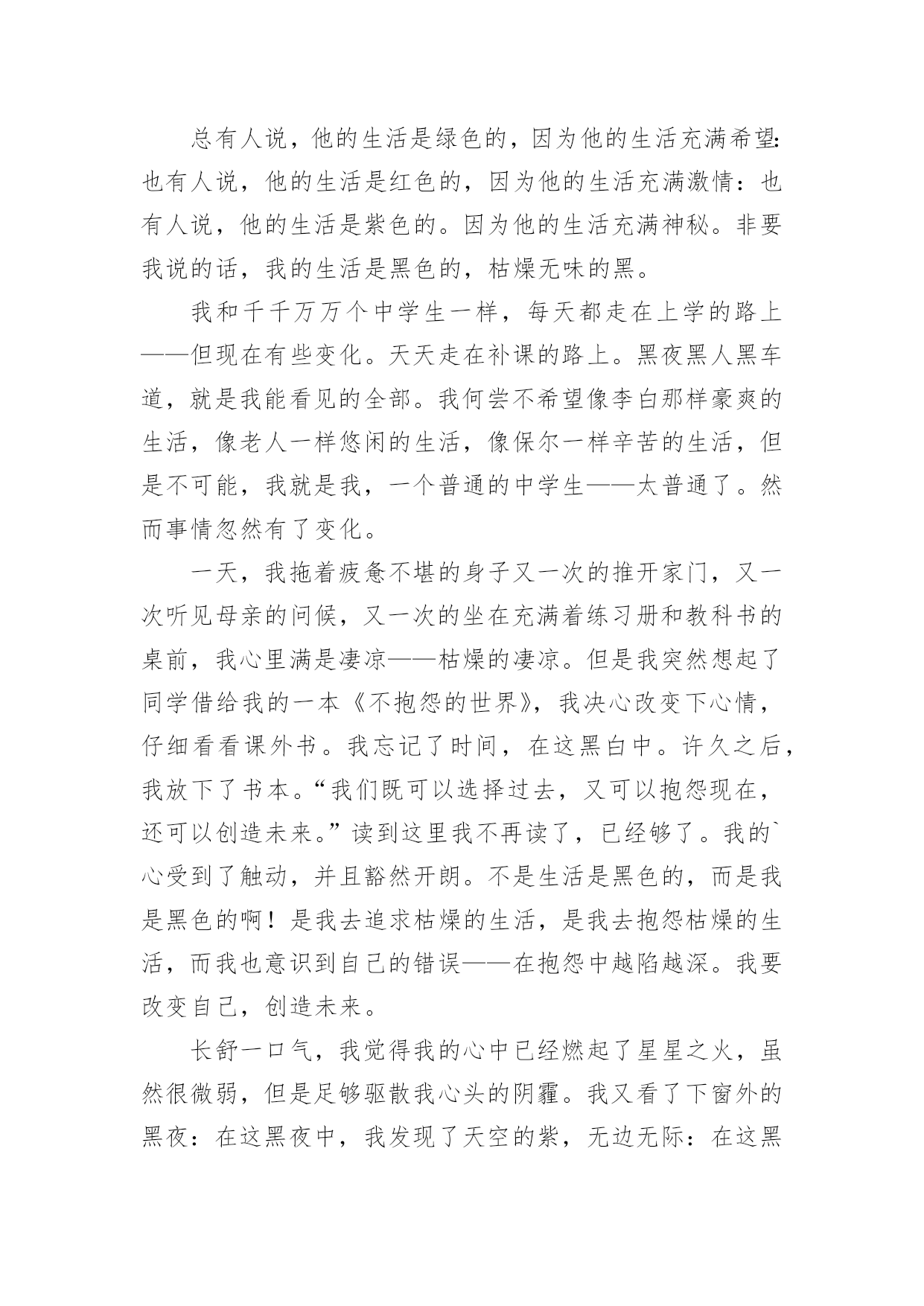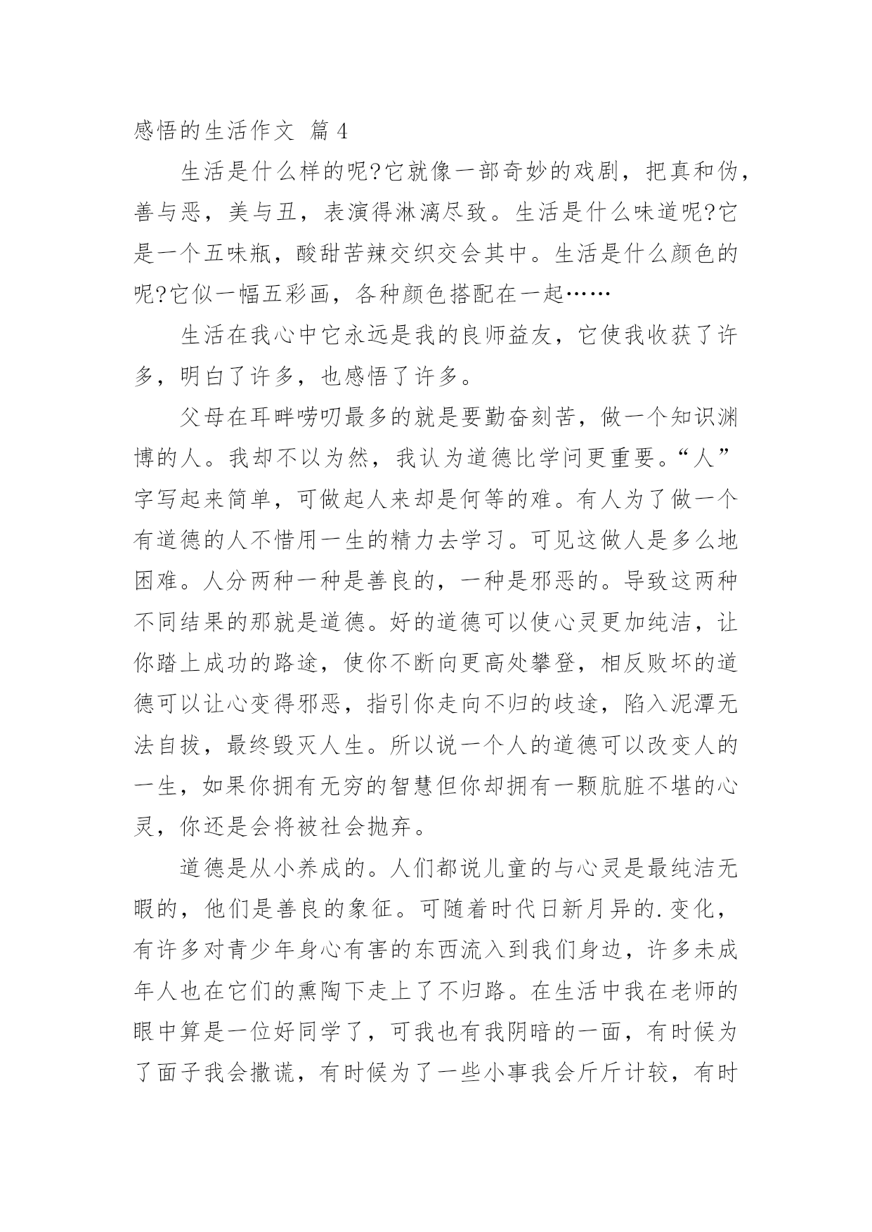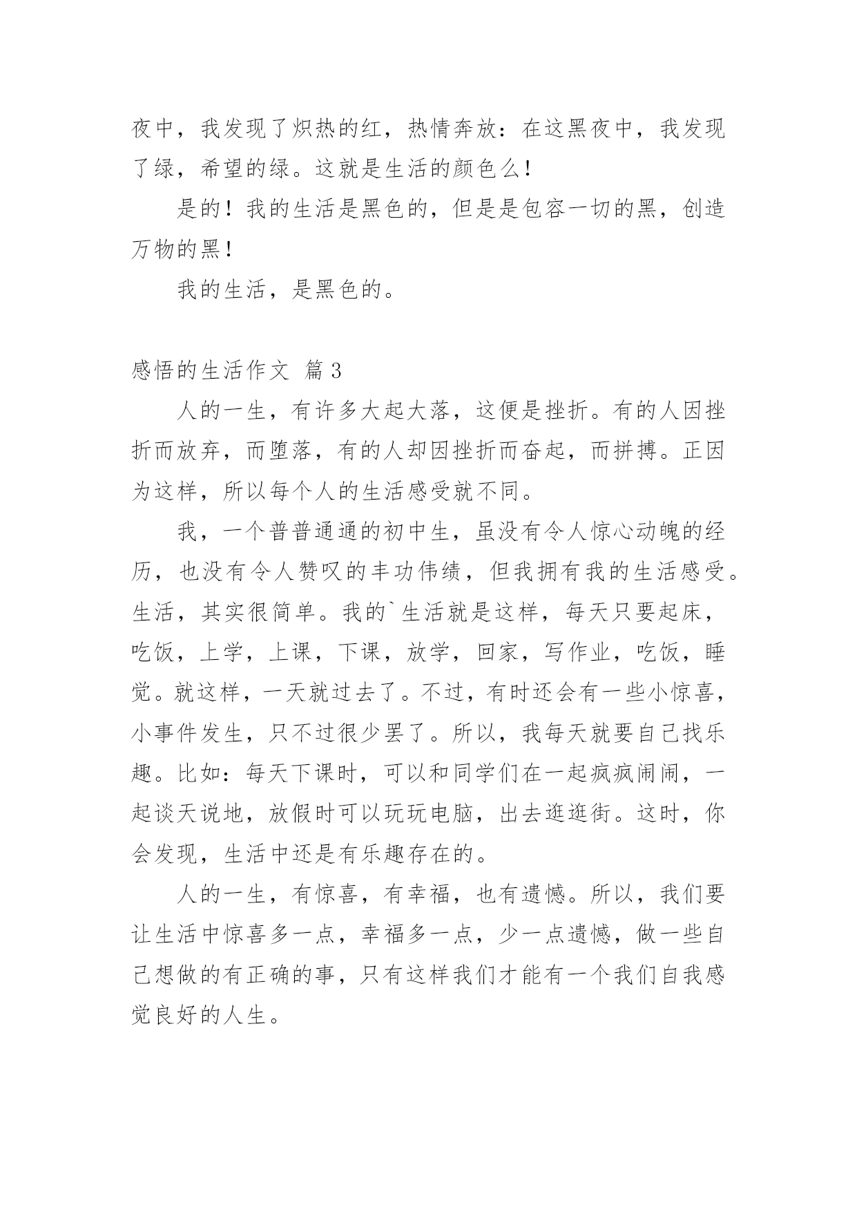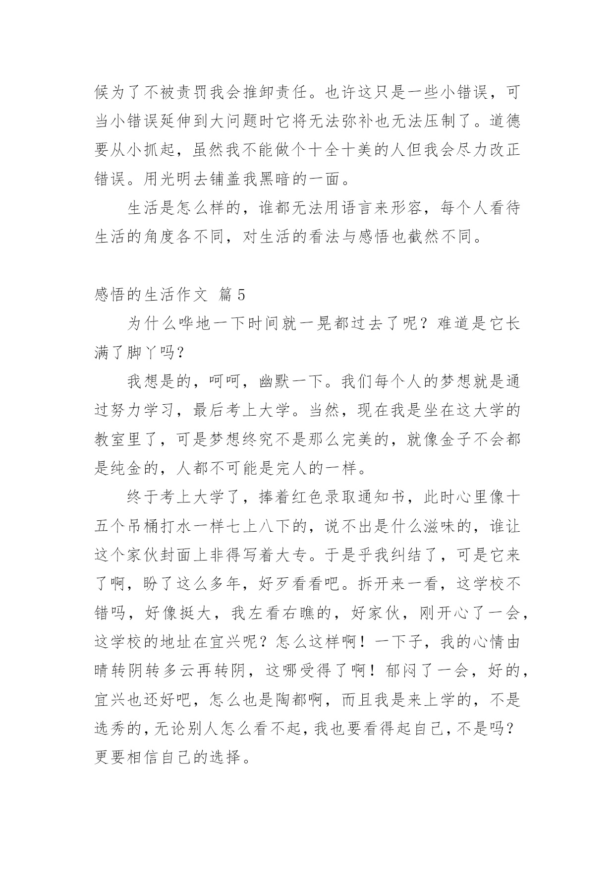 感悟的生活作文【精选】感悟的生活作文合集5篇在学习、工作乃至生活中,大家都写过作文,肯定对各类作文都很熟悉吧,作文根据写作时限的不同可以分为限时作文和非限时作文。那么你知道一篇好的作文该怎么写吗?以下是小编收集整理的感悟的生活作文5篇,供大家参考借鉴,希望可以帮助到有需要的朋友。感悟的生活作文篇1夜晚的空气,有着南方特有的氤氲。哈着气,游走在走廊里。碰到同班的个性女生,她总是穿着鲜艳的颜色的.衣服,化着说浓又不浓说淡又不淡的妆容。我跟她未能深交,只不过,我想,我未必有那个天赋去深交。阿姨走过去问她到底干啥去了,为啥这么晚才回来。她却只是打哈哈的说,有事!其实,我想,我也挺羡慕她的,也许吧!好歹,人家也做了许多,我这一辈子,也干不了的事情。好吧!我承认其实,我胆子不是很大,我要坚持做一个乖孩子,不管,怎样都要做下去。感悟的生活作文篇2我的生活,没有色彩。总有人说,他的生活是绿色的,因为他的生活充满希望:也有人说,他的生活是红色的,因为他的生活充满激情:也有人说,他的生活是紫色的。因为他的生活充满神秘。非要我说的话,我的生活是黑色的,枯燥无味的黑。我和千千万万个中学生一样,每天都走在上学的路上——但现在有些变化。天天走在补课的路上。黑夜黑人黑车道,就是我能看见的全部。我何尝不希望像李白那样豪爽的生活,像老人一样悠闲的生活,像保尔一样辛苦的生活,但是不可能,我就是我,一个普通的中学生——太普通了。然而事情忽然有了变化。一天,我拖着疲惫不堪的身子又一次的推开家门,又一次听见母亲的问候,又一次的坐在充满着练习册和教科书的桌前,我心里满是凄凉——枯燥的凄凉。但是我突然想起了同学借给我的一本《不抱怨的世界》,我决心改变下心情,仔细看看课外书。我忘记了时间,在这黑白中。许久之后,我放下了书本。“我们既可以选择过去,又可以抱怨现在,还可以创造未来。”读到这里我不再读了,已经够了。我的`心受到了触动,并且豁然开朗。不是生活是黑色的,而是我是黑色的啊!是我去追求枯燥的生活,是我去抱怨枯燥的生活,而我也意识到自己的错误——在抱怨中越陷越深。我要改变自己,创造未来。长舒一口气,我觉得我的心中已经燃起了星星之火,虽然很微弱,但是足够驱散我心头的阴霾。我又看了下窗外的黑夜:在这黑夜中,我发现了天空的紫,无边无际:在这黑夜中,我发现了炽热的红,热情奔放:在这黑夜中,我发现了绿,希望的绿。这就是生活的颜色么!是的!我的生活是黑色的,但是是包容一切的黑,创造万物的黑!我的生活,是黑色的。感悟的生活作文篇3人的一生,有许多大起大落,这便是挫折。有的人因挫折而放弃,而堕落,有的人却因挫折而奋起,而拼搏。正因为这样,所以每个人的生活感受就不同。我,一个普普通通的初中生,虽没有令人惊心动魄的经历,也没有令人赞叹的丰功伟绩,但我拥有我的生活感受。生活,其实很简单。我的`生活就是这样,每天只要起床,吃饭,上学,上课,下课,放学,回家,写作业,吃饭,睡觉。就这样,一天就过去了。不过,有时还会有一些小惊喜,小事件发生,只不过很少罢了。所以,我每天就要自己找乐趣。比如:每天下课时,可以和同学们在一起疯疯闹闹,一起谈天说地,放假时可以玩玩电脑,出去逛逛街。这时,你会发现,生活中还是有乐趣存在的。人的一生,有惊喜,有幸福,也有遗憾。所以,我们要让生活中惊喜多一点,幸福多一点,少一点遗憾,做一些自己想做的有正确的事,只有这样我们才能有一个我们自我感觉良好的人生。感悟的生活作文篇4生活是什么样的呢?它就像一部奇妙的戏剧,把真和伪,善与恶,美与丑,表演得淋漓尽致。生活是什么味道呢?它是一个五味瓶,酸甜苦辣交织交会其中。生活是什么颜色的呢?它似一幅五彩画,各种颜色搭配在一起……生活在我心中它永远是我的良师益友,它使我收获了许多,明白了许多,也感悟了许多。父母在耳畔唠叨最多的就是要勤奋刻苦,做一个知识渊博的人。我却不以为然,我认为道德比学问更重要。“人”字写起来简单,可做起人来却是何等的难。有人为了做一个有道德的人不惜用一生的精力去学习。可见这做人是多么地困难。人分两种一种是善良的,一种是邪恶的。导致这两种不同结果的那就是道德。好的道德可以使心灵更加纯洁,让你踏上成功的路途,使你不断向更高处攀登,相反败坏的道德可以让心变得邪恶,指引你走向不归的歧途,陷入泥潭无法自拔,最终毁灭人生。所以说一个人的道德可以改变人的一生,如果你拥有无穷的智慧但你却拥有一颗肮脏不堪的心灵,你还是会将被社会抛弃。道德是从小养成的。人们都说儿童的与心灵是最纯洁无暇的,他们是善良的象征。可随着时代日新月异的.变化,有许多对青少年身心有害的东西流入到我们身边,许多未成年人也在它们的熏陶下走上了不归路。在生活中我在老师的眼中算是一位好同学了,可我也有我阴暗的一面,有时候为了面子我会撒谎,有时候为了一些小事我会斤斤计较,有时