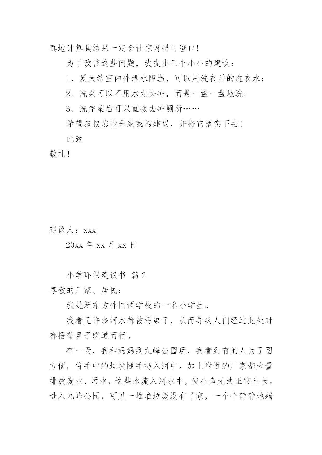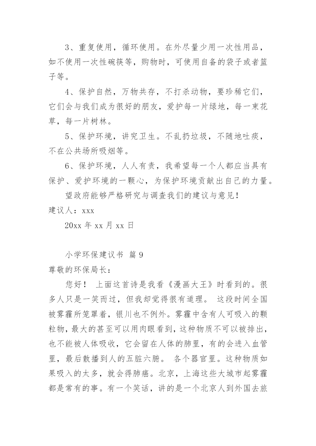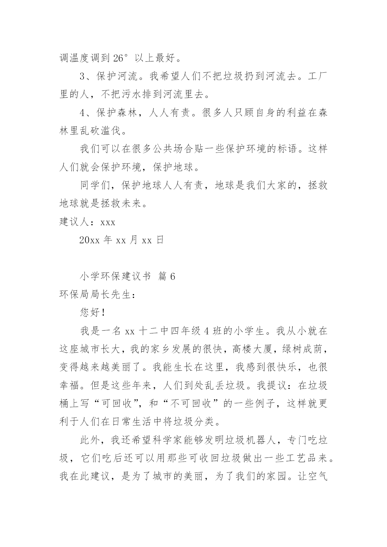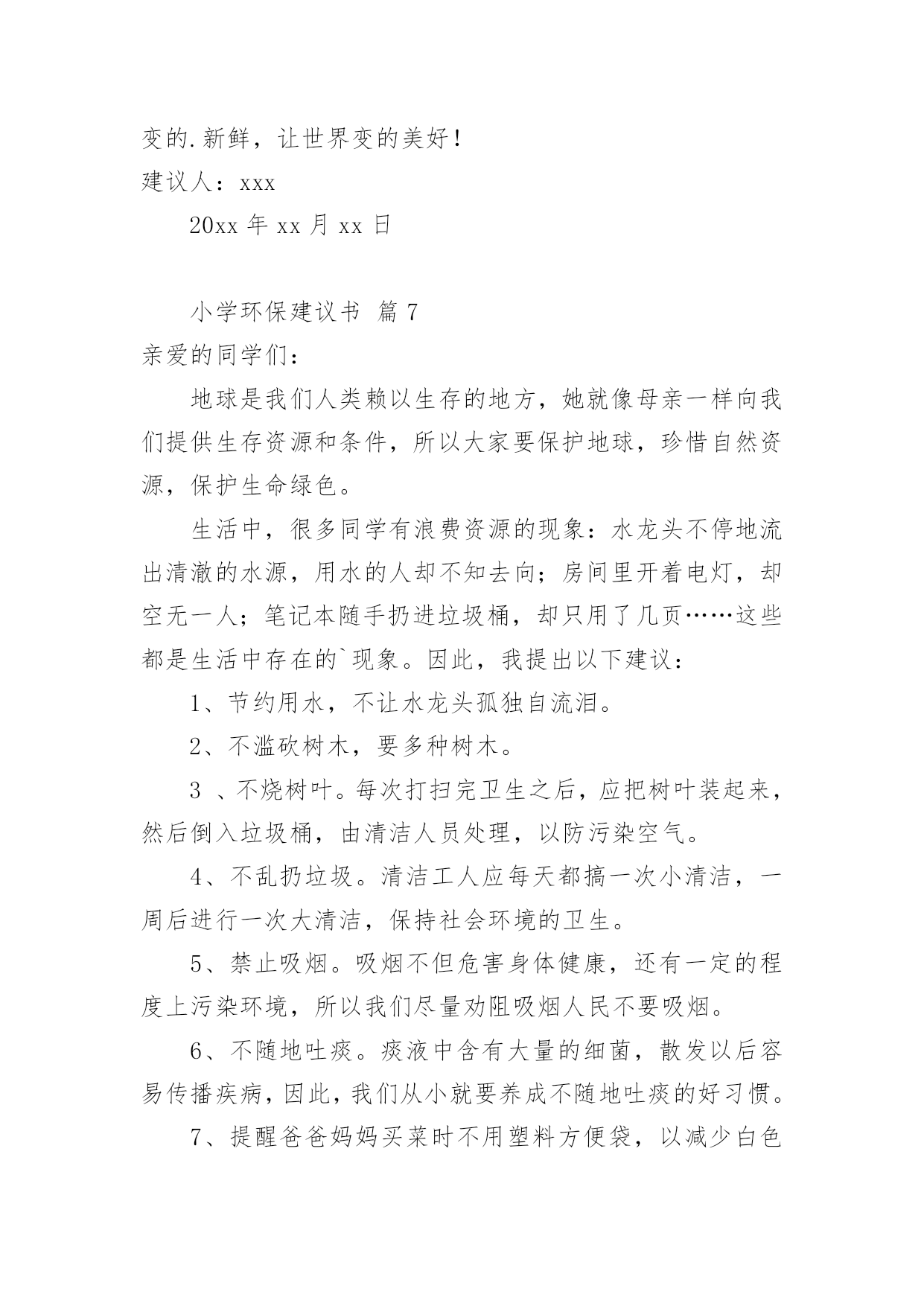 小学环保建议书小学环保建议书(精选20篇)在生活中,越来越多地方需要用到建议书,当建议书是面对领导和有关部门时,可以中肯地提出自己对对方工作的意见和自己的建议。那么一般建议书是怎么写的呢?以下是小编整理的小学环保建议书,仅供参考,欢迎大家阅读。小学环保建议书篇1尊敬的环保局叔叔:您好!我是一位来自东莞的一名普通的学生。今天给您写这一封信,目的有二:一是向您反映这种不良情况;二是希望您可以呼吁大家珍惜水资源。水,乃万物之母,它用自己滋润着大地和人类。可最近,原本甘甜的水却变得浑浊不堪。据统计,全国50%江河水流量减少,受污染;1/3土地面临沙漠化;80个国家严重缺水……我国的水资源虽然比较丰富,但是很多地方仍然缺水,很普遍的原因是大家不节约用水。在很多时候,如果我们每个人每天浪费了一滴水,中国又14亿人,那就将是14000000滴水!滴水成河。结果是多么令人感到震惊!有的家庭将一些完全还可以利用的水,像淘菜和洗脸的水一盆一盆的直接入下水道,看看这些被浪费的水,如果一年到头一滴一滴的往外滴水的.话,如果要认真地计算其结果一定会让惊讶得目瞪口!为了改善这些问题,我提出三个小小的建议:1、夏天给室内外洒水降温,可以用洗衣后的洗衣水;2、洗菜可以不用水龙头冲,而是一盘一盘地洗;3、洗完菜后可以直接去冲厕所……希望叔叔您能采纳我的建议,并将它落实下去!此致敬礼!建议人:xxx20xx年xx月xx日小学环保建议书篇2尊敬的厂家、居民:我是新东方外国语学校的一名小学生。我看见许多河水都被污染了,从而导致人们经过此处时都捂着鼻子绕道而行。有一天,我和妈妈到九峰公园玩,我看到有的人为了图方便,将手中的垃圾随手扔入河中。加上附近的厂家都大量排放废水、污水,这些水流入河水中,使小鱼无法正常生长。进入九峰公园,可见一堆堆垃圾没有了家,一个个静静地躺在那儿,散发出臭气。我还发现:有些叔叔阿姨在吃饭时,都在使用一次性木筷;有些人的家里还在使用珍贵木材用品;有些人的家里还没有使用节水型用具……因此,我向厂家、居民提出以下建议:第一:将保护河水的牌子立在河旁。(要多、醒目)第二:在河边围上栏杆。第三:制作“爱护河水”的`宣传板报,周日去宣传。第四:住在河边的同学首先做到不扔垃圾到河水中,并劝阻家人别这样做。第五:派人监督,发现屡次犯规者进行严重处分。第六:不用一次性筷子。第七:不是用珍贵木材用品。第八:使用节水型用具。我们要从小事做起,从自己做起,人人争当“爱水、护水”的小卫士。一名小学生20xx年10月21日小学环保建议书篇3尊敬的校领导:我在这个美丽的学校里已生活了六年已久了,只有短短的七十几天,眼看就要告别这所母校,告别那宽敞明亮的教室,告别那你追我赶的赛场,告别那百花齐放的后花园,告别那天真可爱的同学们。也许,就在这几十天后,一张张熟悉面孔,一句句亲切的问候,一朵朵美丽的鲜花,都会在我的记忆里逐渐褪色,一切美好的东西会被蒙上一缕薄薄的轻纱。1、校园里由领导们在广播里颂发“十大杰出环保卫士”,加以表扬、鼓励。使同学们积极地参与这项活动,并尽心尽力地做好校内保洁工作。2、每个星期一都用一节课时间,用动漫视频或用口语交际的时间教育每一个同学垃圾分类,增强同学们对环保的意识和加强对环保的'重视。3、让学校的每年级的那些做得特别突出的同学教育那些没对环境保护有更高认识同学,给他们树立榜样。4、学校还可以实现“捡垃圾,得奖品,赢积分”的方法刺激同学们的,使那些没有被评上优秀环保小卫士的同学不气馁,再接再厉!建议人:xxx20xx年xx月xx日小学环保建议书篇4乐山市少工委的各位领导们:你们好!谁都知道,地球是我们的家园,与我们的生活息息相关。人类大量破坏环境,已经把我们美丽的地球毁坏的不像样了。可用水资源慢慢减少,动植物濒临灭绝……垃圾便是这些污染事件的根源。随手人垃圾已经成了我学习资料大全们的习惯,居于乐山,看着世界著名的乐山大佛,山清水秀、鸟语花香的峨眉山,自然是我的骄傲。但看着青衣江那发臭的的河面上漂浮着的白色垃圾;新广场那肮脏的树枝上挂着塑料袋,那黑黑的草地上堆着果皮和纸屑……你心里会高兴么?联想到我在广场上看到的斑斑点点的.痰迹,公园里时常看到一些践踏草坪、折踩树木的现象……看到我们美丽的地球被如此糟蹋,我们能无动于衷么?记得有一次,我在公交车站候车时,发现四周扔满了垃圾,有废弃的车票,烟头,甚至还有吃剩的果皮。难倒垃圾桶堆满了么?仔细一看,里面空空如也。正纳闷时,一位阿姨路过,顺手将一个纸团往垃圾桶扔去,纸团掉到了地上,阿姨只是回过头看了一下,便扬长而去。原来,垃圾桶旁的垃圾就是这样形成的。可能有很多人都有保护环境、垃圾入桶的意识,但缺少的都是实际行动,尽管有些时候都是举手之劳。被污染的浑浊不堪的大自然,在静默无语中仿佛压抑了太多的忧愁与怨恨。无论