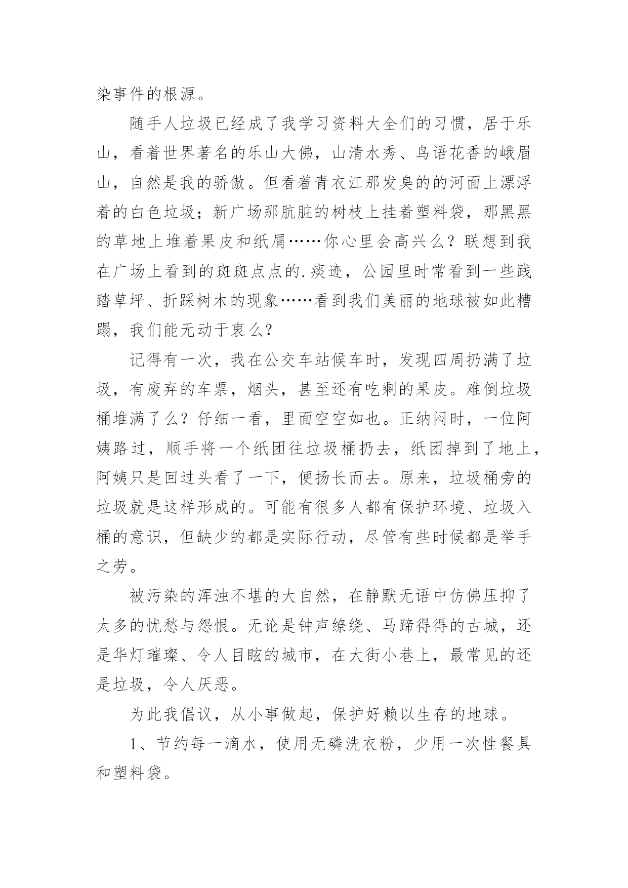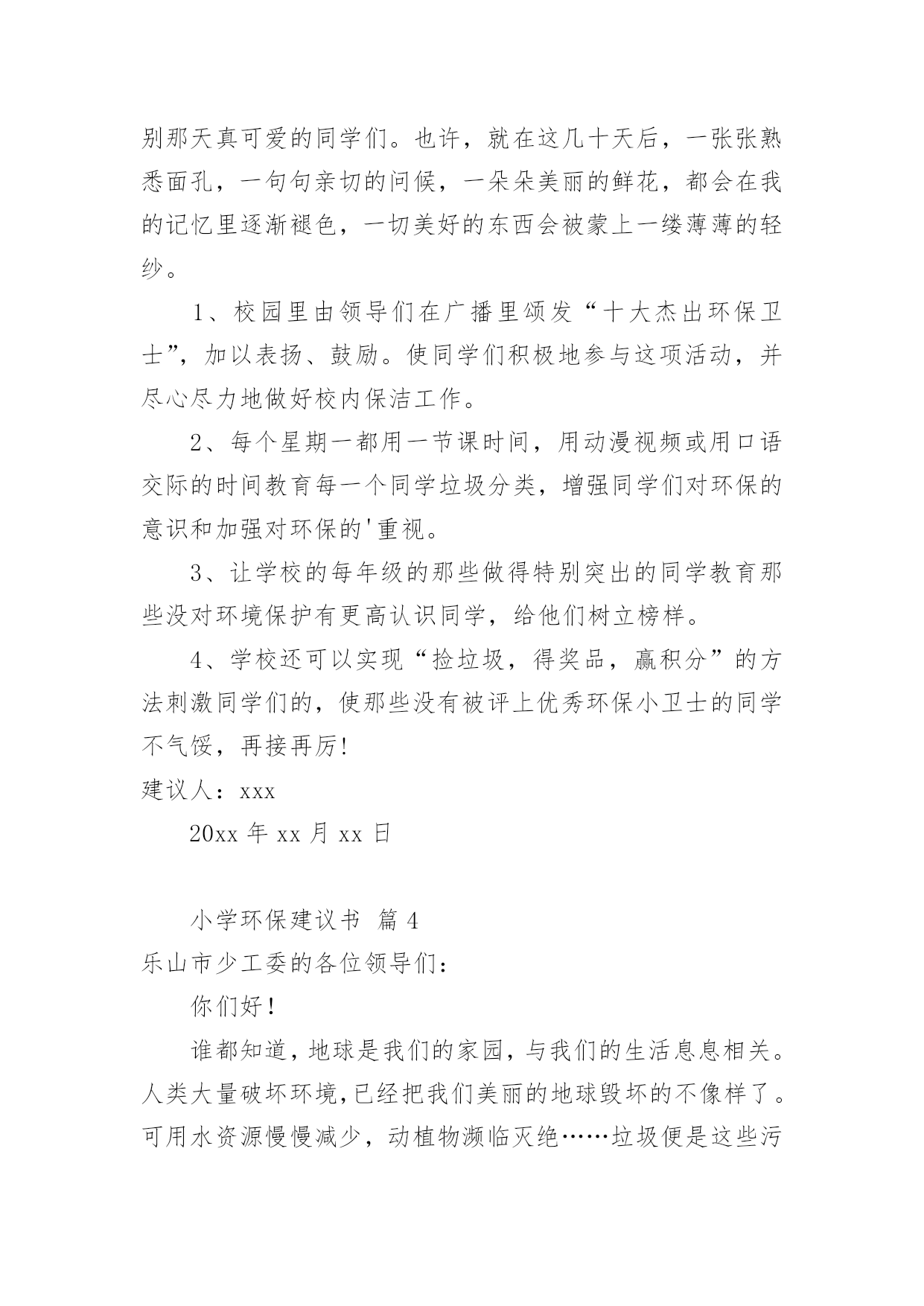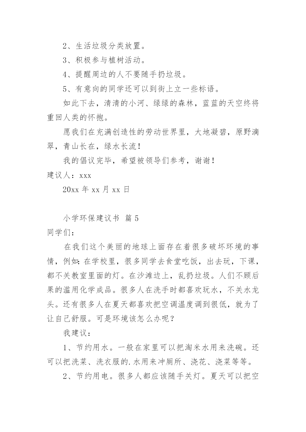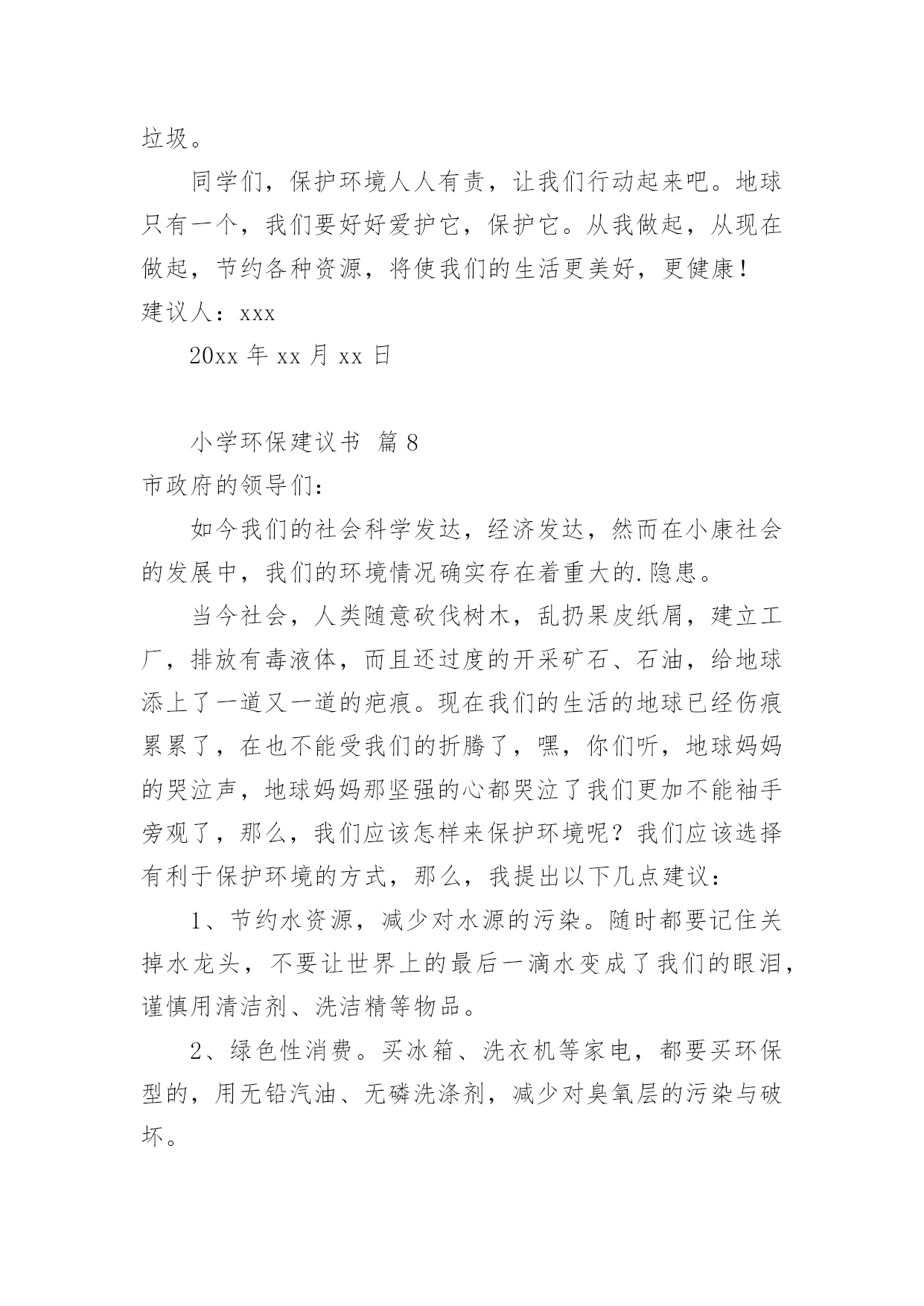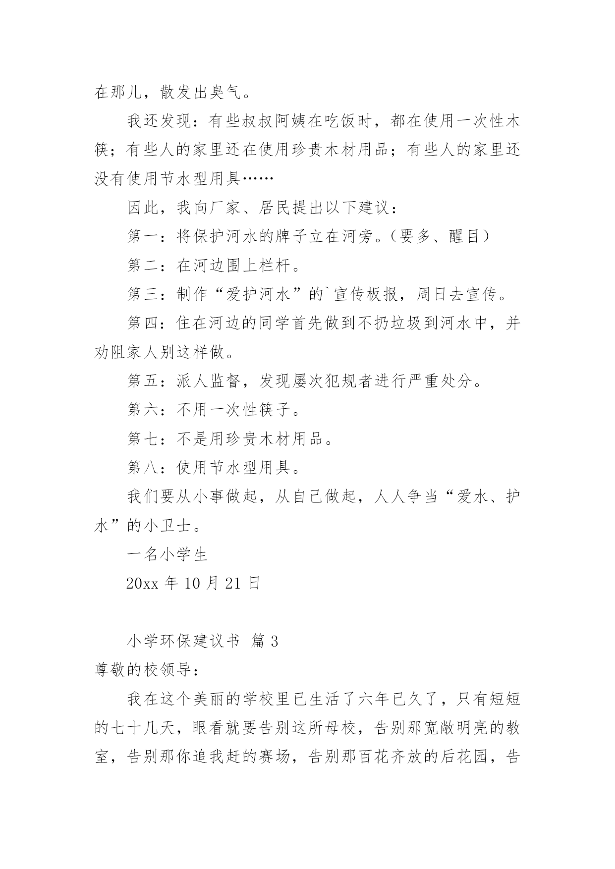 小学环保建议书小学环保建议书(精选20篇)在生活中,越来越多地方需要用到建议书,当建议书是面对领导和有关部门时,可以中肯地提出自己对对方工作的意见和自己的建议。那么一般建议书是怎么写的呢?以下是小编整理的小学环保建议书,仅供参考,欢迎大家阅读。小学环保建议书篇1尊敬的环保局叔叔:您好!我是一位来自东莞的一名普通的学生。今天给您写这一封信,目的有二:一是向您反映这种不良情况;二是希望您可以呼吁大家珍惜水资源。水,乃万物之母,它用自己滋润着大地和人类。可最近,原本甘甜的水却变得浑浊不堪。据统计,全国50%江河水流量减少,受污染;1/3土地面临沙漠化;80个国家严重缺水……我国的水资源虽然比较丰富,但是很多地方仍然缺水,很普遍的原因是大家不节约用水。在很多时候,如果我们每个人每天浪费了一滴水,中国又14亿人,那就将是14000000滴水!滴水成河。结果是多么令人感到震惊!有的家庭将一些完全还可以利用的水,像淘菜和洗脸的水一盆一盆的直接入下水道,看看这些被浪费的水,如果一年到头一滴一滴的往外滴水的.话,如果要认真地计算其结果一定会让惊讶得目瞪口!为了改善这些问题,我提出三个小小的建议:1、夏天给室内外洒水降温,可以用洗衣后的洗衣水;2、洗菜可以不用水龙头冲,而是一盘一盘地洗;3、洗完菜后可以直接去冲厕所……希望叔叔您能采纳我的建议,并将它落实下去!此致敬礼!建议人:xxx20xx年xx月xx日小学环保建议书篇2尊敬的厂家、居民:我是新东方外国语学校的一名小学生。我看见许多河水都被污染了,从而导致人们经过此处时都捂着鼻子绕道而行。有一天,我和妈妈到九峰公园玩,我看到有的人为了图方便,将手中的垃圾随手扔入河中。加上附近的厂家都大量排放废水、污水,这些水流入河水中,使小鱼无法正常生长。进入九峰公园,可见一堆堆垃圾没有了家,一个个静静地躺在那儿,散发出臭气。我还发现:有些叔叔阿姨在吃饭时,都在使用一次性木筷;有些人的家里还在使用珍贵木材用品;有些人的家里还没有使用节水型用具……因此,我向厂家、居民提出以下建议:第一:将保护河水的牌子立在河旁。(要多、醒目)第二:在河边围上栏杆。第三:制作“爱护河水”的`宣传板报,周日去宣传。第四:住在河边的同学首先做到不扔垃圾到河水中,并劝阻家人别这样做。第五:派人监督,发现屡次犯规者进行严重处分。第六:不用一次性筷子。第七:不是用珍贵木材用品。第八:使用节水型用具。我们要从小事做起,从自己做起,人人争当“爱水、护水”的小卫士。一名小学生20xx年10月21日小学环保建议书篇3尊敬的校领导:我在这个美丽的学校里已生活了六年已久了,只有短短的七十几天,眼看就要告别这所母校,告别那宽敞明亮的教室,告别那你追我赶的赛场,告别那百花齐放的后花园,告别那天真可爱的同学们。也许,就在这几十天后,一张张熟悉面孔,一句句亲切的问候,一朵朵美丽的鲜花,都会在我的记忆里逐渐褪色,一切美好的东西会被蒙上一缕薄薄的轻纱。1、校园里由领导们在广播里颂发“十大杰出环保卫士”,加以表扬、鼓励。使同学们积极地参与这项活动,并尽心尽力地做好校内保洁工作。2、每个星期一都用一节课时间,用动漫视频或用口语交际的时间教育每一个同学垃圾分类,增强同学们对环保的意识和加强对环保的'重视。3、让学校的每年级的那些做得特别突出的同学教育那些没对环境保护有更高认识同学,给他们树立榜样。4、学校还可以实现“捡垃圾,得奖品,赢积分”的方法刺激同学们的,使那些没有被评上优秀环保小卫士的同学不气馁,再接再厉!建议人:xxx20xx年xx月xx日小学环保建议书篇4乐山市少工委的各位领导们:你们好!谁都知道,地球是我们的家园,与我们的生活息息相关。人类大量破坏环境,已经把我们美丽的地球毁坏的不像样了。可用水资源慢慢减少,动植物濒临灭绝……垃圾便是这些污染事件的根源。随手人垃圾已经成了我学习资料大全们的习惯,居于乐山,看着世界著名的乐山大佛,山清水秀、鸟语花香的峨眉山,自然是我的骄傲。但看着青衣江那发臭的的河面上漂浮着的白色垃圾;新广场那肮脏的树枝上挂着塑料袋,那黑黑的草地上堆着果皮和纸屑……你心里会高兴么?联想到我在广场上看到的斑斑点点的.痰迹,公园里时常看到一些践踏草坪、折踩树木的现象……看到我们美丽的地球被如此糟蹋,我们能无动于衷么?记得有一次,我在公交车站候车时,发现四周扔满了垃圾,有废弃的车票,烟头,甚至还有吃剩的果皮。难倒垃圾桶堆满了么?仔细一看,里面空空如也。正纳闷时,一位阿姨路过,顺手将一个纸团往垃圾桶扔去,纸团掉到了地上,阿姨只是回过头看了一下,便扬长而去。原来,垃圾桶旁的垃圾就是这样形成的。可能有很多人都有保护环境、垃圾入桶的意识,但缺少的都是实际行动,尽管有些时候都是举手之劳。被污染的浑浊不堪的大自然,在静默无语中仿佛压抑了太多的忧愁与怨恨。无论