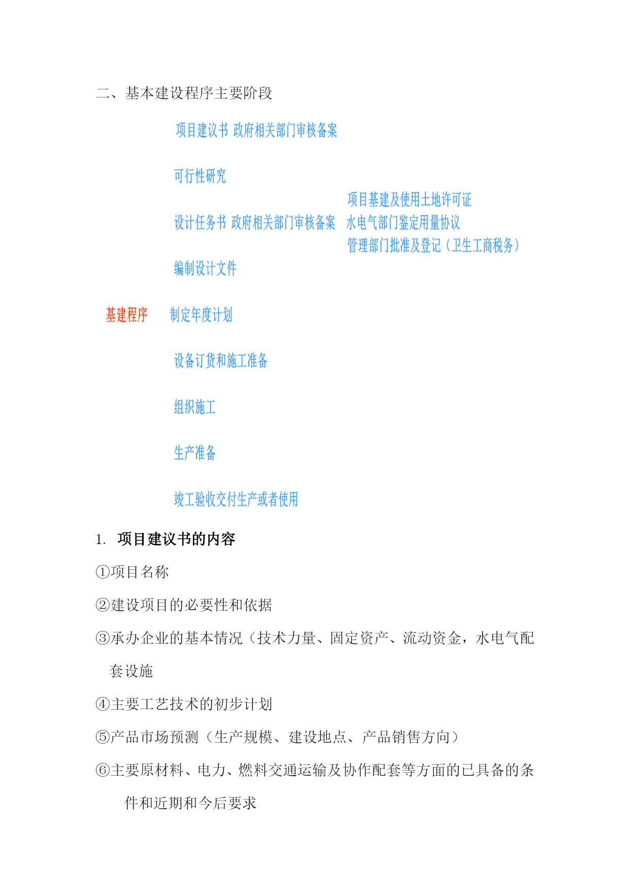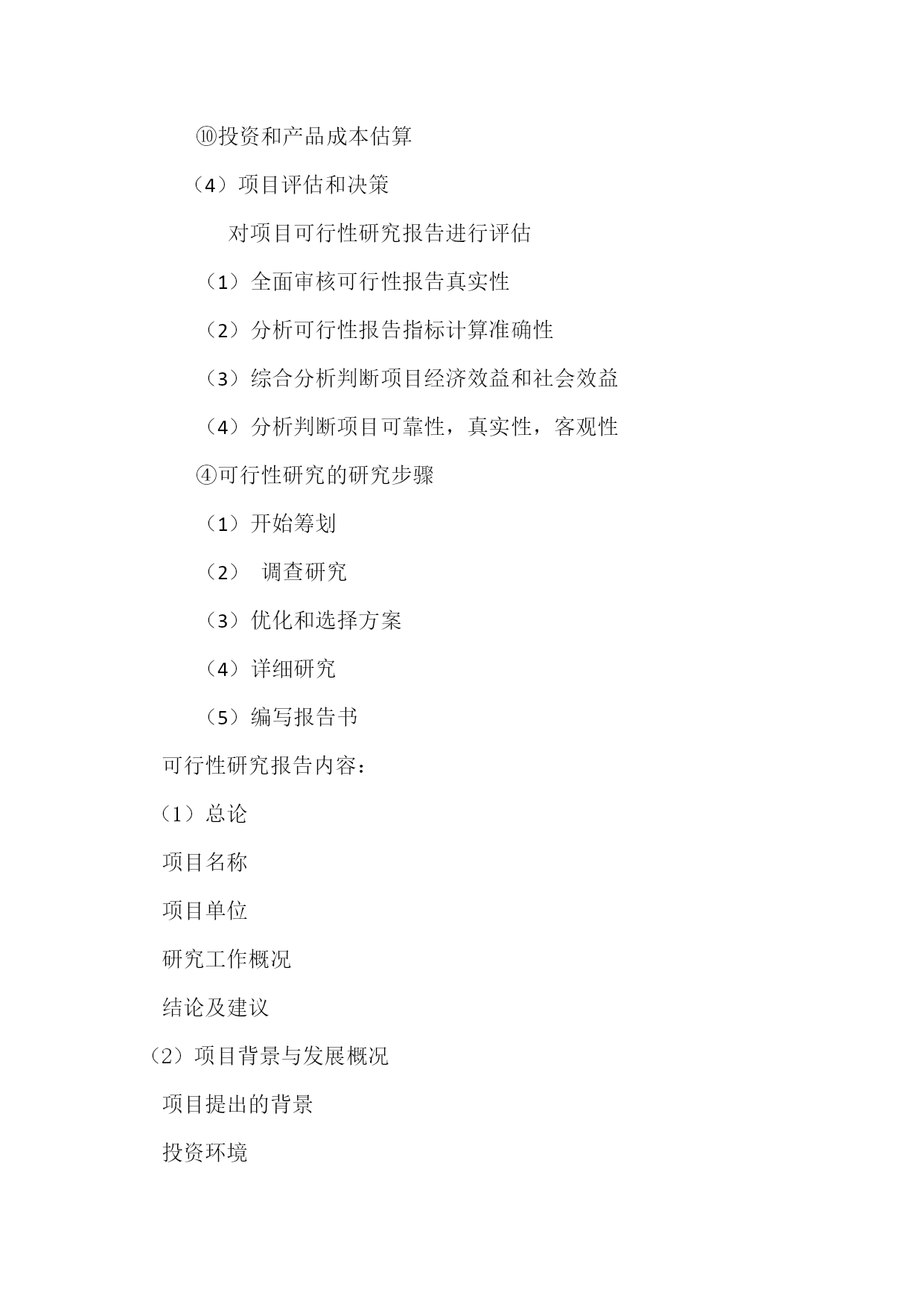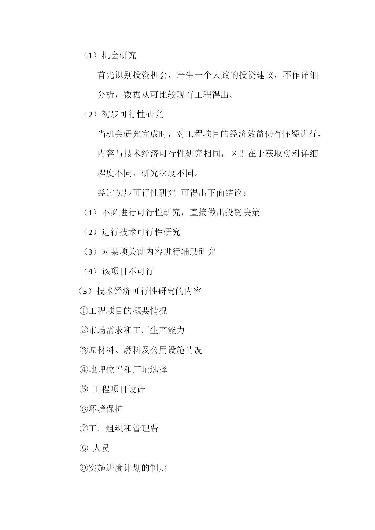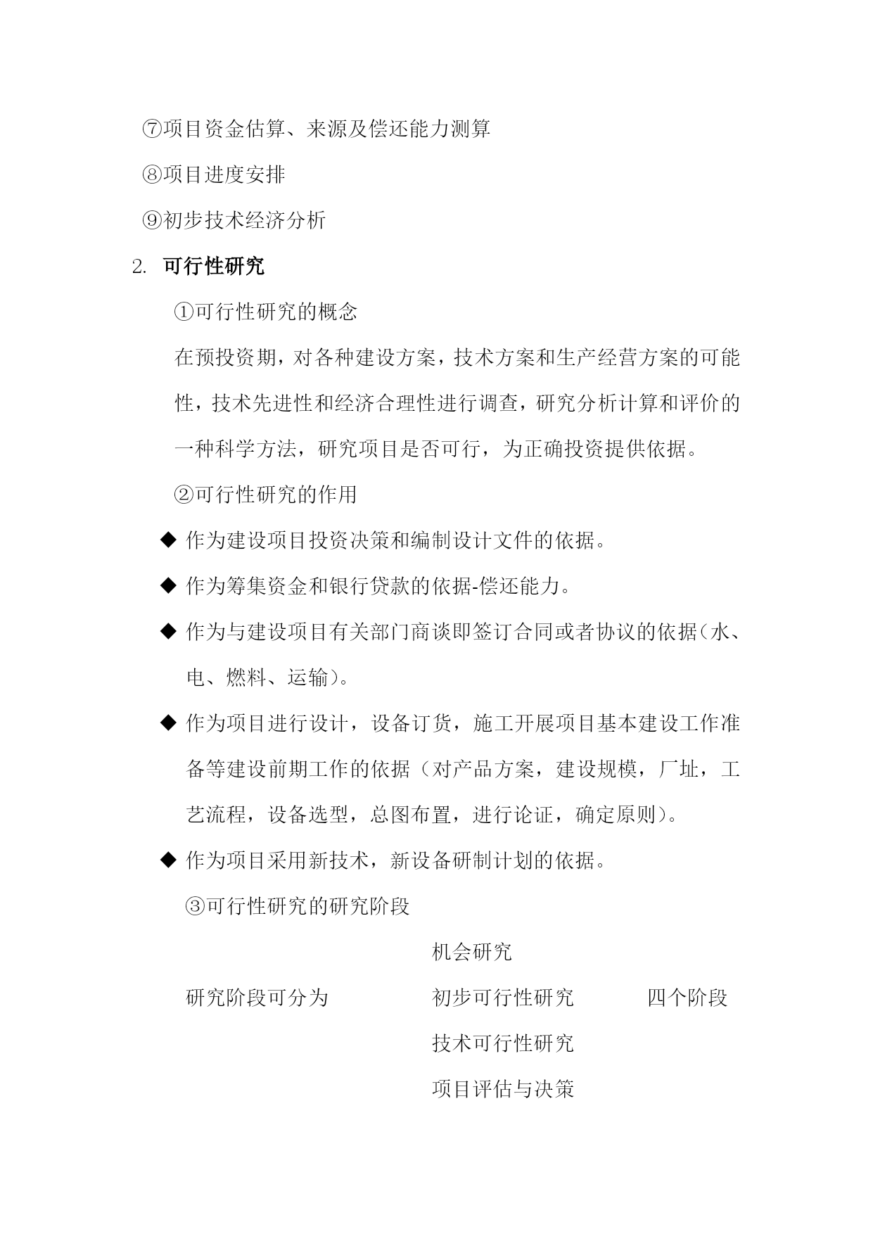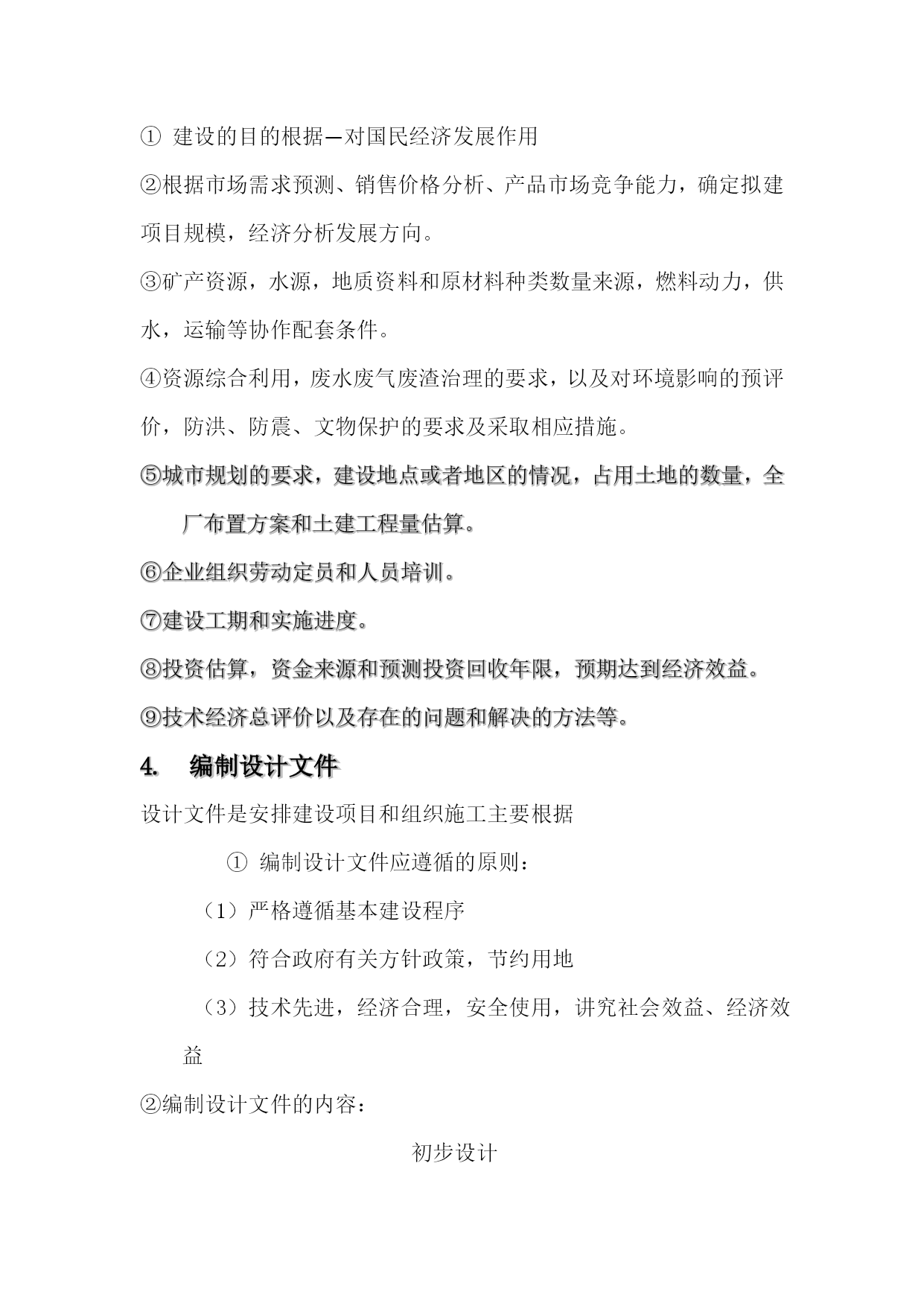 食品工厂设计第一章绪论课程介绍食品工厂设计是食品工程专业课中非常重要的一门必修课,是多学科综合性课程,实用性很强。课程内容基本建设和工厂设计的组成厂址选择和总平面图设计食品工厂工艺设计辅助车间和装备的设计工厂卫生及全厂生活设施公用系统环境保护措施基本建设概算技术经济分析课程安排课程共32学时,理论课程结束后,还有两周课程设计,该课为期末考试,理论课为考试课成绩,课程设计为考查课成绩。第二章基本建设第一节基本建设一、基本建设概述(一)基本建设定义基本建设是实现固定资产再生产的一种活动。它包括:①建筑工程及安装工程②机器设备的购置③其它基本建设工作,指同固定资产相关联的一系列工作如勘察设计,土地征购,职工培训,建设单位管理工作等。(二)基本建设分类1、按建设项目建设性质分类⑴新建项目指新建项目,或老项目重新总体设计,扩大建设规模,新增固定资产超过原来的项目三倍以上的建设项目。⑵扩建项目原有企业,扩大生产能力或新增新产品的项目,在原有固定资产的基础上,兴建主要车间或者增加其它固定资产。⑶改建项目原有企业为提高生产效率,改进产品质量,对原有设备工艺流程进行改造,增加一些辅助设施。⑷恢复项目对因灾害或者战争破坏的固定资产,按照原有规模恢复及重新建设。⑸拆迁项目原有企业,因各种原因迁至另外地方的项目。2、按建设项目建设工程分类⑴筹建项目在计划年度内,只做准备,不能开工项目。⑵施工项目计划年度内正在施工项目。⑶投产项目指全部竣工,已经投产或者交付使用项目。⑷收尾项目已经验收投产交付使用,设计能力全部达到,还遗留少量收尾工作。4、按建设项目建设总规模和投资分类按建设总规模和总投资不同分为大、中、小型项目,大中型建设项目指总投资1000万元以上或者粮食仓库容量一亿五千万斤以上项目投资额,在1000万元以下建设项目属于小型建设项目。⑴国家投资的建设项目(指国家财政预算直接拨款的建设项目)⑵银行信用筹资的建设项目(指银行通过信用方式进行信贷建设项目)⑶自筹资金建设项目(指各地区企业按照财政制度提留管理自行分配用于固定资产再生产的资金)⑷引进外资建设项目(指利用外资建设项目)⑸长期资金市场筹资的建设项目(国家债券和社会筹资股票等)。二、基本建设程序主要阶段项目建议书的内容①项目名称②建设项目的必要性和依据③承办企业的基本情况(技术力量、固定资产、流动资金,水电气配套设施④主要工艺技术的初步计划⑤产品市场预测(生产规模、建设地点、产品销售方向)⑥主要原材料、电力、燃料交通运输及协作配套等方面的已具备的条件和近期和今后要求⑦项目资金估算、来源及偿还能力测算⑧项目进度安排⑨初步技术经济分析可行性研究①可行性研究的概念在预投资期,对各种建设方案,技术方案和生产经营方案的可能性,技术先进性和经济合理性进行调查,研究分析计算和评价的一种科学方法,研究项目是否可行,为正确投资提供依据。②可行性研究的作用作为建设项目投资决策和编制设计文件的依据。作为筹集资金和银行贷款的依据-偿还能力。作为与建设项目有关部门商谈即签订合同或者协议的依据(水、电、燃料、运输)。作为项目进行设计,设备订货,施工开展项目基本建设工作准备等建设前期工作的依据(对产品方案,建设规模,厂址,工艺流程,设备选型,总图布置,进行论证,确定原则)。作为项目采用新技术,新设备研制计划的依据。③可行性研究的研究阶段机会研究研究阶段可分为初步可行性研究四个阶段技术可行性研究项目评估与决策(1)机会研究首先识别投资机会,产生一个大致的投资建议,不作详细分析,数据从可比较现有工程得出。(2)初步可行性研究当机会研究完成时,对工程项目的经济效益仍有怀疑进行,内容与技术经济可行性研究相同,区别在于获取资料详细程度不同,研究深度不同。经过初步可行性研究可得出下面结论:(1)不必进行可行性研究,直接做出投资决策(2)进行技术可行性研究(3)对某项关键内容进行辅助研究(4)该项目不可行(3)技术经济可行性研究的内容①工程项目的概要情况②市场需求和工厂生产能力③原材料、燃料及公用设施情况④地理位置和厂址选择⑤工程项目设计⑥环境保护⑦工厂组织和管理费⑧人员⑨实施进度计划的制定⑩投资和产品成本估算(4)项目评估和决策对项目可行性研究报告进行评估(1)全面审核可行性报告真实性(2)分析可行性报告指标计算准确性(3)综合分析判断项目经济效益和社会效益(4)分析判断项目可靠性,真实性,客观性④可行性研究的研究步骤(1)开始筹划(2)调查研究(3)优化和选择方案(4)详细研究(5)编写报告书可行性研究报告内容:(1)总