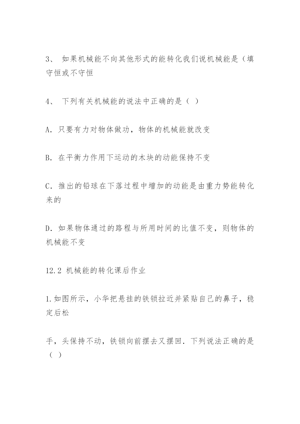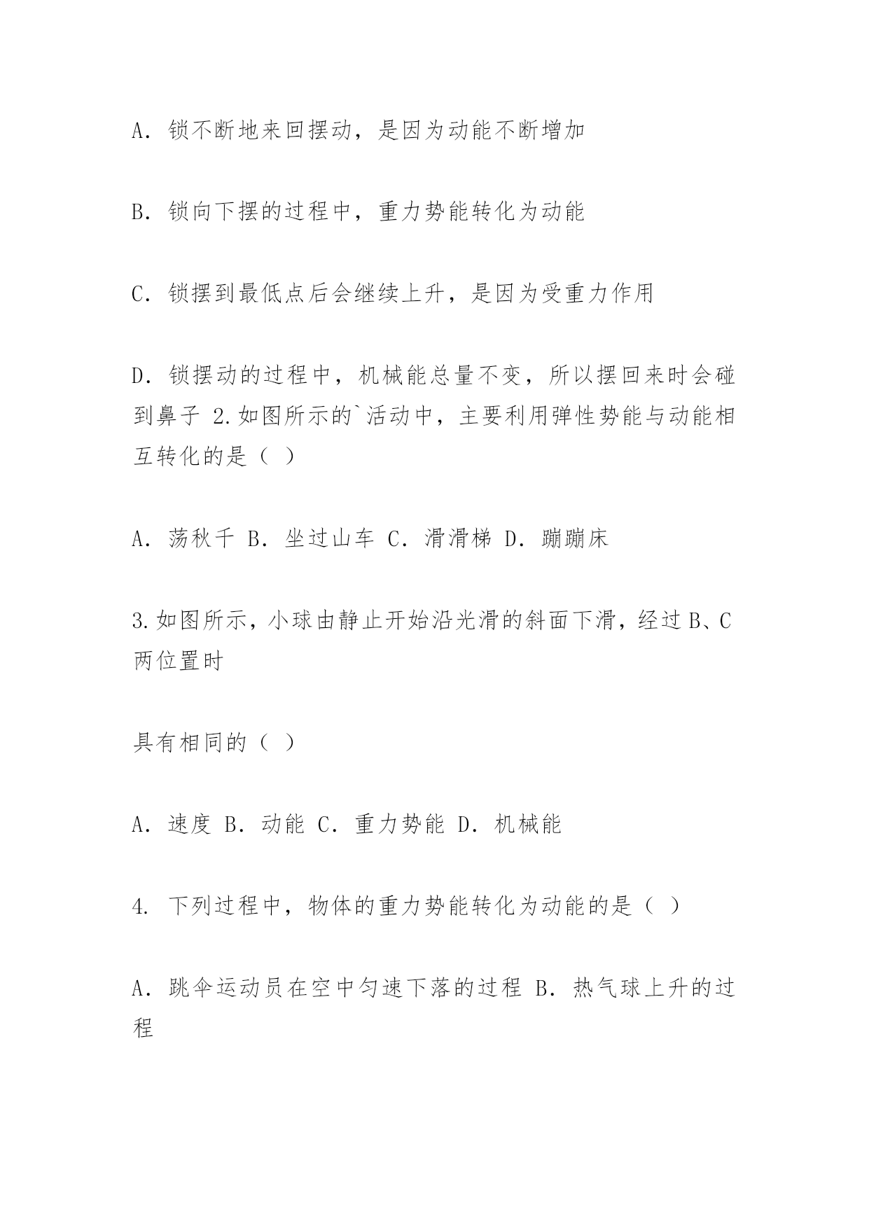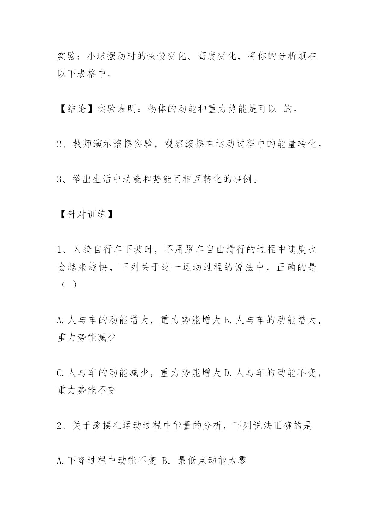 机械能的转化机械能的转化12.2机械能的转化学习目标:1、了解动能和势能的相互转化2、举例说明不同机械能的相互转化重点:动能和势能的相互转化难点:举例说明不同机械能的相互转化课前学习课堂学习知识点一:动能和重力势能的转化1、摆球动能和势能的相互转化教师按照课本101页图12-2-3进行实验,提醒学生并观察实验:小球摆动时的快慢变化、高度变化,将你的分析填在以下表格中。【结论】实验表明:物体的动能和重力势能是可以的。2、教师演示滚摆实验,观察滚摆在运动过程中的能量转化。3、举出生活中动能和势能间相互转化的事例。【针对训练】1、人骑自行车下坡时,不用蹬车自由滑行的过程中速度也会越来越快,下列关于这一运动过程的说法中,正确的是()A.人与车的动能增大,重力势能增大B.人与车的动能增大,重力势能减少C.人与车的动能减少,重力势能增大D.人与车的动能不变,重力势能不变2、关于滚摆在运动过程中能量的分析,下列说法正确的是A.下降过程中动能不变B.最低点动能为零D.最高点重力势能最大C.上升过程中重力势能减小3、图3是固定在水平桌面上的圆弧轨道,将一小球由轨道的P点自由释放,滚动到Q点。在此过程中,动能先变后变,重力势能。4、用力向下甩溜溜球,手提选线不懂,溜溜球会上下来回运动:它上升的过程中速度渐渐,重力势能逐渐。5、人造卫星沿椭圆轨道绕地球运行,当它由近地点向远地点运行时,卫星的动能填“增大”、“减小”、“不变”),卫星的势能(选填“增大”、“减小”、“不变”).知识点二:动能和弹性势能的转化1、当你玩弹弓时,用力拉伸橡皮条,橡皮条发生了弹性形变,它此时具有能。当你松开手时,弹丸迅速飞出去,这说明橡皮条的能转化成了弹丸的能。可见和是可以相互转化的。【针对训练】1、下列过程中,属于弹性势能转化为动能的是()A、推开弹簧门的过程B、用力拉长弹橡皮条的过程C、弹簧枪将‘子弹射出的过程D、跳水运动员将跳板踏弯的过程。2、皮球落到地面上又弹跳起来,这一过程中就存在着动能和弹性势能间的相互转化.从皮球开始触地到皮球的形变最大,速度为零,这一过程是皮球的能转化为能.从皮球开始恢复原状到完全恢复原状这一过程中,皮球的形变越来越小,而皮球的速度越来越大,到皮球全部恢复原状时,皮球上升的速度达最大,此过程是球的能转化为能.知识点三:机械能与其他形式能量的转化自学课本103页,学会下列问题;1、机械能中的动能和势能之间可以相互转化,在一定条件下机械能可以与能、2、水电站将水的机械能转化为能。人骑自行车时,人体内的一部分能转化为能。汽车在刹车过程中,将能转化为能。3、如果机械能不向其他形式的能转化我们说机械能是(填守恒或不守恒4、下列有关机械能的说法中正确的是()A.只要有力对物体做功,物体的机械能就改变B.在平衡力作用下运动的木块的动能保持不变C.推出的铅球在下落过程中增加的动能是由重力势能转化来的D.如果物体通过的路程与所用时间的比值不变,则物体的机械能不变12.2机械能的转化课后作业1.如图所示,小华把悬挂的铁锁拉近并紧贴自己的鼻子,稳定后松手,头保持不动,铁锁向前摆去又摆回.下列说法正确的是()A.锁不断地来回摆动,是因为动能不断增加B.锁向下摆的过程中,重力势能转化为动能C.锁摆到最低点后会继续上升,是因为受重力作用D.锁摆动的过程中,机械能总量不变,所以摆回来时会碰到鼻子2.如图所示的`活动中,主要利用弹性势能与动能相互转化的是()A.荡秋千B.坐过山车C.滑滑梯D.蹦蹦床3.如图所示,小球由静止开始沿光滑的斜面下滑,经过B、C两位置时具有相同的()A.速度B.动能C.重力势能D.机械能4.下列过程中,物体的重力势能转化为动能的是()A.跳伞运动员在空中匀速下落的过程B.热气球上升的过程C.汽车在水平路面上匀速行驶的过程D.铅球自由下落的过程5.过山车是一项非常惊险刺激的娱乐休闲活动.过山车时而从轨道的最低端上升到最高端,时而从最高端飞驰而下(如图).不计能量损失,下列说法正确的是()A.a点机械能小于b点机械能B.a点动能最大,b点势能最大,c点机械能最大C.由a到b的过程中,动能减少,势能增大,机械能不变D.由b到c的过程中,动能增大,势能减少,机械能变大6.学生在做模拟“蹦极”的小实验。一根橡皮筋一端系一个小石块,另一端固定在a点,b点是橡皮筋不系小石块自然下垂时下端所在的位置,c点是小石块从a点自由下落所能到达的最低点。在小石块由a点到c点运动的过程中,以下说法正确的是()A、小石块动能一直在增加B.小石块减少的重力势能全部转化为动能C、小石块经过b点时,橡皮筋具有弹性势能D.小石块到达C点时,动能为零