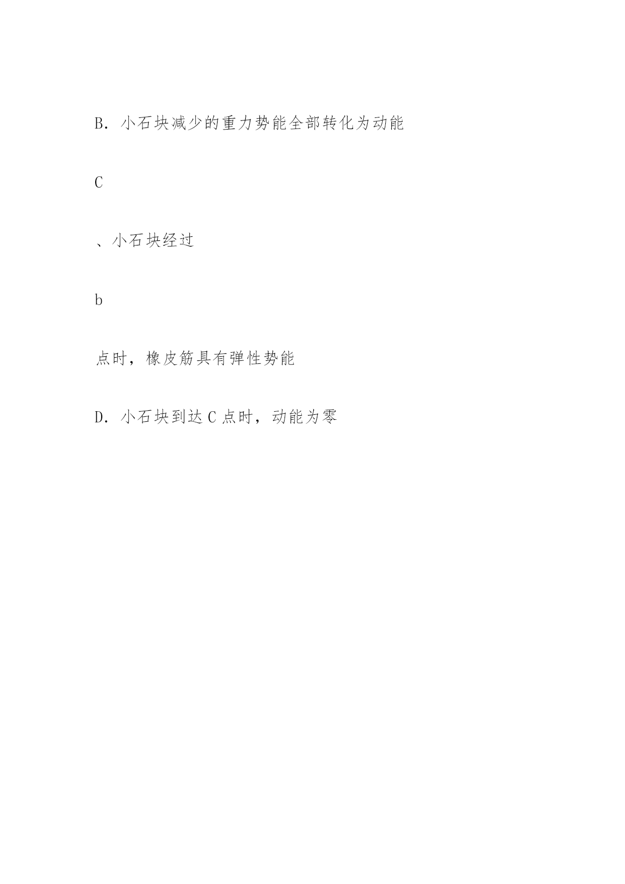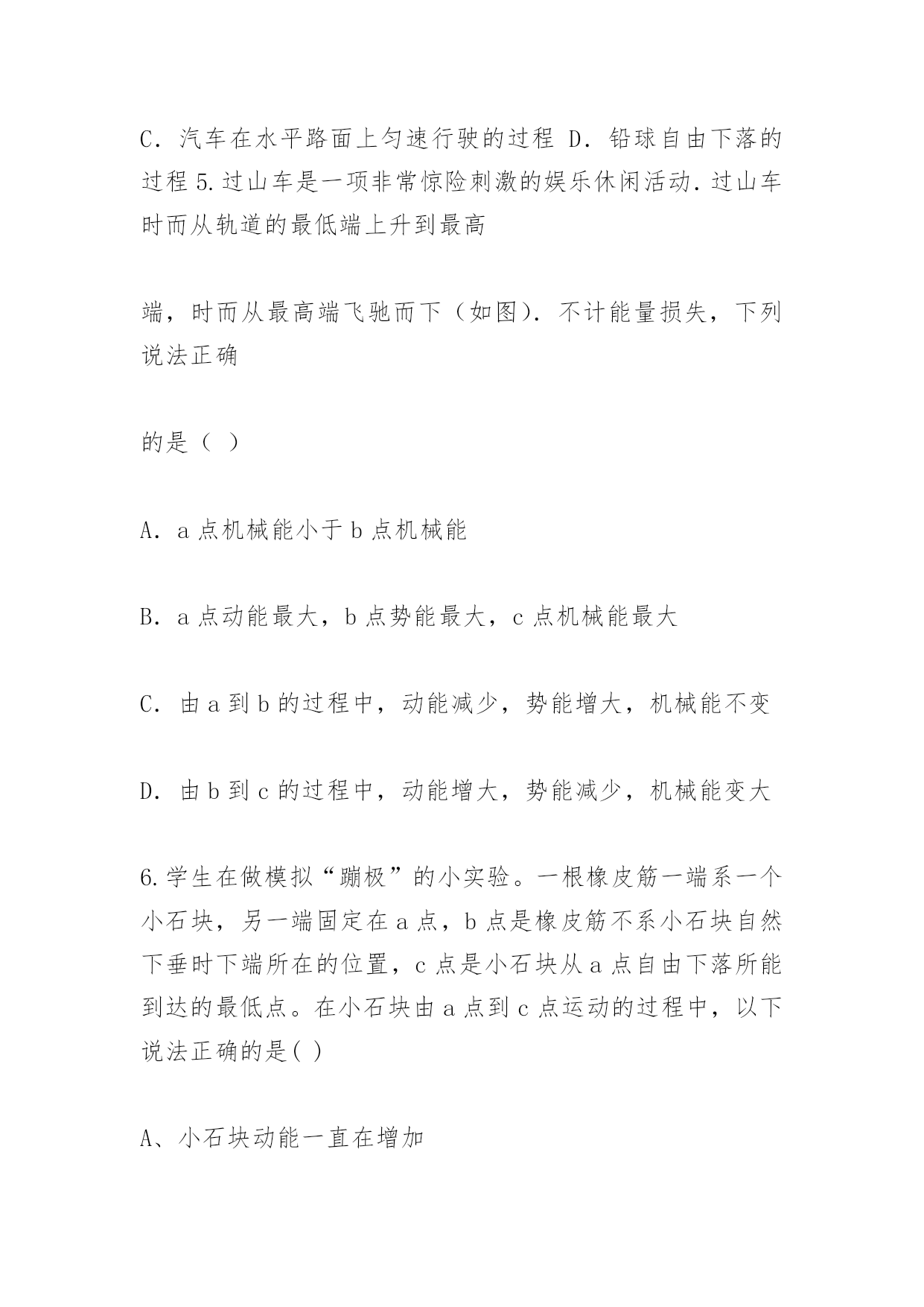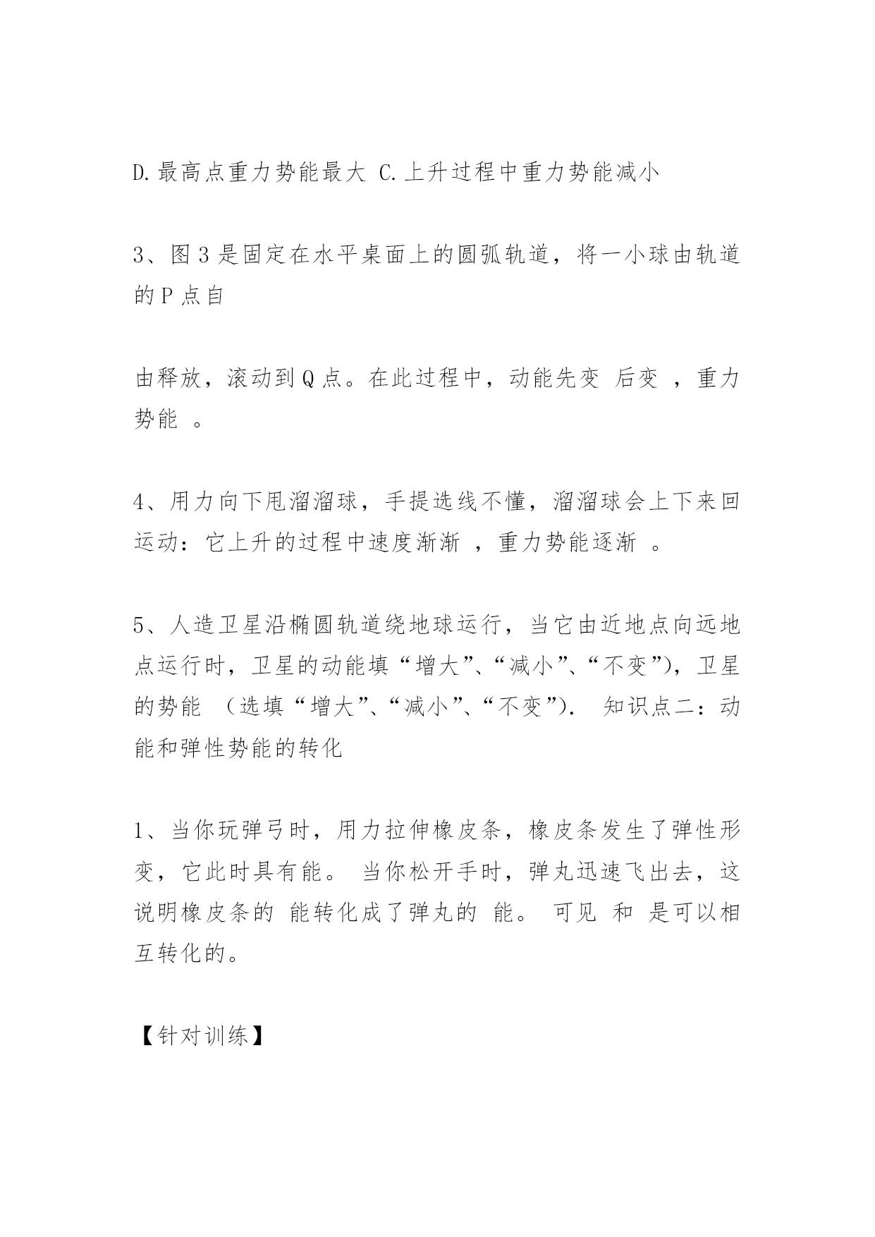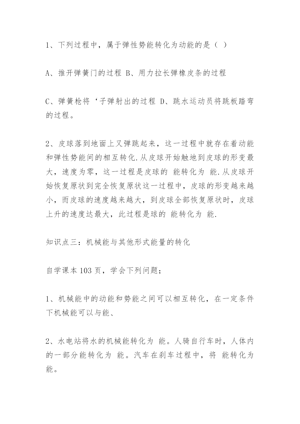 机械能的转化机械能的转化12.2机械能的转化学习目标:1、了解动能和势能的相互转化2、举例说明不同机械能的相互转化重点:动能和势能的相互转化难点:举例说明不同机械能的相互转化课前学习课堂学习知识点一:动能和重力势能的转化1、摆球动能和势能的相互转化教师按照课本101页图12-2-3进行实验,提醒学生并观察实验:小球摆动时的快慢变化、高度变化,将你的分析填在以下表格中。【结论】实验表明:物体的动能和重力势能是可以的。2、教师演示滚摆实验,观察滚摆在运动过程中的能量转化。3、举出生活中动能和势能间相互转化的事例。【针对训练】1、人骑自行车下坡时,不用蹬车自由滑行的过程中速度也会越来越快,下列关于这一运动过程的说法中,正确的是()A.人与车的动能增大,重力势能增大B.人与车的动能增大,重力势能减少C.人与车的动能减少,重力势能增大D.人与车的动能不变,重力势能不变2、关于滚摆在运动过程中能量的分析,下列说法正确的是A.下降过程中动能不变B.最低点动能为零D.最高点重力势能最大C.上升过程中重力势能减小3、图3是固定在水平桌面上的圆弧轨道,将一小球由轨道的P点自由释放,滚动到Q点。在此过程中,动能先变后变,重力势能。4、用力向下甩溜溜球,手提选线不懂,溜溜球会上下来回运动:它上升的过程中速度渐渐,重力势能逐渐。5、人造卫星沿椭圆轨道绕地球运行,当它由近地点向远地点运行时,卫星的动能填“增大”、“减小”、“不变”),卫星的势能(选填“增大”、“减小”、“不变”).知识点二:动能和弹性势能的转化1、当你玩弹弓时,用力拉伸橡皮条,橡皮条发生了弹性形变,它此时具有能。当你松开手时,弹丸迅速飞出去,这说明橡皮条的能转化成了弹丸的能。可见和是可以相互转化的。【针对训练】1、下列过程中,属于弹性势能转化为动能的是()A、推开弹簧门的过程B、用力拉长弹橡皮条的过程C、弹簧枪将‘子弹射出的过程D、跳水运动员将跳板踏弯的过程。2、皮球落到地面上又弹跳起来,这一过程中就存在着动能和弹性势能间的相互转化.从皮球开始触地到皮球的形变最大,速度为零,这一过程是皮球的能转化为能.从皮球开始恢复原状到完全恢复原状这一过程中,皮球的形变越来越小,而皮球的速度越来越大,到皮球全部恢复原状时,皮球上升的速度达最大,此过程是球的能转化为能.知识点三:机械能与其他形式能量的转化自学课本103页,学会下列问题;1、机械能中的动能和势能之间可以相互转化,在一定条件下机械能可以与能、2、水电站将水的机械能转化为能。人骑自行车时,人体内的一部分能转化为能。汽车在刹车过程中,将能转化为能。3、如果机械能不向其他形式的能转化我们说机械能是(填守恒或不守恒4、下列有关机械能的说法中正确的是()A.只要有力对物体做功,物体的机械能就改变B.在平衡力作用下运动的木块的动能保持不变C.推出的铅球在下落过程中增加的动能是由重力势能转化来的D.如果物体通过的路程与所用时间的比值不变,则物体的机械能不变12.2机械能的转化课后作业1.如图所示,小华把悬挂的铁锁拉近并紧贴自己的鼻子,稳定后松手,头保持不动,铁锁向前摆去又摆回.下列说法正确的是()A.锁不断地来回摆动,是因为动能不断增加B.锁向下摆的过程中,重力势能转化为动能C.锁摆到最低点后会继续上升,是因为受重力作用D.锁摆动的过程中,机械能总量不变,所以摆回来时会碰到鼻子2.如图所示的`活动中,主要利用弹性势能与动能相互转化的是()A.荡秋千B.坐过山车C.滑滑梯D.蹦蹦床3.如图所示,小球由静止开始沿光滑的斜面下滑,经过B、C两位置时具有相同的()A.速度B.动能C.重力势能D.机械能4.下列过程中,物体的重力势能转化为动能的是()A.跳伞运动员在空中匀速下落的过程B.热气球上升的过程C.汽车在水平路面上匀速行驶的过程D.铅球自由下落的过程5.过山车是一项非常惊险刺激的娱乐休闲活动.过山车时而从轨道的最低端上升到最高端,时而从最高端飞驰而下(如图).不计能量损失,下列说法正确的是()A.a点机械能小于b点机械能B.a点动能最大,b点势能最大,c点机械能最大C.由a到b的过程中,动能减少,势能增大,机械能不变D.由b到c的过程中,动能增大,势能减少,机械能变大6.学生在做模拟“蹦极”的小实验。一根橡皮筋一端系一个小石块,另一端固定在a点,b点是橡皮筋不系小石块自然下垂时下端所在的位置,c点是小石块从a点自由下落所能到达的最低点。在小石块由a点到c点运动的过程中,以下说法正确的是()A、小石块动能一直在增加B.小石块减少的重力势能全部转化为动能C、小石块经过b点时,橡皮筋具有弹性势能D.小石块到达C点时,动能为零