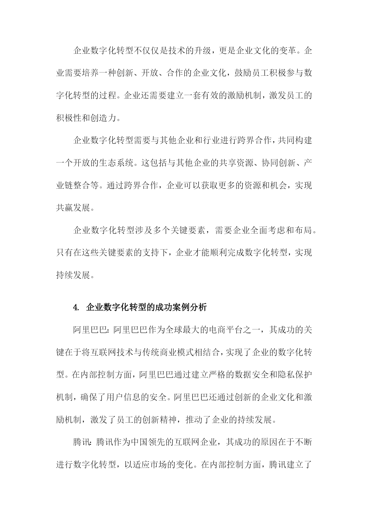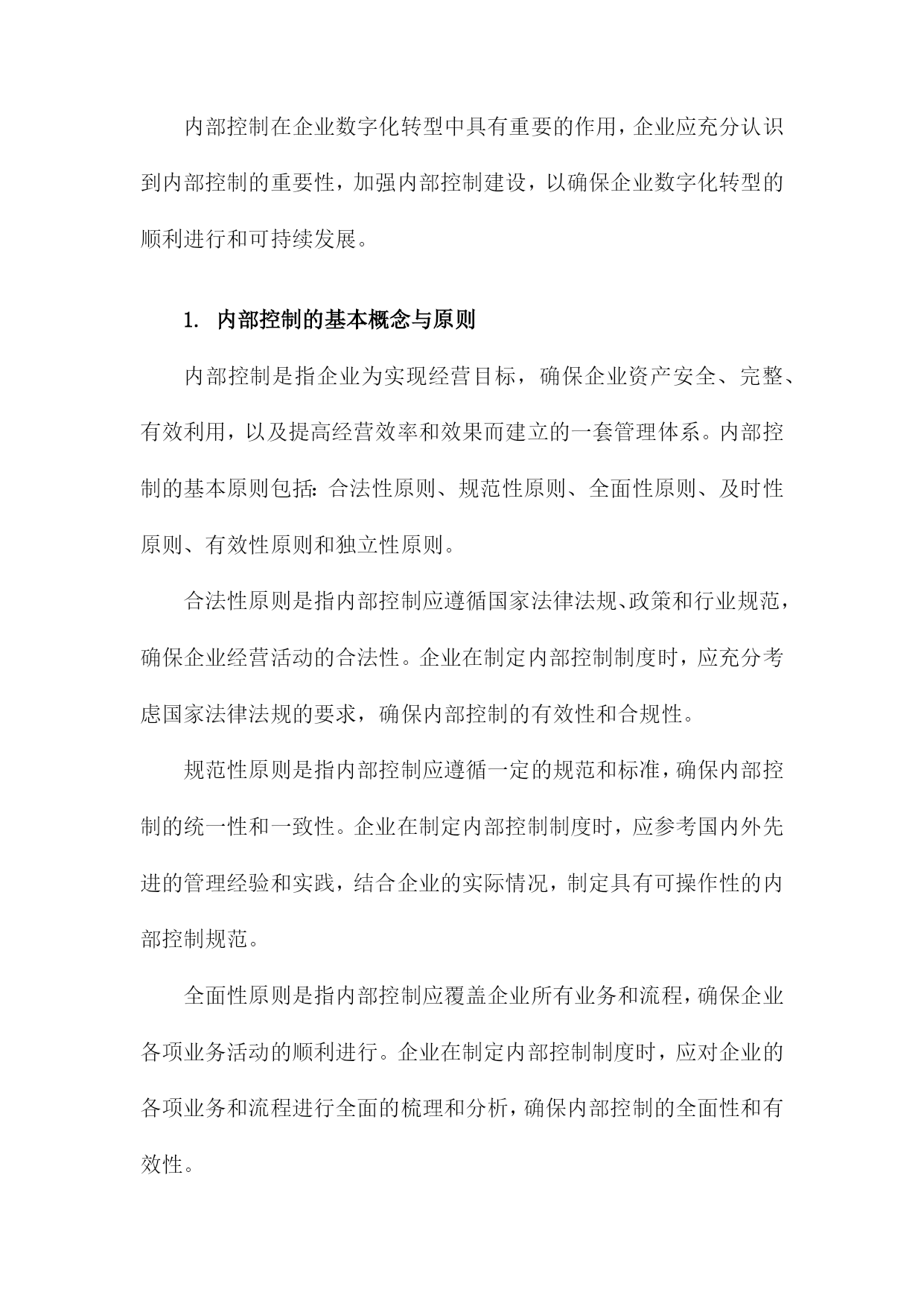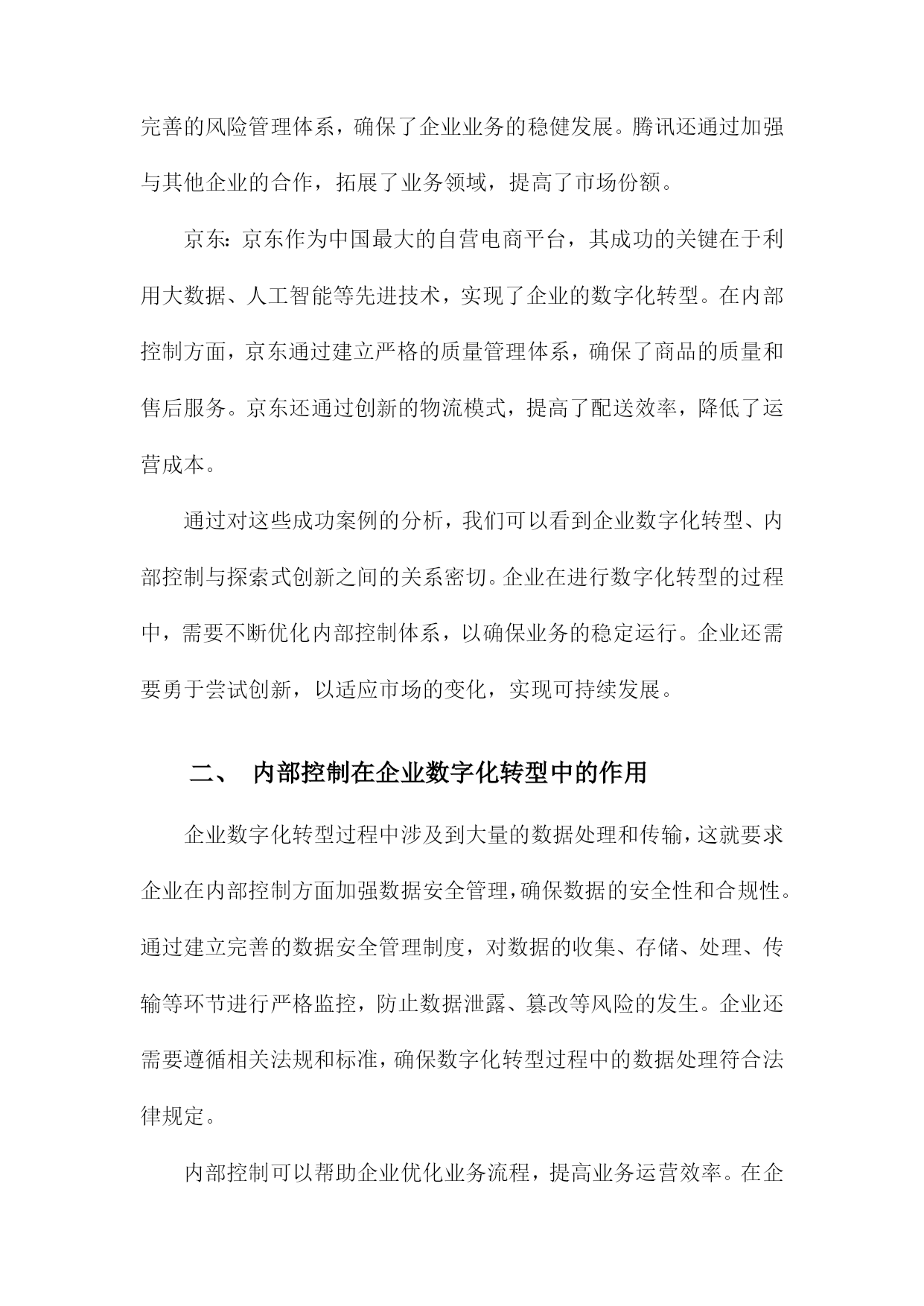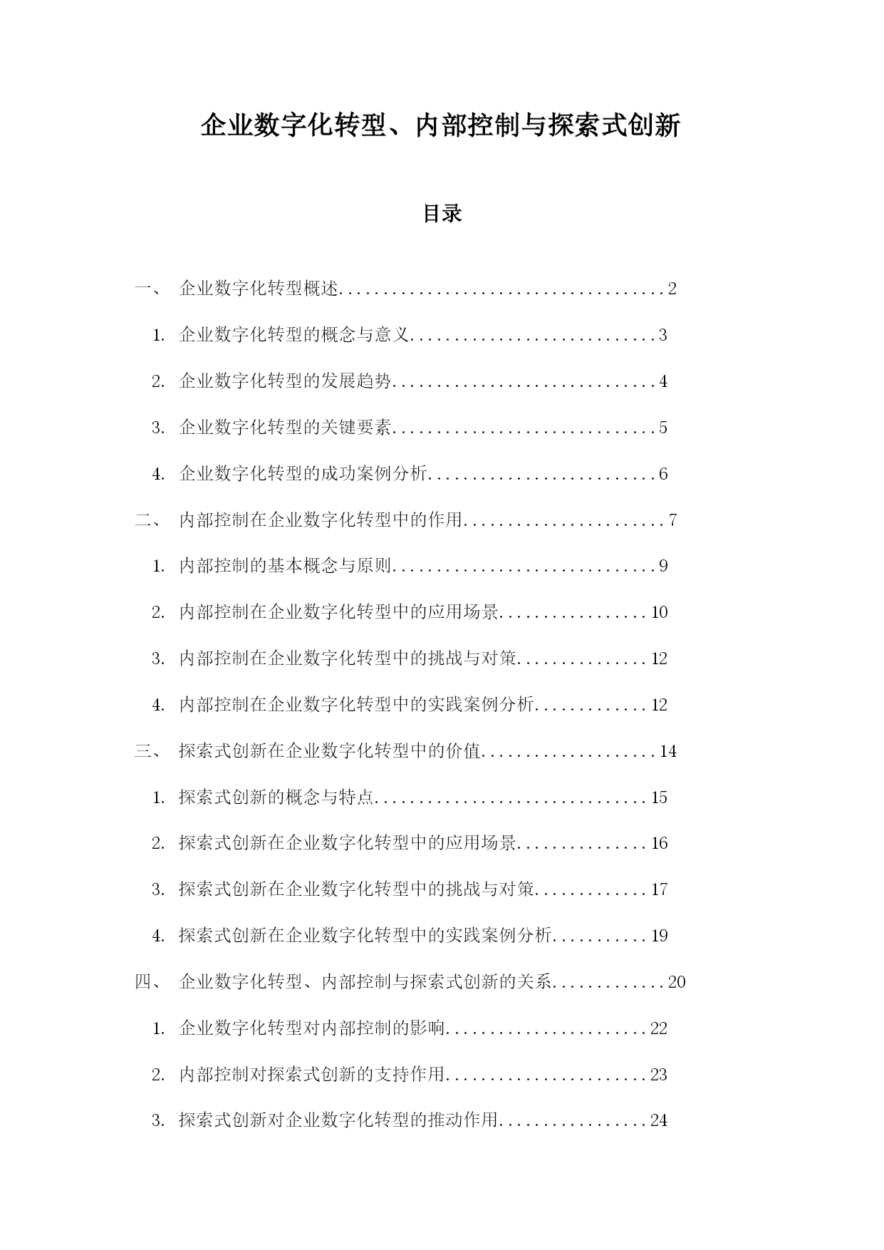 企业数字化转型、内部控制与探索式创新目录一、企业数字化转型概述.....................................21.企业数字化转型的概念与意义............................32.企业数字化转型的发展趋势..............................43.企业数字化转型的关键要素..............................54.企业数字化转型的成功案例分析..........................6二、内部控制在企业数字化转型中的作用.......................71.内部控制的基本概念与原则..............................92.内部控制在企业数字化转型中的应用场景.................103.内部控制在企业数字化转型中的挑战与对策...............124.内部控制在企业数字化转型中的实践案例分析.............12三、探索式创新在企业数字化转型中的价值....................141.探索式创新的概念与特点...............................152.探索式创新在企业数字化转型中的应用场景...............163.探索式创新在企业数字化转型中的挑战与对策.............174.探索式创新在企业数字化转型中的实践案例分析...........19四、企业数字化转型、内部控制与探索式创新的关系.............201.企业数字化转型对内部控制的影响.......................222.内部控制对探索式创新的支持作用.......................233.探索式创新对企业数字化转型的推动作用.................244.企业数字化转型、内部控制与探索式创新的协同发展策略....26五、结论与展望............................................271.企业数字化转型、内部控制与探索式创新的重要性总结......282.未来企业数字化转型、内部控制与探索式创新的发展趋势预测303.针对当前问题提出改进和完善的建议和措施...............31一、企业数字化转型概述随着科技的飞速发展和全球经济一体化的推进,企业面临着日益激烈的市场竞争。在这种背景下,企业数字化转型成为了许多企业提高竞争力、实现可持续发展的关键所在。企业数字化转型是指通过运用数字技术,对企业的生产、经营、管理等方面进行全面改革和创新,以提高企业的运营效率、降低成本、提升客户满意度和市场竞争力。业务流程再造:通过对企业现有业务流程进行梳理和优化,消除冗余环节,提高业务处理效率,实现业务流程的自动化和智能化。数据驱动决策:通过建立数据中心,实现对企业内外部数据的实时采集、整合和分析,为企业决策提供有力支持。产品与服务创新:运用数字技术,对产品和服务进行个性化、定制化改造,满足消费者多样化的需求。跨界融合与合作:借助互联网技术,实现企业与其他行业、领域的深度融合与合作,拓展新的业务领域和市场空间。企业文化与组织变革:推动企业文化的数字化升级,培养员工的数字素养,形成适应数字化转型的组织结构和管理模式。人才培养与引进:加大对数字化人才的培养和引进力度,为企业数字化转型提供人才保障。企业数字化转型是一个系统性、全面性的工程,需要企业在战略层面高度重视,从组织架构、人才培养、技术研发等多个方面进行全面布局和投入。企业才能在激烈的市场竞争中立于不败之地,实现可持续发展。1.企业数字化转型的概念与意义企业数字化转型有助于提高企业的运营效率,通过引入先进的信息技术和管理方法,企业可以实现生产自动化、智能化,从而降低成本、提高生产效率,使企业在激烈的市场竞争中立于不败之地。企业数字化转型有助于优化企业的资源配置,通过对企业内部各个环节的数据进行实时监控和分析,企业可以更加精准地进行资源配置,避免资源浪费,提高资源利用效率。企业数字化转型有助于提升企业的创新能力,数字化技术为企业提供了丰富的数据资源和创新工具,使企业能够更加快速地发现市场需求、研发新产品和服务,从而保持在市场中的领先地位。企业数字化转型有助于提升企业的竞争力,在全球化的背景下,企业面临着来自国内外的激烈竞争。通过数字化转型,企业可以更好地应对市场变化,满足客户需求,提升品牌价值,从而在竞争中脱颖而出。企业数字化转型是企业发展的必然趋势,对于企业来说具有重要的战略意义。只有不断推进数字化转型,企业才能在激烈的市场竞争中立于不败之
