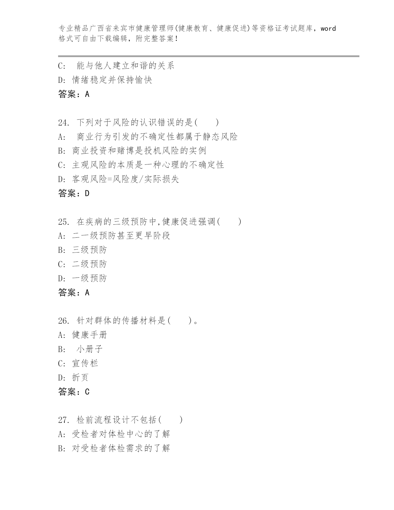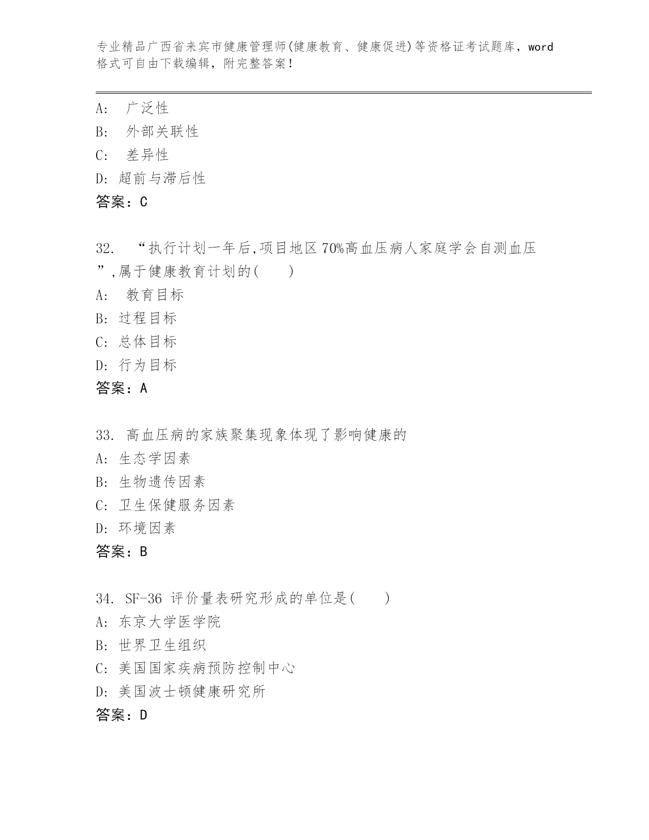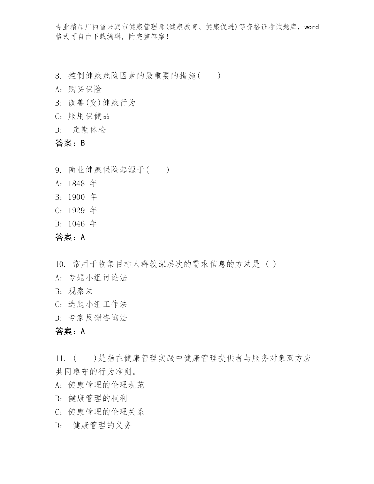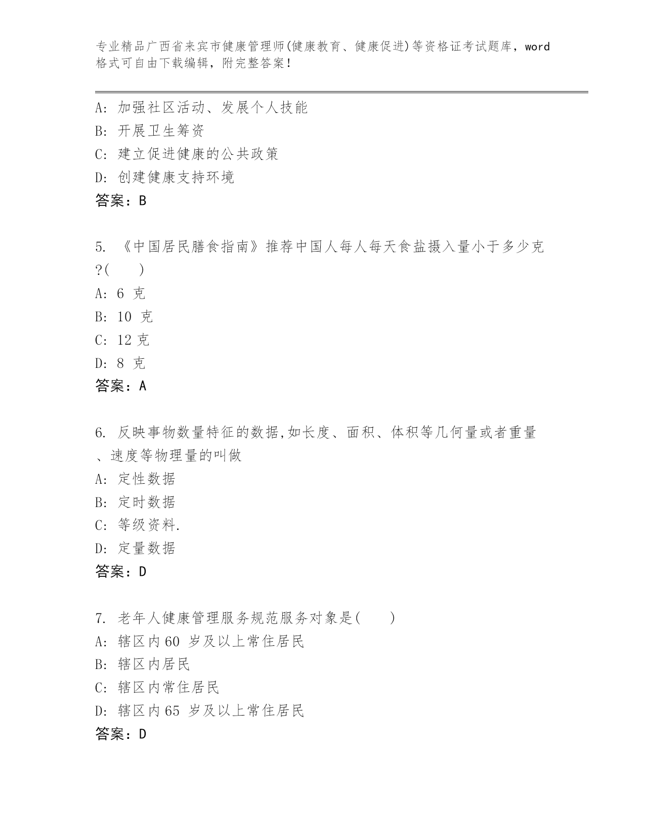 广西省来宾市健康管理师(健康教育、健康促进)等资格证考试通用题库加解析答案.docx